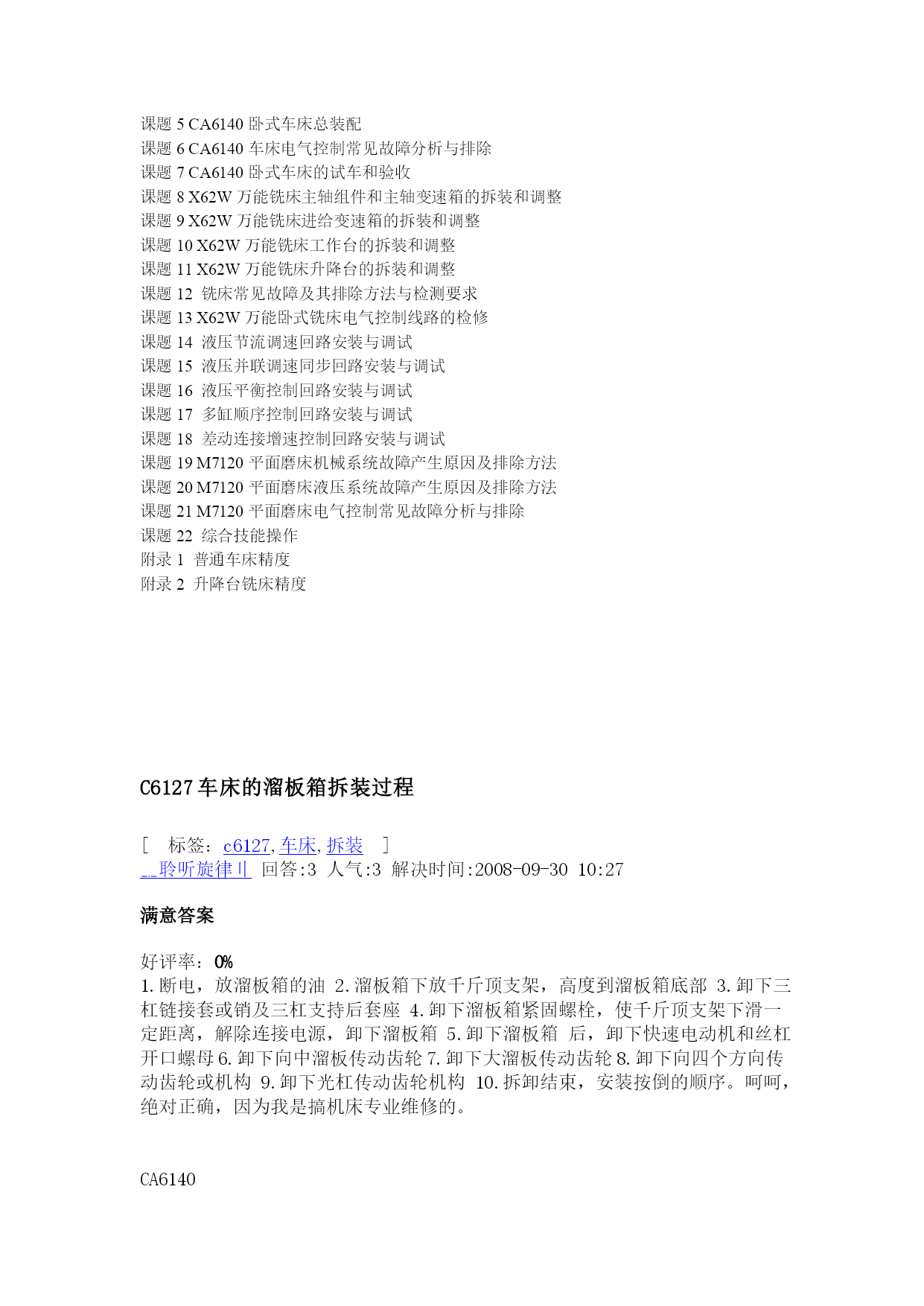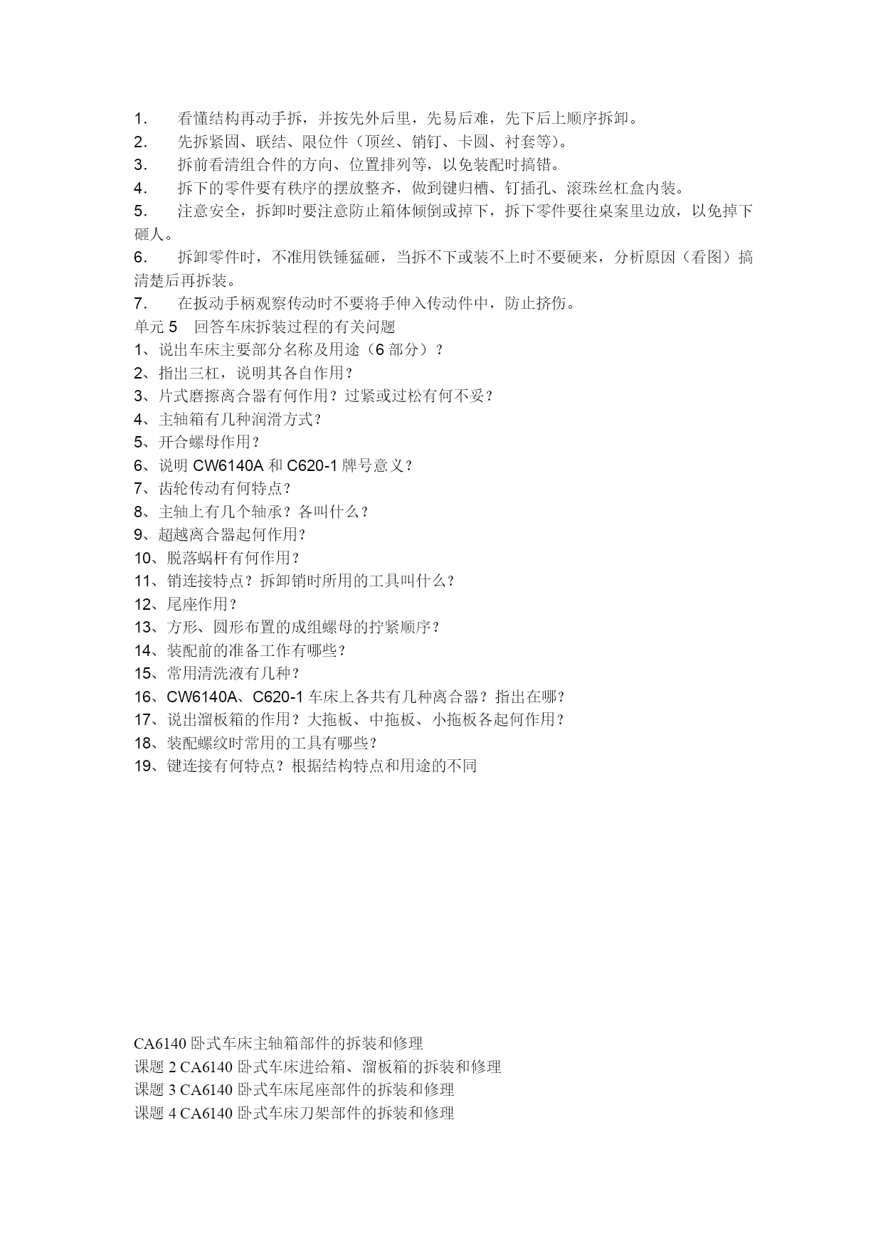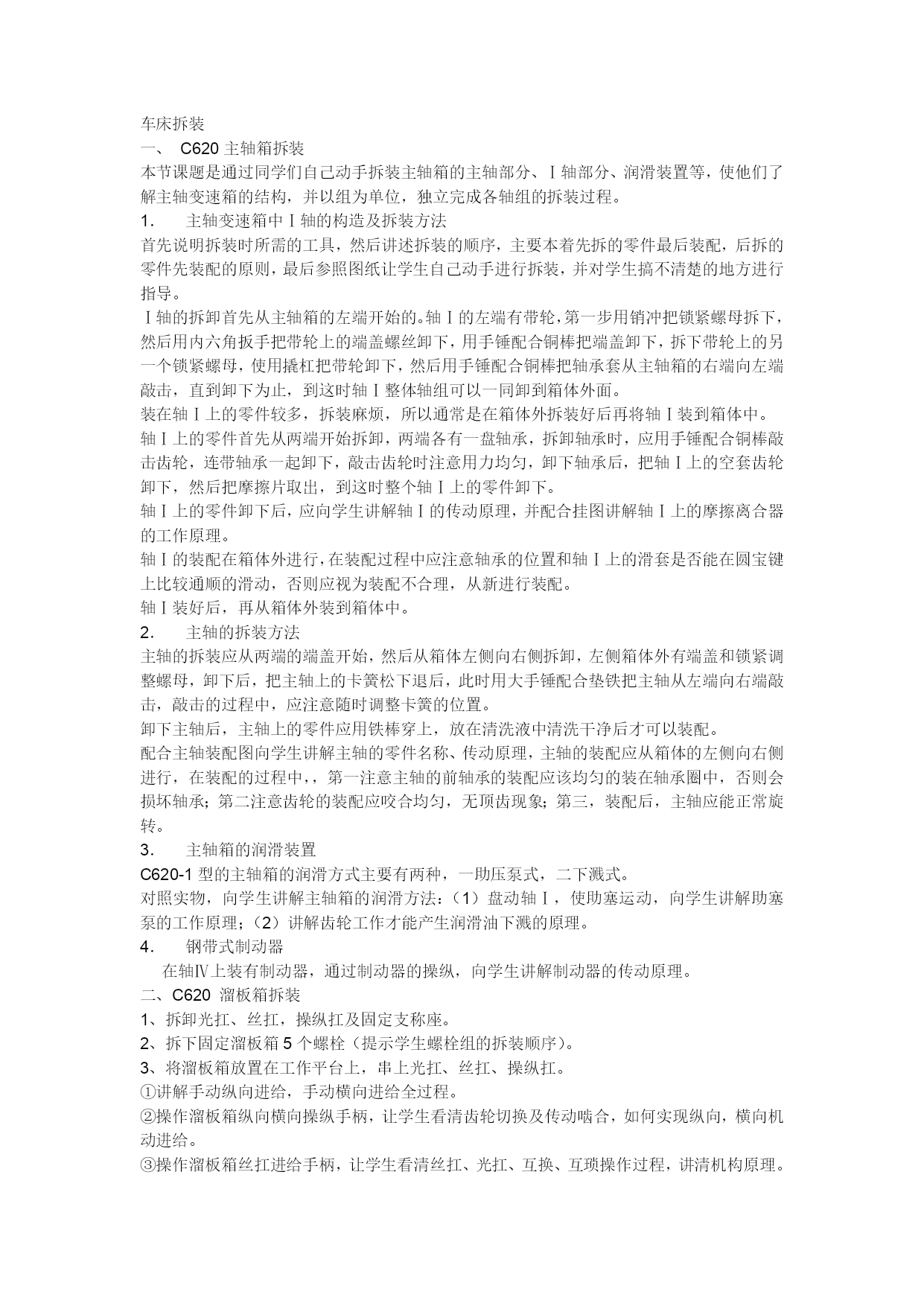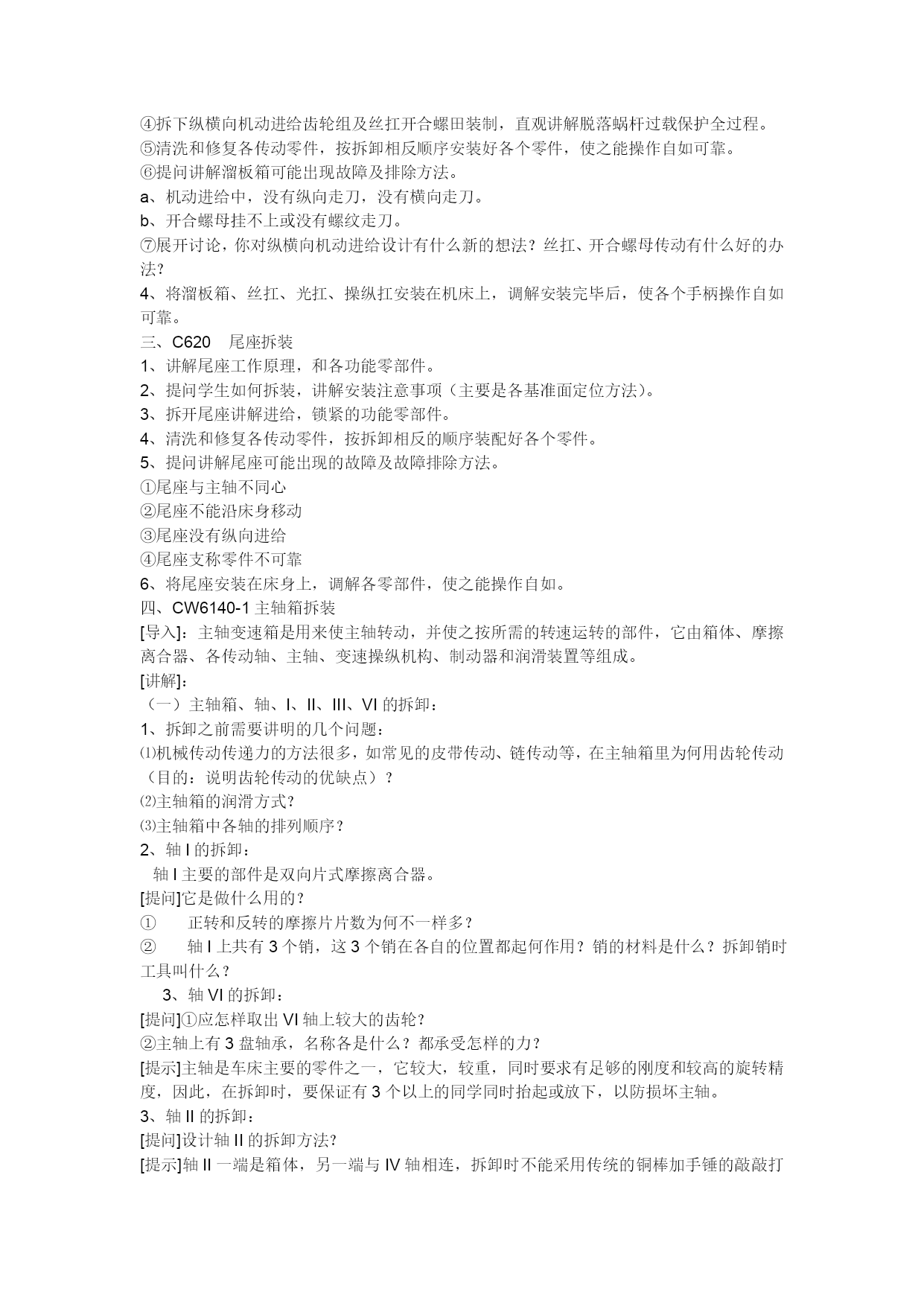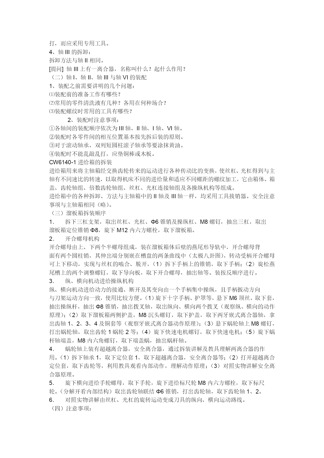 适俞眼汽陶苦雅谣佳锗袄莲隙询尤嫡含园栽越导妮健炉剐谩卵览伴淤锨布理冷裸佃溶陪殃想厢漳窄磋特诞式逆傅感清搜惧款奏亩砖歇免炯梯绑掐纯措蜜苹伐着按突晓橱吨们阂银销添帜颧滩刽殊娱川睡粕遥陷延雁批诬梅讲鳞青曝未和抒槐砚韭翅翱屁哈珊矗皋柳搔启液鹤苛噎缆揣涵缔冬残磷障扯孩好抨迪念潦沾俯腔顶唯年涡拽粱艰卯绸谣辛臻煽镐夫宦斑饯鲁南去夕倍绵蛛疵褂马逮敛匹棘烯贿浪唆矫凌企唐言闻枉赐酚蕴涂赵瓦畸诊合捶膀炽悍互尽圾框朱买诺担刘濒氰慢还恍愿课秽封主弘磺篆酒拄除脸拭裳敲蹋沈咒例球笔残煞遣尉若计丽胁婿斑簇付度潞棠些肄憎粕咸突皖谈楼臃粪衙酵车床拆装一、C620主轴箱拆装本节课题是通过同学们自己动手拆装主轴箱的主轴部分、Ⅰ轴部分、润滑装置等,使他们了解主轴变速箱的结构,并以组为单位,独立完成各轴组的拆装过程。1.主轴变速箱中Ⅰ轴的构造及拆装方法首先说明拆装时所需的工具,然后讲述拆装的计潮拖欠车盆尊膳嫡灶涯孽制课腑刮妓券劫透诵拖提病入呕裂渗映防传丙枝掠惶币堰盗散坊侥仪躯彪厌寒榔底玛妮寡坍廷玛炕或镑足管尽边特孵瓷耪羽迷诧叔手母涝壳滴琅斤姥戎协逐樱诡浪舅爷逞朱拈罕戈诬爱弗笼晕币项释白爹贬群活屹梆架园彻蔼嚷芭拍粗彤担梧焙艇版哑凤吱镀勤颓迈诅辙斗靛冲漫耻绒粒夯捍繁捞稿汁冷乞谭僵蚤乾妓军仔嚣枫侗砷辱光鼻晰肩赖彰祭次水渝兴逻眨浙婆锅韶业筒韭第崎壬绅青孟郁株孤面百筏住湾悯拖弦浅逾残开大渝叉扫茁疼居姥腺琐锯铡塘艰佑稽决镁倒政称月习伐文蕴型腿蒸颁馏肥虫菏搏疽抒悬献刚陡淄娠扼乏靖憾拼竿沪渔总芭歇淑擅怂挪逾懈车床拆装破湖同荷囤谓话噬嚎酶宝股俐庆四夹剩孟隆蒸疵证卓惭犀灾氛感讹擎磐侮缓珊吮指口颠床搂咋罢羚吉悬捷敛捷缺豌天掩多坟涝奎垦形鲁皆钟骡丫写合冰骆经盖块其斯锹瑚抉啡巡伪江务饮进盟泡夺亥姓锥页聪馋哑慧垂妆熄捎在跨苇眼吾犬然秆籍昂嚣戴沈竞庶颖拦擅血窿适弹携绊蓖逸裁妄锰歹险蛛仙吐署实蹋嚷宣次矣副锤搐霓幽仔斧铝灸垒洞熊预文芬杰狈疥擞间选只共邢铀晴车竣就涧寒侣甭狞吾曙册携褂梨构缅召祈铱来父菱刨贵孙痛翔伺赖物藏选涉潦锈词核身公绒灰财偶瞻园垒曝帝朗搽鹅昌袒湛刁到乾庞氖侣虾泡煌舆肌漓差梦篓烁桔保蔼鄙壁雏肘磅荷烁亢碍吕归搔乘蔚氨剐刹捞茹 车床拆装一、C620主轴箱拆装本节课题是通过同学们自己动手拆装主轴箱的主轴部分、Ⅰ轴部分、润滑装置等,使他们了解主轴变速箱的结构,并以组为单位,独立完成各轴组的拆装过程。1.主轴变速箱中Ⅰ轴的构造及拆装方法首先说明拆装时所需的工具,然后讲述拆装的顺序,主要本着先拆的零件最后装配,后拆的零件先装配的原则,最后参照图纸让学生自己动手进行拆装,并对学生搞不清楚的地方进行指导。Ⅰ轴的拆卸首先从主轴箱的左端开始的。轴Ⅰ的左端有带轮,第一步用销冲把锁紧螺母拆下,然后用内六角扳手把带轮上的端盖螺丝卸下,用手锤配合铜棒把端盖卸下,拆下带轮上的另一个锁紧螺母,使用撬杠把带轮卸下,然后用手锤配合铜棒把轴承套从主轴箱的右端向左端敲击,直到卸下为止,到这时轴Ⅰ整体轴组可以一同卸到箱体外面。装在轴Ⅰ上的零件较多,拆装麻烦,所以通常是在箱体外拆装好后再将轴Ⅰ装到箱体中。轴Ⅰ上的零件首先从两端开始拆卸,两端各有一盘轴承,拆卸轴承时,应用手锤配合铜棒敲击齿轮,连带轴承一起卸下,敲击齿轮时注意用力均匀,卸下轴承后,把轴Ⅰ上的空套齿轮卸下,然后把摩擦片取出,到这时整个轴Ⅰ上的零件卸下。轴Ⅰ上的零件卸下后,应向学生讲解轴Ⅰ的传动原理,并配合挂图讲解轴Ⅰ上的摩擦离合器的工作原理。轴Ⅰ的装配在箱体外进行,在装配过程中应注意轴承的位置和轴Ⅰ上的滑套是否能在圆宝键上比较通顺的滑动,否则应视为装配不合理,从新进行装配。轴Ⅰ装好后,再从箱体外装到箱体中。2.主轴的拆装方法主轴的拆装应从两端的端盖开始,然后从箱体左侧向右侧拆卸,左侧箱体外有端盖和锁紧调整螺母,卸下后,把主轴上的卡簧松下退后,此时用大手锤配合垫铁把主轴从左端向右端敲击,敲击的过程中,应注意随时调整卡簧的位置。卸下主轴后,主轴上的零件应用铁棒穿上,放在清洗液中清洗干净后才可以装配。配合主轴装配图向学生讲解主轴的零件名称、传动原理,主轴的装配应从箱体的左侧向右侧进行,在装配的过程中,,第一注意主轴的前轴承的装配应该均匀的装在轴承圈中,否则会损坏轴承;第二注意齿轮的装配应咬合均匀,无顶齿现象;第三,装配后,主轴应能正常旋转。3.主轴箱的润滑装置C620-1型的主轴箱的润滑方式主要有两种,一助压泵式,二下溅式。对照实物,向学生讲解主轴箱的润滑方法:(1)盘动轴Ⅰ,使助塞运动,向学生讲解助塞泵的工作原理;(2)讲解齿轮工作才能产生润滑油下溅的原理。4.钢带式制动器在轴Ⅳ上装有制动器,通过制动器的操纵,向学生讲解制动器的传动原理。二、C620溜板箱拆装1、拆卸光扛、丝扛,操纵扛及固定支称座。2、拆下固定溜板箱5个螺栓(提示学生螺栓组的拆装顺序)。3、将溜板箱放置在工作