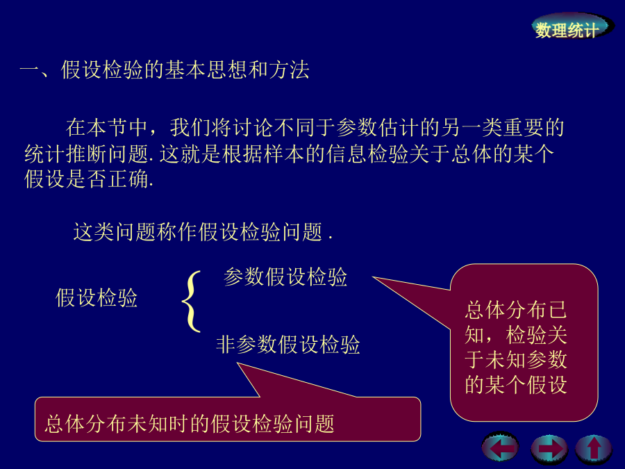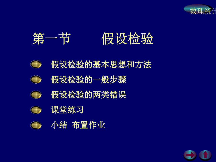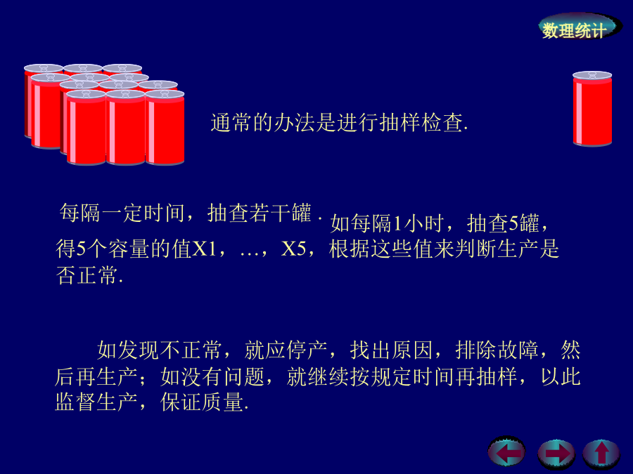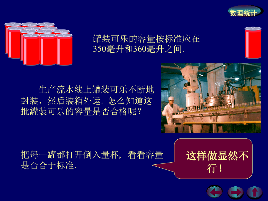 假设检验的基本思想和方法 假设检验的一般步骤 假设检验的两类错误 课堂练习 小结布置作业让我们先看一个例子.生产流水线上罐装可乐不断地封装,然后装箱外运.怎么知道这批罐装可乐的容量是否合格呢?每隔一定时间,抽查若干罐.很明显,不能由5罐容量的数据,在把握不大的情况下就判断生产不正常,因为停产的损失是很大的.在正常生产条件下,由于种种随机因素的影响,每罐可乐的容量应在355毫升上下波动.这些因素中没有哪一个占有特殊重要的地位.因此,根据中心极限定理,假定每罐容量服从正态分布是合理的.它的对立假设是:那么,如何判断原假设H0是否成立呢?问题归结为对差异作定量的分析,以确定其性质.然而,这种随机性的波动是有一定限度的,如果差异超过了这个限度,则我们就不能用抽样的随机性来解释了.问题是,根据所观察到的差异,如何判断它究竟是由于偶然性在起作用,还是生产确实不正常?问题是:如何给出这个量的界限?现在回到我们前面罐装可乐的例中:罐装可乐的容量按标准应在350毫升和360毫升之间.一批可乐出厂前应进行抽样检查,现抽查了n罐,测得容量为X1,X2,…,Xn,问这一批可乐的容量是否合格?提出假设故我们可以取拒绝域为:如果H0是对的,那么衡量差异大小的某个统计量落入区域W(拒绝域)是个小概率事件.如果该统计量的实测值落入W,也就是说,H0成立下的小概率事件发生了,那么就认为H0不可信而否定它.否则我们就不能否定H0(只好接受它).不否定H0并不是肯定H0一定对,而只是说差异还不够显著,还没有达到足以否定H0的程度.如果显著性水平取得很小,则拒绝域也会比较小.在上面的例子的叙述中,我们已经初步介绍了假设检验的基本思想和方法.提出原假设和备择假设第三步:得否定域W:|t|>4.0322假设检验会不会犯错误呢?如果H0成立,但统计量的实测值落入否定域,从而作出否定H0的结论,那就犯了“以真为假”的错误.假设检验的两类错误两类错误的概率的关系假设检验和区间估计的关系单、双侧检验代入=2,n=25,并由样本值计算得统计某织物强力指标X的均值=21公斤.改进工艺后生产一批织物,今从中取30件,测得=21.55公斤.假设强力指标服从正态分布且已知=1.2公斤,问在显著性水平=0.01下,新生产织物比过去的织物强力是否有提高?代入=1.2,n=30,并由样本值计算得统计