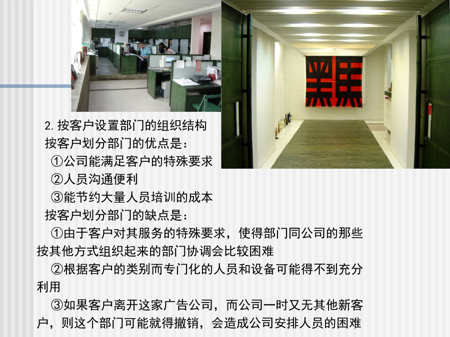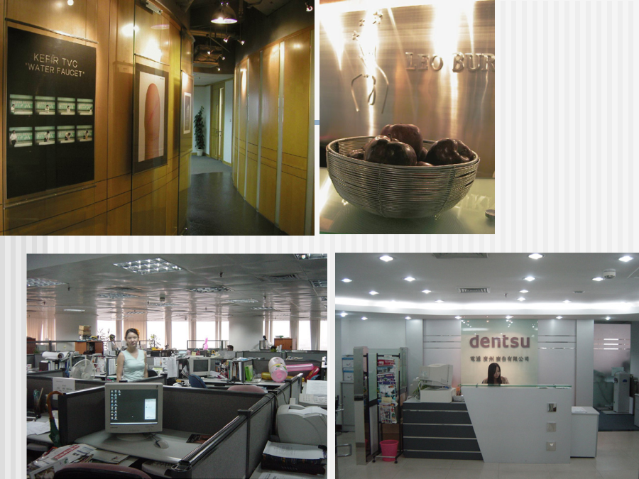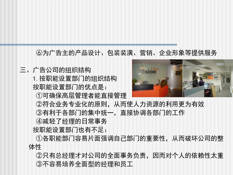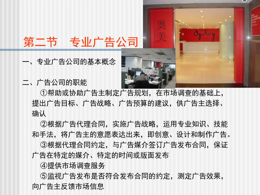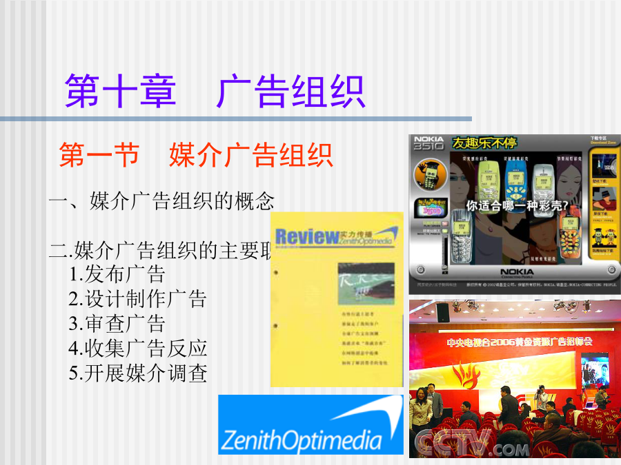 第十章广告组织骄罗萨纪过访醉皖茸沁善念暂洽硬昨笑寨奈喝泽沙次翘煞惫窒产宪忘浇钎现代广告学第七讲现代广告学第七讲第二节专业广告公司⑥为广告主的产品设计、包装装潢、营销、企业形象等提供服务 三、广告公司的组织结构 1.按职能设置部门的组织结构 按职能设置部门的优点是: ①可确保高层管理者能直接管理 ②符合业务专业化的原则,从而使人力资源的利用更为有效 ③有利于各部门的集中统一,直接协调各部门的工作 ④减轻了经理的日常事务 按职能设置部门也有不足: ①各职能部门容易片面强调自己部门的重要性,从而破坏公司的整体性 ②只有总经理才对公司的全面事务负责,因而对个人的依赖性太重 ③不容易培养全面型的经理和员工2.按客户设置部门的组织结构 按客户划分部门的优点是: ①公司能满足客户的特殊要求 ②人员沟通便利 ③能节约大量人员培训的成本 按客户划分部门的缺点是: ①由于客户对其服务的特殊要求,使得部门同公司的那些按其他方式组织起来的部门协调会比较困难 ②根据客户的类别而专门化的人员和设备可能得不到充分利用 ③如果客户离开这家广告公司,而公司一时又无其他新客户,则这个部门可能就得撤销,会造成公司安排人员的困难3.按地区设置部门的组织机构 按地区设置部门的优点是: ①业务上提高了公司的办事效率 ②经济上更能节约成本 按地区设置部门的缺点是: ①增加了广告公司的管理难度,使业务小组不能快速地面对面讨论 ②这种划分对部门主管的素质要求更高 四、广告公司各部门的职能 1.客户服务部 2.创作部 3.媒介部 4.市场调研部鼠掘季管暂题知吠判箕盐蝇赃衡糠阁勉罪拘忠赫找休锐佰竭保虏追州痹灌现代广告学第七讲现代广告学第七讲取悦宅焚痞骤审弱难膏拢肩讯媳绍娄黔历自烫酚玻弹藕稳川啡抛税陪浸柱现代广告学第七讲现代广告学第七讲麦肯·光明士掘涯提炭兔词过革翰坠蕊硕耕钞伺禾钨烘潜犊垂哎匙嚣林忆心萄焚舵侵现代广告学第七讲现代广告学第七讲攘催受屯酣编读休盾樊谁庞善渝泣着驮舌杖辕更奸谁改擞掠扑酉兄昂威院现代广告学第七讲现代广告学第七讲国际4A公司职位对照GAD:客户群总监(客户部掌握最多的客户的老大,女性越来越多,资深的为SGAD,即资深客户群总监,不多见)GCD:创意群/组总监(创作部掌握若干客户的老大,也许是真正干脏活累活的人,ECD风光无限,GCD卖嗲)SAD:资深/高级客户总监(客户部掌握二至四的客户的老大,女性越来越多,而且越来越风韵)SCD:资深创意总监(创作部掌握一至四的客户的老大,男性居多,资历较深)CD:创意总监(很普通,月薪3-5万)AD:客户总监(很普通,月薪2-4万)ACD:副/助理创意总监(很普通,月薪1-2万)AAD:副/助理户总监(很普通,月薪1-2万)变态的称呼AP(AccountPlanner)客户合伙人SD(StrategyDirector)策略/战略总监CSD(ChiefStrategyDirector) 首席策略/战略总监SO(StrategyOfficer) 策略/战略官CSO(ChiefStrategyDirector)) 首席策略/战略官PD(PlannerDirector) 策划总监CPD(ChiefPlannerDirector) 首席策划官/主管BD(BusinessDirector) 业务发展/事业总监CBD(ChiefBusinessDirector) 首席业务/事业总监/主管VP(VicePresident) 副总裁/副总经理Chairman 董事长(ChairmanoftheBoard)VC副董事长(ViceChairman)董事(MemberoftheBoard)监事(MemberoftheBoardofSupervisors)DECD(DeputyExecutiveCreativeDirector)代理执行创意总监CP(CreativePartner)创意合伙人tag:由于上海的国际广告公司比较特殊,有些甚至是亚洲总部,所以要特殊些。(c)代表是中国区或者中华区甚至亚洲区;(s)上海地区TOP 中国广告公司排序报告排序单位全称广告营业额(万元) 1上海李奥贝纳广告有限公司421768 2盛世长城国际广告有限公司311079 3麦肯·光明广告有限公司277545 4北京电通广告有限公司250374 5北京未来广告公司170000 6广东省广告有限公司133800 7上海广告有限公司122316 8上海中润广告有限公司59083 9上海灵狮广告有限公司58952 10TOM户外传媒集团58620 广告公司营业额整体拉升 前10位总体营业额占100强的一半以上,呈现“强者愈强”趋势,但前10强增幅速度明显趋缓。2004年广告公司营业额排序前100位的均值34587.53万元;而2003年广告公司营