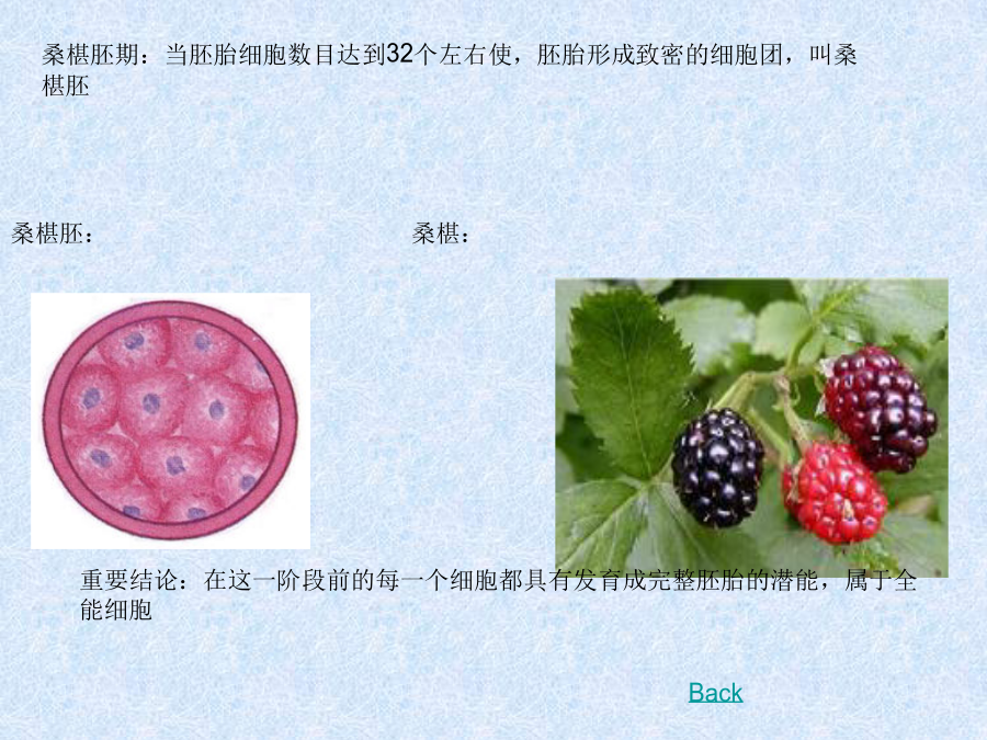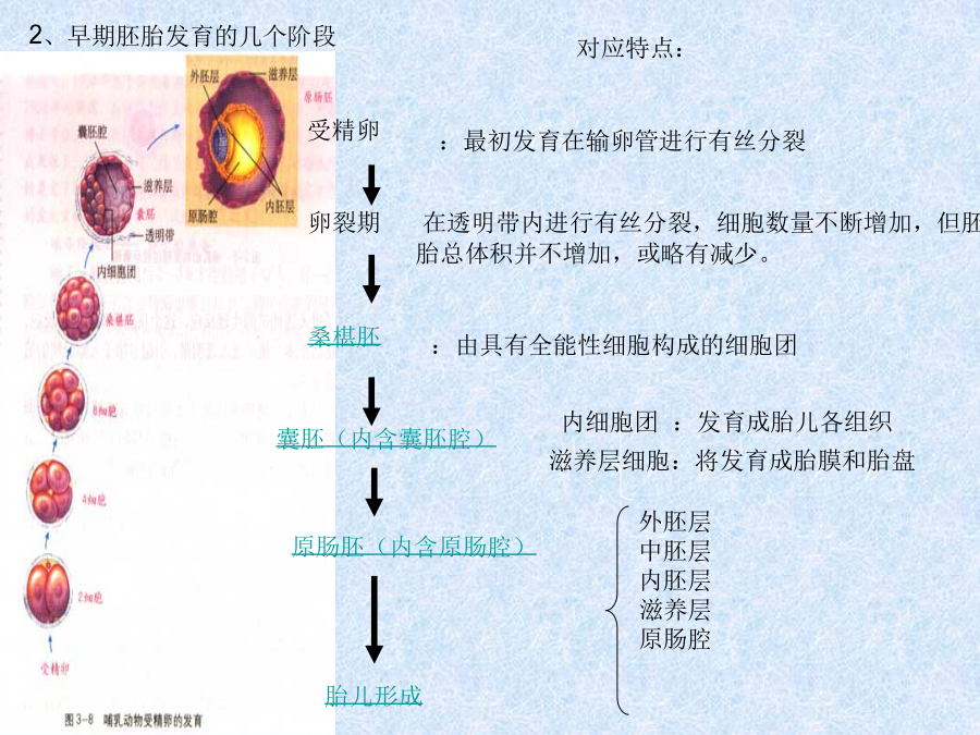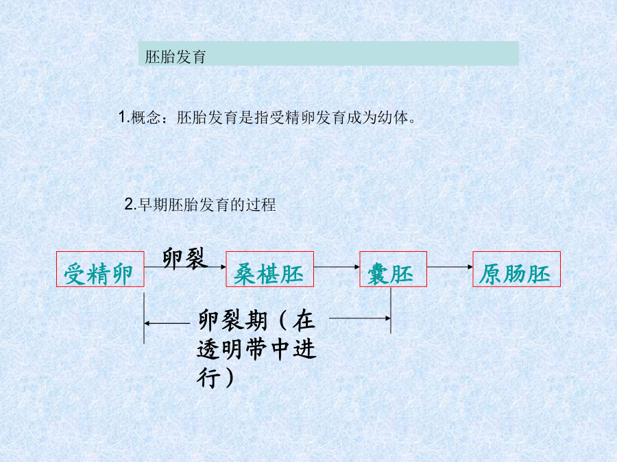 胚胎发育1、卵裂期的特点:受精卵囊胚期:囊胚出现细胞分化,聚集于一端个体较大的细胞为内细胞团(ICM),将发育为胎儿的各种组织;沿透明带内壁扩展和排列的个体小的细胞为滋养层细胞,将发育为胎膜和胎盘,为胎儿发育提供营养。 孵化定义:随着胚胎的进一步发育,出现了含有液体的囊胚腔,这个时期的胚胎叫做囊胚。囊胚进一步扩大,会导致透明带破裂,胚胎从其中伸展出来,叫做孵化。原肠胚期:胚胎孵化后,再进一步发育,内细胞团的表皮细胞形成外胚层,下方的细胞形成内胚层,这时的胚胎称为原肠胚。由内胚层包围的囊腔叫做原肠腔。 注意:是细胞分化最明显的时期例题 动物胚胎发育是一个非常复杂的过程,因为它是由一个细胞经过卵裂、原肠胚和器官形成等过程形成的一个结构复杂、充满生命活力的幼体。通过研究蛙胚发育过程,发现蛙的受精卵与原肠胚的体积相同。原肠胚3个胚层的细胞发育为不同的组织器官 (1)受精卵形成卵裂球的细胞分裂方式是() 随着卵裂的进行,卵裂的球(), 每个卵裂球的细胞核的遗传物质()。 (2)外胚层细胞只能增殖和分化为表皮和神经等组织细胞,而不能形成肌肉组织。这是因为3个胚层细胞中所含的基因是(),他们的分化方向不同,这是因为基因()的结果