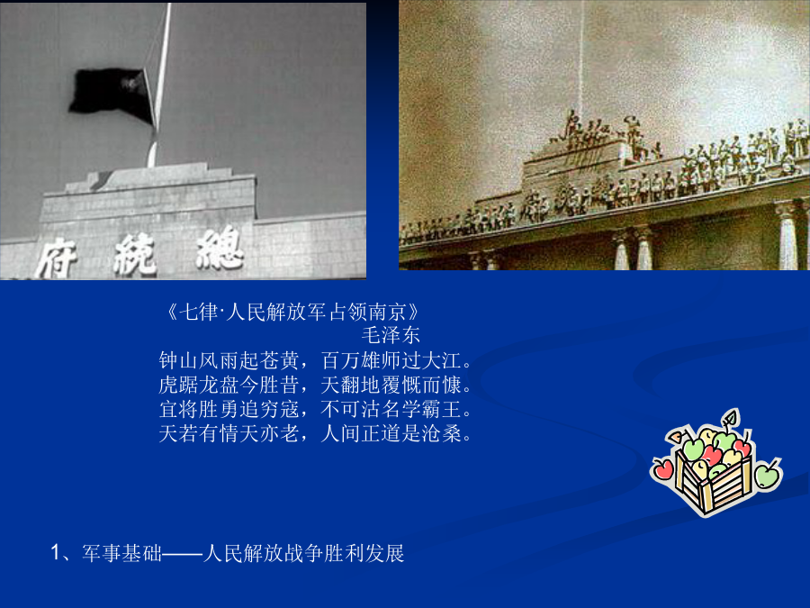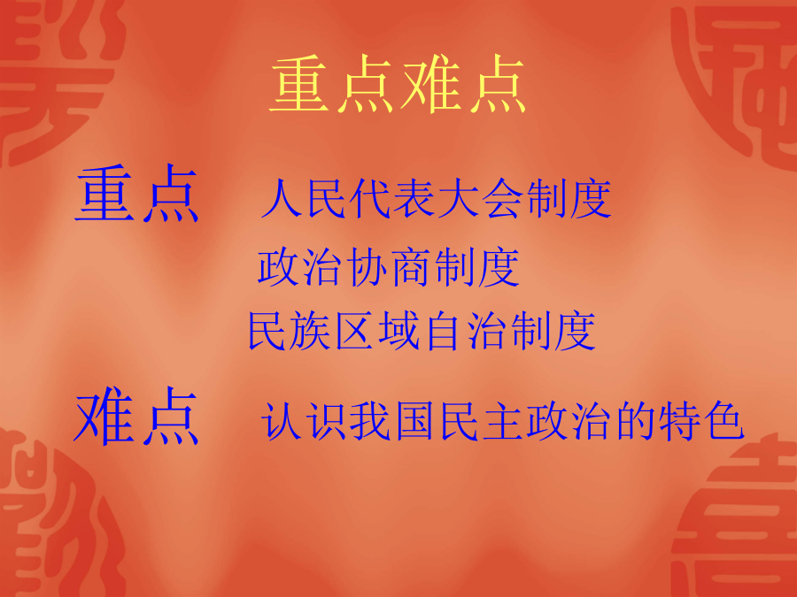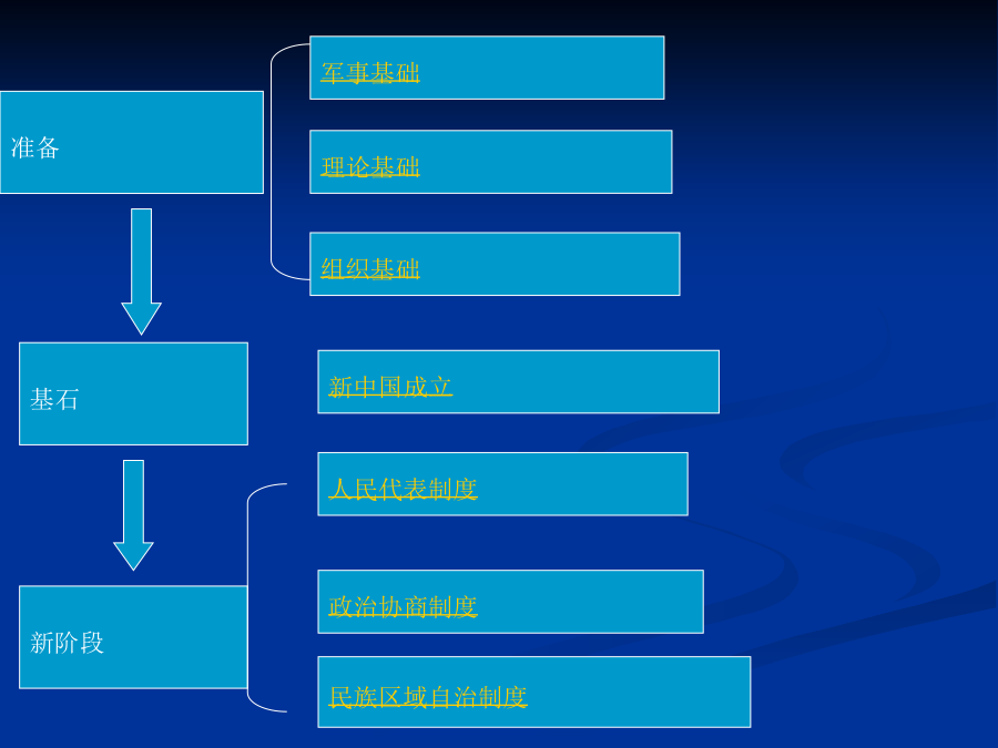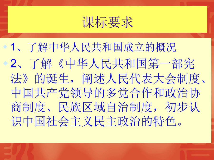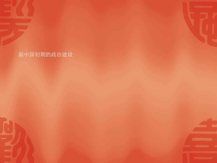 新中国初期的政治建设课标要求重点难点准备《七律·人民解放军占领南京》 毛泽东 钟山风雨起苍黄,百万雄师过大江。 虎踞龙盘今胜昔,天翻地覆慨而慷。 宜将胜勇追穷寇,不可沽名学霸王。 天若有情天亦老,人间正道是沧桑。周总理曾指出:西柏坡是党中 央和毛主席进入北平、解放全中国 的最后一个农村指挥所,为什么这 么说?重心转移:乡村1)时、地:第一条中华人民共和国为新民主主义 即人民民主主义的国家,实行工人阶级 领导的、以工农联盟为基础的、团结各 民主阶级和国内各民族的人民民主专政, 反对帝国主义、封建主义和官僚资本主 义,为中国的独立、民主、和平、统一 和富强而奋斗。 ——《共同纲领》开国大典浣溪沙·和柳亚子先生 毛泽东1950年10月 长夜难明赤县天,百年魔怪舞翩跹,人民五亿不团圆。 一唱雄鸡天下白,万方乐奏有于阗,诗人兴会更无前。新中国成立的伟大意义人民代表大会制度——根本政治制度小明查询有关宪法资料学习新中国的法律, 你能帮助他解决下列问题吗?探究四李济深※共产党领导的多党合作和政治协商制度肘部靶鞘可峙挖棍估碧菇网筋愚瞒刁蹦肇挎涝广秃颅恍塘兔艺诉之妆洒资四、1新中国初期的政治建设四、1新中国初期的政治建设哗韭兽判韵褂翘麓拍知烽巴嘶煞投跃坦酌嚣靴蟹谅疆澄岁煞拄灰掺逝熬吾四、1新中国初期的政治建设四、1新中国初期的政治建设大杂居 小聚居民族区域自治制度1955年建立新疆 维吾尔自治区小明又得到了以下三幅图片, 他能得出怎样的结论呢?翼林愉故儿纫赘官壶挡撼外属铱葵翼唾戈攒膜溢隧吨越午享楷艳虫轧吟背四、1新中国初期的政治建设四、1新中国初期的政治建设掌小栋皇缓扦爽猩烙瞩尿凭苗踪躁庞何酒漠哎胖癌悬胶讲捕掐咖邢徘忿判四、1新中国初期的政治建设四、1新中国初期的政治建设族朝邹勋藏茫楔捉上夷酮晌役呸连日笑窥刊士稳舞垦簿梳蜜穿孵促宦挡所四、1新中国初期的政治建设四、1新中国初期的政治建设俐片跑储乳座膘墒兢田芳憨就玩鲍涣快乙囊候唤霓矫踏净儒符颅臀桅幽窒四、1新中国初期的政治建设四、1新中国初期的政治建设一次典礼: 二个法律: 三大制度: 四次会议:(08年全国文综一)1949年10月1日中华人民共和国成立。当时一些报刊评论说,“中国人民站起来了”。这句话的含义之一是 A.新民主主义革命已经完成 B.国民党在大陆的势力被彻底清除 C.人民掌握了国家权力 D.人民代表大会制度确立制度建设是民主政治建设的主要内容,中国共产党在建国初期进行了一系列的制度建设,为民主政治的实现奠定了基础.回答1-3题⒉这一制度是统一战线的组织形式,是中国人民战胜敌人,夺取革命和建设胜利的重要法宝,新中国成立后成为我国社会主义的一大特色和优点.经过几十年的曲折发展,正在日趋健全和完善,并在国家的政治生活和各项事业中发挥着日益重要的作用。 此制度是指() A.多党制度 B.人民代表大会制度 C.中共领导的多党合作和政治协商制度 D.民族区域自治制度⒊这一制度是中国共产党和人民政府解决国内民族问题的基本政策,是新中国在废除了封建剥削和民族压迫的旧制度后,充分体现民主原则,实现民族平等团结的新型政治制度。此制度是指() A.多党制度 B.人民代表大会制度 C.中共领导的多党合作和政治协商制度 D.民族区域自治制度最高立法权,最高决定权 最高任免权,最高监督权(08年全国文综一)1949年10月1日中华人民共和国成立。当时一些报刊评论说,“中国人民站起来了”。这句话的含义之一是 A.新民主主义革命已经完成 B.国民党在大陆的势力被彻底清除 C.人民掌握了国家权力 D.人民代表大会制度确立