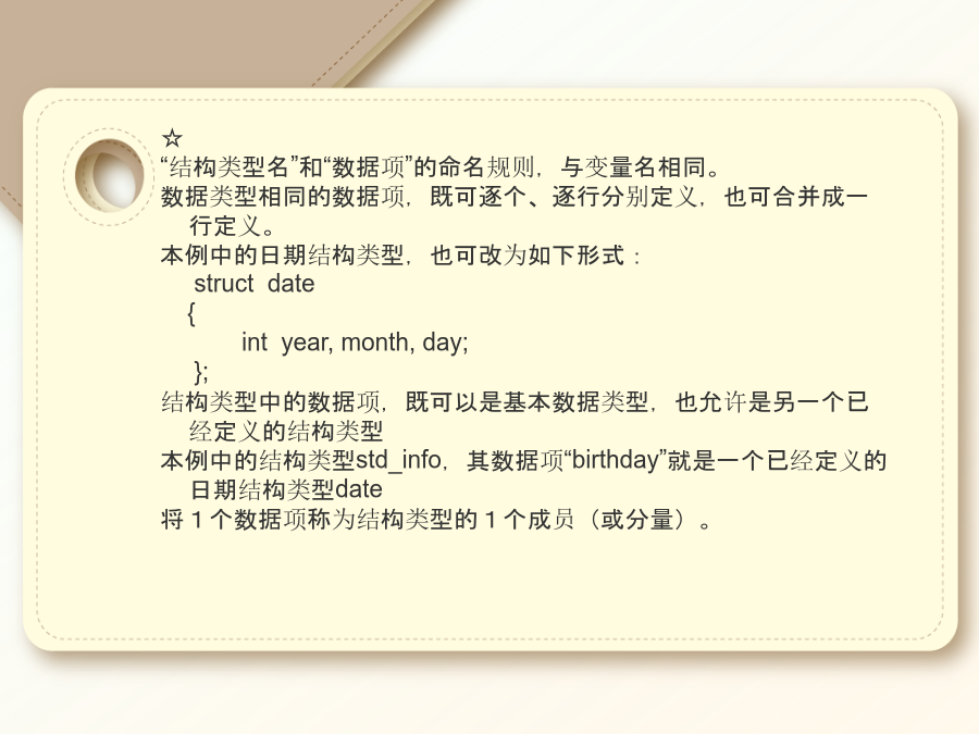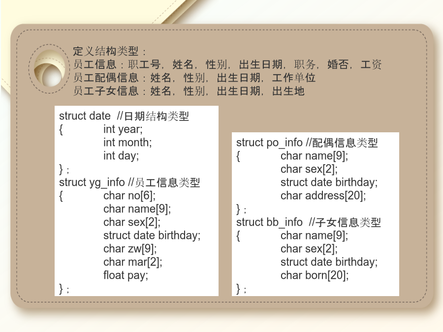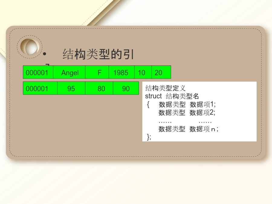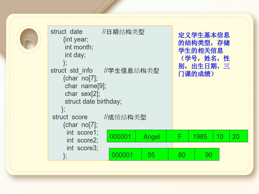 第二讲结构与链表结构类型的引入 structdate //日期结构类型 {intyear; intmonth; intday; }; structstd_info //学生信息结构类型 {charno[7]; charname[9]; charsex[2]; structdatebirthday; }; structscore //成绩结构类型 {charno[7]; intscore1; intscore2; intscore3; };structdate//日期结构类型 { intyear; intmonth; intday; }; structyg_info//员工信息类型 { charno[6]; charname[9]; charsex[2]; structdatebirthday; charzw[9]; charmar[2]; floatpay; };几个要注意的问题 类型与变量 结构变量的初始化 结构变量={初值表} structstd_infostudent={"000102",“angel",“f",{1980,9,20}} structstd_infostudent={000102,“angel",“f",{1980,9,20}} 成员运算符 student.nostudent.birthday.year student.birthday.year=2000 gets(student.no)指向结构类型数据的指针 结构变量在内存中的起始地址称为结构变量的指针#include"struct.h" //定义并初始化一个外部结构数组student structstd_infostu[3]={{"000102",“john",“m",{1980,5,20}}, {"000105",“apple",“f",{1980,8,15}}, {“000112”,“kitty”,“f”,{1980,3,10}}}; Voidmain() {structstd_info*p=stu; for(;p<stu+3;p++) {printf("%-7s%-9s%-4s",(*p).no,(*p).name,(*p).sex); printf("%4d-%2d-%2d\n",(*p).birthday.year, (*p).birthday.month,(*p).birthday.day); } }