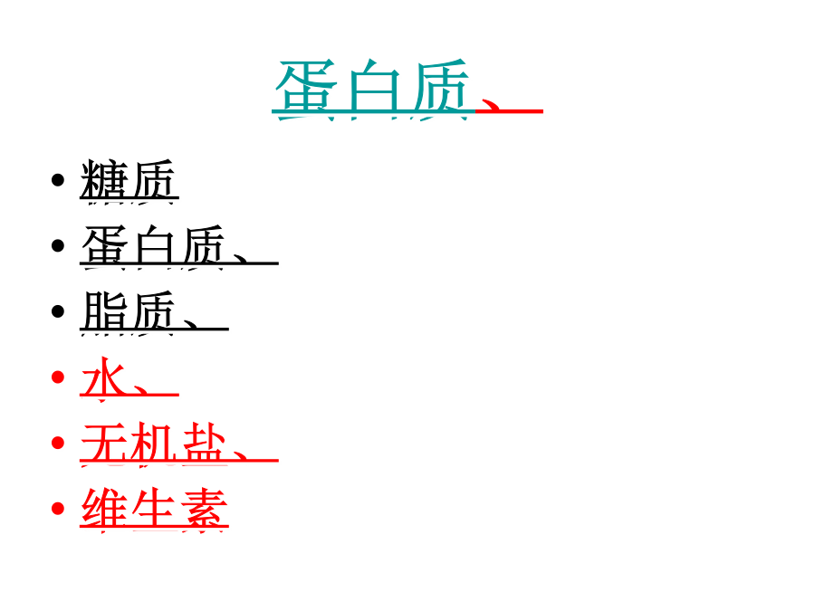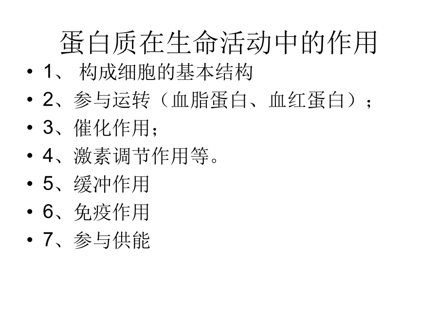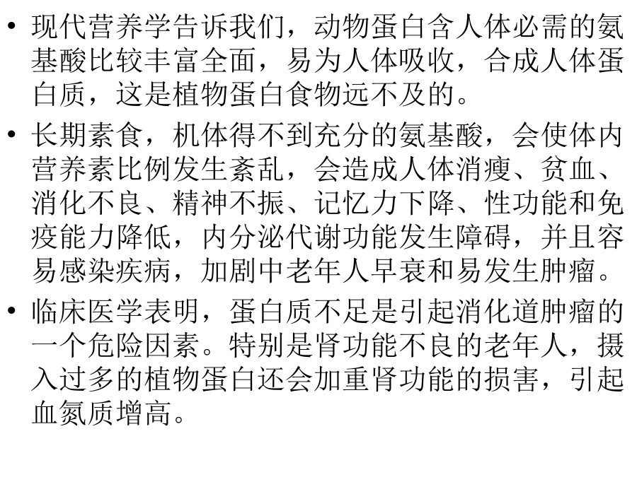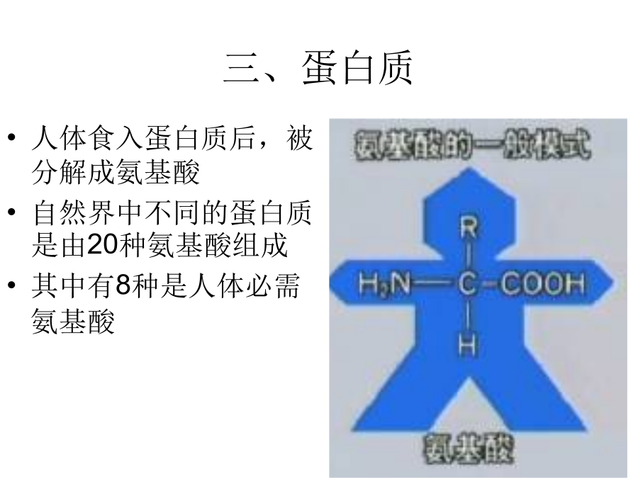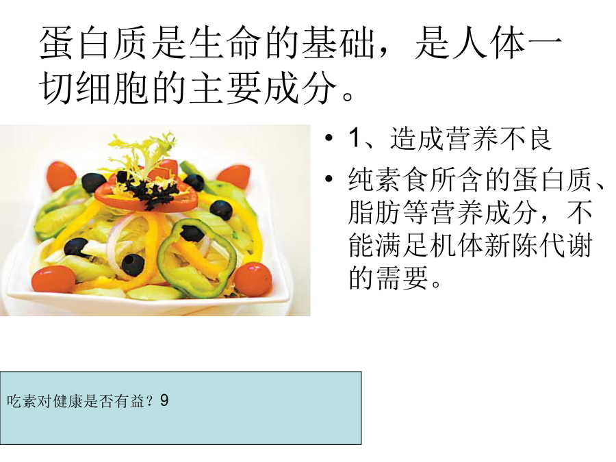 蛋白质、三、蛋白质蛋白质在生命活动中的作用蛋白质是生命的基础,是人体一切细胞的主要成分。拒绝吃肉,会造成动物Pr摄入不足,即使补充了植物蛋白,吸收和利用都远不及动物蛋白。 完全素食者Pr摄入不足时,人体内的糖、Pr、脂肪就会失衡,免疫力下降、记忆力下降、贫血、消化不良就会接踵而来。很多女性以为只要吃蔬菜就能减肥2、吃“素食”易长胖其实吃蔬菜也有无法减肥的时候,蔬菜容易吸油,反而更容易摄入更多油脂,会越吃越胖。 1g油约有9个热卡的热量; 1g蛋白质约有4个热卡的热量; 1g米饭中,只有4个热卡的热量。 只吃菜、不吃饭,会导致饮食中油多、蛋白质多,热量猛增,反而发胖。3、脂溶性V的极少摄入和吸收而缺乏,腹泻说来就来了 4、容易感觉迟钝、皮炎肆虐等。5、矿物质丢失 蔬果中含有丰富的膳食纤维,能促进肠胃消化,肠蠕动,减少了肠内容物通过肠道的时间,即缩短排便时间 加速胃肠道里的矿物质营养素的排出,造成体内的矿物质营养素未经吸收便已流失的不足。6、导致不孕7、不利于降压8、引起胆结石 长期吃素,卵磷脂摄入减少或肝脏合成降低; 素食中植物纤维的成分较多,可使胆汁酸的重吸收降低,胆盐浓度也降低; 素食者往往维生素A、维生素E的摄入不足,这两种维生素缺乏,使胆囊上皮细胞容易脱落,从而导致胆固醇沉积,形成结石。水水平衡水对生命的重要作用六种水不能喝老化水:千滚水:蒸锅水:不开的水:重新煮开的水:水——饭前饭后饮茶茶的优点:以茶入补、养生祛病PH对反应速度的影响(最适)无机盐五、营养素——无机盐的概述无机盐——占体重的5%钙钙来源——奶类、海带缺钙铁1、生理功能1、来源介绍一些铁含量高和吸收率强的食品,以供参考。 1、动物肝脏:肝脏富含各种营养素,是预防缺铁性贫血的首选食品。每100g猪肝含铁25mg,易被人体吸收。 2、各种瘦肉:瘦肉里含铁量不太高,但铁的利用率却与猪肝差不多3、鸡蛋黄:100g鸡蛋黄含铁7mg,尽管铁吸收率只有3%,但鸡蛋原料易得,食用保存方便,而且还富含其它营养素,它仍不失为补充铁的一种较好的辅助食品。 4、动物血液:猪血、鸡血、鸭血等动物血液里铁的利用率为12%,如果注意清洁卫生,加工成血豆腐,一个价廉方便的食品。 5、黄豆及其制品:每100g黄豆及黄豆粉中含铁11mg,人体吸收率为7%,远较米、面中的铁吸收率为高。6、芝麻酱:芝麻酱富含各种营养素,每100g芝麻酱含铁58mg,同时还含有丰富的钙、磷、蛋白质和脂肪7、绿色蔬菜:植物性食品中铁的吸收率不高 8、木耳和蘑菇:铁的含量很高,尤其是木耳,每1OOg含铁185mg,此外海带、紫菜等水产品也是较好的预防和治疗缺铁性贫血的食品。缺铁症状缺铁性红细胞锌缺乏锌两性健康维生素V是维持人体健康所必须的一类营养素,它们不能在体内合成,或者所合成的量难以满足机体的需要,所以必须由食物供给。 V的每日需要量甚少(ug或mg),在调节物质代谢、促进生长发育和维持生理功能等方面却发挥着重要作用 如果长期缺乏某种V,就会导致疾病分类:两类,14种。 脂溶性和水溶性 脂溶性维生素包括: 水溶性:10种 VC、 VA:被誉为“健美V”,痤疮——粉刺缺乏VA-会加速皮肤老化.VDVd缺乏VD缺乏——肋骨下陷枕秃VE的功能血管的清道夫VE:又名“抗衰老V”。VB2(核黄素)缺乏时,主要表现为口角炎、舌炎、阴囊炎及角膜血管增生和巩膜充血等。 幼儿缺乏它则生长迟缓。 VB2:被赞为“抗皮炎V”B2不足严重影响皮肤的美观膳食中长期缺少VB5可引起对称性皮炎,又叫癞皮病或糙皮病。 患者中枢及交感神经系统、皮肤、胃、肠等均受不良影响。 主要症状为两手及其裸露部位呈现对称性皮炎,发炎处有显著而界限清楚的色素沉着及腹泻等特征, 中枢神经方面表现为头痛、头昏、易刺激、抑郁等。VB9-叶酸脊柱裂VC 大多数动物能够利用葡萄糖以合成VC, 人体内缺少合成VC的酶类,不能合成VC,而必须依赖食物供给。 VC:有“美容V”之称,它能增强毛细血管的致密性,降低其渗透性及脆性。 如果缺乏,皮肤容易出现紫癜,齿龈易浮肿并出血。VC缺乏导致毛孔粗大维生素是毒药?乍一看题目似乎很吓人,其实这样争论已经由来已久。 文中所调查的对象主要是大量服用者和少量正常服用者。 什么叫“物极必反”,凡药三分毒。 如果说V是毒药,任何的食品都是毒药。 水是生命之源,并不是说水可以治疗任何一种病;人体有8种必需AA并不是说我们要专门去服用。 美国是V消费大国,据说,美国人的尿含有“大量”的剩余维生素。人容易从一个极端走向另一个极端,不管是政治家还是科学家。 两次荣获诺贝尔奖金的美国著名化学家鲍林出版了两本大力推崇维生素C的书 《维生素C与普通感冒》, 《癌症与维生素C》, 提出正常人每天服用1000mg维生素C,癌症病人每天服用10000m