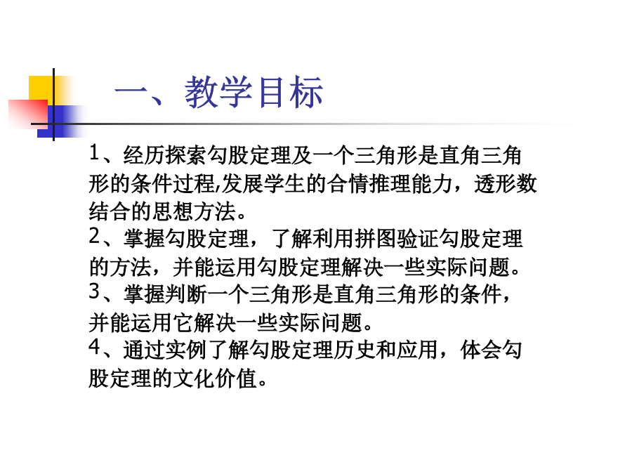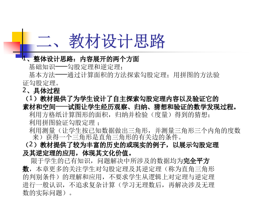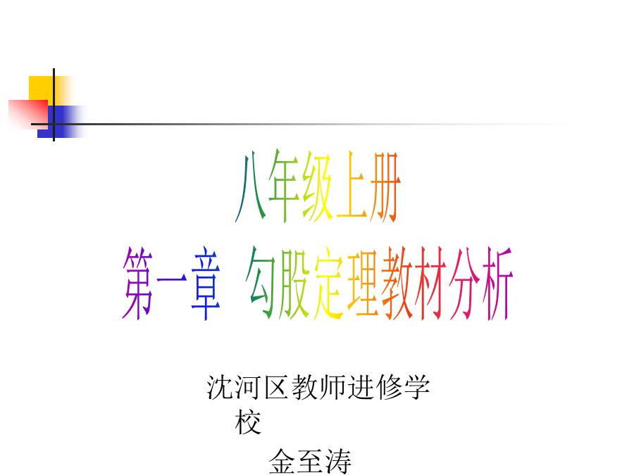 沈河区教师进修学校 金至涛章课时与教学进度第一章勾股定理 一、教学目标二、教材设计思路三、教学建议四、几个具体问题A的面积是个单位面积 B的面积是个单位面积 C的面积是个单位面积观察图并填写下表:勾股定理想一想 1、如图,一根旗杆在离地面9米处断裂,旗杆顶部落在离旗杆底部12米处,旗杆折断前有多高?3、拼图验证勾股定理的方法(1)如图1,学生用四个全等的等腰直角三角形拼成了一个以斜边为边长的正方形,教师引导学生观察、思考正方形与四个直角三角形的关系,启发学生用“等积”的方法得到:(2)将上图中的四个等腰直角三角形沿斜边c向外翻转得到图2,由于面积不变,故仍可直接得出:(3)学生用四个全等的非等腰直角三角形拼成如图所示的图形,教师引导学生观察、思考,仿上题方法利用面积关系可得到:(4)学生用四个全等的非等腰直角三角形拼成如图所示的图形,仿上题方法利用面积关系可得到:4、锐角三角形、钝角三角形的三边是否也满足这一关系?第二节能得到直角三角形吗1、古埃及人做直角的方法 古埃及人曾用下面的方法得到直角:如图所示,他们用13个等距的结把一根绳子分成等长的12段,一个工匠同时握住绳子的第1个结和第13个结,两个助手分别握住第4个结和第8个结,拉紧绳子,就会得到一个直角三角形。这是为什么?5、什么样的数是勾股数第三节蚂蚁怎样走最近1、创设问题的方法 实践性,密切联系生活实际 开放性,问题结论或条件的开放 探究性,可连续深化 如:14页,15页,17页,18页 2、审题习惯的养成课题学习: 拼图与勾股定理1知识目标:经历用不同拼图方法验证勾股定理的过程,体会数形结合的思想以及数学知识之间的内在联系; 2能力目标:通过丰富有趣的拼图活动,探究勾股定理的证明过程,进一步体会勾股定理的文化价值,增强学生探究思维能力、逻辑推理能力,发展空间观念,发展探索精神和创新意识; 3情感目标:培养学生的自主意识和反思能力,激发学生探究数学的兴趣,发扬合作学习的精神,养成独立思考、严谨科学的学习习惯;通过获得成功的体验和克服困难的经历,增进学生学习数学的信心。 1、教材设计思路2、教学建议引言 ICM---2002 1.教师引导学生动手做一副五巧板(如图所示) 2、关键:把斜边上的正方形拆成直角边上的两个正方形 用两副五巧板,将其中的一副拼成一个以c为边长的正方形;将另一副拼成两个边长分别为a、b的正方形。你拼出来了吗?你能验证勾股定理了吗?3.用上面的两副五巧板,还可以拼出如下所示的图形: 方法三:刘辉与“青朱出入图” 把两直角边上的正方形割补后,拼成斜边上的正方形。用上面的五巧板,还可以拼出“青朱出入图”。刘徽在他的《九章算术》中给出了注解,大意是:三角形ABC为直角三角形,以勾为边的正方形为朱方,以股为边的正方形为青方;以盈补虚,将朱、青二方并成弦方,依其面积关系有,由于朱方、青方各有一部分在弦方内,那一部分就不动了。1.在一张长方形的纸板上画两个边长分别为a、b的正方形,并连结BC、EF,如图所示; O4.比较图1、图2中两个多边形ABCDEF和ABCDEF的面积, 你能验证勾股定理吗? 让学生相互交流、讨论、合作,利用面积关系可得到: 练一练