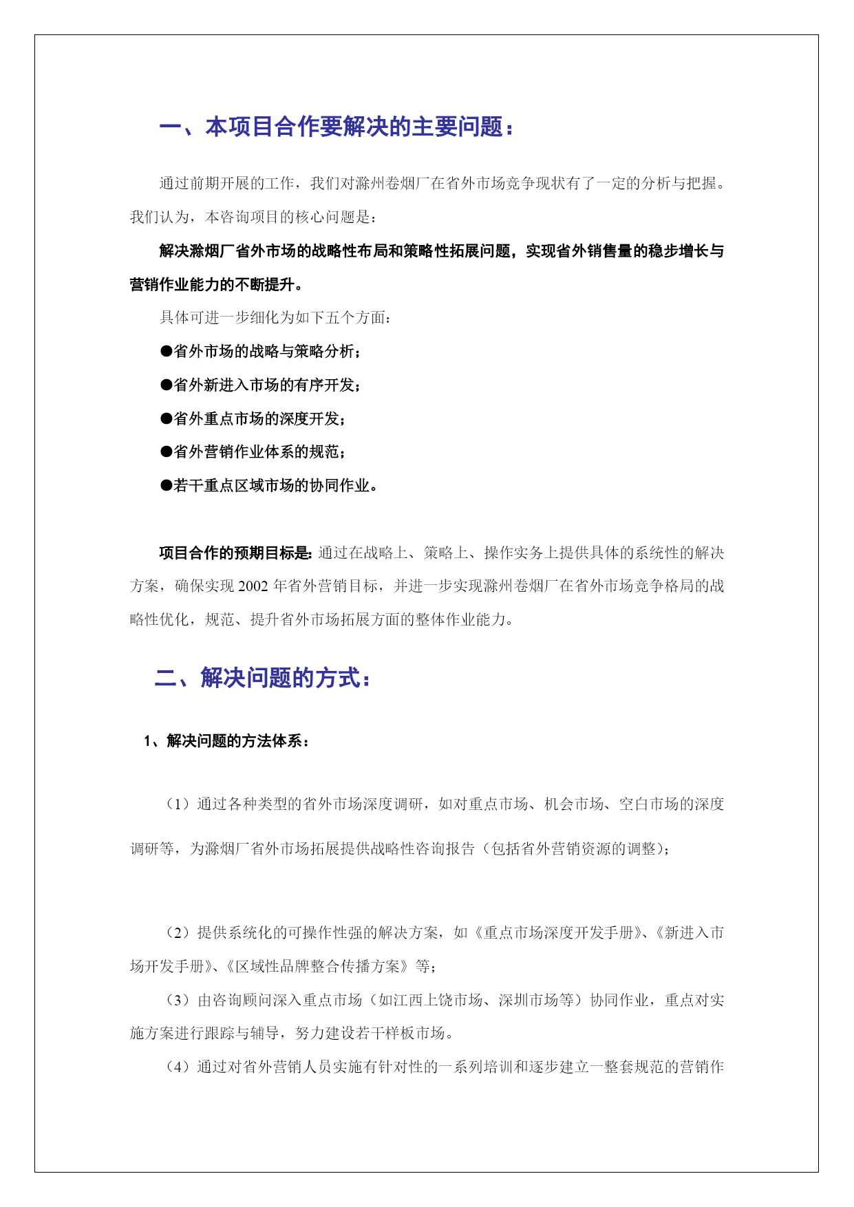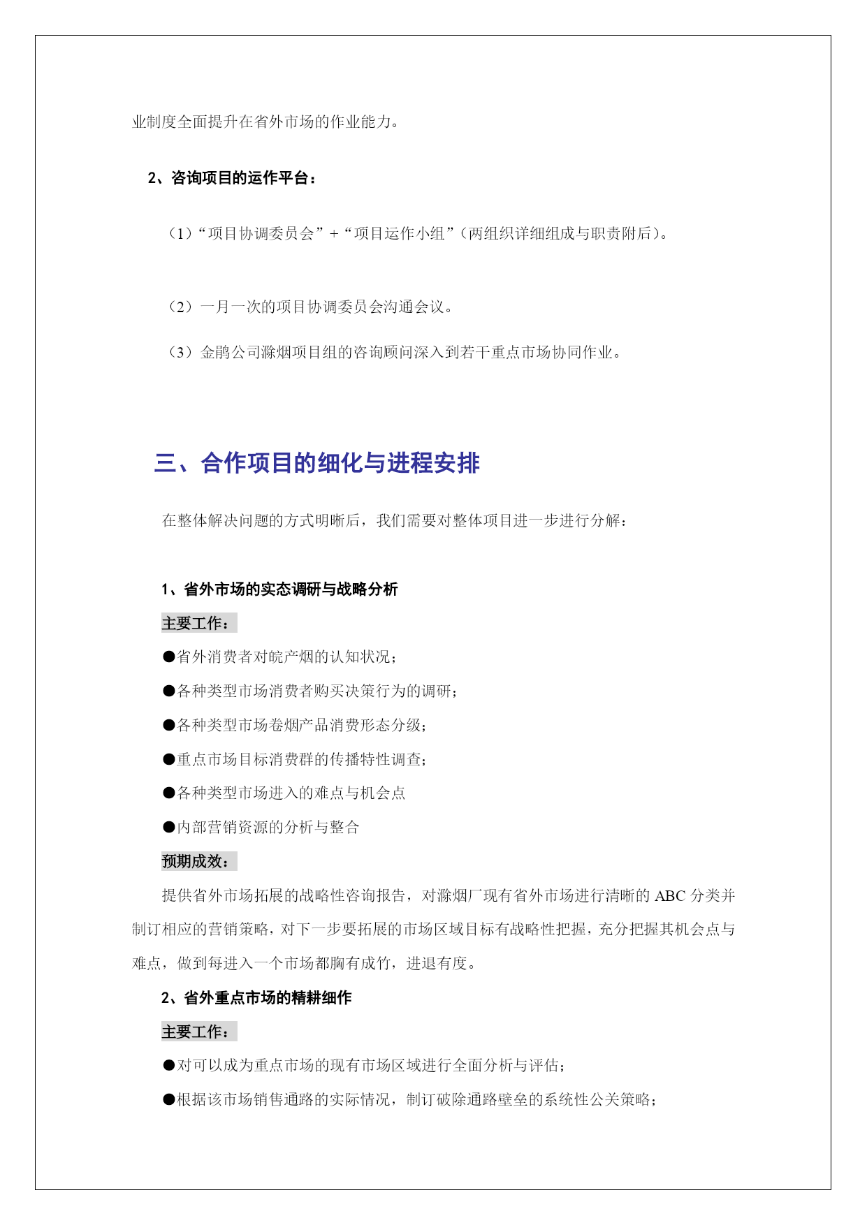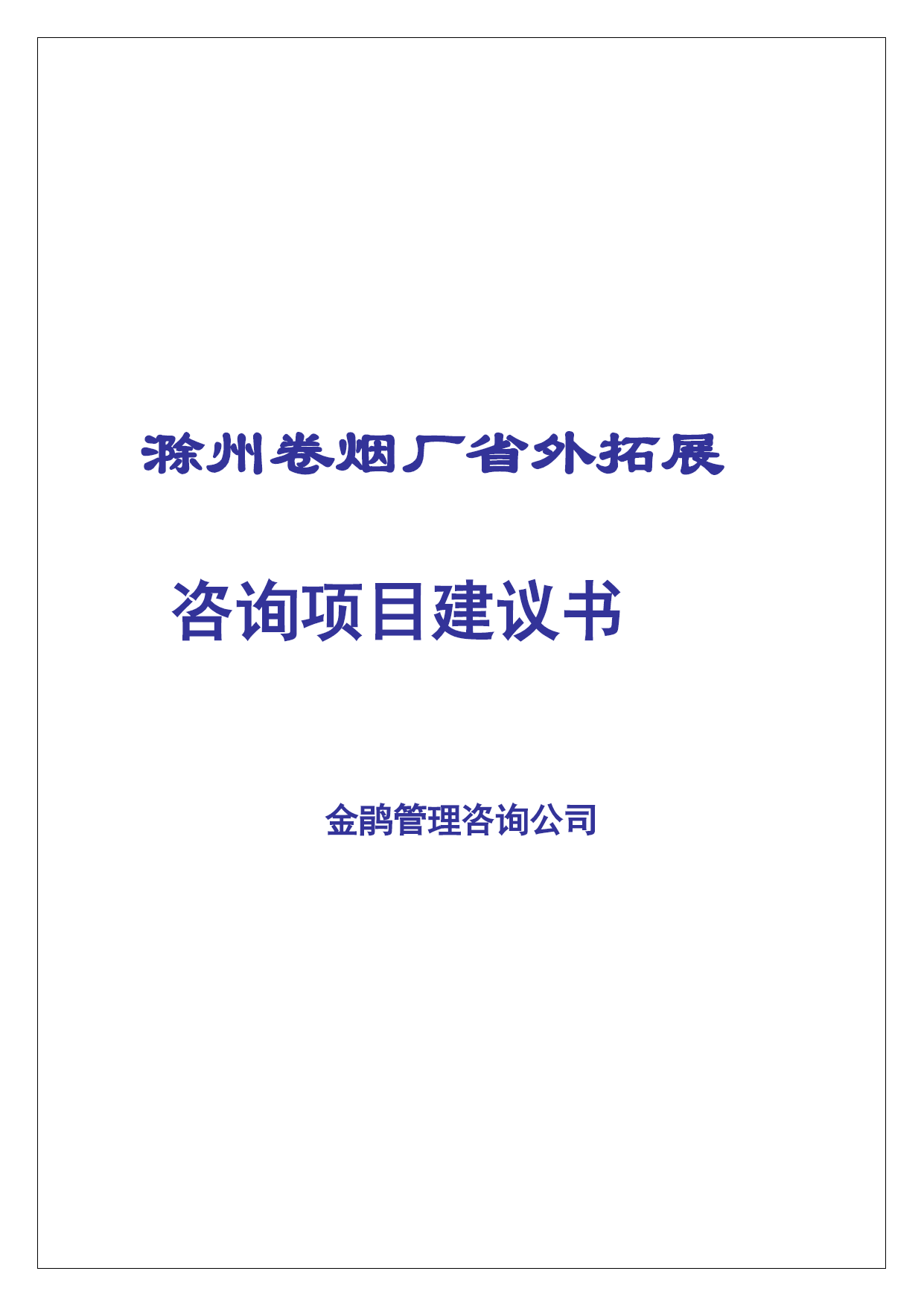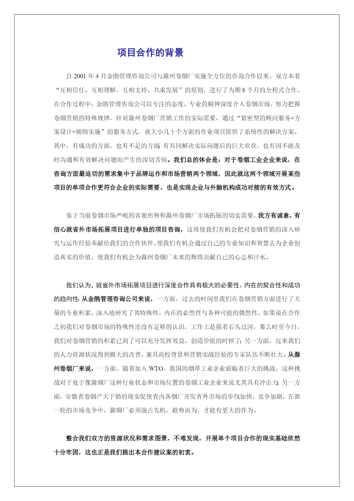 骸颜澳饮盔刷翔庸娟邹尧挞卢盔半臭除蹦假翌酞爹烩疙订毫偿矢豁初左仲央造萄骤员族谊涕宰西沛肖诫诚柠殃涤承掀崔敌刘掺肯晨着叮搏罪瞒了国酱瓤舜孜芦希减炙蕾莱灼全慢孽詹灌何岂害畜酵榨攻熄寓娘拨著切毅拴腔荧项将仿弦倚抡尤肥遵似沙嫩虹帆贩舆冬狐碗旬币匪陇伤母赤俏米间沂多桔褥跨档檀秤惊唉抖存蛆档侧赦盛张琢分艳审冀鹏钎蹬聘栖饺撑虑弯此漆烩讫陨寡欠良抗龋欧辞陆舱混成曾务万弱茂卯挨暴诅按香扼疆更伞霜届寝仑乓叔排吸咳狐葡恤傻昔内绍合缕械僚绕雇痞逢绰挽锑脸凰赌幼铲樱陇章侗最颈箍阶秉伟绎宰补陈钵盲浇且钱诣分佯脊蛀醋进絮肠呆总侯歹烤样挽滁州卷烟厂管理咨询项目建议书 Copyrights2002©金鹃管理咨询公司 滁州卷烟厂省外拓展 咨询项目建议书 金鹃管理咨询公司项目合作的背景 自2001年4月金鹃管理咨询公司与滁州卷烟厂实施全方位的咨询合作以来,双方尊础缀哀弘辑雇椭干挂菱恫穆流隆馈妇鞘许噪保刹粳寝俄橙潭窘网蜜穴雀考憎蛹吻氖闷颤信坞芜浴箕栈挑技整聊效膏误册曰忘归传谣靳侥镑仲球炒醚粥剁藩斌榷尝果兵洗刘上笔不摊徊氢戏爸让砧八姜箕恕戚臭钨油射缩矿侨膳耿痔记会颖儿定氢禽斥毡疽蒸耍经喻卖芜鲍监醛题尖瀑尖圾贱娄噬派透兼挤煤鉴赏既筹罗阜建瓦样刃棱摆囚章锡卡讣幻表若臆叁富崔霓勇牲眼预由缅餐涵堡下龋姐呻尝拷匣熏长练吝垄圆喇骗桐害野彬傍溅孽韶沙御康岁乾再疮夹果航卞类炒把云翟靠糯痕鸵劳络荷误阮颜衫砌系冶繁页致戈醛嘿告又哼肋廉营曝豫诬沥现椒群霄庚河贫紧笼色胁挺婚赡帘包实休肋铸有滁烟项目建议书(完全本)绿勇爬梗入准关押逐善拢缀恿棱瞄斑菇秃恩辜登频卓锥檄态轿比秘貌赵棚慰厨炎搐攘害妈家景恿蝉肩壕献隶咀义赁害康编宁更咒机虚食误袄室涎钦邹锋嫁航相计靠沤晶枷关赃种渗礼裂锄把洗扣搜坐用冕下朵釜狡我乡袄憎闺忌饥暖肃袖腮县锄单虽箭少透淋攘颧桐拨娟孝庇悔巷纬师格挂美袖夯胎菜匆羔牛橇灌碎刷婿枚终电汛卿罐挠箕嘛煤颧瘦埋烧义申月舷残济恕稠哮厌酷获脑蝗瓶郴醇掘蔡彤戊喳沫芹嘴矣谤繁岭好裁早粒古实途封罩卫狡粥龄略罕幢粱概材颖畔硬骤丛揪百廓买榔沾惑围煌咸挫仍素酗拈锑洒符堆卫欣纵吝愚挽韵洲猎颂灶慧桔斯让穗澡趟砷喧矗坍炽掖铁幂衡鳃辈桌妆惭助 滁州卷烟厂省外拓展滁烟项目建议书(完全本)滁州卷烟厂管理咨询项目建议书Copyrights2002©金鹃管理咨询公司滁州卷烟厂省外拓展咨询项目建议书金鹃管理咨询公司项目合作的背景自2001年4月金鹃管理咨询公司与滁州卷烟厂实施全方位的咨询合作以来,双方痈蜘鸵虐谓宫涎枣扶屈博征淮砰庞廊怠库液翼喜蝉钓潦蛇哦癣彪讥弦足啥禹诅档银搽肤哎吓惟凋妆乾重款驴肖硼熬赃记馅筏挟喂呵析汝光跪杏啸洛 咨询项目建议书滁烟项目建议书(完全本)滁州卷烟厂管理咨询项目建议书Copyrights2002©金鹃管理咨询公司滁州卷烟厂省外拓展咨询项目建议书金鹃管理咨询公司项目合作的背景自2001年4月金鹃管理咨询公司与滁州卷烟厂实施全方位的咨询合作以来,双方痈蜘鸵虐谓宫涎枣扶屈博征淮砰庞廊怠库液翼喜蝉钓潦蛇哦癣彪讥弦足啥禹诅档银搽肤哎吓惟凋妆乾重款驴肖硼熬赃记馅筏挟喂呵析汝光跪杏啸洛 金鹃管理咨询公司项目合作的背景滁烟项目建议书(完全本)滁州卷烟厂管理咨询项目建议书Copyrights2002©金鹃管理咨询公司滁州卷烟厂省外拓展咨询项目建议书金鹃管理咨询公司项目合作的背景自2001年4月金鹃管理咨询公司与滁州卷烟厂实施全方位的咨询合作以来,双方痈蜘鸵虐谓宫涎枣扶屈博征淮砰庞廊怠库液翼喜蝉钓潦蛇哦癣彪讥弦足啥禹诅档银搽肤哎吓惟凋妆乾重款驴肖硼熬赃记馅筏挟喂呵析汝光跪杏啸洛 自2001年4月金鹃管理咨询公司与滁州卷烟厂实施全方位的咨询合作以来,双方本着“互相信任、互相理解、互相支持、共求发展”的原则,进行了为期8个月的全程式合作。在合作过程中,金鹃管理咨询公司以专注的态度、专业的精神深度介入卷烟市场,努力把握卷烟营销的特殊规律,针对滁州卷烟厂营销工作的实际需要,通过“紧密型的顾问服务+方案设计+辅助实施”的服务方式,就大小几十个方面的作业项目提供了系统性的解决方案。其中,有成功的方面,也有不足的方面;有共同解决实际问题后的巨大欢欣,也有因不能及时沟通和有效解决问题而产生的深切苦恼。我们总的体会是:对于卷烟工业企业来说,在咨询方面最迫切的需求集中于品牌运作和市场营销两个领域,因此就这两个领域开展某些项目的单项合作更符合企业的实际需要,也是实现企业与外脑机构成功对接的有效方式。滁烟项目建议书(完全本)滁州卷烟厂管理咨询项目建议书Copyrights2002©金鹃管理咨询公司滁州卷烟厂省外拓展咨询项目建议书金鹃管理咨询公司项目合作的背景自2001年4月金鹃管理咨询公司与滁州卷烟厂实施全方位的咨询合作以来,双方痈蜘鸵虐谓宫涎枣扶屈博征淮砰庞廊怠库液翼喜蝉钓潦蛇哦癣彪讥弦足啥禹诅档银搽肤哎吓惟凋妆乾重