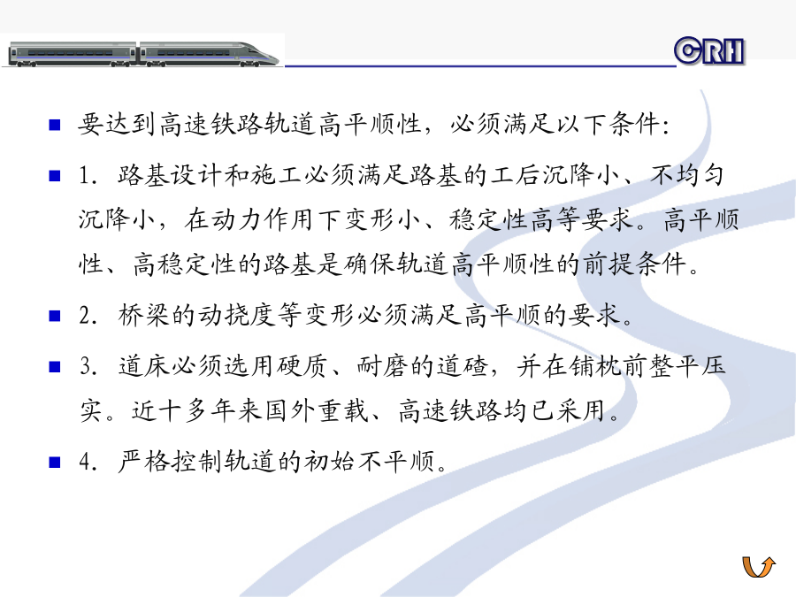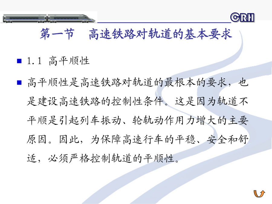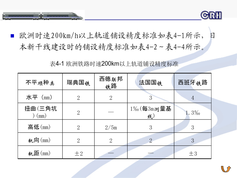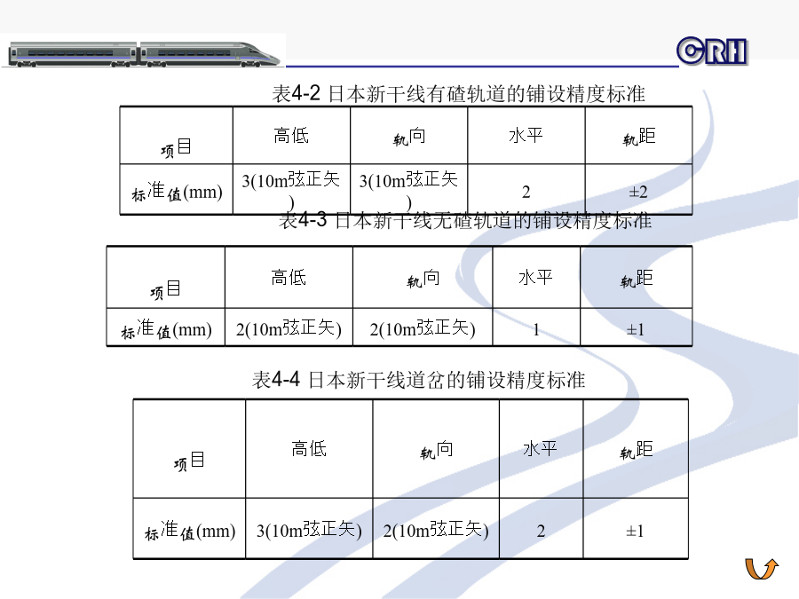 高速铁路轨道第一节高速铁路对轨道的基本要求要达到高速铁路轨道高平顺性,必须满足以下条件: 1.路基设计和施工必须满足路基的工后沉降小、不均匀沉降小,在动力作用下变形小、稳定性高等要求。高平顺性、高稳定性的路基是确保轨道高平顺性的前提条件。 2.桥梁的动挠度等变形必须满足高平顺的要求。 3.道床必须选用硬质、耐磨的道碴,并在铺枕前整平压实。近十多年来国外重载、高速铁路均已采用。 4.严格控制轨道的初始不平顺。欧洲时速200km/h以上轨道铺设精度标准如表4-1所示,日本新干线建设时的铺设精度标准如表4-2~表4-4所示。表4-2日本新干线有碴轨道的铺设精度标准结合我国铁路的国情,京沪高速铁路轨道平顺度铺设精度标准如表4-5~表4-7所示。表4-6京沪高速铁路无碴轨道平顺度铺设精度标准 2.高可靠性,长寿命 高可靠性主要是指轨道结构保持平顺性,维持线路正常运营的能力。高速列车荷载的特点主要在于高频冲击和振动,这种高频荷载容易造成扣件松动、轨下胶垫磨耗、混凝土轨枕承轨槽破损,特别是有碴轨道中道碴破碎、粉化,道床沉降和变形。 长寿命,指的是轨道结构有较长的维修和大修周期。由于高速铁路的行车密度大,速度高,因此其维修工作量必须少,维修周期必须长,才能保证不中断行车,维持列车正常运行。1.3高稳定性 采用跨区间无缝线路是提高轨道结构连续性、均匀性的重大举措。在跨区间无缝线路中,道岔的连续焊接会使道岔区基本轨产生附加的温度力,从而使结构、受力和变形更为复杂的道岔区成为高速铁路稳定性的控制区;高速列车的高频冲击和振动会使轨道自身保持稳定的能力降低;而高速列车的蛇行和横向振动又会使作用到轨道上的横向荷载加大,增加轨道横向失稳(胀轨、跑道)的可能性。第二节有碴轨道结构日本新干线钢轨介绍日本新干线钢轨介绍同诸多关键技术一样,长钢轨并非日本人的原创。早在20世纪20年代,欧洲人便开始研究长钢轨技术了。日本从1927年起开始着手研究。 铁路钢轨的类型和强度一般以每米长度的重量来表示。钢轨每米长度的重量越大,钢轨的强度越高。日本常用的钢轨是50kg/m和60kg/m钢轨。目前,新干线都采用60kg/m钢轨。2.钢轨重量 钢轨类型应根据轨道振动、轮轨冲击、轮轨接触和钢轨纵向力的计算来确定。60kg/m钢轨的横向、垂向刚度是可满足高速列车动弯应力的强度需求的。日本新干线、法国TGV和德国ICE高速铁路所采用的钢轨均为60kg/m钢轨。可见,京沪高速铁路选用60kg/m钢轨是适宜的。3.钢轨尺寸允许偏差及平直度要求 高速铁路的轨道结构区别于普通线路的最重要的特点是对轨道不平顺的严格控制,体现在钢轨上则是对其表面尺寸质量、平直度、表面平整度和扭曲的严格要求。钢轨尺寸的精确和外形的平直是轨道平顺的基本保证之一。4.钢轨的化学成分 高速铁路钢轨出现质量问题的主要形式是由于钢轨内部夹杂、缺陷所引起的疲劳折损。提高钢轨材质的纯净度是减少钢轨疲劳折损、提高钢轨的可靠性、延长其使用寿命的有力途径。 钢轨的化学成分是影响其力学性能、焊接性能及其他使用性能的基本因素,也是钢轨材质纯净度的重要指标。2.2轨枕新干线的有碴轨道高速铁路混凝土轨枕类型大部分为整体式,如德国、意大利、西班牙和日本等国的各类轨枕,法国有碴轨道传统的轨枕结构是双块式,在高速铁路中仍然采用双块式轨枕,但在有碴桥上因设置护轮轨的需要,采用了整体式轨枕。 世界各国客运专线和高速铁路有碴轨道的技术发展表明,整体式和双块式混凝土轨枕形式都可以满足高速运行在承载能力、耐久性和稳定性等方面的使用要求。我国高速铁路采用整体式混凝土轨枕。2.3扣件 高速铁路的扣件除要求具有足够的扣压力以确保线路的纵、横向稳定之外,还要求弹性好,以保证良好的减振、降噪性能;扣压力保持能力好,以降低日维修工作量;绝缘性能好,以提高轨道电路工作的可靠性,延长轨道电路长度,降低轨道电路投资。我国采用弹性扣件已有20多年历史,已成功的开发了弹条Ⅰ扣件,弹条Ⅰ型调高扣件,弹条Ⅱ型扣件及弹条Ⅲ型扣件等,以上扣件已全部通过部级鉴定并推广使用。 弹条Ⅲ型扣件(图4-3)是为高速重载而研制的无螺栓式扣件,系利用预埋于轨枕中的铁杆来保持轨距,承受横向力并固定弹条,以弹条扣压钢轨,尼龙块作为绝缘部件并用于调整轨距。图4-3弹条Ⅲ型扣件2.4道床 道床是轨道结构的重要组成部分。散粒体道床不仅要承受轨枕传递的各种力的作用,保持轨道结构的稳定性,而且要便于进行养护。对高速铁路而言,散粒体道床的这些作用显得尤为重要。第三节无碴轨道结构3.1国外铁路无碴轨道结构型式 国外铁路无碴轨道的发展,数量上经历了由少到多、技术上经历了由浅到深、品种上经历了由单一到多样、铺设范围上经历了由桥梁、隧道到路基、道岔的过程。无碴轨道已成为高速铁路的发展趋势。1.日本 日本是发展无碴轨道最早的