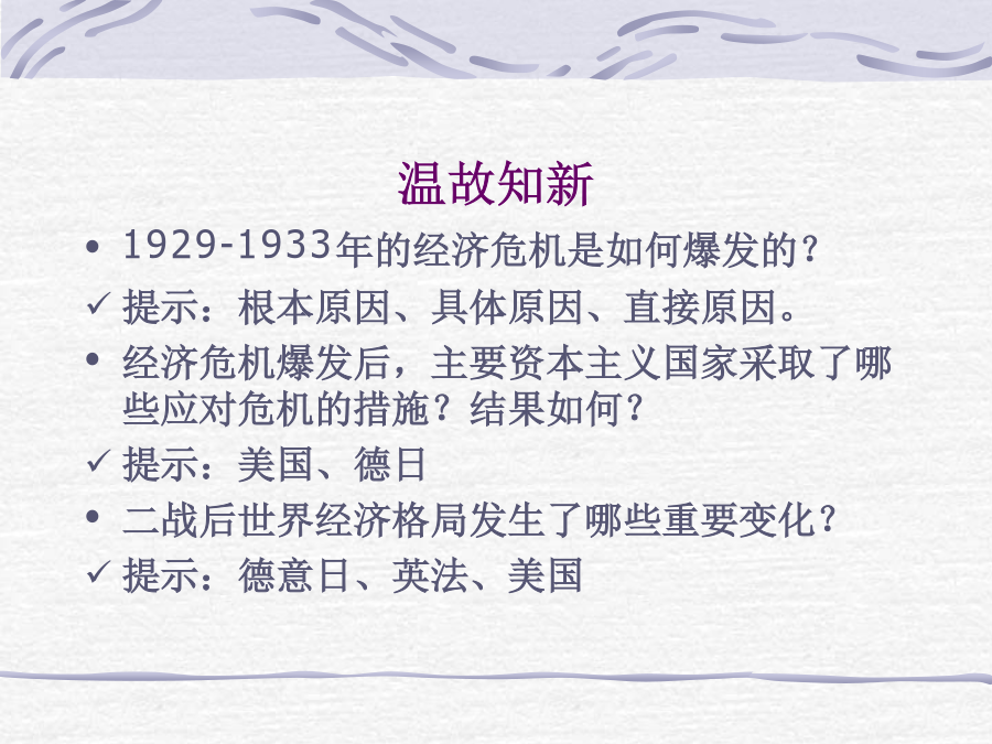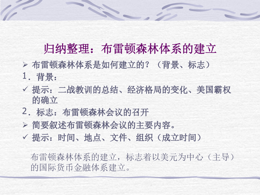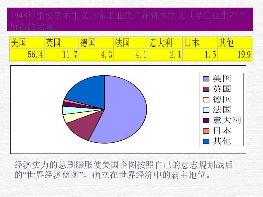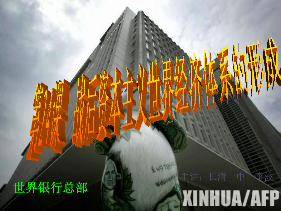 世界银行总部温故知新1948年主要资本主义国家工业生产在资本主义世界工业生产中所占的比重归纳整理:布雷顿森林体系的建立国际货币基金组织(theInternationalMonetaryFund,IMF),是政府间的国际金融组织。它是根据1944年7月在美国新罕布什尔州布雷顿森林召开联合国国际货币金融会议上通过的《国际货币基金协定》而建立起来的。于1945年12月27日正式成立,1947年3月1日开始办理业务。至今,IMF已有180多个成员。IMF主要业务活动有:向成员提供货款,在货币问题上促进国际合作,研究国际货币制度改革的有关问题,研究扩大基金组织的作用,提供技术援助和加强同其它国际机构的联系。1945年,世界银行成立,总部设在美国首都华盛顿。世界银行的宗旨是向成员国提供贷款,以促进该国的经济恢复和发展,推动并促进国际贸易的均衡增长。归纳整理:以美元为主导的国际货币金融体系的形成综合探究:评价布雷顿森林体系世界贸易组织开会场景归纳整理:以美国为中心的国际贸易体系的形成综合探究:战后资本主义世界经济体系的形成知识整合:战后资本主义世界经济体系的形成世界银行总部