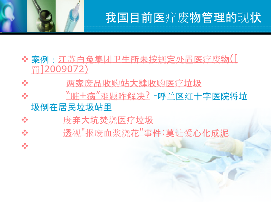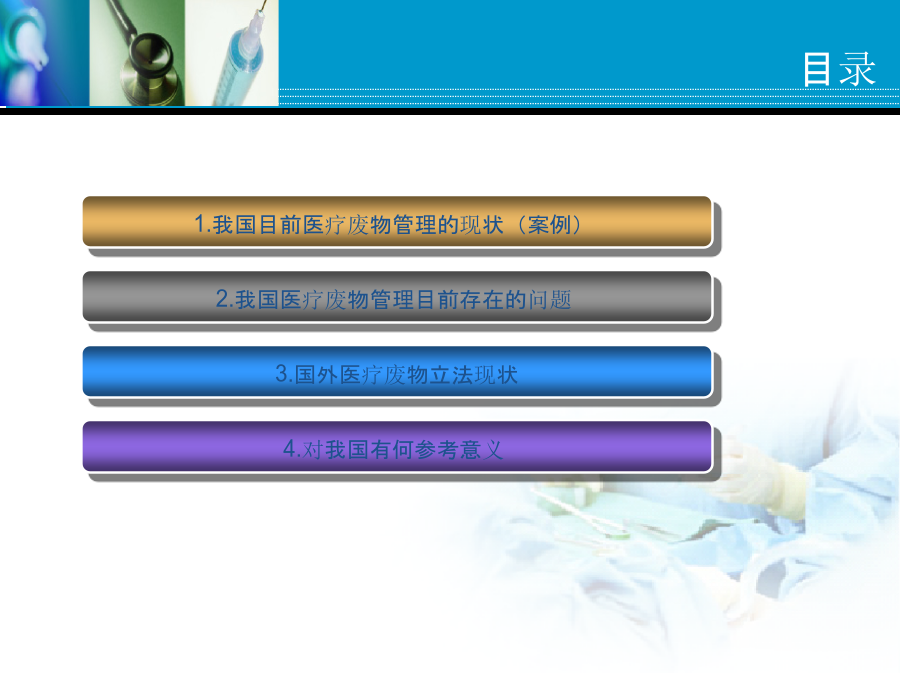 与医药废物有关的法律研究目录我国目前医疗废物管理的现状我国医疗废物管理目前存在的问题我国医疗废物管理目前存在的问题我国医疗废物管理目前存在的问题我国医疗废物管理目前存在的问题国外医疗废物立法现状国外医疗废物立法现状对我国的参考意义ThankYou!