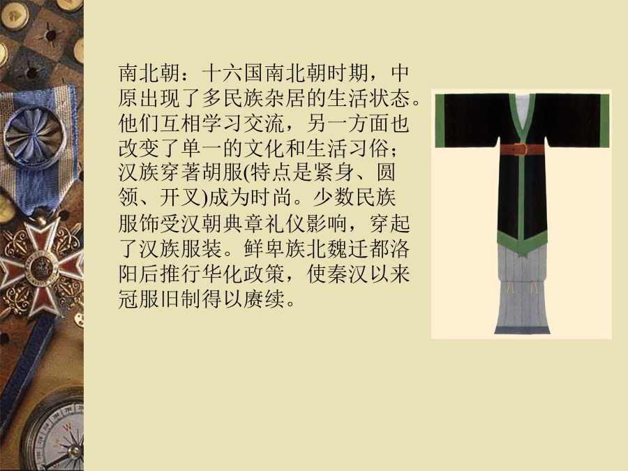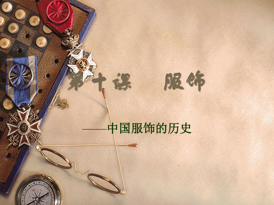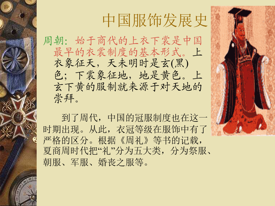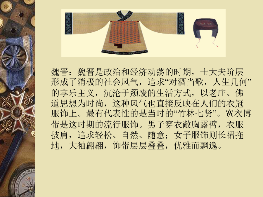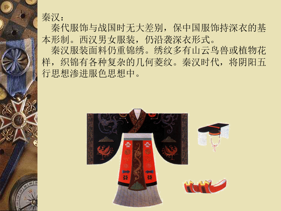 第十课服饰中国服饰发展史秦汉: 秦代服饰与战国时无大差别,保中国服饰持深衣的基本形制。西汉男女服装,仍沿袭深衣形式。 秦汉服装面料仍重锦绣。绣纹多有山云鸟兽或植物花样,织锦有各种复杂的几何菱纹。秦汉时代,将阴阳五行思想渗进服色思想中。魏晋:魏晋是政治和经济动荡的时期,士大夫阶层形成了消极的社会风气,追求“对酒当歌,人生几何”的享乐主义,沉沦于颓废的生活方式,以老庄、佛道思想为时尚,这种风气也直接反映在人们的衣冠服饰上。最有代表性的是当时的“竹林七贤”。宽衣博带是这时期的流行服饰。男子穿衣敞胸露臂,衣服披肩,追求轻松、自然、随意;女子服饰则长裙拖地,大袖翩翩,饰带层层叠叠,优雅而飘逸。南北朝:十六国南北朝时期,中原出现了多民族杂居的生活状态。他们互相学习交流,另一方面也改变了单一的文化和生活习俗;汉族穿著胡服(特点是紧身、圆领、开叉)成为时尚。少数民族服饰受汉朝典章礼仪影响,穿起了汉族服装。鲜卑族北魏迁都洛阳后推行华化政策,使秦汉以来冠服旧制得以赓续。隋唐五代:隋唐时期,唐代纹样不仅继承了传统,而且吸收了西方艺术形式。加上对外开放、丝绸之路重开,中西结合,使唐朝服饰华丽清新。隋代女子穿窄合身的圆领或交领短衣,高腰拖地的长裙,腰上还系着两条飘带。唐朝年轻女子并不受保守传统的约束,她们可以穿袒露胸臂的宽领服装,甚至穿上胡服男装,在街上策马扬鞭,政府和社会还允许女性享有选择配偶和离婚的自由。唐代的女装主要是衫、裙、帔,还有短袖半臂衫(套穿在长衫外面)。最时兴的女子衣着是襦裙,即短上衣加长裙,裙腰以绸带高系,几乎及腋下。宋朝:宋代的女装是上身穿窄袖短衣,下身穿长裙,通常在上衣外面再穿一件对襟的长袖小褙子,很像现在的背心,褙子的领口和前襟,都绣上漂亮的花边。受封建礼教的影响,宋出现了缠足陋习,称“裹小脚”。 宋朝的男装大体上沿袭唐代样式,一般百姓多穿交领或圆领的长袍,做事的时候就把衣服往上塞在腰带上,衣服是黑白两种颜色。元朝:蒙古人多把额上的头发弄成一小绺,像个桃子,其它的就编成两条辫子,再绕成两个大环垂在耳朵后面,头上戴笠子帽。元代人的主要衣服是较短的长袍,比较紧、比较窄,在腰部有很多衣褶,这种衣服很方便上马下马。元代的贵族妇女,常戴着一顶高高长长,看起来很奇怪的帽子。她们穿的袍子,宽大而且长,走起路来很不方便,常常要两个婢女在后面帮她们拉着袍角,一般的平民妇女,多是穿黑色的袍子。明朝:朱元璋称帝后,为了恢复汉族的礼仪,便制定了以周汉、唐宋为准则的新服饰制度。以袍衫为主要服饰,而官员则以补服为常服,头戴乌纱帽,身穿圆领衫。所谓补服,是指在袍衫前有一块方形刺绣图案的官服,文官图为飞禽,武官图为猛兽。用袍衫颜色和图案的分别来区分官阶品位。平常穿的圆领袍衫则凭衣服长短和袖子大小区分身份,长大者为尊。