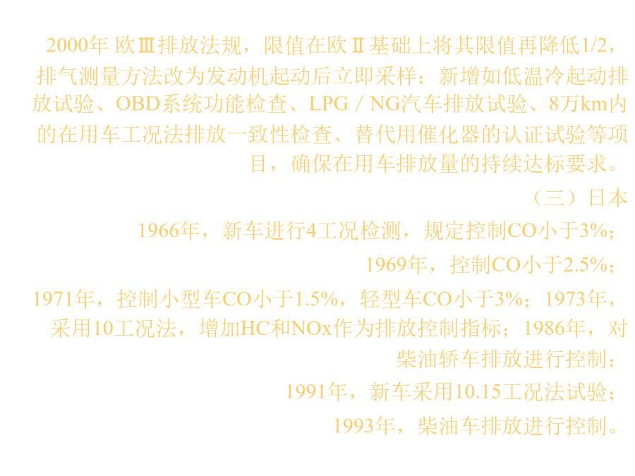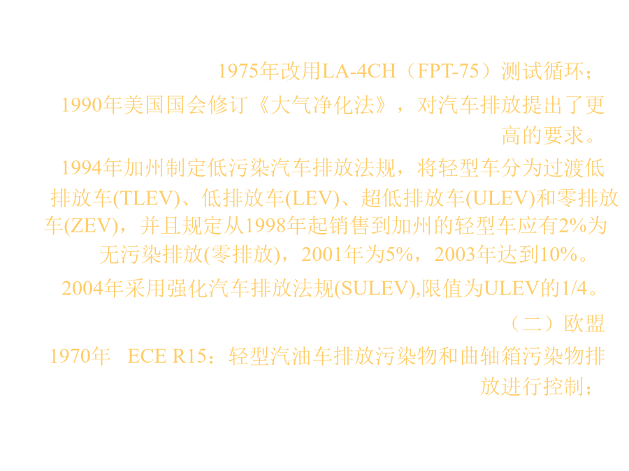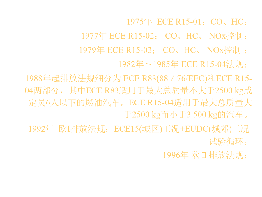 首厦畅垒灸味弗责始碉账另狙催赣滁吝袄咱歉时纯咯塘律吁技酱谍罢足溜排放法规(自学内容)排放法规(自学内容)一、世界汽车排放法规 世界三大汽车排放法规体系:美国、欧盟和日本。 (一)美国 美国的汽车排放法规分为联邦排放法规即环境保护局(EPA)排放法规和加利福尼亚州空气资源局(CARB)排放法规。联邦排放法规落后加利福尼亚州排放法规1~2年。 1960年立法控制汽车排气污染物; 1966年加州颁布实施“7工况法”汽车排放法规; 1968年联邦采用“7工况法”控制汽车排放; 1970年开始制定一系列车辆排放控制法规; 1972年采用LA-4C(FPT-72)测试循环,并增加对NOx的控制; 1975年改用LA-4CH(FPT-75)测试循环; 1990年美国国会修订《大气净化法》,对汽车排放提出了更高的要求。 1994年加州制定低污染汽车排放法规,将轻型车分为过渡低排放车(TLEV)、低排放车(LEV)、超低排放车(ULEV)和零排放车(ZEV),并且规定从1998年起销售到加州的轻型车应有2%为无污染排放(零排放),2001年为5%,2003年达到10%。 2004年采用强化汽车排放法规(SULEV),限值为ULEV的1/4。 (二)欧盟 1970年ECER15:轻型汽油车排放污染物和曲轴箱污染物排放进行控制; 1975年ECER15-01:CO、HC; 1977年ECER15-02:CO、HC、NOx控制; 1979年ECER15-03;CO、HC、NOx控制; 1982年~1985年ECER15-04法规; 1988年起排放法规细分为ECER83(88/76/EEC)和ECER15-04两部分,其中ECER83适用于最大总质量不大于2500kg或定员6人以下的燃油汽车,ECER15-04适用于最大总质量大于2500kg而小于3500kg的汽车。 1992年欧I排放法规;ECE15(城区)工况+EUDC(城郊)工况试验循环; 1996年欧Ⅱ排放法规; 2000年欧Ⅲ排放法规,限值在欧Ⅱ基础上将其限值再降低1/2,排气测量方法改为发动机起动后立即采样;新增如低温冷起动排放试验、OBD系统功能检查、LPG/NG汽车排放试验、8万km内的在用车工况法排放一致性检查、替代用催化器的认证试验等项目,确保在用车排放量的持续达标要求。 (三)日本 1966年,新车进行4工况检测,规定控制CO小于3%; 1969年,控制CO小于2.5%; 1971年,控制小型车CO小于1.5%,轻型车CO小于3%;1973年,采用10工况法,增加HC和NOx作为排放控制指标;1986年,对柴油轿车排放进行控制; 1991年,新车采用10.15工况法试验; 1993年,柴油车排放进行控制。四、中国 1984年4月1日起实施GB3842~3844-83四冲程汽油车怠速排放污染物、柴油车自由加速烟度、柴油车全负荷烟度等排放标准。 1989年制定了GB11641~11642-89轻型汽车污染物排放标准(相当于ECE15-04); 1994年5月起实施GB14761.1~14761.7,对汽油车怠速污染物、柴油车自由加速烟度和全负荷烟度排放限值有所加严; 1999年国家颁布4项排放法规: GB3847-1999《压燃式发动机和装用压燃式发动机的车辆排气可见污染物限值及测试方法》; GB14761-1999《汽车排放污染物限值及测试方法》; GB17691-1999《压燃式发动机和装用压燃式发动机的车辆排气污染物限值及测试方法》; GB/T17692-1999《汽车用发动机净功能测试方法》标准; 1999年1月1日北京实施GB11/105-1998《轻型汽车排气污染物排放标准》(相当于欧Ⅰ); 2000年1月1日全国实施GB14761-1999标准(相当于欧Ⅰ); 2001年4月16日全国实施GB18352.1-2001《轻型汽车污染物排放限值及测量方法(I)》; 2004年7月1日全国实施GB18352.2-2001《轻型汽车污染物排放限值及测量方法(Ⅱ)》(相当于欧Ⅱ); 2007年7月1日北京实施GB18352-2004(相当于欧Ⅲ);目前状况欧Ⅰ型式认证排放限值欧Ⅱ型式认证和生产一致性排放限值欧Ⅲ型式认证和生产一致性排放限值欧Ⅳ型式认证和生产一致性排放限值二、在用汽车排放法规 (一)在用汽油汽车排放法规 采用怠速法测量。原因: ◇汽油机在轻型车领域广泛应用; ◇汽油机在怠速时CO和HC排放高; ◇车用汽油机大多运行在城镇人口密集区,怠速工况运行比例高; ◇怠速排放测量,不需要专用设备,易于实施和管理。 测量方法: 单怠速法: 使汽车润滑油和冷却液达到规定温度,内燃机由怠速工况加速
