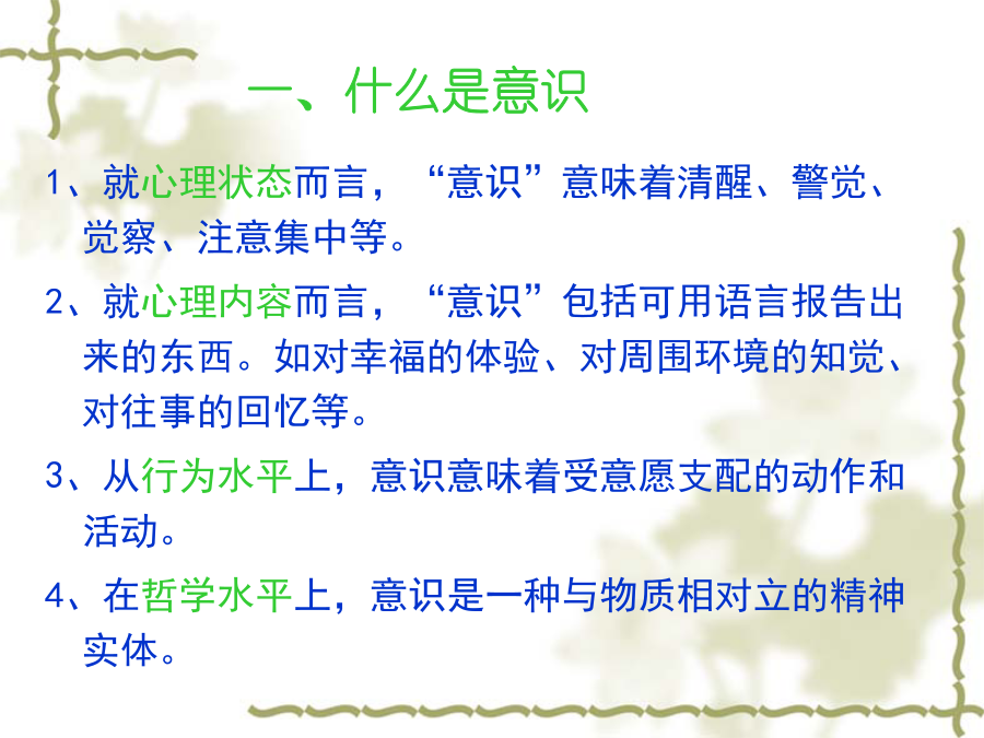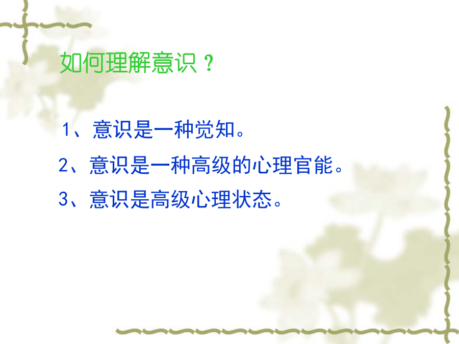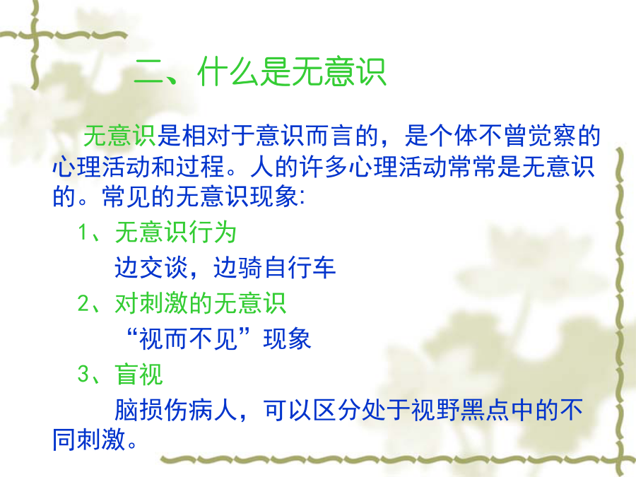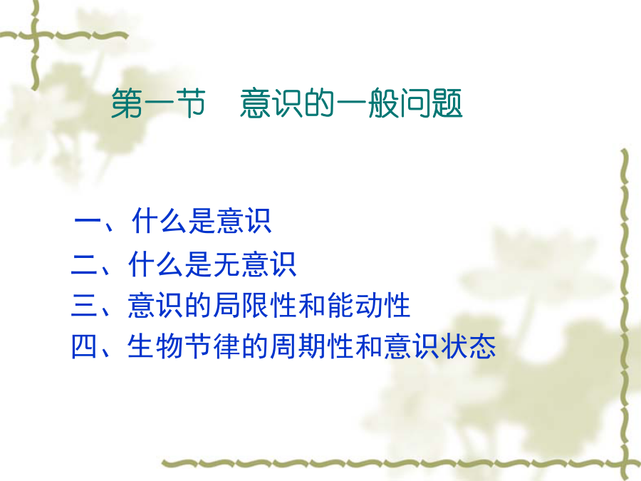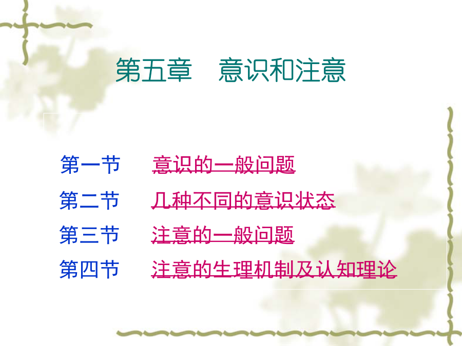 第五章意识和注意第一节意识的一般问题一、什么是意识如何理解意识? 1、意识是一种觉知。 2、意识是一种高级的心理官能。 3、意识是高级心理状态。二、什么是无意识三、意识的局限性和能动性 能动性 人们有时候可以看到、听到、触摸到和意识到事实上不存在的东西。人们可以有限度地超越外部的信息内容,构建自己的意识内容。 如:不舒服时,可能会产生“幻听”、“幻视”等现 象;盲点现象。 提醒: 不应该过分强调能动性,因为人的意识绝大多数 还是受到外部世界的限制。四、生物节律的周期性与意识状态为什么夜间比白天疲劳? 位于海马的视交叉上核对人体的生理功能和心理状态的周期起关键作用。视交叉上核的活动影响松果腺分泌褪黑激素,褪黑激素有镇静剂的作用,可以减少机体的活动,增加疲劳感。白天光线激活视交叉,抑制松果腺分泌褪黑激素,所以不会感到那么疲劳。 人的意识状态与人体的生理功能和心理状态密切相关。第二节几种不同的意识状态一、睡眠与梦睡眠的周期睡眠的四个阶段和快速动眼睡眠第四阶段:大多数的脑电波开始呈现为⊿波。 这个阶段被称为深度睡眠。 身体状态:身体各项指标都变慢,梦呓、梦游、尿床等大多数发生在这个阶段。身体的各项功能性指标变慢。 第三、四阶段通常被叫做慢波睡眠(SWS),几乎所有人的睡眠都会经历这四个阶段,否则的话,就预示着身体或心理功能的失调。 快速动眼睡眠: 上述四个阶段大约持续1小时到90分钟,之后进入此阶段,⊿波消失,出现高频、低幅的脑电波,与个体清醒状态的脑电活动很相似,睡眠者的眼球开始快速上下左右移动,且常伴随着梦境。 身体状态:如清醒状态或恐惧时的反应,肌肉松软,呼吸急促,血压不规则。睡眠各阶段的脑电图成年人的睡眠模式睡眠形态的个别差异睡眠的功能睡眠障碍:失眠和失眠症除失眠以外,睡眠障碍还包括: 突发性睡眠症 睡眠窒息 白天嗜睡梦2、心理学的观点 梦是个体对脑的随机神经活动的主观体验。通常情况下,一定数量的刺激对维持脑与神经系统的正常功能是必要的。睡眠情况下,刺激减少,神经系统产生一些随机活动,梦就是认知系统对这些随机活动进行解释并赋予一定意义的过程。3、认知的观点 梦担任着一定的认知功能。睡眠中认知系统依然对储存的知识进行检索、排序、整合、巩固等,这些活动一部分会进入意识,成为梦境。梦的功能就是将个体的知觉和行为经验重新编码和整合,使之成为可用的知识。 梦的实质梦形成的原因二、催眠催眠时一般让被催眠者处于安静舒适的状态,将外界干扰减少到最小,然后催眠师引导被催眠者将注意集中在某个特定的事情上,同时,催眠师用平和的语言引导和暗示被催眠者的感受和体验,使他顺从和接受催眠者的指示,并相信催眠师的描述。(1)常做白日梦 (2)想象力丰富 (3)容易沉浸于眼前或想象的场景中 (4)依赖性强,经常寻求他人的指点 (5)对催眠的作用深信不疑 (6)有经验分离的经历,体验过记忆和自我的各部分的分离。1、角色扮演的观点 催眠反映了催眠师和被催眠者之间的一种特殊的 关系。被催眠者扮演着一个特殊的社会角色——被催眠的人,他要无条件的接受催眠师的指挥。 2、意识功能分离的观点 人的意识有两种基本功能:执行和监督,一般情况下,这两种功能连在一起,但催眠时,可以使这两种基本的功能分离,执行功能正常,但监督功能不起作用。 3、催眠弱化了意识对行为的监控 心理治疗方面:改变错误的认知方式和内容 医学方面:控制疼痛、安慰剂效应 犯罪侦破方面:测慌仪的应用等 运动员训练方面:自我诱导、心像训练 三、白日梦和幻想(二)白日梦和幻想的原因(三)白日梦的功能第三节注意的一般概述一、注意的基本概念(二)注意和意识的关系 一方面,注意不等同于意识。注意是心理活动或“心理动作”,而意识是心理内容或体验。 另一方面,注意和意识密不可分。处于注意状态时,意识水平较高,意识内容比较清晰。注意指向的内容一般处于意识活动的中心。 (三)注意的外部表现 注意是一种内部的心理状态,但能通过人的外部行为表现出来。 1.适应性运动 2.无关运动的停止 3.呼吸变得轻微而缓慢提醒: 注意作为一种内部心理状态,它和行为并不总是一致的。如小学生上课时,有时可能眼睛盯住老师,看似认真听课的样子,实际上他的注意可能已经指向无关的事物了。所以,只用注意的外部行为表现来说明一个人的注意状态,可能会得出错误的结论。 小问题:“小和尚念经有口无心”是怎么回事?(四)注意的基本功能 1、选择 2、保持 3、调节与监督 (五)意义启动效应与负启动效应研究负启动现象的程序二、不随意注意、随意注意和随意后注意(演示)演示9 答案:数字分别是9,7,5,3 总和:24呈现的图形都有哪些形状? 每种图形的颜色分别是什么? 图形的顺序是怎样的?9功能 1、积极作用:帮助人们对新异刺激进行定向,获得对事物的清晰认识