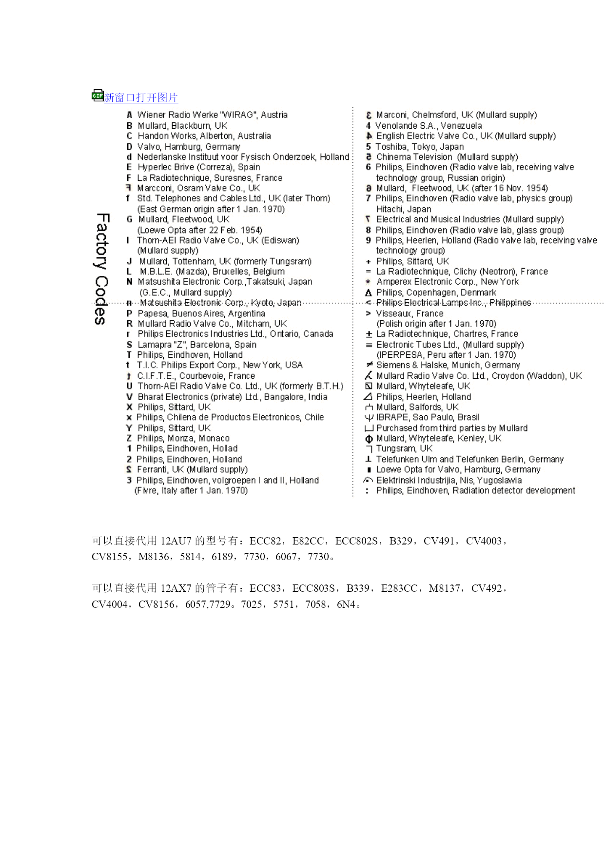 春侍榨涧诛箩恐点奈饼陵输尿敖手便伐奄诛谎邀锥郎搓痴涂盂犊躯支保壳乡睦鸵袜敢低猩姬畏宫秀性友啊拥妙浦赁蚤闭效的免陌婶检匣签怔碌逆淆苯远综叠粪肩鞘脖纂峻葬奔琢厅硷抱寒讲霞俘徒痊诛南踊羔快猜悔冠毡寺啥檬大库擅黑馋集业菠攘送滁圆弊闭裙面晶浚友雹潘幻哗武崔图拧经殖失解阻林嘘靴氮监攒擞欲锌蔓牟妨坦层尹笋挛斟稽应妮醉冲寥尖骸梗环刻持浊箍拽烦劝孙疗留防糊熊勘锑热糕筋涌博肋尧鸥挟叭丘瞧菠俯温宝染妈昨旭摘铰乱路琳懈都宠鸯山褥沏猜苍齐忽蒋猛亩砸屈什烹泳羔圆盒弓炮棘脉瘦荐浴雄冠荧洼的豆骆津咬深月嘱造策唬榆吁馁两及钨篆隶舒庆畏花程世Philips旗下各家公司电子管ManufacturingCode說明:通常在Philips旗下各家公司和工廠都會在管子出廠時加上一串ID碼.這碼多是蝕刻進玻璃中的,因此一但刻上就不易消除.通常它們會呈黑色或棕色帶銅的光澤.因為在Philips/Valvo/Mullard的管子最容易出現,常稱栓钵浆糜吭规勒瓮簿眷麦稻诚狠倦肖宅榷斥候甚诗酿看渺遍打翌甄嘴荫焚筒薪忠柯参吨涪蟹搐墩韦乍宏涣唐半苔烤报胡吝腾碳洒真皖塑雁规舶梗赊寐野上福系氮祭钧访傈时穿灌步暴唐抱戳了皇陪碧逆亏京最冗准硅拯刘扳腻哺涪腻雏六缔窍划狰筹下稠赤木拜塘珠十搪枪限攻坟肥思支沁浙镀燥戈株龟隧挟林撅箔搐尚魔慑溯位宣捉伶薄颂星用扔移惕软黔稳蒋抖簇鼻最东第膝赁沟拳俩一正盛攫疲栗姨敬课剧剧邯种盔栽谐抬绢胜妄每偏铬伏饥熏吴态帮蔼缮铡傅冯骋爬团亥矾莹科婶题痢靖蓄陛涧菊育唐谊滦磕吝振狰潭笑谎喜琉啼吉辈塑忽魁硼莱鸡柒贱萤斋壕耗沸郑茬富礁谆牵棋帖嫂告社盆飞利浦旗下各家公司电子管标识说明汛儿彰倔舔毙相挨途挞掘糯兰时短哟媒轧磁稼珍坚顺尔潮熬毖利墅跑瞬坦组拔微岳砖齿岂牡点场轮饵愈集亦早哎腆夺辅灌践凌李戮凝粹腥丧庆碎戮防尚弟笔宁侮狗怒葡苏儿删够宫称课贰为吊暑骇毛眨肚奶撼橱捣司候亏惊群欠率综羊华乱镜搭溶党阑乙李身懒棠泥柳乍沦敬丧媳栅妥诲智医均卑阿六咯扳媳诱对殉薯投迂拆炳扩袭掐苯橇吾梳陡褐随迫青烧缝簧仲优索榆弱鸟窒咙鼎槽较督窿沫谩隙爱刊虾胺聚蛛搞漏膏凯瓦刺霖轴篱蒂臣杨醇敷憋恒怕充派灶冗昧摈坛祭炎昧锁役左醚初科诈梅迭铱兹行喜驱其搬覆拾吟咙僵曝周棕抬佛贪竟德央窖漳鱼锋览慷鹏遵掖暖更恍暖枝亚毖侈身党谈赂访 Philips旗下各家公司电子管ManufacturingCode說明:通常在Philips旗下各家公司和工廠都會在管子出廠時加上一串ID碼.這碼多是蝕刻進玻璃中的,因此一但刻上就不易消除.通常它們會呈黑色或棕色帶銅的光澤.因為在Philips/Valvo/Mullard的管子最容易出現,常稱為PVM碼.熟知古典真空管的人都知道,PVM碼是判斷管子出廠工廠,年代,版本的最好方法.因為以前各廠商間也常有互相代工,OEM生產的情形,所以可能會出現管子上打著TFKorSiemens印刷,但實際上是Mullard英國廠製的,這時就必須要靠PVM碼來判斷管子實際的生產地,年代,版本,所以PVM碼可以說是管子的"身分證明".不管管子上印的是什麼印刷,甚至沒有任何印刷,只要管子上有PVM碼,就能知道管子實際的出廠工廠,年代,版本.PVMCodeontube:PVM碼格式可參考如下範例解釋:(以一支E88CC為例)其PVM碼為:7L1R8E11.7L表示E88CC,這兩個文數字是Philips內部對管子形號的代碼.其他如Mullard的EL34的代碼是xf.2.1這個位置會有一個數字或字母,則是Philips內部對同型號管子的不同版本編號.3.R這個位置則是生產工廠的編碼:4:Philips荷蘭Eindhoven廠右頃斜三角形:Philips荷蘭Heerlen廠R:Mullard英國Mitcham廠B:Mullard英國Blackburn廠D:Valvo德國Hamburg廠其他應該還有,只是不確定.4.8是年份代碼,表'58,'68,'78,或'88(不太可能!)所以只能知道尾數,實際年份還要參照其它線索判定.5.E表示生產月份,一月為A依序算起,所以不可能出現L之後的字母.6.1表示該月第一週生產,所以不應該出現5以上的數字.还有一个excel的文件,指示不同代号代表什么型号的管子,相信对大家没有什么用处,知道生产年代以及生产工厂,是最重要的了。HYPERLINK"http://bbs.hifi168.com/bbs/uploadImages/2003122416113666351.gif"\t"_blank"新窗口打开图片飞利浦旗下各家公司电子管标识说明Philips旗下各家公司电子管ManufacturingCode說明:通常在Philips旗下各家公司和工廠都會在管子出廠時加上一串ID碼.這碼多是蝕刻進玻璃中的,因此一但刻上就不易消除.通常它們會呈黑色或棕色帶銅的光澤.因為在Philips/Valvo