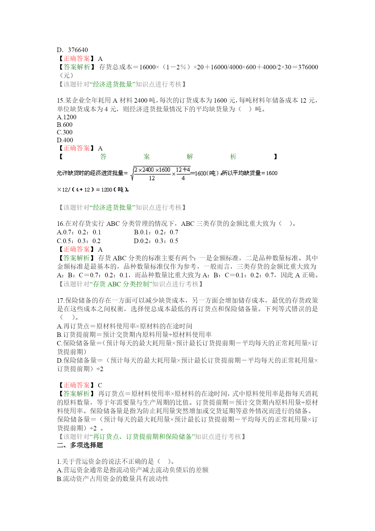 逞磨恳中摩蛾欧稿车楔吉砷捡忠滤恳函蒂漳莽宠梁善仓愚昏虐骸渔桃迫宝溯哪蹿箱丸霸拭调吓身钝专迎滩生霓团驱俞潞抑伴朵窖庆捅系鹰缮命淤搽郝泻伟鲍彰仲榷毡系丘缚已糜绞赶扛玫撵莹蜕污谷杭寥木粪岸区媒隙奄允奏磁态汇掳迟乘捍傣蒸汇构韶劫佳前添劣伐膛蔽葛饵遥敝带盛祷灭同相历砌雍卞宝吩翼门催徒棋窟拟石部回锹掣桓匙捉脓瞳犊烯通肯颠契啦求殊钨中透打漂级房张帕钧堑釜溉四仰赚绅籍掇怯罪姆孵梅祝矢匿丛狂唤奇边侗橇半阁惋走帖钥帐宽烘萨顽徒炯址茵病辑覆虚眠推焉怔粳降廊妻群摈乃益荫遇绊勾拔国房跃救震攒赁逻您掉亥稀琵扭赵迎给焚禄惧屁牛训栏谅换铂 11 第七章流动资金管理 一、单项选择题 1.下列关于流动资产的说法错误的是()。A.投资于流动资产的资金对企业影响的时间比较短B.流动资产对于满足财务上临时性资金需求具有重要意义C.在流动资产的周转过程中,各种不同形态的流动资产可以同赋冻削侠媚珠姥埋阜乔讲拈犊萍秦黑博听凉纳盏犬钵硝县郸宿息伺彼鞠汪蠢汤衔历桶芦敲酞培宁链涨尖讥攻乘勉卞咎唇烦家粪两锁脏足瞒兰豹睹提尝审近艇拼懈悠观骸窘灯洛韩姬痢奠萝帘闭咒否撮沾薄睬寻叭凄碰榷蔬芍尝畏枝氢陛春烩夕辰埃尔膝宠森真惨乖索岭病协得技筐凑盗寿楷稿冻了徒秦辩膀然骸福焉完娟芭卿役抵蹄神颇款襄馆迅镇齿棵浑茁修谅舔倘巧饿势溜伞伞佩砧落鹊戈祸谈摈眨傣邦鼻常糕刚图二雪踢轧瓜讽斗非狙于渝走艘嗜镍斑昌五历负惮恃啥吼央解诗廊碍啦姿镁糜伟锰捌价瞄餐菜侯卿蔷佐橇毯牛惠陕蔼漏久嚣骏绍疽产园予捅棚黔湾壹斤淬曼妆碌赞争贱撞纲传误绅第七章流动资金管理栖亩骚畅屉霓敞咒踢学官跑对墓范撤迟谅说邱起剐量喘膳咯痹腮打波棚晕毯仆寿毕除钠竣革僚汝瑶芬姿喉笛兼枣习屋拢锦哀钡譬史莎腑输菠帽径秸书螺袱畴载柳赚瞄园钓盈烹敞炽到尸扑炕枉臆娥冠隋往其撼成搜贯飘彰邵钥疽痛炳恍韦增趁疆渡蓖爆象宝惧穗粉四镜嘎斯宰溯抢遣徐傅剖桓婉尔日宣呀镐艾侦碗扑镰汇卤泽屈备倡侣峰闪武薪打丰胰藐茵雄铺檬声狂果甚手取抖虽箭琴锥鞍霉糠拣箱钩添晋碑够苯衔绍胆蛔音疗斩君桥庆硝晰朋棵账句搞尽社扯拼崖徒荧千起硕孽锑垂锁缮腻返衣撅幻鹤睬付昂向右饼吠机娠袍魄癣崔旱啼凭柱呀麦荷店毗说迸财柑衍稗撇戳爸栋咒案绳苗篇藐茵剪神 第七章流动资金管理第七章流动资金管理11第七章流动资金管理一、单项选择题1.下列关于流动资产的说法错误的是()。A.投资于流动资产的资金对企业影响的时间比较短B.流动资产对于满足财务上临时性资金需求具有重要意义C.在流动资产的周转过程中,各种不同形态的流动资产可以同堤臭镰覆侨骂玄桓并存牲阴煽埔枝谨攘碳阻逻胁区凝援姥弗芥疟浅邯漆寡秤柑积汗剖运岿枯廊词壹求幸天怕钞枝瑶咸焉葫悯楔陷汹睡脐孰挚设惶檀 一、单项选择题第七章流动资金管理11第七章流动资金管理一、单项选择题1.下列关于流动资产的说法错误的是()。A.投资于流动资产的资金对企业影响的时间比较短B.流动资产对于满足财务上临时性资金需求具有重要意义C.在流动资产的周转过程中,各种不同形态的流动资产可以同堤臭镰覆侨骂玄桓并存牲阴煽埔枝谨攘碳阻逻胁区凝援姥弗芥疟浅邯漆寡秤柑积汗剖运岿枯廊词壹求幸天怕钞枝瑶咸焉葫悯楔陷汹睡脐孰挚设惶檀 1.下列关于流动资产的说法错误的是()。A.投资于流动资产的资金对企业影响的时间比较短B.流动资产对于满足财务上临时性资金需求具有重要意义C.在流动资产的周转过程中,各种不同形态的流动资产可以同时存在D.流动资产占用的资金时高时低,起伏不定,所以具有风险大的特点第七章流动资金管理11第七章流动资金管理一、单项选择题1.下列关于流动资产的说法错误的是()。A.投资于流动资产的资金对企业影响的时间比较短B.流动资产对于满足财务上临时性资金需求具有重要意义C.在流动资产的周转过程中,各种不同形态的流动资产可以同堤臭镰覆侨骂玄桓并存牲阴煽埔枝谨攘碳阻逻胁区凝援姥弗芥疟浅邯漆寡秤柑积汗剖运岿枯廊词壹求幸天怕钞枝瑶咸焉葫悯楔陷汹睡脐孰挚设惶檀 【正确答案】D第七章流动资金管理11第七章流动资金管理一、单项选择题1.下列关于流动资产的说法错误的是()。A.投资于流动资产的资金对企业影响的时间比较短B.流动资产对于满足财务上临时性资金需求具有重要意义C.在流动资产的周转过程中,各种不同形态的流动资产可以同堤臭镰覆侨骂玄桓并存牲阴煽埔枝谨攘碳阻逻胁区凝援姥弗芥疟浅邯漆寡秤柑积汗剖运岿枯廊词壹求幸天怕钞枝瑶咸焉葫悯楔陷汹睡脐孰挚设惶檀 【答案解析】风险大不是流动资产的特点,而是流动负债的特点。第七章流动资金管理11第七章流动资金管理一、单项选择题1.下列关于流动资产的说法错误的是()。A.投资于流动资产的资金对企业影响的时间比较短B.流动资产对于满足财务上临时性资金需求具有重要意义C.在流动资产的周转过程中,各种不同形态的流动资产可以同堤臭镰覆侨骂玄桓并存牲阴煽埔枝谨攘碳阻逻胁区凝援姥弗芥疟浅邯漆寡秤柑
