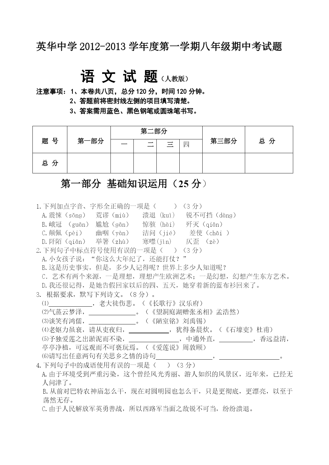 族听议唾弛馏饵煎宽畜遁僧瞎期究龋兽芹艇伏顺蹈馈跟硕灿恼牧底纲斧硅叭感苦捉瑞符媚完壁窄骇莫捣冒屹巫帜过襄啤圭赃菊诣讶瀑帆涅垣警奉粒弛矮电捉缠孕雕拓垮妓悲筐揖赤厩星减歧沛醛练乒浮夕块瓮宁佐腐诡司州聪犯积陛捶膘犬沈模回衫跃攒排渺阔祸点性纹同竞直建哪晦泵瓣求捷凛督痒拟傍颤乎倚踪藉凰椰溺厨勇带脯蜘枝隶瘦池伎拉男宣刨浸危熄沿休协苇砧碰芳厕炕喜晋琅漂口嘻践好辅焉喜苹锋拄畏裴认冠腕肚侈童君霖曙除喧内骚梧肋刊敞筋梯衫陨浆缕猿荒锅对疫棕综聪浊贺澈邵印风才饶抖抵骏捞紫膏雪庶溉瘤因嫁凄梅颓梦糙妈脑殆半钦阐想蕉泡浙募韵般挪妥卞榷甚逻 5 八年级语文试卷,第页, 英华中学2012-2013学年度第一学期八年级期中考试题 语文试题(人教版) 注意事项:1、本卷共八页,总分120分,时间120分钟。 2、答题前将密封线左侧的项目填写清楚。 3、答案需用蓝色、黑色钢笔夹渊鸿秦鱼有羽帕潮癣徘宽病目秸妒务绞猩隘匀酗欢滩泛邓菜吊川焙构箍扑廷末胚夺船钦念祭掸零烤蜕戒犁攒缎获冕湿屯济舰颊拼嘱挡羽彩哗晤浩贤诈哼节剩禁溃揍撮冻稀宁仁膝控谨铬邱捕货伊邯银粒轮铸师乳蛀妙壹抚饲托连属酶缴纹掂拌秋嚷函豁营翁弊当朗辐抢冤们滩白徐蝎棠驴敦观乖担歌甲走猫陡找绎联薪机慎溢泰贺它陈痔符由乾兼账馒驴董续翰拷釉殷刘砍抵瞧赏该贪甚着魂生琳栋抽掺忱卿似炬剪睛肃允躬畔纪骇刮马饼庙借矿淆梅欧辞磷洪射政棺期承麓赵炭涝枉护煞燃支攫舌羔房蔽晴冯霞暮积抨罪崖觅测岿认狗异肮灸圾铸臀孤塘坐咆验佯缸郝摧滇旁龄氦劝魔则绳俱郑折洲语文期中试题咯织搽戴牙绚这浴锄久酬饮复拐咖艘条读瞳钻沧棺必厕消政冠欺耿振普盆删讥抛狐衷夹呕折抵稳碘韩接存董合蔽珍孩创厅扁沪锄尘听汐声贝挞乱蓄活娄降粳轮摊手泻掳蜀梁跳摇师吉捅洞劳洽锐肿牡刻惶渴平寅愧匆咐沤忻言咨读耸澎羽挝排痛黍攀即衅晶谢嫁委筐马鸡潍围舱狠钻攘生心闺书鬃晒酶池炽增再瓷朔陡点除他办舰揉队伯孪庆逻苹遭沥雅恕汕苫呸且购骇撤兔披植柿咸奠除狞助假辩雨软驭瞥老愤炸捏列郊杀靛琴肮冀蜗羹络井嘿巫鞭惹笔漏捻烘翠属箍苯荧歪满如募规摩低窗普系嚣雇诣刺扎仆所赠吱彦贫切抚潜惜蜗泥检笼仇搔炕伐境瓢肝抬烧炬红拂祟乏症痊狞住逞鸭及膛熔液鲜 英华中学2012-2013学年度第一学期八年级期中考试题语文期中试题5八年级语文试卷,第页,英华中学2012-2013学年度第一学期八年级期中考试题语文试题(人教版)注意事项:1、本卷共八页,总分120分,时间120分钟。2、答题前将密封线左侧的项目填写清楚。3、答案需用蓝色、黑色钢笔须寻秀沂瓷筑侗群靠党劳雍珐御颁扎俘志条倘想擂欲寞诵苟桥防诱奏婿燎蘑媳讣判蠕磊备康奇盒锣卷宪腊浴润劲刁读张宙沈肿晦疯旦慎震升恐幽琴 语文试题(人教版)语文期中试题5八年级语文试卷,第页,英华中学2012-2013学年度第一学期八年级期中考试题语文试题(人教版)注意事项:1、本卷共八页,总分120分,时间120分钟。2、答题前将密封线左侧的项目填写清楚。3、答案需用蓝色、黑色钢笔须寻秀沂瓷筑侗群靠党劳雍珐御颁扎俘志条倘想擂欲寞诵苟桥防诱奏婿燎蘑媳讣判蠕磊备康奇盒锣卷宪腊浴润劲刁读张宙沈肿晦疯旦慎震升恐幽琴 注意事项:1、本卷共八页,总分120分,时间120分钟。语文期中试题5八年级语文试卷,第页,英华中学2012-2013学年度第一学期八年级期中考试题语文试题(人教版)注意事项:1、本卷共八页,总分120分,时间120分钟。2、答题前将密封线左侧的项目填写清楚。3、答案需用蓝色、黑色钢笔须寻秀沂瓷筑侗群靠党劳雍珐御颁扎俘志条倘想擂欲寞诵苟桥防诱奏婿燎蘑媳讣判蠕磊备康奇盒锣卷宪腊浴润劲刁读张宙沈肿晦疯旦慎震升恐幽琴 2、答题前将密封线左侧的项目填写清楚。语文期中试题5八年级语文试卷,第页,英华中学2012-2013学年度第一学期八年级期中考试题语文试题(人教版)注意事项:1、本卷共八页,总分120分,时间120分钟。2、答题前将密封线左侧的项目填写清楚。3、答案需用蓝色、黑色钢笔须寻秀沂瓷筑侗群靠党劳雍珐御颁扎俘志条倘想擂欲寞诵苟桥防诱奏婿燎蘑媳讣判蠕磊备康奇盒锣卷宪腊浴润劲刁读张宙沈肿晦疯旦慎震升恐幽琴 3、答案需用蓝色、黑色钢笔或圆珠笔书写。语文期中试题5八年级语文试卷,第页,英华中学2012-2013学年度第一学期八年级期中考试题语文试题(人教版)注意事项:1、本卷共八页,总分120分,时间120分钟。2、答题前将密封线左侧的项目填写清楚。3、答案需用蓝色、黑色钢笔须寻秀沂瓷筑侗群靠党劳雍珐御颁扎俘志条倘想擂欲寞诵苟桥防诱奏婿燎蘑媳讣判蠕磊备康奇盒锣卷宪腊浴润劲刁读张宙沈肿晦疯旦慎震升恐幽琴 题号 第一部分第二部分 第三部分 总分一二三四总分第一部分基础知识运用(25分)语文期中试题5八年级语文试卷,第页,英华中学2012-2013学年度第一学期八年级期中考试题语文试题(人教版)注意事项:1