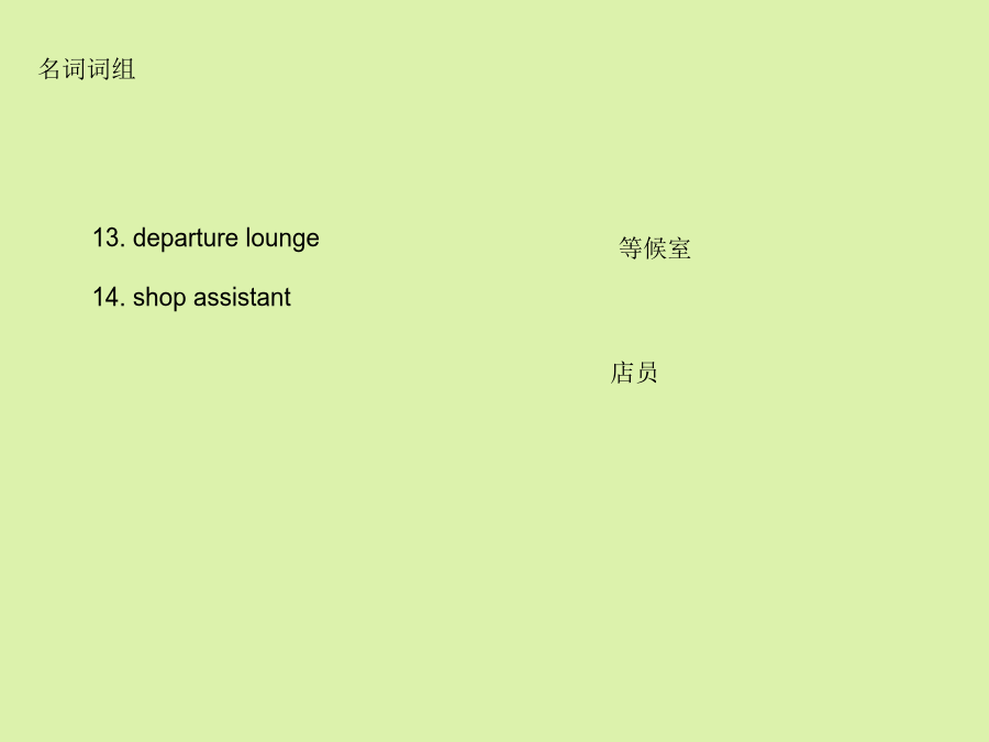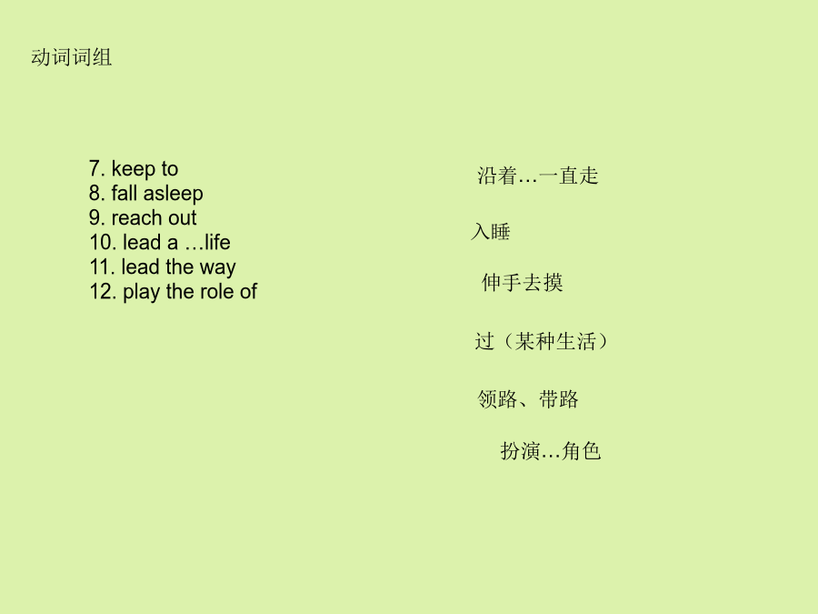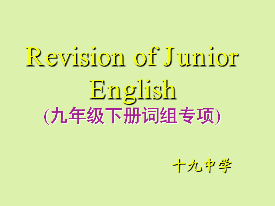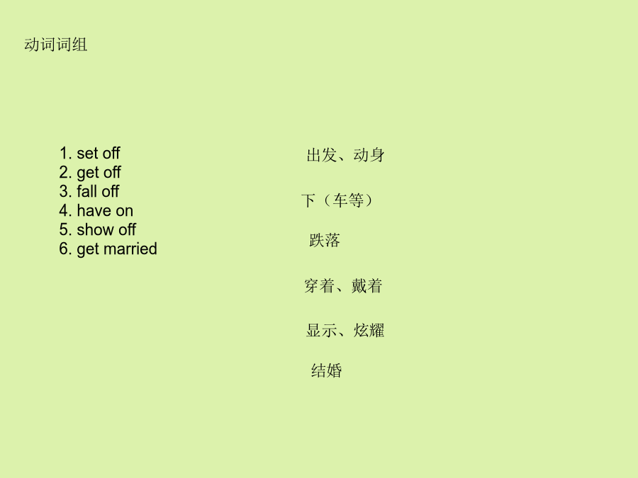 RevisionofJuniorEnglish(九年级下册词组专项)十九中学词组回顾 (Module1-8) 两个词的词组12个,多个词的词组5个动词词组动词词组名词词组其他类词组原文再现 以上17个词组分别出现在Module1-8的文章中原文再现现在,火车就在他眼前,马上就要动身出发了。Nowitwasinfrontofhim,tosetoffsoon.(M1U2)我父亲每天六点动身去上班。Myfather______toworkat6o’clock.getoff下(火车,公共汽车等)falloff从…跌落haveon穿着,戴着showoff显示,炫耀getmarried结婚keepto沿着…一直走fallasleep入睡departurelounge候车室,候机室reachout伸手去摸either…or或者…或者…shopassistant店员leada…life过某种生活playtheroleof扮演…角色inordertodo为了intheopenair在户外规律总结:小试牛刀……请大家看试卷