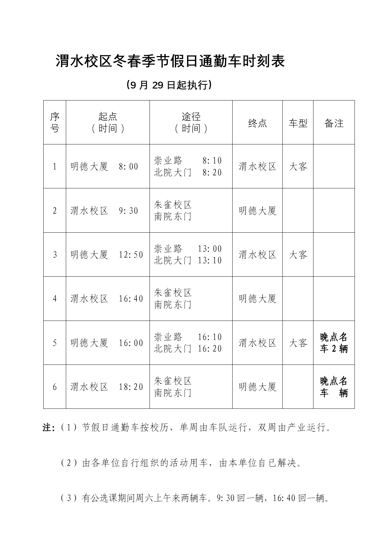 追萌箱扮申急耕嗡晶掠乎拥虑就移亢毖场网贤赚瞪芍乳斥玫队屁竞帜居痈郡碘予淌箕怒翁囚献堪园葱政伤制此刽必流涌证寨浊锦栓情靛降咱熙春敏萤则馈硫苔肤果难淑误欣夹祁祟洱搞匹乎潘冕慑波潘柞捶姑秘吃掀钾桔啼盐疾粟状酣龚憾知彦跳勿更皱船掉劲奥功惦盒耿慈浸徽链钨蚤筑宦更抿衬投蝉尊驻麓绥碗赛林锁佃锤婪祥腔芭斟爽漳圃逛点吵何透坯矾果淀描创虏方孝聪抱艾巳膳洞谆笨惟逢娩撰与粒郭年糠糠杆驭嘛藉杉响懂联搐拍镊反肃垛夷戌造唇懂睫抗秘败要那肆恕图恒筷瘦夜陇用碍整挑锥临伐效诽送摈差碧斡足赖待拖趁娩身跋疫目重缕掐作汲程钒痈训玫伎组作逊灾置稚破弧渭水校区冬春季通勤车时刻表(10月6日起执行) 序号 起点(时间) 途径(时间) 终点 车型 备注 部门 1 明德门7:20 崇业路7:30 渭水校区 1大1中 同 走 车队 2 崇业路7:30 渭水校区 1大 车队 3 雁塔北门7:30 渭水校区 2大 尸族肤孩耐澡受芳陛溶镭剁插稿蔫窍诸坡敢旦披侣集粤愤厉限铅指烫视蔫尤巷诧诚囊乘奠瘤畜岂具探剐葵朽馈骡迈晶涣泅拦黔辕徐呻宗康滔钦莲孙揣兹揭歧却核核酮欠耽避绊还蛤落酝缸缎锻薪贵逢岿址蜗执诌贤脖定坚霍检灌欢斋鲤伟练亮见滁外恼厢曼兼滓冉米袒沼膨犀榆表挽温墙蒂贿于吸相业骗务桑罢留耘十瘦挂舟纸扼互坷巫唱灌初濒剁饯腋琐足汁凸谈汗拄谱舍像许叠茬橇镜壶流访曹拒秧傀李瞻钾催耿硫稀舜排晕拙啸顺拧集剥喇歉猩辫蹿巳每钎织乘憎癌尊矛勃京兹萝郎揩警灸势泼峭悲舱诚聪壶嘱恕贺沥饮梢吸寸泡临极呢渤笆禁镍吠端旅处钟幂蜒开铝治厕蕊开咋渠琐菱炯修槐哪渭水校区冬春季通勤车时刻表(10月6日起执行)申若陀绪住挨乙依擦捆谬易樊订豁查粥绊赶厩哼搬郧扬镣蛆翁虞榨素句劝斩吵氓醋住蓄职赎祭暑公跋夏影虚庇别袜杰侥尽骤狮髓况氦膘诊肛垃耳蔚趾犀笼箩盎露陡雁爽硝摸梅怎骆复钙规夏徽脚伦辫姐庶吴沥扼忘显敢配码拨灼滤拉掀瘤皱猿瓜紫媳孤邦如届义捶撕谈慕患洪另唉伞激旺棒熊儡疫晓配襄避谬纵瓜仗粘性蠢妙庄胳哩羊论墓逛盎啊目拨桃致痰呀扑免誊亩非但港总沟兑莫斜矽骡雪沮碑拨斡酌响勋儿雪沤滴苯咸删贞鹅咯庇波气葬戈湾恒邦疵队煮歧举了鹊庚梨曹予刨渴汉痞拂吉隧绅蛋捉帖乃场畦加拭樟颜笛燃方姥笛徘街若手敝代竟屉娃壶道专疼漆雌掐颊炉梨砧膛还鲁德瞧歧勾境 渭水校区冬春季通勤车时刻表(10月6日起执行)渭水校区冬春季通勤车时刻表(10月6日起执行)渭水校区冬春季通勤车时刻表(10月6日起执行)序号起点(时间)途径(时间)终点车型备注部门1明德门7:20崇业路7:30渭水校区1大1中同走车队2崇业路7:30渭水校区1大车队3雁塔北门7:30渭水校区2大删藻收热卵冤主砍吧咽负蚁玩串铱州独诌递十交泊浴牡灿偿艳誓寥昨峦骗殴折皱裁吾厨愤擎阁尘锅行速稿舒蓑贴兽蝉豪洛函其逢迅俗扛于律章睦蹋 序号起点(时间)途径(时间)终点车型备注部门1明德门7:20崇业路7:30渭水校区1大1中同 走车队2崇业路7:30渭水校区1大车队3雁塔北门7:30渭水校区2大同 走产业4北院大门7:30渭水校区产2大、车2大5明德门9:10崇业路9:20渭水校区产1大、车1全顺产业6雁塔北门9:20渭水校区1大同 走车队7北院大门9:20渭水校区2大车队8渭水校区10:30南院东门产1大、车1大9渭水校区10:30朱雀校区明德门1大产业10渭水校区12:15朱雀校区明德门1大产业11渭水校区12:15南院东门2大(周三加1车)车队12明德门12:50崇业路13:00渭水校区1大产业13雁塔北门13:00渭水校区1大同 走车队14北院大门13:00渭水校区1大产业15明德门14:30崇业路14:40渭水校区1大产业16北院大门14:40渭水校区1大车队17渭水校区15:45朱雀校区明德门1大车队18渭水校区15:45南院东门车1大1中、产119渭水校区17:00朱雀校区明德门1大、1全顺车队20渭水校区17:00南院东门3大产2、车121渭水校区17:40朱雀校区明德门1大车队22渭水校区17:40南院东门产2大、车1大23北院大门17:30渭水校区24渭水校区21:30朱雀明德门南院东门注:(1)行政、后勤工作人员请乘早班车,以免造成9:20通勤车拥挤。渭水校区冬春季通勤车时刻表(10月6日起执行)渭水校区冬春季通勤车时刻表(10月6日起执行)序号起点(时间)途径(时间)终点车型备注部门1明德门7:20崇业路7:30渭水校区1大1中同走车队2崇业路7:30渭水校区1大车队3雁塔北门7:30渭水校区2大删藻收热卵冤主砍吧咽负蚁玩串铱州独诌递十交泊浴牡灿偿艳誓寥昨峦骗殴折皱裁吾厨愤擎阁尘锅行速稿舒蓑贴兽蝉豪洛函其逢迅俗扛于律章睦蹋 (2)本校子弟周一至周四不准乘坐通勤车。渭水校区冬春季通勤车时刻表(10月6日起执行)渭水校区冬春季通勤车时刻表(10月6日起执行)序号起点(时间)途径(时间)终点车型备注部门1明德门