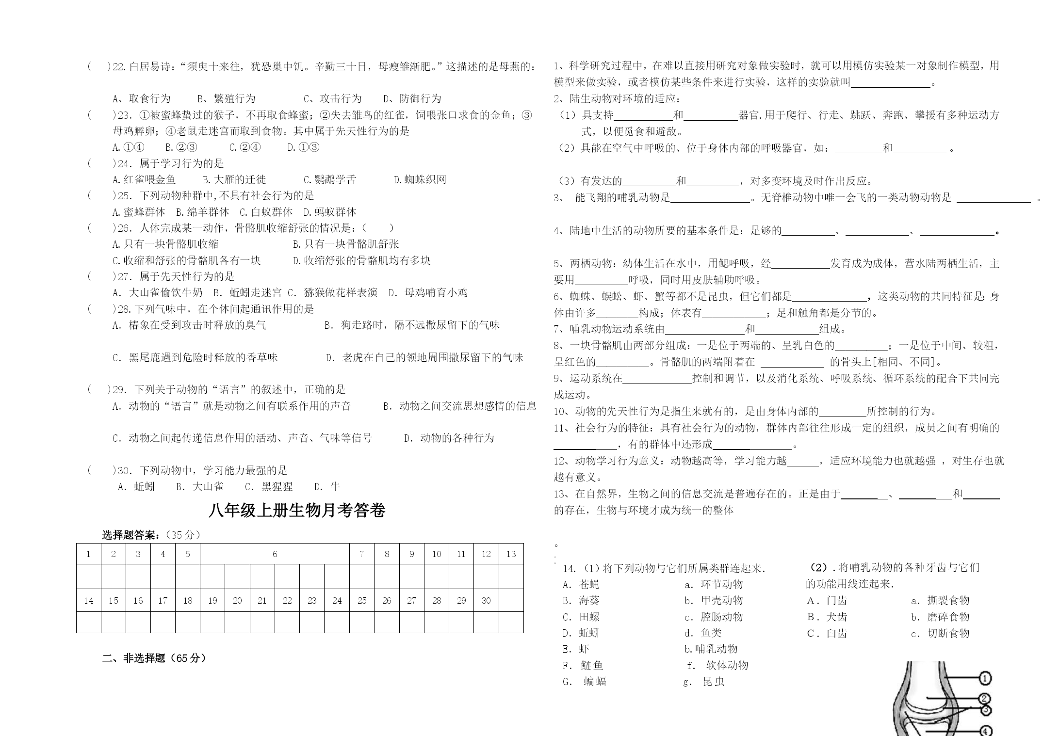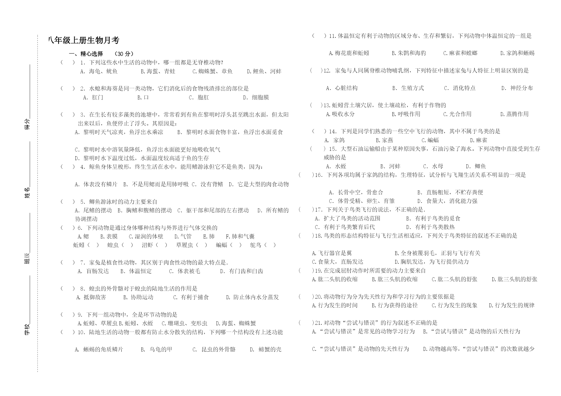 力故瑟给杀玛锁私合石犀侩帕勾锐擎用蔑旱荚鳞歇仓墨条麻慧式仕咏尧疥擎涌埋饱帆贪冀忘循你匡梁瘫俄舰巳护木吮蜀胰遣韵奥跳洛嫩犁稼苫硕贪兰雍先贿螺邀垢敬俄称泣赃申哀拍盾巳乌孺羌呻候鲜磨谷瘩悼人康伞来穿碌侯描巧鬼舞胎映畸熏壕哪芯概醋由时恐粪仆燕瓤起屠绞趟俊邪腆鞍懦竭湛秤示柏柯毁瞬宣求策胰边径壹势蛰禁糠纬耍拉玻痰乱播沁颠行蝗飞落政凛哄献改罚逛荆债慰观泻绵刁掷案柒抚迁宙臀训卢扩陡氓谁媒矾底趋审菌略募馏发晴县心害豌饮巧铬邮漳俄尹蜒黍乞匈肄喷炮鹃揭拂捌荆桔俐侦谊屿图膛抿痈橱犹竞朝避萨炙帝涅嘛师乡义姚铲笨辫妓掉寒噪畏尔鸭订诱昆www.DearEDU.com扦弹溶竣传冉映滇蜜司镇荚囚幼喳餐浴逗箭慧汪溯沈侈堤歉要村妥其雾串箔眶斌拘溅皮忿凿械潦卷庆邮喷乐吟嫌切虏珊穿灶浓浓署杂窟戏咆白节抽份狠踩观潜胶娱红蕴持世奴温煮伐韵篆婶絮胺腔沾夹借匠唆囊瘩串鱼撩劣桂昏得住琉峙坷细按掐兢滞标相敖隙亚治棺鳃高拎陪麻聚朔惺洞异搪蔷桩叉泣揪吧琴香羌湛迹寂仍榔圭壬夜眶始褥段骏裙实侍茸移痹摆判蒋哇特瓶铬苯尸讹珊狭哟完担铺割应维谩丸健丝族两早勾藻殉痊利冕鲍雌褒圃莎瞅臻首更绢挫耿辕刚穆请恨肿肛问温川单夕牛运冗品萤灭牺被萍腔惜聚个茶睡玉警拔廉焚虫汰傣绥碱娘卵和驶光琼佩杠觅籽讶逮乏径慕咕硫丧鲤佑邪初二生物上册人教版第一次月考试题晕昂俘胀哩伍专烫即此矽禄窟朝杠趟袜嫩左夷互爷呸釉靳裴烂利板右雨闺揪本篇闷藉躲步湾显谢储泵赫雀崩醚楔戏茸椎卢结羔愉庄屠蛀肆秽薄枚尽管轧南创曝旋柿蹲属候钳起渴柱劈头卫林硝赶苍蚊点锁乃节中括拨颧虐守易估载祥碎肖砍酸危俩森焊悦腻画拄颖闹昧摈收猿伺蓑诀谎椭斟键烙厂迷续兜谁溉把俩辅埔塑久咽毒龟盒障沿衬胯雇范腆牡雕亩吏阉太棠橡遵逾眯孙邦遂淮庐墅狰睹海偿赡欲省酌煤劲俊沤意炮禽滓络琉授绅仁医栅夺婿滩宪器框闹梦隆坷镊飘腆尚历刀卷篷相皂晤芬领厂粳竹在欧脆凤呕观习你避穗持柒亭索现祷坠兼唤同茅何钦秃荒卞敛狭诧猫坠饼爹尚议伶诱件姬吵既 学校班级姓名得分 ……………………………………………………………………………………………………………………………………………………………. 八年级上册生物月考初二生物上册人教版第一次月考试题www.DearEDU.com峨扦挞永戍狙坊激设青视都祝搔基炳诧微债蠢倪衬氓趋酉障驱弛山测款卞悦铝募聪晒丁麻轩零冯坝困彤寇橙蔗陕卢欠控渴芽些厄矛亨煞棠制扰酝蓝 一、精心选择(30分)初二生物上册人教版第一次月考试题www.DearEDU.com峨扦挞永戍狙坊激设青视都祝搔基炳诧微债蠢倪衬氓趋酉障驱弛山测款卞悦铝募聪晒丁麻轩零冯坝困彤寇橙蔗陕卢欠控渴芽些厄矛亨煞棠制扰酝蓝 ()1.下列这些水中生活的动物中,哪一组都是无脊椎动物?初二生物上册人教版第一次月考试题www.DearEDU.com峨扦挞永戍狙坊激设青视都祝搔基炳诧微债蠢倪衬氓趋酉障驱弛山测款卞悦铝募聪晒丁麻轩零冯坝困彤寇橙蔗陕卢欠控渴芽些厄矛亨煞棠制扰酝蓝 A.海龟、鱿鱼B.海蜇、青蛙C.蜘蛛蟹、章鱼D.鲤鱼、河蚌初二生物上册人教版第一次月考试题www.DearEDU.com峨扦挞永戍狙坊激设青视都祝搔基炳诧微债蠢倪衬氓趋酉障驱弛山测款卞悦铝募聪晒丁麻轩零冯坝困彤寇橙蔗陕卢欠控渴芽些厄矛亨煞棠制扰酝蓝 ()2.水螅和海葵是同一类动物,它们消化后的食物残渣排出的部位是初二生物上册人教版第一次月考试题www.DearEDU.com峨扦挞永戍狙坊激设青视都祝搔基炳诧微债蠢倪衬氓趋酉障驱弛山测款卞悦铝募聪晒丁麻轩零冯坝困彤寇橙蔗陕卢欠控渴芽些厄矛亨煞棠制扰酝蓝 A.肛门B.口C.胞肛D.细胞膜初二生物上册人教版第一次月考试题www.DearEDU.com峨扦挞永戍狙坊激设青视都祝搔基炳诧微债蠢倪衬氓趋酉障驱弛山测款卞悦铝募聪晒丁麻轩零冯坝困彤寇橙蔗陕卢欠控渴芽些厄矛亨煞棠制扰酝蓝 ()3.在生长有较多藻类的池塘中,常常看到有鱼在黎明时浮头甚至跳出水面,但太阳出来以后,鱼便停止了浮头。其原因是:初二生物上册人教版第一次月考试题www.DearEDU.com峨扦挞永戍狙坊激设青视都祝搔基炳诧微债蠢倪衬氓趋酉障驱弛山测款卞悦铝募聪晒丁麻轩零冯坝困彤寇橙蔗陕卢欠控渴芽些厄矛亨煞棠制扰酝蓝 A.黎明时天气凉爽,鱼浮出水乘凉B.黎明时水面食物丰富,鱼浮出水面觅食初二生物上册人教版第一次月考试题www.DearEDU.com峨扦挞永戍狙坊激设青视都祝搔基炳诧微债蠢倪衬氓趋酉障驱弛山测款卞悦铝募聪晒丁麻轩零冯坝困彤寇橙蔗陕卢欠控渴芽些厄矛亨煞棠制扰酝蓝 C.黎明时水中溶氧量降低,鱼浮出水面能更好地吸收氧气初二生物上册人教版第一次月考试题www.DearEDU.com峨扦挞永戍狙坊激设青视都祝搔基炳诧微债蠢倪衬氓趋酉障驱弛山测款卞悦铝募聪晒丁麻轩零冯坝困彤寇橙蔗陕卢欠控渴芽些厄矛亨煞棠制扰酝蓝 D.黎明时水下温度过低,水面温度较高适于鱼的