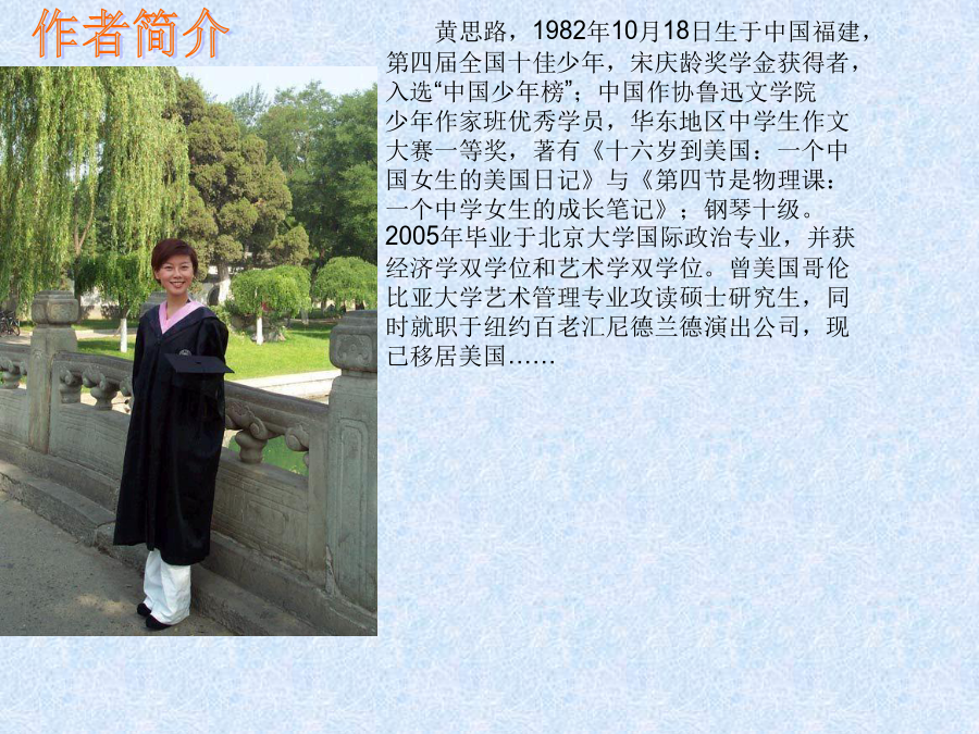 读书交流16岁,我们在干嘛?有一位16岁女生独自去了美国,生活了3个月, 她看到了什么?黄思路,1982年10月18日生于中国福建,第四届全国十佳少年,宋庆龄奖学金获得者,入选“中国少年榜”;中国作协鲁迅文学院少年作家班优秀学员,华东地区中学生作文大赛一等奖,著有《十六岁到美国:一个中国女生的美国日记》与《第四节是物理课:一个中学女生的成长笔记》;钢琴十级。2005年毕业于北京大学国际政治专业,并获经济学双学位和艺术学双学位。曾美国哥伦比亚大学艺术管理专业攻读硕士研究生,同时就职于纽约百老汇尼德兰德演出公司,现已移居美国……目录网上对本书的评价,于我心有戚戚焉专家关注到达美国6月10日星期四 哈哈!我成功了!现在是科罗拉多时间6月10日晚上11点,而在中国已经是6月11日了。我早上从福州出发,乘了三架飞机,辗转了4个机场,飞了29个小时,居然还是今天的事!好过瘾!洛杉矶机场大得让我吃惊!!!大大小小花花绿绿的汽车在机场内的环形公路上穿梭奔驰,公路中央的圆形花坛里花团锦簇,每个航空线入口都有一个公共汽车站——在机场内的各区间往返竟然要乘公共汽车!天哪!这个机场是个小城!美丽的丹佛小镇,开车需4小时才能到爱斯本音乐学院,所以路路的亲戚朋友都无法时刻在她身边。路路的舍友好想家爱斯本人情温暖美国令人向往之处美国的黑暗面夜里,我给妈妈写了一封信,信上说: “妈妈,我要让你知道,不论在什么时候,什么地方,我都绝对不会做出让你和所有我爱的人伤心失望的事来……永远也不会,我向你保证!” 我用的是大写的NEVER。作者黄思路希望大家去读一读这本书