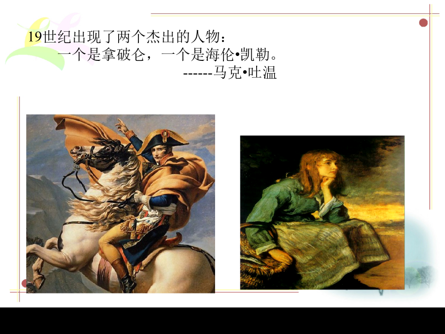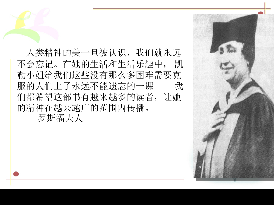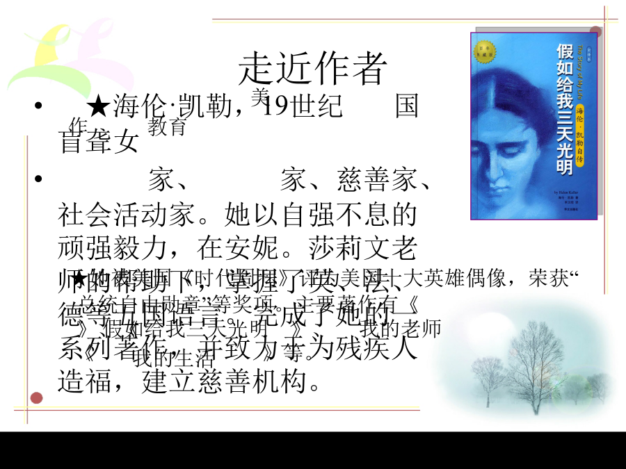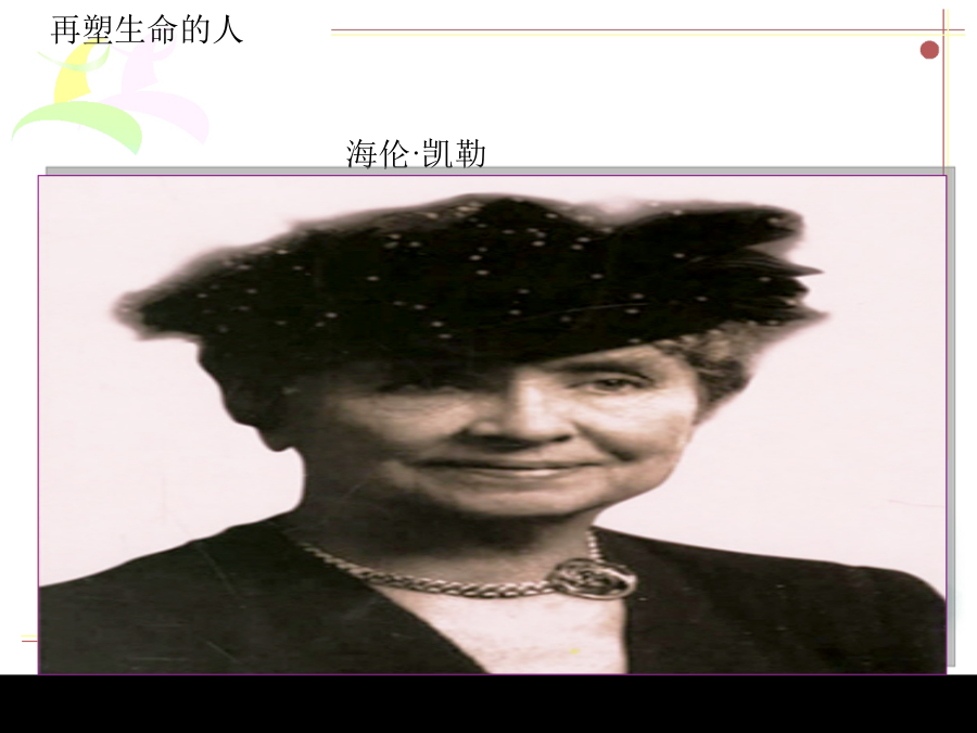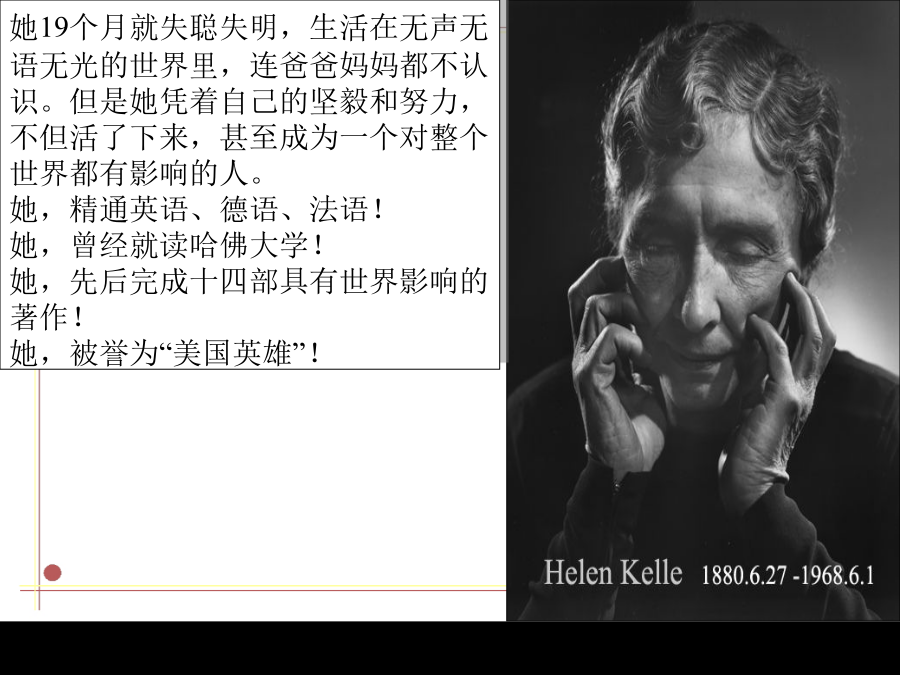 再塑生命的人走近作者19世纪出现了两个杰出的人物: 一个是拿破仑,一个是海伦•凯勒。 ------马克•吐温 她19个月就失聪失明,生活在无声无语无光的世界里,连爸爸妈妈都不认识。但是她凭着自己的坚毅和努力,不但活了下来,甚至成为一个对整个世界都有影响的人。 她,精通英语、德语、法语! 她,曾经就读哈佛大学! 她,先后完成十四部具有世界影响的著作! 她,被誉为“美国英雄”!是什么原因让她成为有如此杰出成就的伟人呢?今天,我们一起走进《再塑生命的人》,去感受一个病弱生命的顽强成长的足迹和引领她人生转机走向光明的莎莉文老师。海伦在她的名作《假如给我三天光明》一文中深情地抒发她对莎利文老师的爱:“假如给我三天光明,我第一眼想看的就是我亲爱的老师。”搓捻怦脾气 譬如恩惠繁衍小憩 诱惑枝桠冥思遐想 遨游钥匙预兆凝聚 遗憾和蔼琢磨绚丽1、在莎莉文老师到来之前,海伦的生命的原貌是什么样子的?请用原文回答。我,经过数个星期的愤怒、苦恼,已经疲倦不堪了。2、莎莉文老师给海伦带来了什么,她都教会了海伦什么?海伦学会后她的感受如何?3、她对海伦的教育顺利吗?举例说明。莎莉文 (1)把洋娃娃扫到炉边把帽子给我。 (2)把我的一只手放在喷水口下,在我的另一只手上拼写“WATER”——“水”字,起先写得很慢,第二遍就写得快一些。效果 我恍然大悟,一下子理解了语言文字的奥秘。知道了“水”这个字就是正在我手上流过的这种清凉而奇妙的东西。水唤醒了我的灵魂,并给予我光明、希望、快乐和自由。4、安妮·莎莉文是一位怎样的老师?当堂练习(二)莎莉文老师对“我”做了那些事情?(三)细节探究2、心理描写:(感情变化) 3、景物描写: 第3段:穿透、照射、仰、触摸、抚弄——安静、无所事事。 第4段:迷雾中的航船、无声的呼喊——苦恼、无助、渴望。海伦·凯勒对莎莉文老师有什么样的情感?本文中再塑生命是指: “我的灵魂被唤醒,莎莉文老师让“我”认识了文字,再次拥有了光明、希望、快乐和自由。爱的光明照到了我的身上”。所以,莎莉文老师重塑了“我”的生命,就是我的“重生父母”。拓展训练1、小组讨论:用比喻的修辞手法按以下的格式仿写几个句子:海伦再塑生命成功的因素配歌曲《爱的奉献》拓展延伸 斯蒂芬·威廉·霍金, 英国剑桥大学应用数学及理论物理学系教授,当代最重要的广义相对论和宇宙论家,是当今享有国际盛誉的伟人之一,被称为在世的最伟大的科学家,还被称为“宇宙之王”。21岁时不幸患上了会使肌肉萎缩的卢伽雷氏症,所以被禁锢在轮椅上,只有二根手指可以活动。当时医生预测他最多活两年,但他依然活着。1985年,因患肺炎做了穿气管手术,被彻底剥夺了说话的能力,演讲和问答只能通过语音合成器来完成。 罗斯福 1921年因患脊髓灰质炎下肢瘫痪。 1932年当选美国总统,美国历史上唯一 蝉联四届的总统,评为是美国最伟大的 三位总统之一,同华盛顿和林肯齐名。 贝多芬 德国著名的作曲家、钢琴家、指挥家,维也纳古典乐派代表人物之一。从1796至1800年,整整4年,贝多芬的耳鸣日夜作响,这是耳聋的前兆。贝多芬26岁时听力开始减弱,老年耳朵失聪。他和米开朗基罗、列夫·托尔斯泰的一生都经历了各种苦难坎坷,法国作家罗曼·罗兰根据他们的人生写成了《名人传》。 海伦凯特 19世纪美国盲聋女作家、教育家、 慈善家、社会活动家。在她19个月的时候,持续高烧发热,夺去了她的听力、视力,接着她又丧失了语言表达能力,使她置身于黑暗世界里无法摆脱。 海伦·凯勒享年88岁。而在她死后,因为她坚强的意志和卓越的贡献感动了全世界,各地人民都开展了纪念她的活动。有人曾如此评价她:“海伦·凯勒是人类的骄傲,是我们学习的榜样,是人类善良的表现,相信她的事迹能成为后世的典范。马克·吐温说:“19世纪出了两个了不起的人,一个是拿破仑,一个是海伦·凯勒。” 以顽强的意志创作了长篇小说《钢铁是怎样炼成的》天生跛足……路德维希·范·贝多芬 (1770-1827) 德国伟大的作曲家 26岁时听觉衰退 35岁时完全耳聋…… ——世界不给他欢乐他却创造了欢乐给世界自学掌握英语、日语、德语等。 当代知名作家、翻译家。史铁生 因双腿瘫痪于1972年回到北京。 并发展到尿毒症,需要靠透析维持生命。 自称是“职业是生病,业余在写作”。 史铁生创作的散文《我与地坛》鼓励了 无数的人。2002年获华语文学传媒大奖 年度杰出成就奖。曾任中国作家协会全 国委员会委员,北京作家协会副主席, 中国残疾人协会评议委员会委员。 2010年12月31日凌晨3点46分因突发 脑溢血逝世。顽强的毅力可以征服世界上的任何一座高峰。 —荻更斯1、完成练习三、四 2、课外阅读《海伦•凯勒自传》《假如给我三天光明》。