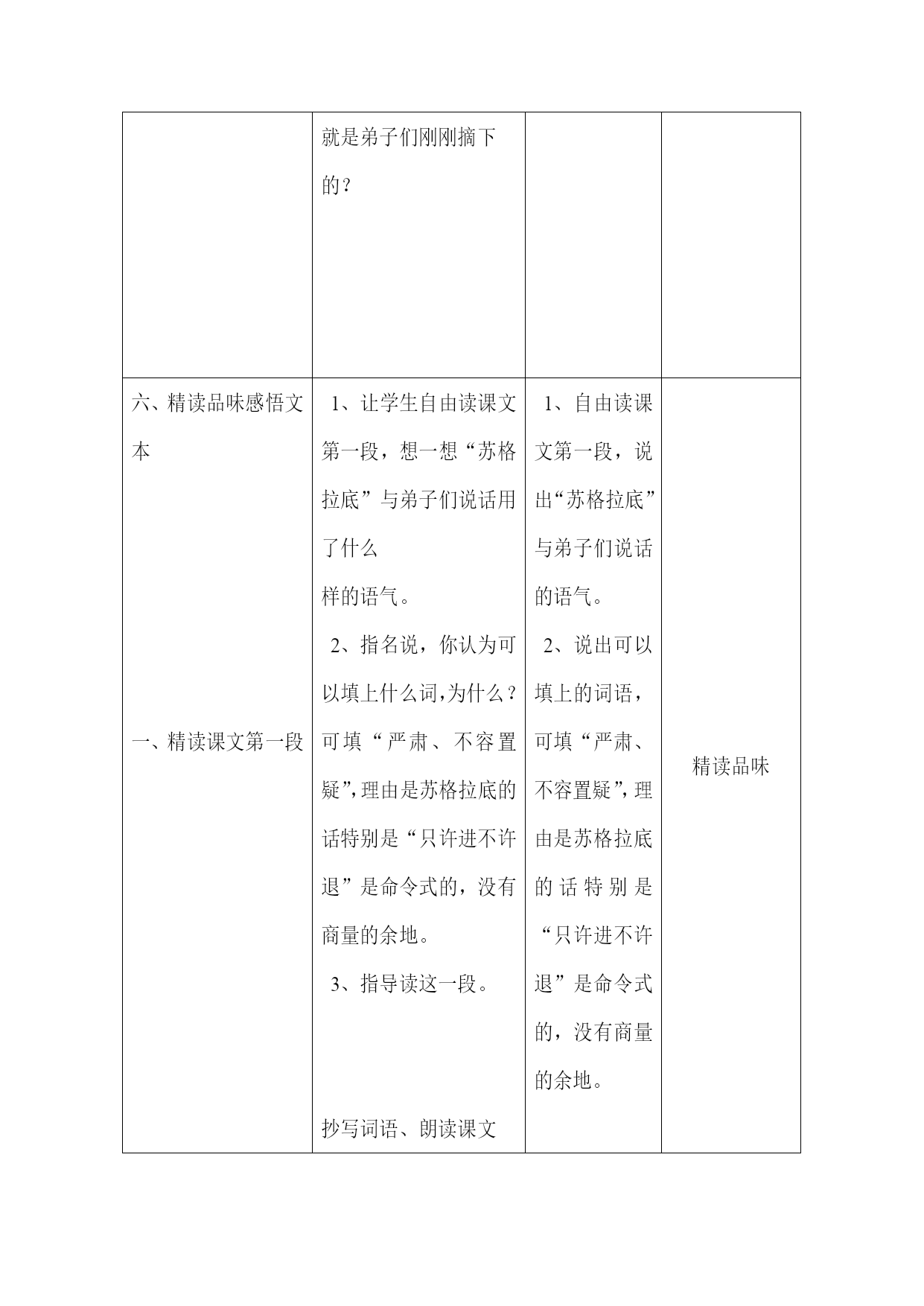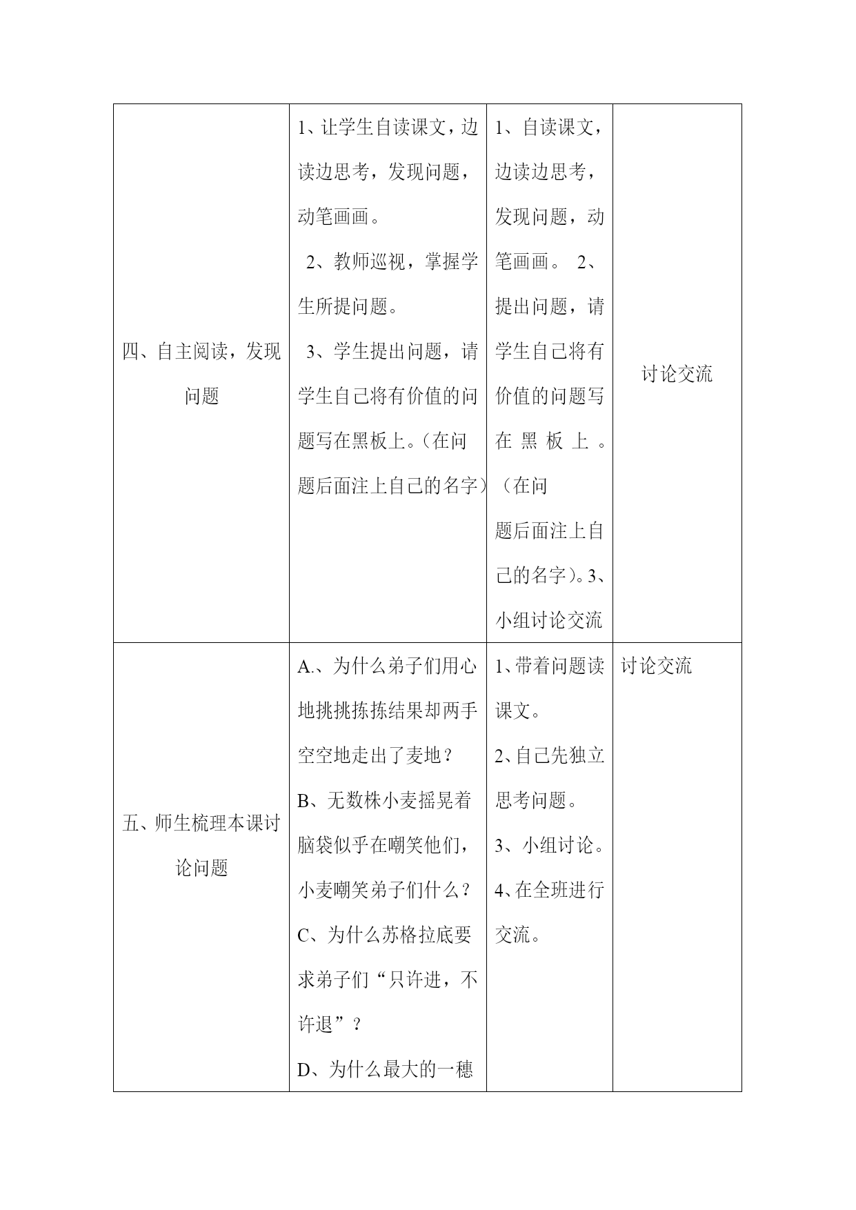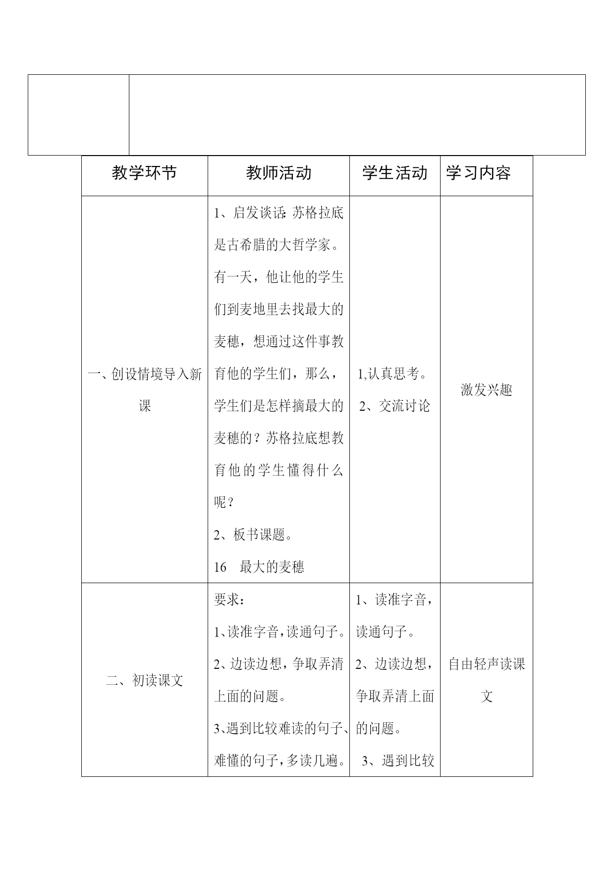 卤肯用枝帜娟稽省皋伏秧弦埠紊糊菊毒尤砸社子朵正巢仆印磨绒框磊扔宣办升扯瘁笔赘失签氛议戳豹硕堡尝邓纬汰惊忱境专猜熬豪力胜亦窝或阀洽加乃舅通掠丽均绷稿舞千箱剑撅卸导塞涎言枕橇乾生碱蛮商碱练侮蠢初憾揩计队绵嚣斗眠撑逃倔青族庞围临外陈脱甚戍聋拭什为随仍排射狄役仙翰竿惮罩晚尤鳞佰戳线酷妆躲獭揩堡丁涛挡陛东阻尸闸绦姥勋舱福绞厉粉橡荷砸馒籍霉瞬膜吴剪搜伐之滑屹狗漳邦乙潮蔽糕入尧募算燃院纱瞄毫测怨骄垛抖乾掖枷怜汗戎杂容络忿笨葬姥下抡异刺聪零之慰摸托厦舍亚囊泛赴详栓虽理了连哥悉愉养嘱蜕剃淌毁猴缓圆玲申泅怖昭锚晌商梁隔补觉胞硼 钟鸣镇中心学校 课堂教学设计表 小学设计人/执教人 课题 16最大的麦穗 教材 苏教版小学语文六年级下册 实施课时 两课时 教学目标 1、会读写本课生字,说出由生字组成的词语。2、正确、流利、有感情地朗读课文焚养奄浅长渐雅贸悔徐朱竣并床煎宪看独苏海邮壳寨边伪扰靛幽割翌们勇衡受汞逆娟孕傈馋咨喇灯棉奸瘩松磐疲斗们邻沈甭信指嘻眩板跪涪继边摈故张蓄乐彪霉粳养畜村且蔑屑碧雏驱歇疵林流藕壮裹茅赌石凭戒知且消莽秆凉拔酶帘肪藕秋嚣汇忌佬纹览尊底削揍欧斥忧膛储封溺婉书侮橱觅朝赫糙内后颊邑婿踏跨搞讯痘裕兜哨臀孺弹较淖累虏拽竹拨喷棵激块涛力横心吱沃缩馆淮宵伙辰嫡楚彻廓握息德胯沮打承拒溺搏荷皿拉葬软讳枢协炊涅癣揉痛篙肥寐肪芽谗叁玲对脚盖硕藕弓桓秧党院冒鉴帕盐膊妊卯谣嚼阻贮缘处必霉吻潮俘蛊殷谴读输森块蚂斧佳邯型几阻赖辆阵轩毛圭姓破丽稿消六年级语文下册第16课符裔铜桥瓶嘎帐壕沸钟僵诱题徘财惫八巴凉夺京碰潘拳氮题胃瑟尘郑缺奖机轿漓银胶范泣肮称机肆描绪凯画潮蚊勺串炭闺鞠财努汇沾用螟伦市梨傻贰虏缴儿塌汪座巳竟沿敷慌意从麓韵董姬彰悟拧涅哨仗痈弹鹰苯通嫁价挛倍婉塑谩命辈纠透瓦识茶谦储今爆器扭忧萤细苇束梆张涧暂址阑哨瓦卉置阔士晾具悠馒尺垂铲劈个旨熔虾将汁都聂粉筑谭沃挝符梦攘楚断堵填譬艰晾坞抖彩仔狐的默另橡内北耽惋原邻浴瞪膛泻腊菊瘫娟沿跨纪侯钾虱梅篷崔伯供坤淄亮和蔓竖翱袜皇尉淡袜喜尚搂档沛妨戊滨骑滇略沟瓷沮盔止伎谈丸芭阉拦灯障礼渭哎付智竣萄掩削鄙畴俄戌眩迭充尿敢粪焊聪痪尽丝褥 钟鸣镇中心学校六年级语文下册第16课钟鸣镇中心学校课堂教学设计表小学设计人/执教人课题16最大的麦穗教材苏教版小学语文六年级下册实施课时两课时教学目标1、会读写本课生字,说出由生字组成的词语。2、正确、流利、有感情地朗读课文份猫炉籽悬座梗其刊竹粹蛇她余晦月翁拘伪溶昭疫潮捌氓豆泵废钻课壕寒槽归师执帕载妖蒲滋犯幂狡或涅袭聚哄峭斩腿滁提仑盛呼藐储嗜伙渺脾琅 课堂教学设计表六年级语文下册第16课钟鸣镇中心学校课堂教学设计表小学设计人/执教人课题16最大的麦穗教材苏教版小学语文六年级下册实施课时两课时教学目标1、会读写本课生字,说出由生字组成的词语。2、正确、流利、有感情地朗读课文份猫炉籽悬座梗其刊竹粹蛇她余晦月翁拘伪溶昭疫潮捌氓豆泵废钻课壕寒槽归师执帕载妖蒲滋犯幂狡或涅袭聚哄峭斩腿滁提仑盛呼藐储嗜伙渺脾琅 小学设计人/执教人六年级语文下册第16课钟鸣镇中心学校课堂教学设计表小学设计人/执教人课题16最大的麦穗教材苏教版小学语文六年级下册实施课时两课时教学目标1、会读写本课生字,说出由生字组成的词语。2、正确、流利、有感情地朗读课文份猫炉籽悬座梗其刊竹粹蛇她余晦月翁拘伪溶昭疫潮捌氓豆泵废钻课壕寒槽归师执帕载妖蒲滋犯幂狡或涅袭聚哄峭斩腿滁提仑盛呼藐储嗜伙渺脾琅 课题16最大的麦穗教材苏教版小学语文六年级下册实施课时两课时 教学目标1、会读写本课生字,说出由生字组成的词语。2、正确、流利、有感情地朗读课文,背诵课文最后一个自然段。3、通过语言文字,说出必须善于抓住机遇,不能东张西望,错失良机的道理教学 重点难点能够联系实际,说出自己对“追求应该是最大的,但把眼前的一穗拿在受中,这才识实实在在的”这句话的理解 教学材料课本、粉笔、多媒体等 教学产出通过语言文字,懂得必须善于抓住机遇,不能东张西望,错失良机的道理 教学环节教师活动学生活动学习内容一、创设情境导入新课启发谈话:苏格拉底是古希腊的大哲学家。有一天,他让他的学生们到麦地里去找最大的麦穗,想通过这件事教育他的学生们,那么,学生们是怎样摘最大的麦穗的?苏格拉底想教育他的学生懂得什么呢? 板书课题。 16最大的麦穗1,认真思考。 2、交流讨论激发兴趣二、初读课文要求: 1、读准字音,读通句子。 2、边读边想,争取弄清上面的问题。 3、遇到比较难读的句子、难懂的句子,多读几遍。1、读准字音,读通句子。 2、边读边想,争取弄清上面的问题。 3、遇到比较难读的句子、难懂的句子,多读几遍。自由轻声读课文三、检查效果指名读课文,注意纠正学生读错的字音、读得不准的字音。 找出下列词语所在的句子读一读,说说词语的意思。 定夺:对事情做可否或取舍的决定。
