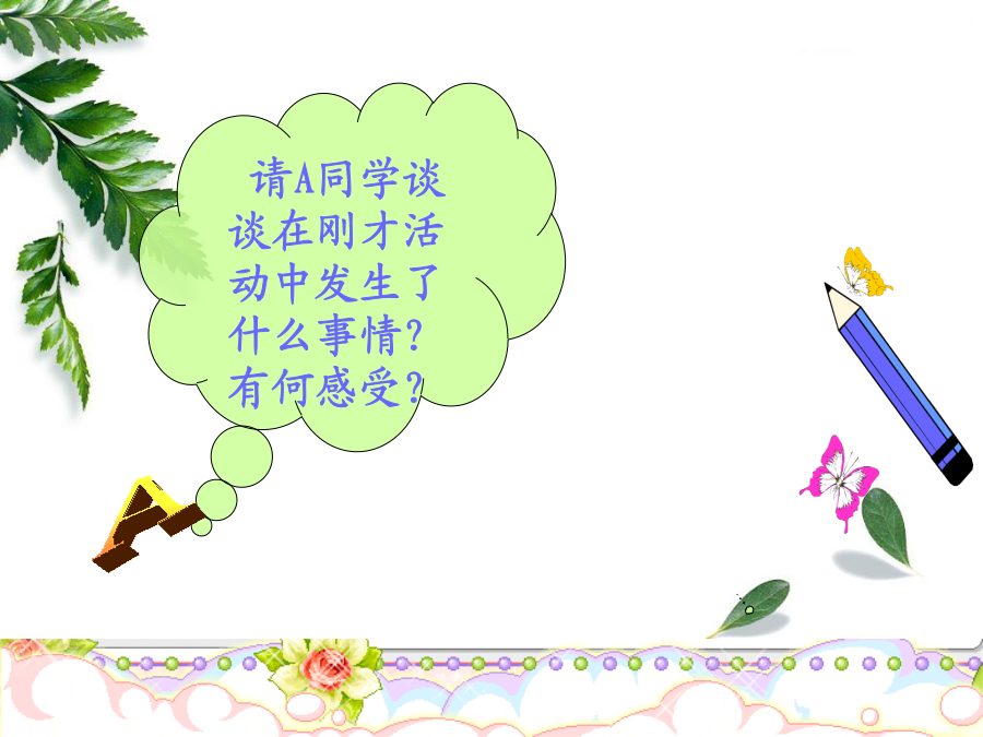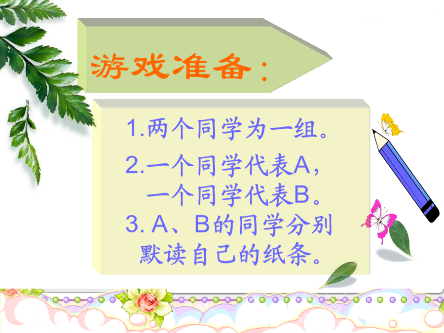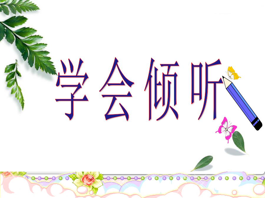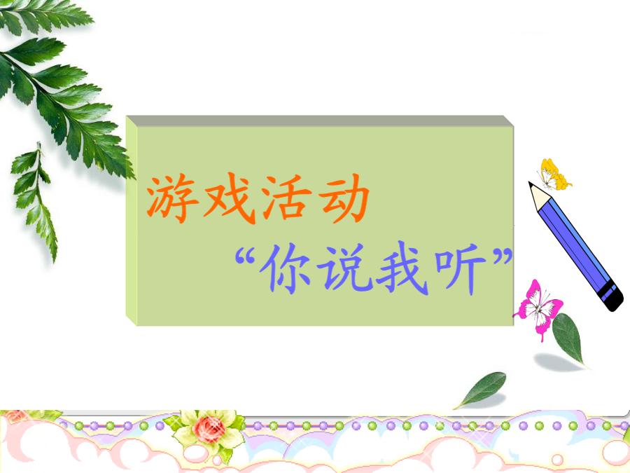 热身游戏 “我说你做” 学会倾听游戏活动 “你说我听” 1.两个同学为一组。 2.一个同学代表A, 一个同学代表B。 3.A、B的同学分别 默读自己的纸条。 请A同学谈谈在刚才活动中发生了什么事情?有何感受?请A同学谈谈在刚才活动中发生了什么事情?有何感受?身身身身身身身良好的倾听方式从良好的倾听方式来看,想一想自己是不是一个好的倾听者?继续完成上面的游戏。 在这次游戏中,请代表A的同学继续完成他们刚才的讲述,要求代表B的同学做善于倾听的人。 请A同学谈谈,跟上次活动相比,有什么不同的感受?做一个善于倾听的人 做一个善于倾听的人 良好的倾听方式下面有几个小问题,考一考同学们的倾听能力。每个问题分别念三遍,看看你能答对多少道。 上帝给我们两只耳朵,一个嘴巴,就是让我们多听少说。 愿我们都能做一名良好的倾听者!