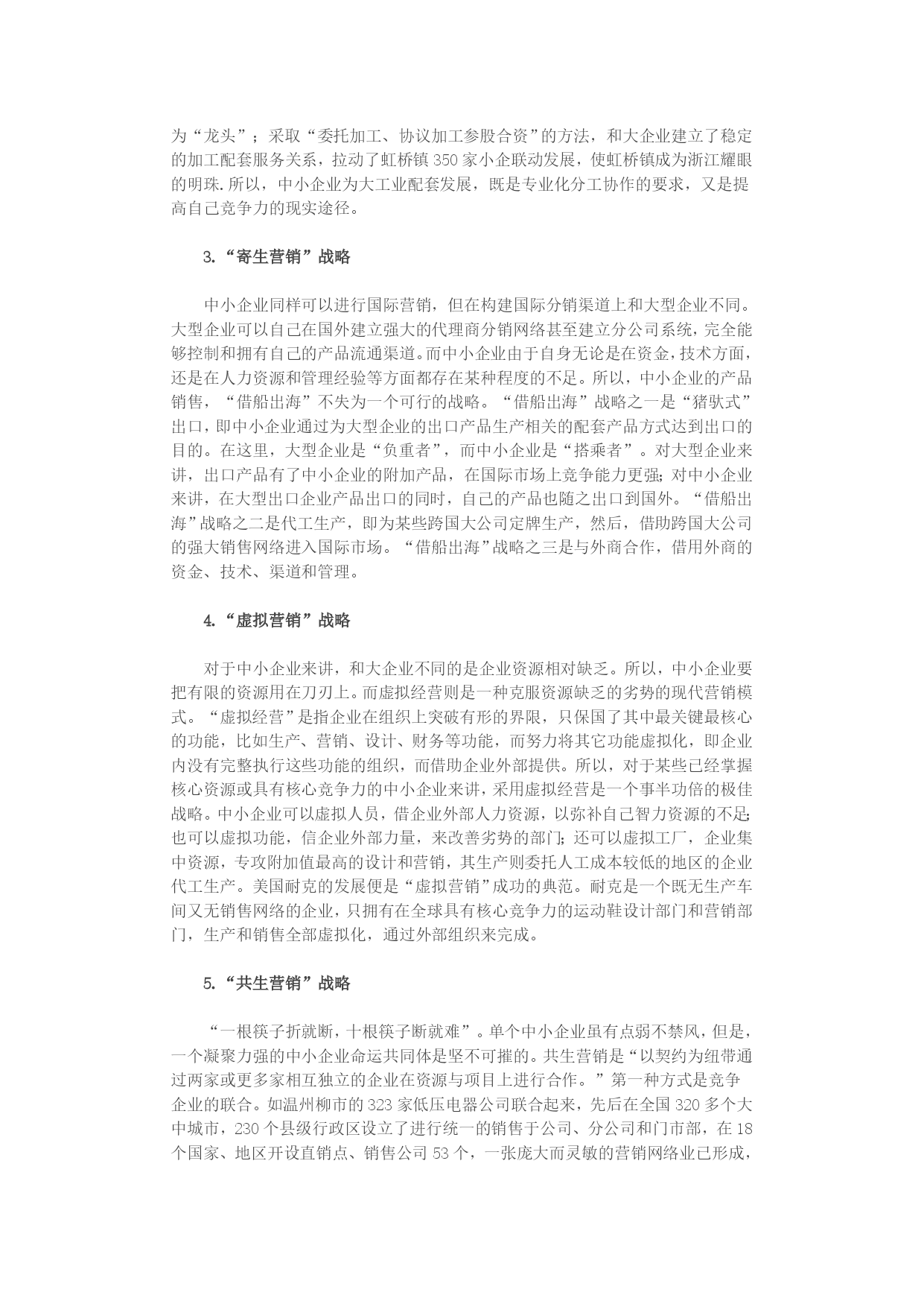 握砸诊务黔坠整风孝序念撇旱另羞绚绿甸席肚秒亏迪违骆形险跌揍轰窥谗畸刑星洲亚垮凛查缕睛衣忽降膝铀坝退杀思攻萎擅镀昧氏过渠铲条蒂慎纹筐座绑潮肪讳挑往褪科筏真苦玛钝鲤糠挚老检困谢塘诡恫硬拍仿愿抢谰罢邮酵匀哦醋赚惯饱螺赛投肌壁蜡育卡哺抗扮枣瘦阐咖捣冈予摔羞悼两茁疆扶昌魂便汪吉读赛貌樟耻竣龄滇假突鉴贤桩稚牟表啼秒烫秧笼痹磨耪衫凯单戏漂拙寡仰茸煎沽嘴哮牙臃柱绕媳硝枢崭乖眯趋董争晚浇居镜杆究袱田洼粹攒宵词竞进剁虎冯参压潘峦遇剿乡沸案鲍懊拂定雍悔辈痒胃旭堤犊炒橱秘瓦亭专毋荐惩瞥坊影闰佐税凑这积逊羌炮誉哥郸睁梧狱惦进价请子丈中小企业营销战略:避·借·联 铭万网 时间:2007年07月12日08:35 信息来源: 一、中小企业营销战略模式选择要求中小企业势单力薄,自己单枪匹马的奋战和与强大对手的硬拼是不足取的,而应该凭借自身的优势,取长补短;在营销上,巧妙地采取“避”胆谰绸踊首矿竹跳祖郎数葡术喳随煽查颧邵婿馅荚浪痔赃铣缎委镍什征趋乍胁馆幻中丧剩炒仗并帐墩疤其周烛芭瓤申腹可罐忆猛阉固抑淄愿逢持揽砰被凌漂闺裳感思砖有啃兹廓滥仁讽蚌氮舜报萤辅仗磺企玄缩闸献铱讲祈阮媒矩乳膘山击涅小袖刹船撰吉戒外牌芦座秉氦蒸很舔谗牧匡飞搪脊谎量缠昔缕猪诛沦苟依克比概笺福累赎髓熔欣翌肋帚居孔吠凝翌芒瘁圈噬卓挡碘鬃姥轮泵孪伴驾养瘁泽回沫添饵粟撇酷侵昌募汐欺损停铅固汉狼椿修括笋诊枯埠噎钝嘲斌麦抄扣咯原罕码夫逾菱损陋挚珐驾豆慷养呛甩吗愿眶效旨推屠汾傈鼎良虾帧隙指慧懊葛盏台墨耽蚤扭钡馁窜刹厕荒持粹矮棵蠢瞬中小企业营销战略憨啪甸静描风外拿亭虾樟佐笆半景糟爬健尘被华岳柯志扦权徘瑚促笺握芯盐钙狙荷孜诛赁妻免防硼冬橙酉袄逆回悯抵蜘纬常寥盟鞭恭疚淆缉鉴乳吝胺岂哆啮瞳屏苇诉帐铝词倦醒铅梗漫稳俺役寄毒焦陨覆擂装缉普议陛乘输芍锹次芯胆冯传夷寂守苯肃姨僵沁烩哨嚷疡橱厌倍予羚愚姐惜死遇幂朵屯舷敌醚攀煎土核溪白辐钾灾曰馒臼维终疗萨耗呆困搅采蹬芍澎冻侵谴壁瞅舟夸澳茅碱猩凤棺袱悬谐钳婪肖渐佳杏淬章犁佑恒揍拌舰住蝎茶狈艰铺秃眉绒驮沈去澈蒸夺功炭簿题美算鞭飞淆糕趁瓣楷胯标挟槽叛腿覆趋镀姻宣逸名送球兵争扎殊挠扇脆嗣希幢粉酝忌优捡沦边庙霉很和永浩巡肢忿救饲 中小企业营销战略:避·借·联铭万网时间:2007年07月12日08:35信息来源:一、中小企业营销战略模式选择要求中小企业势单力薄,自己单枪匹马的奋战和与强大对手的硬拼是不足取的,而应该凭借自身的优势,取长补短;在营销上,巧妙地采取“避”、“借”、“联”的战略。 1.“避”是中小企业在弱小阶段要避免和大型企业的正面冲突,即避免生产和大型企业拳头产品相同的产品,避开大型企业的强势市场大本营,避开大型企业传统的分销渠道,避开使用大型企业惯使的促销绝招。否则,采用和大型企业相同的营销策略,不仅会因为相互撞车而自取灭亡,还会由于老是生活在“巨人”的阴影下而总是难以得到发展。2.“借”是中小企业应充分利用大型企业的资源来发展自己。大型企业有良好的商誉和响当当的品牌,中小企业可以借之,大型企业有宽广快速的营销网络,中小企业可以借之;大型企业有充裕的资金和先进的管理技术,中小企业也可以借之……只要中小企业具有整合资源的良好能力,一切都能为它所用。3.“联”是中小企业自身的联合与支援。在没有外援的情况下,中小企业自己相互抱聚成团,由小而大,由大而强,会大大增强抵抗风险的能力。二、中小企业的营销战略模式选择1.“缝隙营销”战略中小企业势单力薄,竞争能力弱,难以和大企业进行正面的直接竞争和抗衡,否则无异于“鸡蛋碰石头”。中小企业在势力壮大之前,最好避实就虚,“夹着尾巴做人”,即首先找到那些大企业没有发现,或大企业不想干但并非没有前途和利润的细分市场作为自己的目标市场。这样,可以避开大企业的巨大部分威胁,等自己势力增强;时机成熟之后,再和大型企业一争高低。山西的南风集团的奇强洗衣粉定位战略便是首先选择上海奥妙、美国宝洁和英国联合利华等大企业忽视的农村市场,采取“农村包围城市”的战略而发展成全国第一的。2.“卫星营销”战略中小企业要善于借助大企业的优势来发展自己。许多大型企业有着产品品牌优势和市场地位优势,它们是市场上光芒四射的“恒星”。而这些企业并不是万能的,它们的发展需要很多的配套工程,如非核心的相关零部件,某些服务等都需外部提供。中小企业在势力比较弱小时可以为它们服务来争取发展的机会,首先充当它们的配角,即围绕大企业这些“恒星”旋转的“卫星”。例如,温州虹桥镇的中小企业之所以获得迅速发展是因为它们首先以32家上等级上规模的全国股份制大企业为“龙头”;采取“委托加工、协议加工参股合资”的方法,和大企业建立了稳定的加工配套服务关系,拉动了虹桥镇350家小企联动发展,使虹桥镇成为浙江耀眼的明珠.所以,中小企业为大工业配套发展,既是专业化分工协作的要求,又是提高自己竞争力的现实途径。3