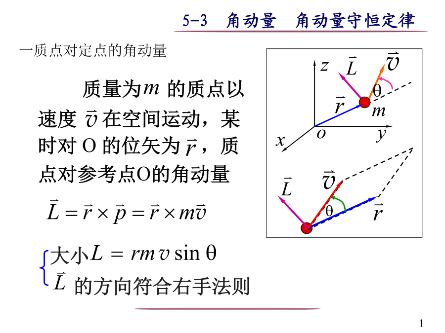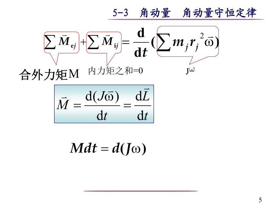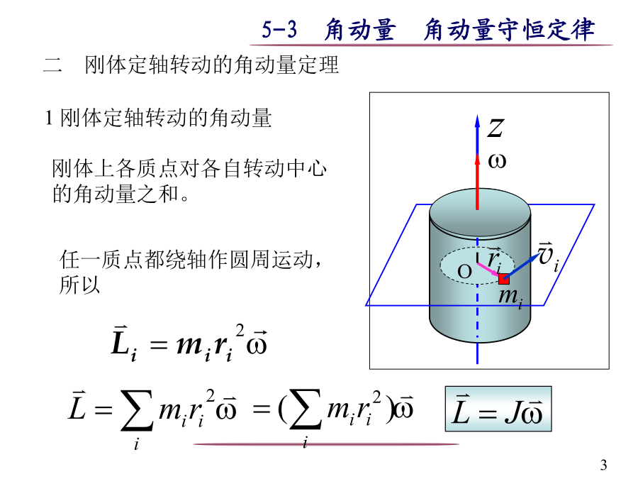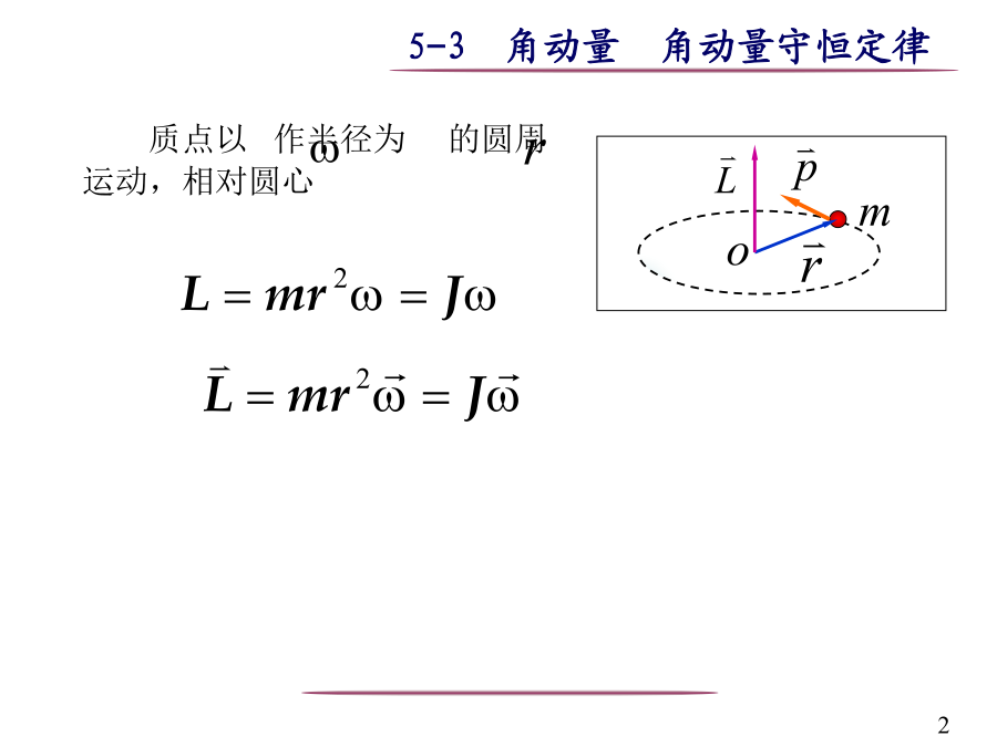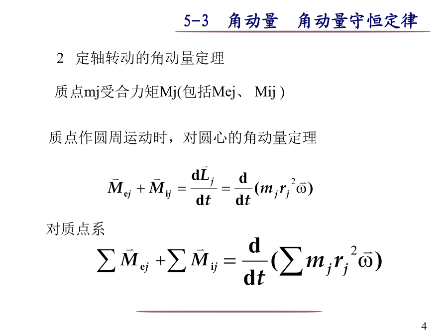 一质点对定点的角动量质点以作半径为的圆周运动,相对圆心2定轴转动的角动量定理质点系(非刚体)定轴转动,受合外力矩M对定轴转的刚体3定轴转动的角动量守恒定律可适用于任意质点系 质点对转动轴的角动量守恒条件角动量守恒定律是自然界的一个基本定律.直线运动与定轴转动规律对照自然界中存在多种守恒定律解:取人和转台为系统,则人走动时,系统角动量守恒(为什么?)设平台角速度为,人相对转轴角速度为’。例2一静止的均匀细棒长为l,质量为m,可绕通过棒的端点且垂直于棒长的光滑固定轴在水平面内转动,转动惯量为,今一质量为m,解(1):求:任意位置时,轴给细棒的作用力在碰撞过程中,细棒既具有极大的加速度,同时角速度也不为零,所以受到轴施加法向和切向两个作用力,动量不守恒。 子弹射入竖直面内杆时,根据相似的分析,动量不守恒解(2):子弹为研究对象例3质量很小长度为l的均匀细杆,可绕过其中心O并与纸面垂直的轴在竖直平面内转动.当细杆静止于水平位置时,有一只小虫以速率垂直落在距点O为l/4处,并背离点O向细杆的端点A爬行.设小虫与细杆的质量均为m.问:欲使细杆以恒定的角速度转动,小虫应以多大速率向细杆端点爬行?解虫与杆的碰撞前后,系统角动量守恒由角动量定理例4一杂技演员M由距水平跷板高为h处自由下落到跷板的一端A,并把跷板另一端的演员N弹了起来.问演员N可弹起多高?设跷板是匀质的,长度为l,质量为,跷板可绕中部支撑点C在竖直平面内转动,演员的质量均为m.假定演员M落在跷板上,与跷板的碰撞是完全非弹性碰撞.M、N和跷板组成的系统,角动量守恒解得一力矩作功二力矩的功率四刚体绕定轴转动的动能定理刚体的重力势能是组成刚体的各个质点的重力势能之和六、机械能守恒以子弹和沙袋为系统子弹击入杆圆锥摆例1一长为l,质量为m的竿可绕支点O自由转动.一质量为m’、速率为v的子弹射入竿内距支点为a处,使竿的偏转角为30o.问子弹的初速率为多少?例2、一轴承光滑的定滑轮,质量为M=2.00kg、半径为R=0.10m,一根不能伸长的轻绳,一端固定在滑轮边上,另一端挂一质量为m=5.00kg的物体。已知定滑轮的转动惯量为;其初角速度为0=10.0rad/s,方向垂直纸面向里。求:解 (1)m又解(2):据机械能守恒定律:最后在接触处无相对滑动时,每个圆柱的角速度1,2两圆柱系统角动量守恒故有上解认为系统的总角动量为两圆柱各自对自己的轴的角动量之和是错误的,因为系统的总角动量只能对某一个轴进行计算。正确的解法应对两圆柱分别使用角动量定理,两柱接触时摩擦力大小相等、方向相反由此可解得:练习一根长为l、质量为m的均匀细直棒,其一端有一固定的光滑水平轴,因而可以在竖直平面内转动。最初棒静止在水平位置,求它由此下摆角时的角加速度和中点C和端点A的速度角速度。XX