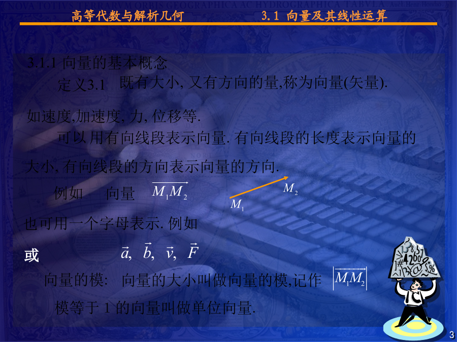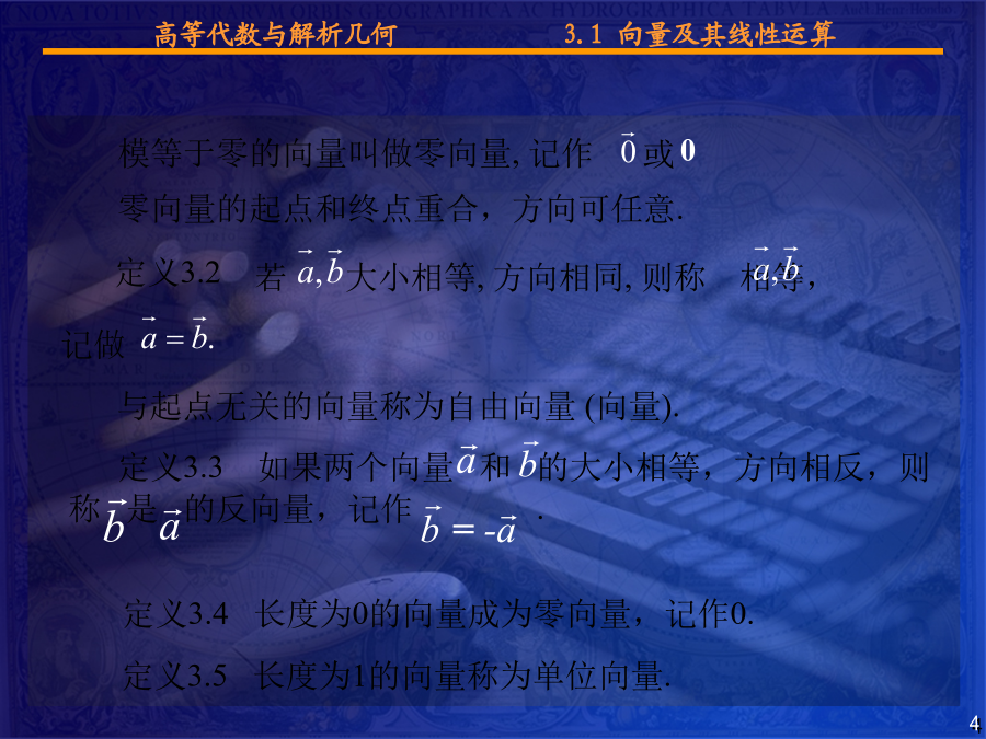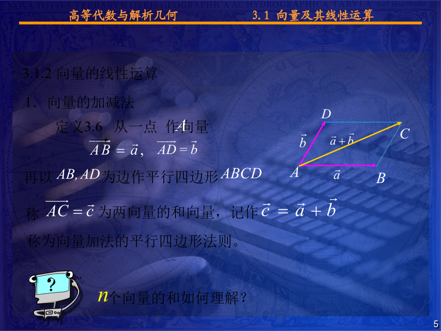 第三章向量代数3.1向量及其线性运算3.1.1向量的基本概念若大小相等,方向相同,则称相等,1.向量的加减法两向量的差:特别地,定理3.1定理3.2其中证由三角形法则例3.2用向量证明三角形中位线定理.结束
