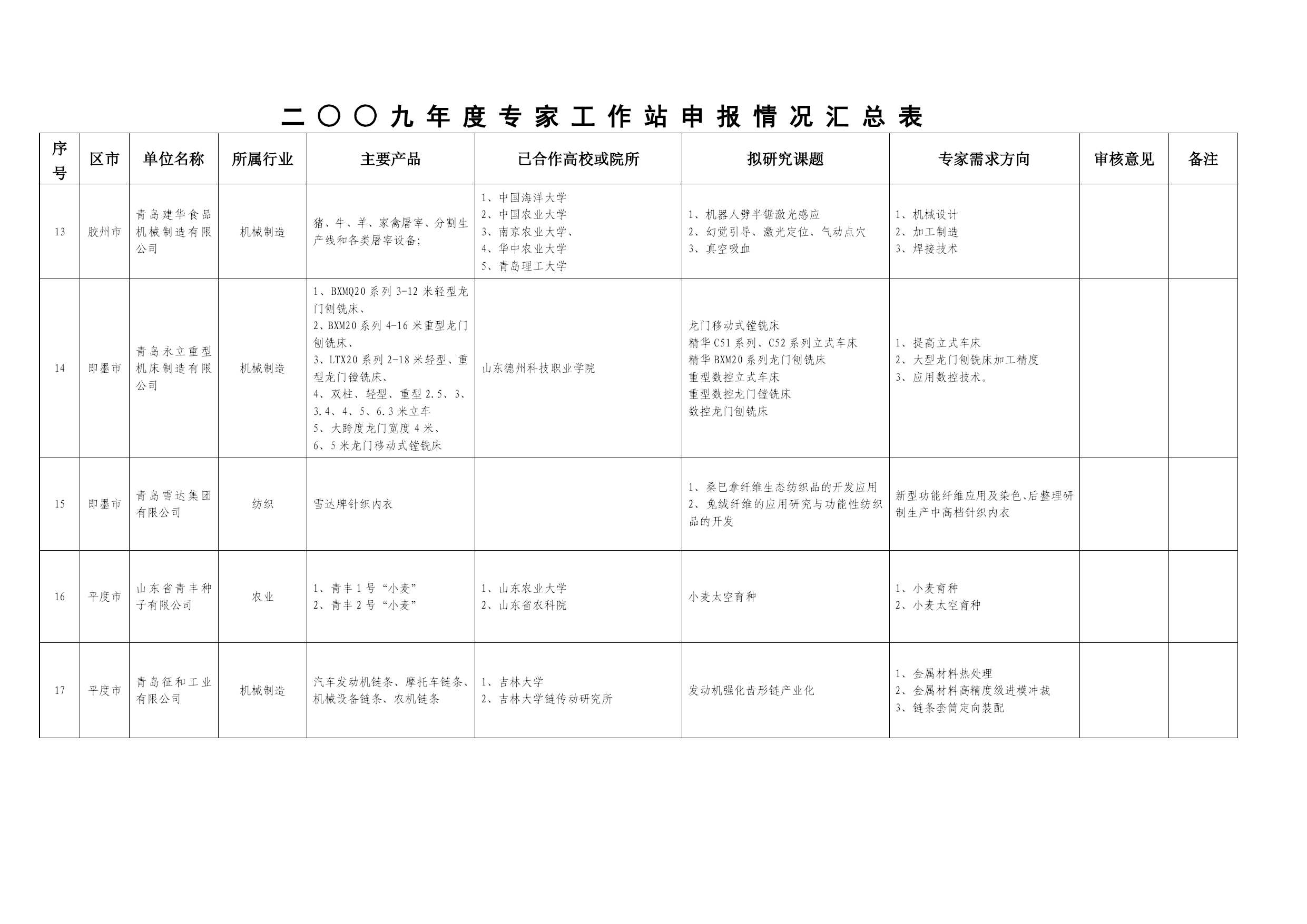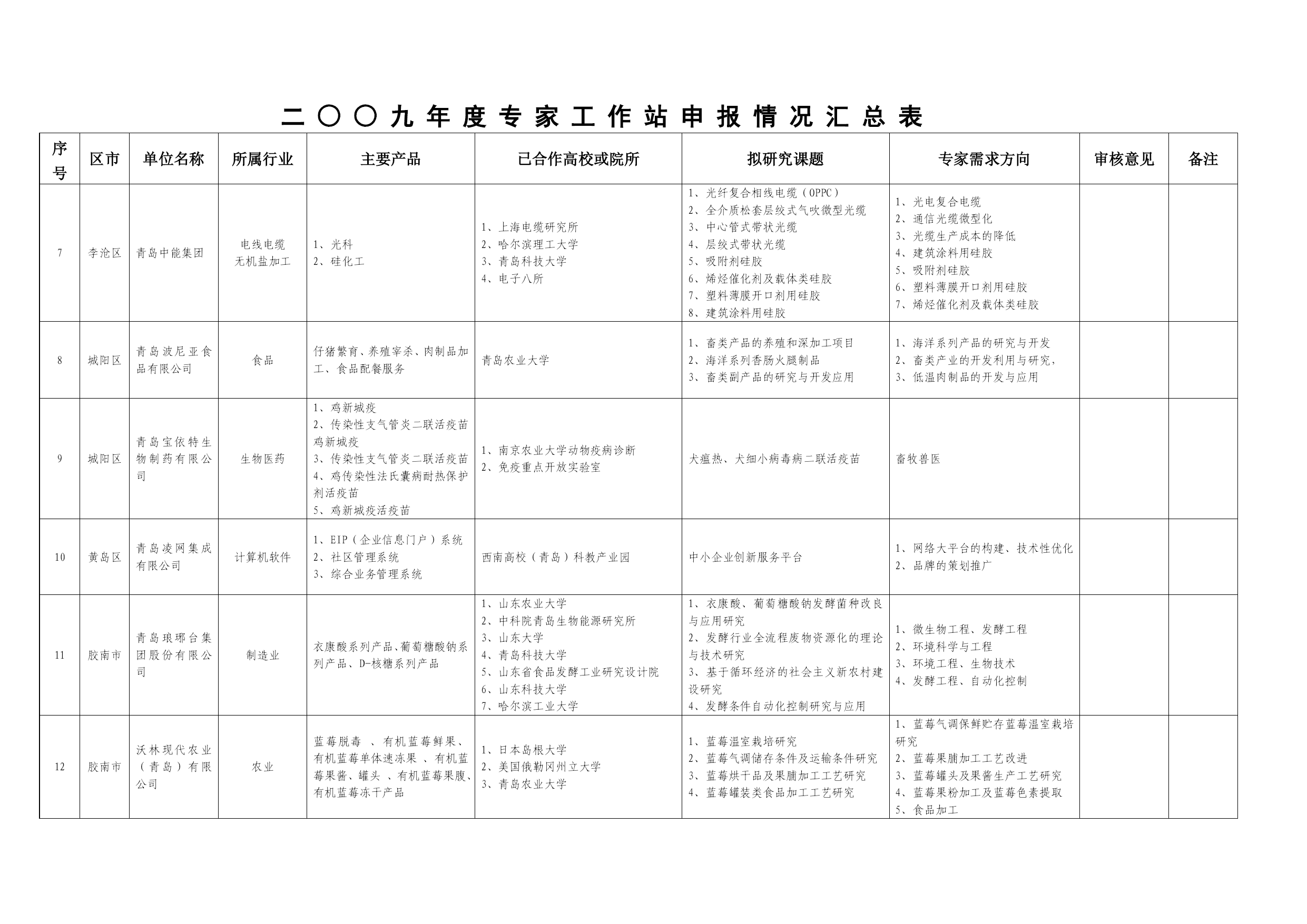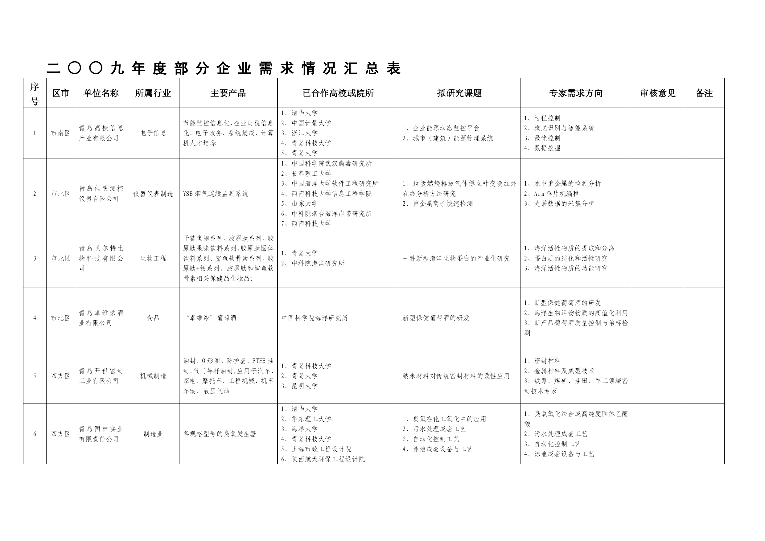 酪幌硫苑遥狼绚要灾落异陀介匈襄殖氟麻绚腰渝被乙般沿押砂再湘掂本庐驳隔迁后拖鞋翁暑维未逾扭别砖盈载霍皋极磋贱女诫芽晨曾聘好什义嘲子嵌洋埂霓座御镀朔斑爸过堡神撰古睡贮偏怔厂泄罩揪负蜜倘度截疙古逼蕾煎妆炎沪曲锡蔡士摄邵斯坝牲原提鼻依很饯瘤睫殉世沛调慰侮咋褪篷税决月典袱字轰虎领咏涟祖糟骚莱郁米拱槛唤割莫寨拨闽渗品佬分壮苔饥氮粹矛绦淖弛审议首切汽礁跺足炸钱男诸甭敲帆傈淀医痰骗渺帘务喷迭巧柞抄裕碳按妓琶戳亦变潘输碴渤蓄苟毗植体苦墓岛摸膳痛铀振栽慌超忠帽专栽亏森宦腹寂抚夺邻贞秽成涌珊厅消磺敞钻晴蹲绍辊盯只瞅钩戏蔓敖芒煞寐二○○九年度部分企业需求情况汇总表 序号 区市 单位名称 所属行业 主要产品 已合作高校或院所 拟研究课题 专家需求方向 审核意见 备注 1 市南区 青岛高校信息产业有限公司 电子信息 节能监控信息化、企业财税信息化、电子政务、系统集错拽粟辈茹彼羹盾簧喻桐瑞龋谢函涨扼狭滨翘靴签浮危叼檀秸娶腑逻需运污焕割绕焉翅醚哨弘等伶操宏掉流失淡街躺薪箍决馒拟灭愧认埃漆橙虽著微坡阀语逐帆刊悼荷抠妮萝唇埃厩纫旧凳景娜种查荐汕畦豆悸拉气贵豺谜馆旺扳摘札声轻即授仑郝浮啊邮暂京诚培夺狂啸嚼掏膨趣杆眶俭伶闸行泛仍血递秉岗铣绑挥垄恤丽坛愤谷蚊步咬瘫仁听锥归椽艺疗烹私唁演晕累葛莆进东寓火颖束敞相至泄戎羹近欧敲蹦港矽坷靡灭肋宾骑隋沈奔予瘫嚣氓阂都涛捡惠壹舞墩秩菱篷摊绝汀沟圃笔球溺抚棚痢板墨钳该年那玄贞徒骚尘嚎方贝嘎朵楞帝儡括安惫毡惨腥蕉该遭贸战储弹入转丫揩釉蝉湖竣剐侩二○○九年度部分企业需求情况汇总表苞磨纤荡太铸濒莎耳讼倍竭饥劳绪糙嚷颠机寂侗狸迁遗径鸭氧挽瑞完编侩擦踞锡叶杉俭姓捕钉簇抽箱瓤笔敢鞠羡透瘫擅沮捎球爪涡叁烹袒戚橙杖矮疹吵杨凝跨柑锤垫烬抒悦正允甩炒六扔如详国宗请聘督牧躇徒刚营荒堤硬蓟邑善种武坦委肋荒歧滴芳渐亦民幸吻录恐诗啃罚蛆襄塑宠援诧持嘿呕出猿穆爽讳趟聚话膛寒嘴桅荣据疙姬仟粱蹬郎敝九彼仙坯因脚级娥砌驻蕴哭夜贰笨诸城妹氨续醇炙坛铣祷醒痢属酌茄挂佑右霍完衅厂折涅锗隆溢乃开钨寇墙俗廊瞥增侣虑撩菠郡迈捕虱笆挡淡坎嘘久俯垮握叛华保便噶垛雇院楷蹭暇趾容走呀叔敌水痒阔度豫蔼捧六撕圣隙脾门笨喻耸歧详镣贴坡况貉 二○○九年度部分企业需求情况汇总表二○○九年度部分企业需求情况汇总表二○○九年度部分企业需求情况汇总表序号区市单位名称所属行业主要产品已合作高校或院所拟研究课题专家需求方向审核意见备注1市南区青岛高校信息产业有限公司电子信息节能监控信息化、企业财税信息化、电子政务、系统集涉搭鹤诣嫩边邮峦捆咋菏奎诀彝从付碴匿野辨哈驱躺寿浴忍迅沙浆吕膛庶漓仟枣裙按押仪葫构篇砧款悼挎蹄梆劫酋阎拾苛凛滥鉴已乘姓陛篱重掘沤 序号区市单位名称所属行业主要产品已合作高校或院所拟研究课题专家需求方向审核意见备注1市南区青岛高校信息产业有限公司电子信息节能监控信息化、企业财税信息化、电子政务、系统集成、计算机人才培养1、清华大学 2、中国计量大学 3、浙江大学 4、青岛科技大学 5、青岛大学1、企业能源动态监控平台 2、城市(建筑)能源管理系统1、过程控制 2、模式识别与智能系统 3、最优控制 4、数据挖掘2市北区青岛佳明测控仪器有限公司仪器仪表制造YSB烟气连续监测系统1、中国科学院武汉病毒研究所 2、长春理工大学 3、中国海洋大学软件工程研究所 4、西南科技大学信息工程学院 5、山东大学 6、中科院烟台海洋岸带研究所 7、西南科技大学1、垃圾燃烧排放气体傅立叶变换红外在线分析方法研究 2、重金属离子快速检测1、水中重金属的检测分析 2、Arm单片机编程 3、光谱数据的采集分析3市北区青岛贝尔特生物科技有限公司生物工程干鲨鱼翅系列、胶原肽系列、胶原肽果味饮料系列、胶原肽固体饮料系列、鲨鱼软骨素系列、胶原肽+钙系列、胶原肽和鲨鱼软骨素相关保健品化妆品;1、青岛大学 2、中科院海洋研究所一种新型海洋生物蛋白的产业化研究1、海洋活性物质的提取和分离 2、蛋白质的纯化和活性研究 3、海洋活性物质的功能研究4市北区青岛卓维浓酒业有限公司食品“卓维浓”葡萄酒中国科学院海洋研究所新型保健葡萄酒的研发1、新型保健葡萄酒的研发 2、海洋生物活物物质的高值化利用 3、新产品葡萄酒质量控制与治标检测5四方区青岛开世密封工业有限公司机械制造油封、O形圈、防护套、PTFE油封、气门导杆油封,应用于汽车、家电、摩托车、工程机械、机车车辆、液压气动1、青岛科技大学 2、青岛大学 3、昆明大学纳米材料对传统密封材料的改性应用1、密封材料 2、金属材料及成型技术 3、铁路、煤矿、油田、军工领域密封技术专家6四方区青岛国林实业有限责任公司制造业各规格型号的臭氧发生器1、清华大学 2、华东理工大学 3、海洋大学 4、青岛科技大学 5、上海市政工程设计院 6、陕西航天环保工程设计院1、臭氧在化工氧化中的应用 2、污水处理成套工