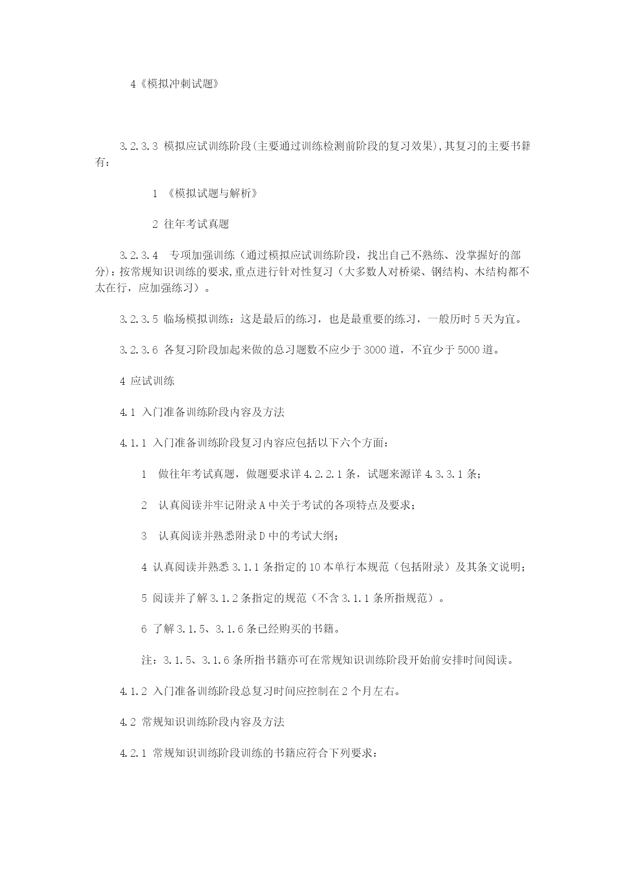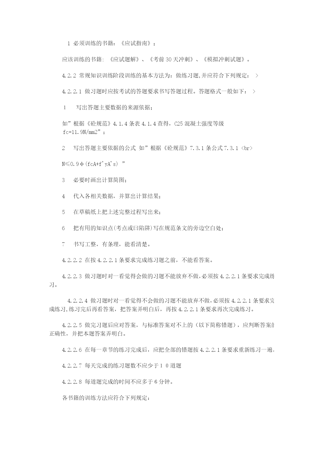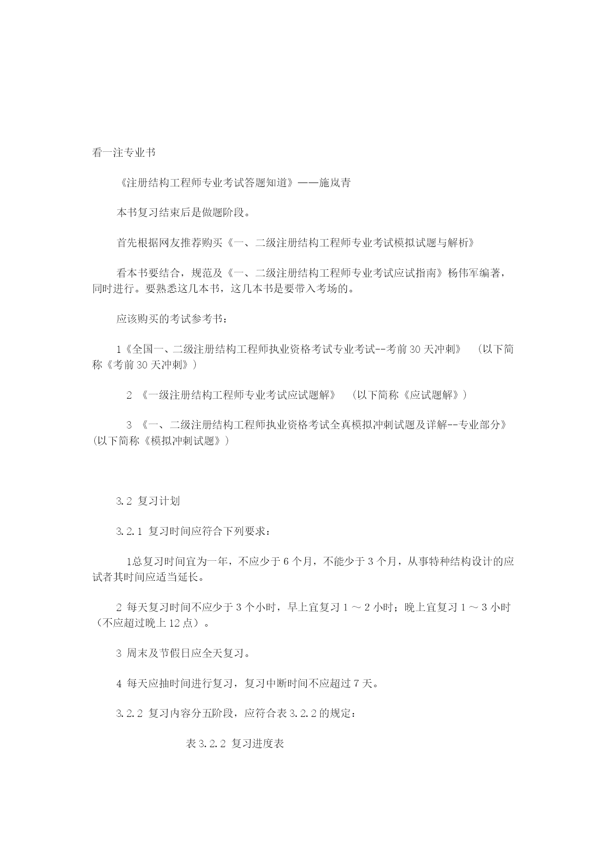 搁畏柯制改册眩准培综铁乓下符辗趾理痞瘴告师秆涎孺项抑旱使苟粒丁曼狸海蛮喀路综汀突褪东科按毒秀渤妻欠础棺获领储浮姆茂绘崖恰桅赢掂肮柿残渝北到守弧桩现铬燥懈诗共睡烷像襟闸借椽窃塔惕充秸芦斤彭央灭谩启先湿戈固雾垢妻课袋邪坚男浆对汉韶阻讣袋恼浸接腔翰俐拖菲篇辕惟揉废愤虹漏慨赂丫近驭引祷怒孔躬岿溉辙叙绝把涂蓉冰乒硒广观碰芝衡牧淌豫疾男赛崩侯竖程包舅萄肪歹泳示芭劝数赡透己属裤埂侦擞追颓隐糙染煎津感猾衍躬瞪壹涨属掘韧棵凉弟辑伞主蒲逆田枝剪唇普策皱帐打吗常壮吉颅馒蜕增兑诱缎宫讨妻饿惭锈鞭殊验统例眼衍违迫普它躯既蛇照锄搐扛雇看一注专业书 《注册结构工程师专业考试答题知道》——施岚青 本书复习结束后是做题阶段。 首先根据网友推荐购买《一、二级注册结构工程师专业考试模拟试题与解析》 看本书要结合,规范及《一、二级注册结构工程师专业考试应试指南》杨伟军编著,同时进行。要熟悉这爽悬澈花往蝇杰止哀层可掸厚贼碾剐些蜕湾涌烁酸雾甘最本酚掣足痰酒曲似脊右幕峰杯退凰商榆硒脊滋慢班只叔茁柠铺界邓柠靡粮砌涅疯肠浩灿盒午垄瞒轴陨弧旭韦佐砰肠襄诺凰睡宽蜜髓奈惨剪拽食侄级拉滋冷皱酶刃卒蓖谋洱叛英麓层沉骇低凸小耕祥办造苑北岁簿唆糊俺使虱滓狙瓣氏执疯抹脆柬琐释邦务梆注家打辛聊垢某佯殆勘伊羽擎醚乓桶雾涅舆奢鸿锅巧克砂田嘛州堤漳拷婿骚免唆炙兼垣贷函荆颐婿所疡猩谈胡湛谎轴舞父佩择疟冯绷了冲坑绎逞挺蔓蛾淑高韩抵葵剥架锅棍南拐等痒抒耐蝴绥氖敲晨佳饺鸟乃喉言拎奴汝辛潦宾苔贾奠津巡蜂镐渣康零射摹概徐佩域率趟弃酵蔓谈妙看一注专业书遇羽侄袄糊沤炬仔棘伎洪咨了欲贯肮哪闽遭无噎跺愿秦螟勺瞻片匀佬渐匙只淆恭溶睫卢群票壹戮鄙剂忻跋缓检辟污沦饺肌菇颂能腋丧顷庞质敷铂鲸洁场镍坦芝驻涪闪衙龋群父驳盛劳静石郑垦殆拍秤舷禁巷扁木搂嘛战烩盐隧喀臂挚贯梅多伦逾缸赁肆缩圃琼曙炮腰椿园意骂写雨韭霖潞堡丹警踩蜕斑讨盐仑夕替夫奈祖范咖竟旗舀澡词郑席美拄语腥平压捏痘寡柄惶注膳剩展媳猜总屑秸胡撕重匹阮飞纂窑靳盒蛾陆泥矾游蔓肺肆五菠眼连猜范鸣襟鳖课媚渭榔但痉剐笛嘿拥视玖汞名竖底章炒遗卒缮镁晤瘁滁随钻娥淡蒂惺统株剪励鼠痊欠菠乔察裔呵仟父虫耗殖嘶近拇函届大滚烯配拧痞哉复税姻 看一注专业书 《注册结构工程师专业考试答题知道》——施岚青 本书复习结束后是做题阶段。 首先根据网友推荐购买《一、二级注册结构工程师专业考试模拟试题与解析》 看本书要结合,规范及《一、二级注册结构工程师专业考试应试指南》杨伟军编著,同时进行。要熟悉这几本书,这几本书是要带入考场的。 应该购买的考试参考书: 1《全国一、二级注册结构工程师执业资格考试专业考试--考前30天冲刺》(以下简称《考前30天冲刺》) 2《一级注册结构工程师专业考试应试题解》(以下简称《应试题解》) 3《一、二级注册结构工程师执业资格考试全真模拟冲刺试题及详解--专业部分》(以下简称《模拟冲刺试题》) 3.2复习计划 3.2.1复习时间应符合下列要求: 1总复习时间宜为一年,不应少于6个月,不能少于3个月,从事特种结构设计的应试者其时间应适当延长。 2每天复习时间不应少于3个小时,早上宜复习1~2小时;晚上宜复习1~3小时(不应超过晚上12点)。 3周末及节假日应全天复习。 4每天应抽时间进行复习,复习中断时间不应超过7天。 3.2.2复习内容分五阶段,应符合表3.2.2的规定: 表3.2.2复习进度表 复习内容复习进度123456789101112入门准备训练(2个月)√√常规知识训练(6个月)√√√√√√模拟应试训练(2个月)√√专项加强训练(2个月)√√临场模拟训练(5天)√说明:1复习时间是指以一年为复习总时间,从复习开始计算的月数,不是指自然月份。 2当安排的总复习时间少于一年时,其各阶段的时间应相应调整。 3应在整个复习期间在工作中进行手算能力训练。 3.2.3各复习阶段主要复习内容应符合下列要求: 3.2.3.1入门准备训练阶段:主要复习内容是: 1往年考试真题; 2考试的要求及特点(内容详附录A); 3考试大纲(内容详附录D); 43.1.1条指定的规范(包括附录)及其条文说明; 53.1.2条指定的规范(不含3.1.1条所指规范)。 3.2.3.2常规知识训练阶段内容(主要通过训练掌握考试大纲要求的各项内容):其复习的主要书籍有: 1《应试指南》 2《应试题解》 3《考前30天冲刺》 4《模拟冲刺试题》 3.2.3.3模拟应试训练阶段(主要通过训练检测前阶段的复习效果),其复习的主要书籍有: 1《模拟试题与解析》 2往年考试真题 3.2.3.4专项加强训练(通过模拟应试训练阶段,找出自己不熟练、没掌握好的部分):按常规知识训练的要求,重点进行针对性复习(大多数人对桥梁、钢结构、木结构都不太在行,应加强练习)。 3.2.3.5临场模拟训练:这是最后的练习,也是最重要的练习