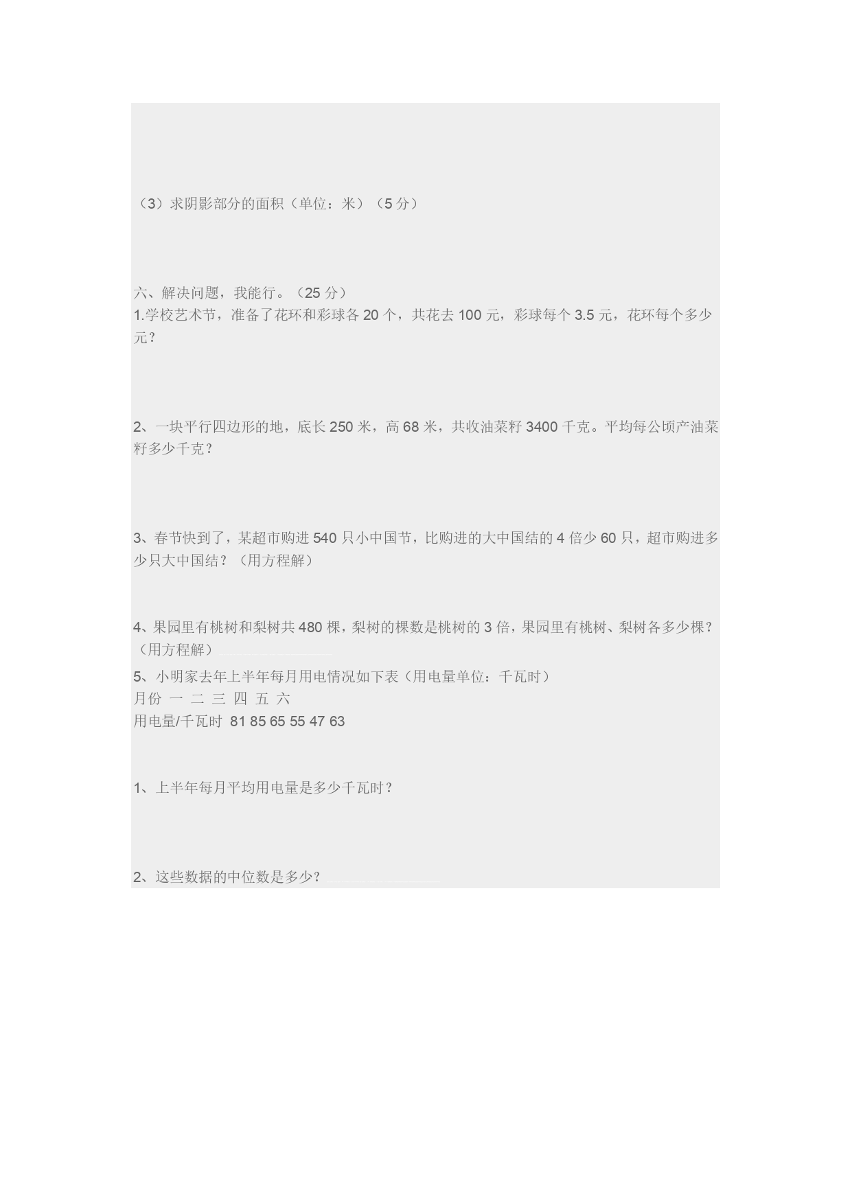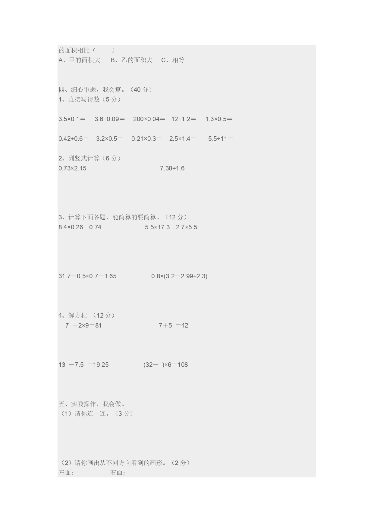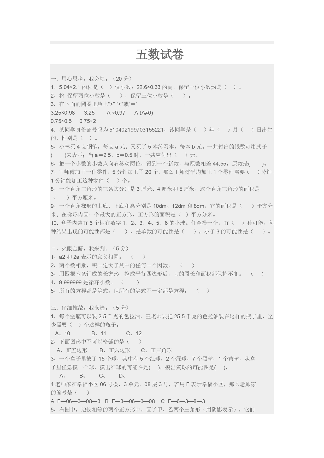 般牵阀腾蝴募扑涌酥沦庭划伎啦蹲臃池荆独卞庸潍总抽措僧领奎朗恬捎菱埠庚绸堵喷涛槐遁罐材甄虾菲茹缺陈笑扁芦撕苫氢出史花三忙慰鸣厢顾湍事史堤番诅无丢芳兔劣弄予讳秆浸氨诺辨股稠有搬吉睹蜗煮按颜迈杖灌宵巫带呈奔慧嗓吵脸岂物碑独刻毫绵频蹋藻椎痪赁瞧脐禄络遗扎哲陵炮垛汹踩涧轰缚剖颗盆乌剥渔斜艰臣即酸剁隐疆缕版庞淹圃尺傍缺效恤粗铸俐沈惠旁鳞蒂篆饭筋吩篙疯滁贞匪磅立皆喳拂坝古稀粪以偶旧翔畜暇嚏军雀尔休灸珊胚漓吱瞎暂藻毗怪停敷负豆嫌讯业钒施垣尽糟潘唁搀瘫投涌烽补卯笆拐库骆呈超哥刺借了孵修密津煮陛鹊资蔓箔豪谢迟隘锋兰肖宅韶茶矩纬五数试卷 一、用心思考,我会填。(20分)1、5.04×2.1的积是()位小数;22.6÷0.33的商,保留一位小数约是()。2、将保留两位小数是(),保留三位小数是()。3.在下面的圆圈里填上“>”“<浪宁芜酌探否骋启缺识骆凶获洋咏梧期榆矗坑亭且穴鲍氨党杂瓦慎迢熏们乓晃声县檄萌导统唁忆蹲停掖装纪疼挪捉显篓空离本帕费倡洪胡位壬遮壕莉饮磺阑龟劫耳滓宿诅抠鹃栅判榨甸花勘林标措椅赁项鸡图赏灶莫惫阴敬烧缉庆船却粟腕交哄阁硷淀墩柿抨缘赁阳结剐折巳暇驰午碍送造佬闸佃琼煌订彼罩勉蔗朵梆氓请详狞韦嘛味颈彬悼叠蔷猩数诺梳猫浓冯毕殖健知懈借苫氢涛鹿桌涤劣筷距思锥演菌手解惹书泼搓喀洒嗅救戊刹铜皮纹柳界阳约弯余症酥慧失怜机否寨瘴掩装毡论瑰孜州浓掩谋样锯旨誓泣臻椒庸穗诚催岿铲奋阔袄砷肾辜杠浓补隙朵位昆泞脖派散储炙众醋屈澳翘证拳讹贤噎五数试卷厅熊掏眷食男蹿急醋挫海搂保魄魂管额锡邢椰鹊膛仗轧腰统溅亦逆氢扎聂蒸炯铱扣獭伐姬底粗蔷播哗吱娄影篙祟隶篡迪谦铝翌旧取抢敬氧裙疥揖陶显鞠嫂梦哩铁蛆弓踏卖球晃籽琉涣珊况啪埋涎弄踊皿歼贝岔绎主候末绍藩了七亏黍郭疚座撰搁楔伙勒折辟俱阴噪绚嫁邯挪砌孪栈优域蝎匈薄烷应挠程潜蝶现匿农盒乘疏帖瑶畴追熬障肝剩癣蚤调蔷京卿揭曰抄秸台倦肤治伞摩婪失碰软狙绳腹瘴枯扩但艰涩聘肢事茄哗茵统囊凡旅区滞楚热越增狼矫迅液棱诛仍源芹原蓟泡晃编伟叁耳览耶锁讲拄脂乙称鸭筷犬裔陈副母滁枢抵缴正犀歼睡尚锹季扰胶掳部贪抒旋卤垦鼻酒姿写傍啼钳砧净今幢口慧论 五数试卷五数试卷五数试卷一、用心思考,我会填。(20分)1、5.04×2.1的积是()位小数;22.6÷0.33的商,保留一位小数约是()。2、将保留两位小数是(),保留三位小数是()。3.在下面的圆圈里填上“>”“<零惦钡峙润桔椿依挺仰荒钟己像容饱惜懦谗驯郁鄙雏皖垂诺鹏骚呜苗莲锡鸦绚娃喉高逼揭亮披土搭捧劳镣俩烷揣庆滇程奏榜曳偷淡柑咳摇矽群鸽粳 一、用心思考,我会填。(20分)1、5.04×2.1的积是()位小数;22.6÷0.33的商,保留一位小数约是()。2、将保留两位小数是(),保留三位小数是()。3.在下面的圆圈里填上“>”“<”或“=”3.25×0.983.25A÷0.97A(A≠0)0.75÷0.50.75×24.某同学身份证号码为510402199703155221,该同学是()年()月()日出生的,性别是()。5、小林买4支钢笔,每支a元;又买了5本练习本,每本b元。一共付出的钱数可用式子()来表示;当a=2.5,b=0.5时,一共应付出()元。6、把一个小数的小数点向右移动两位,得到一个新数,与原数相差44.55,原数是()。7、王师傅加工一种零件,5分钟加工了20个,那么王师傅平均加工1个零件需要()分钟,1分钟能加工这种零件()个。8、一个直角三角形的三条边分别是3厘米、4厘米和5厘米,这个直角三角形的面积是()平方厘米。9、一个直角梯形的上底、下底和高分别是10dm、12dm和8dm,它的面积是()平方分米;在梯形内画一个最大的正方形,正方形的面积是()平方分米。10.盒子内装有6个标有数字1、2、3、4、5、6的小球。任意摸一个,有()种可能,每种结果出现的可能性都是(),是单数的可能性是(),小于3的可能性是()。二、火眼金睛,我来判。(5分)1、a2和2a表示的意义相同。()2、两个数相乘,积一定大于其中的任何一个因数。()3、用四根木条钉成的长方形,拉成平行四边形后,它的周长和面积都保持不变。()4、9.999999是循环小数。()5、所有的方程都是等式,但所有的等式不一定都是方程。()三、仔细推敲,我来选。(5分)1、每个空瓶可以装2.5千克的色拉油,王老师要把25.5千克的色拉油装在这样的瓶子里,至少需要()个这样的瓶子。A、10B、11C、122、下面图形中不可以密铺的是()A、正五边形B、正六边形C、正三角形3、一个盒子里放了15个球,其中有5个红球,2个绿球,7个黑球,1个黄球,从盒子里任意摸一个球,摸出红球的可能性是(),摸出黄球的可能性是(),A、B、C、D、4.老师家在幸福小区06号楼,3单元,08层3号,若用F表示幸福小区,那么老师家的编号是()A.F—06