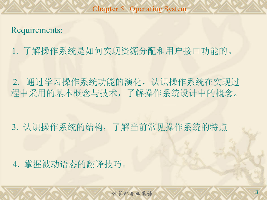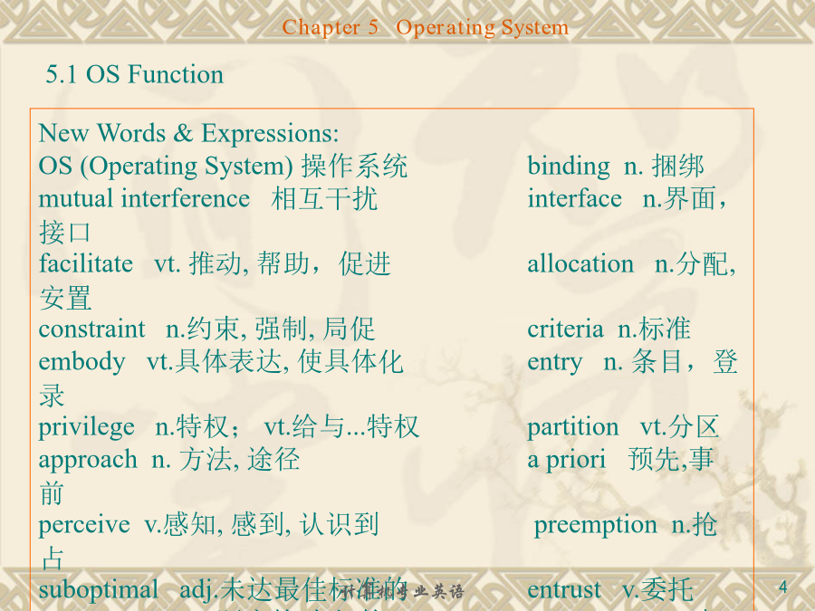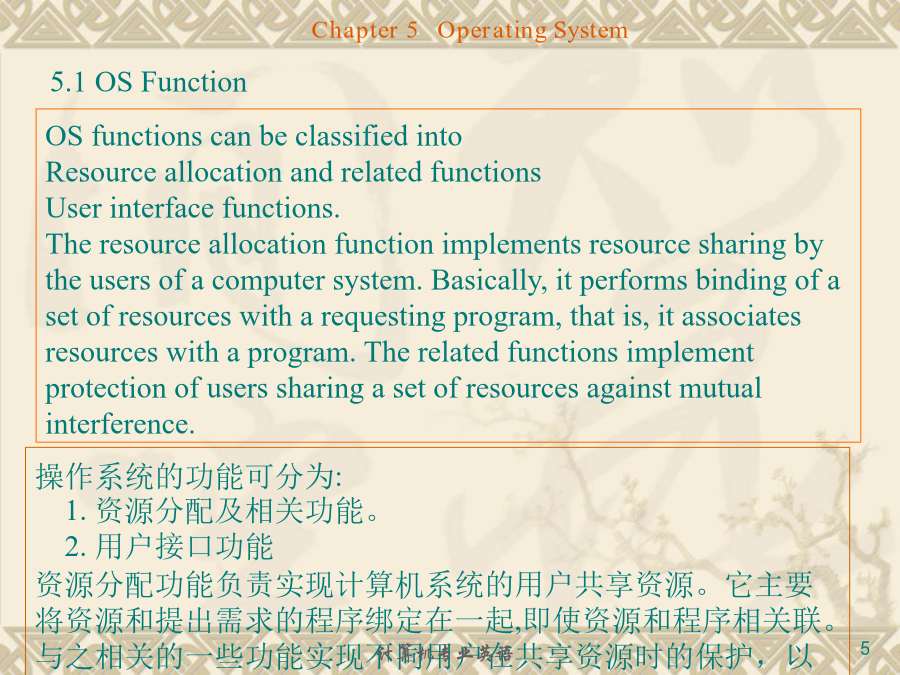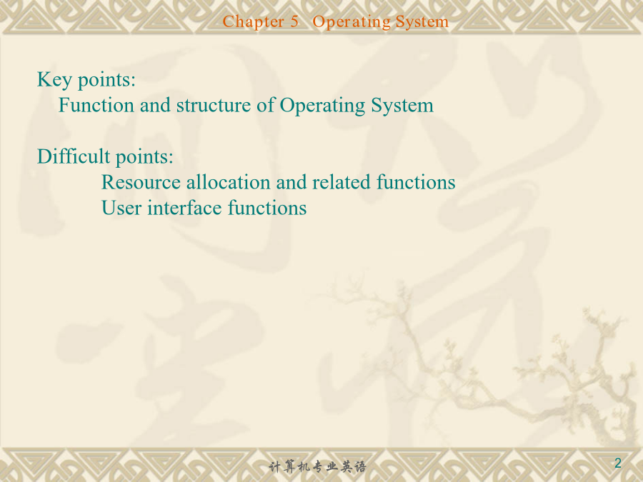 ComputerEnglishKeypoints:FunctionandstructureofOperatingSystemDifficultpoints: Resourceallocationandrelatedfunctions UserinterfacefunctionsRequirements:NewWords&Expressions: OS(OperatingSystem)操作系统 bindingn.捆绑 mutualinterference相互干扰 interfacen.界面,接口 facilitatevt.推动,帮助,促进 allocationn.分配,安置 constraintn.约束,强制,局促 criterian.标准 embodyvt.具体表达,使具体化 entryn.条目,登录 privilegen.特权;vt.给与...特权 partitionvt.分区 approachn.方法,途径 apriori预先,事前 perceivev.感知,感到,认识到 preemptionn.抢占 suboptimaladj.未达最佳标准的 entrustv.委托 sequentialadj.顺序的,串行的 exclusiveuse专用 concurrentadj.并发的,并行的 de-allocatevt.释放 schedulingn.调度 salientfeatures特征,特色 initiatevt.vi.开始,发动OSfunctionscanbeclassifiedinto Resourceallocationandrelatedfunctions Userinterfacefunctions. Theresourceallocationfunctionimplementsresourcesharingbytheusersofacomputersystem.Basically,itperformsbindingofasetofresourceswitharequestingprogram,thatis,itassociatesresourceswithaprogram.Therelatedfunctionsimplementprotectionofuserssharingasetofresourcesagainstmutualinterference.Theuserinterfacefunctionfacilitatescreationanduseofappropriatecomputationalstructuresbyauser.Thisfunctiontypicallyinvolvestheuseofacommandlanguageoramenu.Theresourceallocationfunctionallocatesresourcesforusebyauser'scomputation.ResourcescanbedividedintosystemprovidedresourceslikeCPUs,memoryareasandIOdevices,oruser-createdresourceslikefileswhichareentrustedtotheOS.Resourceallocationcriteriadependonwhetheraresourceisasystemresourceorauser-createdresource.Allocationofsystemresourcesisdrivenbyconsiderationsofefficiencyofresourceutilization.Allocationofuser-createdresourcesisbasedonasetofconstraintsspecifiedbyitscreatorandtypicallyembodiesthenotionofaccessprivileges.Twopopularstrategiesforresourceallocationare: Partitioningofresources AllocationfromapoolIntheresourcepartitioningapproach,theOSdecidesaprioriwhatresourcesshouldbeallocatedtoausercomputation.Thisapproachiscalledstaticallocationbecausetheallocationismadebeforetheexecutionofaprogramstarts.Staticresourceallocationi