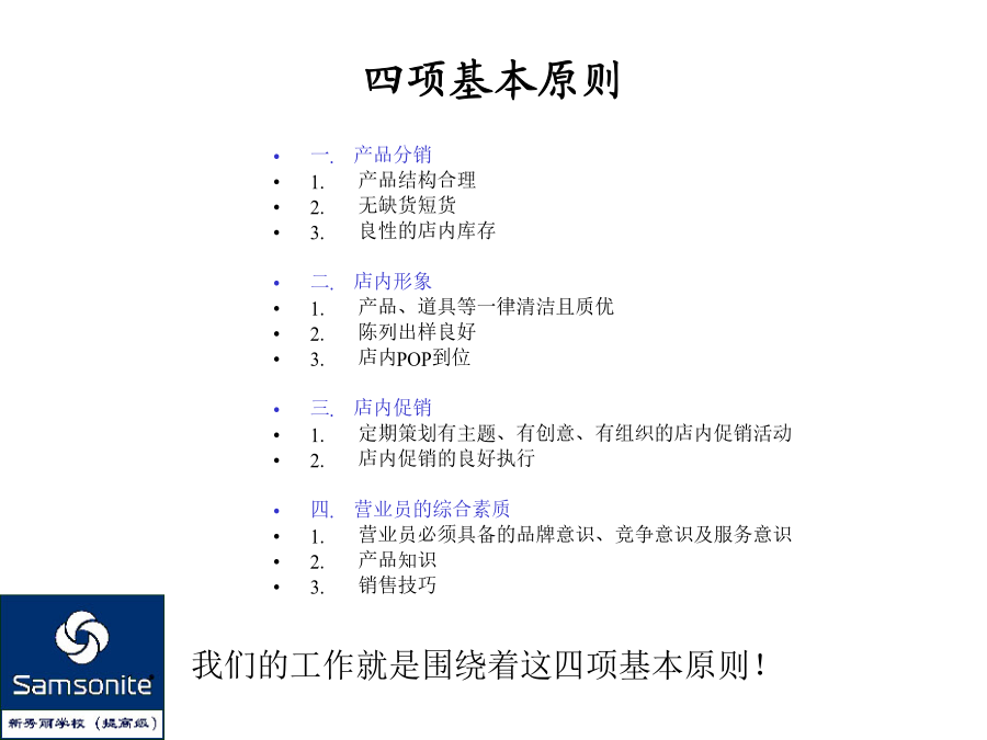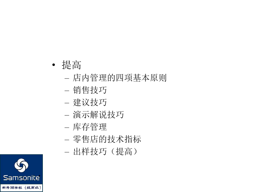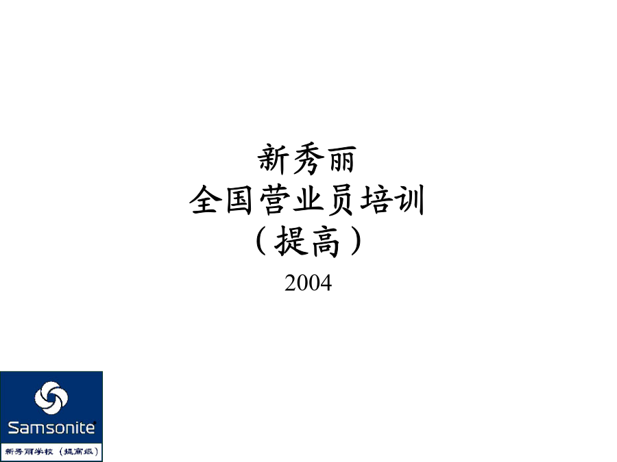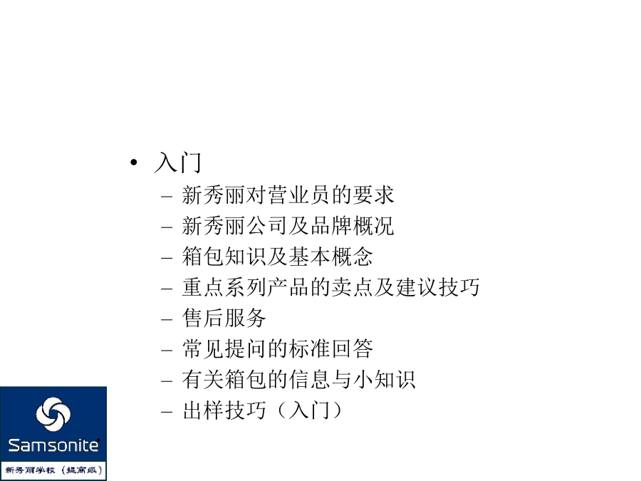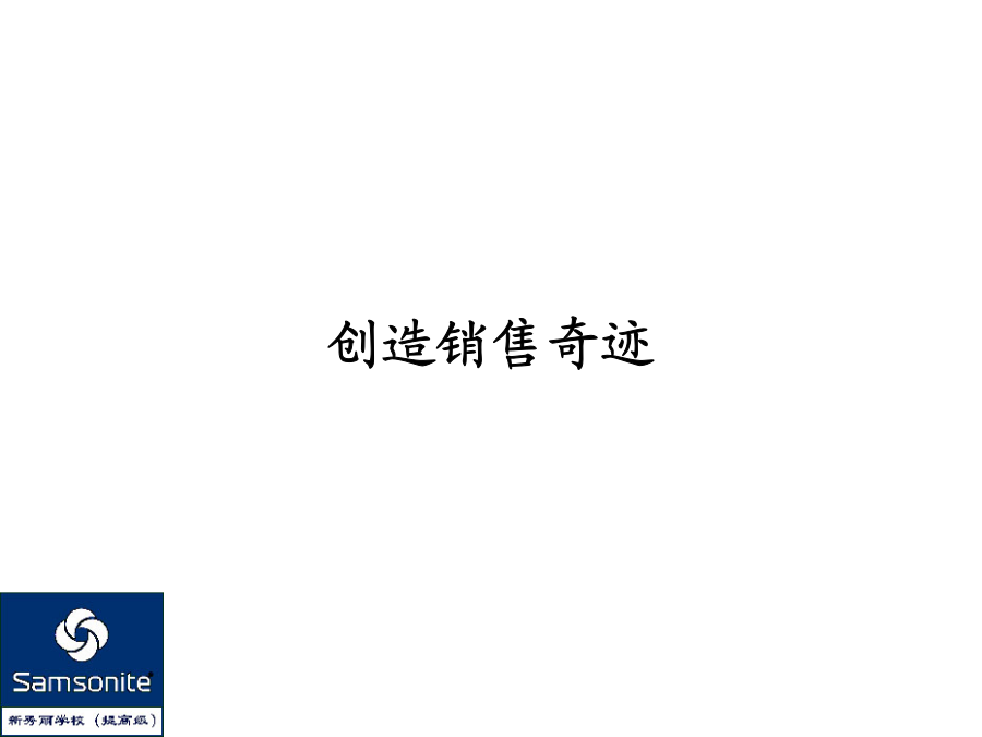 新秀丽全国营业员培训(提高)四项基本原则创造销售奇迹建立自信心,我们是箱包专家销售技巧:如何销售巧妙的开场白巧妙的开场白巧妙的开场白如何销售如何销售7个问题7个问题7个问题7个问题7个问题7个问题7个问题如何销售试图在沟通的过程中获得这些信息 客人旅行的形式:商务还是休闲? 旅行的时间:一天、一个月还是一年? 交通工具:汽车、飞机、火车还是船? 旅行的人数:一个人还是一家子? 旅行的频率 客人对硬箱和软箱的偏好程度 客人对拉杆箱和衣箱的偏好程度 客人以往是否购买过旅行箱,以及所碰到的问题 要带的行李:电脑、正装… 何时离开 ……如何销售3种类型的客人3种类型的客人3种类型的客人客人针对类型1客人的销售对策针对类型2客人的销售对策针对类型3客人的销售对策销售中最常见的问题为什么新秀丽卖这么贵?为什么新秀丽卖这么贵?为什么新秀丽卖这么贵?为什么新秀丽卖这么贵?为什么新秀丽卖这么贵?为什么不买个其它品牌的箱子,款式相同又便宜?这个硬箱太重了!如何建议硬箱: 更坚固 内置的衣物不易受挤压 降低偷盗的风险如何建议如何建议颜色如何建议颜色如何建议颜色如何建议颜色如何建议登机箱IATA登机箱规则: 如何建议登机箱如果客人需要出国,您将如何向他建议?如果客人需要经常出差,你将建议如何建议?使用电脑公文包的场合有 平时上下班使用,不需携带大量文件,只需放些名片、笔、手机、商务通等小型物品 上班使用,但经常需要携带大量文件 经常为客户做报告,可以装进投影仪或打印机 经常需要短途商务旅行的(一般一个晚上) 如何演示解说如何演示解说如何演示解说如何演示解说如何演示解说小件----不容忽视的销售角色扮演角色扮演角色扮演库存管理,提高销量的保证库存管理库存管理库存管理零售店指标三个原则艺术化出样黄金定律谢谢