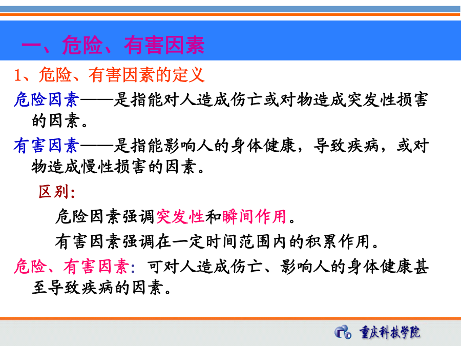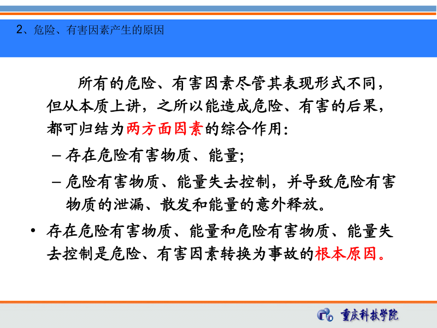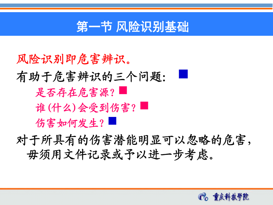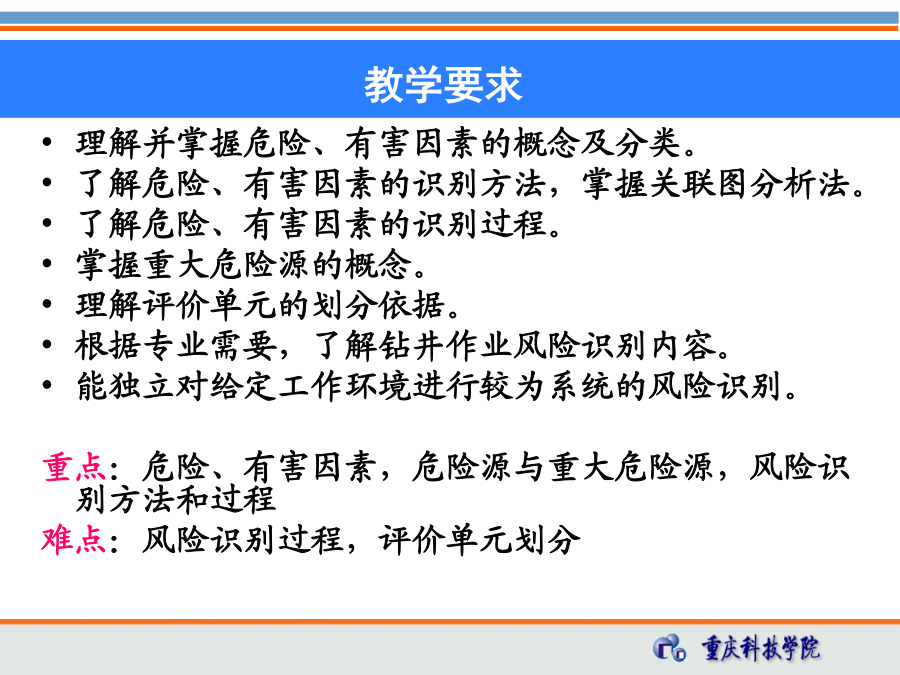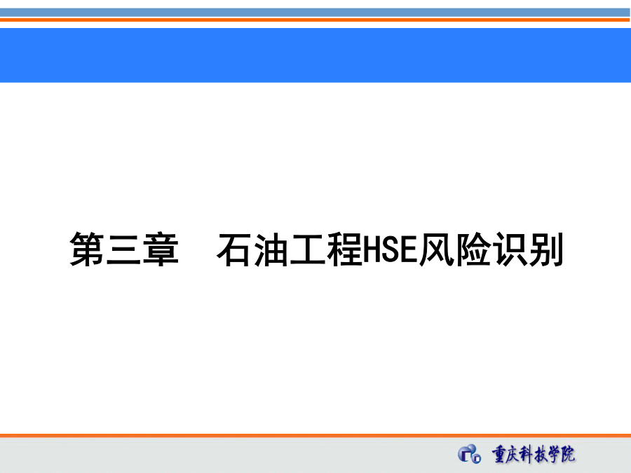 第三章石油工程HSE风险识别教学要求第一节风险识别基础1、危险、有害因素的定义 危险因素——是指能对人造成伤亡或对物造成突发性损害的因素。 有害因素——是指能影响人的身体健康,导致疾病,或对物造成慢性损害的因素。 区别: 危险因素强调突发性和瞬间作用。 有害因素强调在一定时间范围内的积累作用。 危险、有害因素:可对人造成伤亡、影响人的身体健康甚至导致疾病的因素。 所有的危险、有害因素尽管其表现形式不同,但从本质上讲,之所以能造成危险、有害的后果,都可归结为两方面因素的综合作用: 存在危险有害物质、能量; 危险有害物质、能量失去控制,并导致危险有害物质的泄漏、散发和能量的意外释放。 存在危险有害物质、能量和危险有害物质、能量失去控制是危险、有害因素转换为事故的根本原因。危险有害物质和能量失控主要体现在3个方面:人的不安全行为: 在GB6441-1986《企业职工伤亡事故分类》中,将人的不安全行为分为操作失误、造成安全装置失效、使用不安全设备等13大类.追摄贯胖旭座毅腺瓦日镇妻斋掩礼翱俱嘱舌缔乓月慨甭藤拎念铂它维淫尔第三章_石油工程HSE风险识别(储运)第三章_石油工程HSE风险识别(储运)邢试馈雾奎启砂哼自熔减码尉单疡凛固替搁钉雏仲临卒蕉膨晕脉榜溪毅仔第三章_石油工程HSE风险识别(储运)第三章_石油工程HSE风险识别(储运)物的不安全状态: 将物的不安全状态分为四大类: 防护、保险、信号等装置缺乏或有缺陷, 设备、设施、工具、附件有缺陷, 个人防护用品、用具缺少或有缺陷, 生产(施工)场地环境不良。 艳莎汪抓批扒执红惩屿览杏神皋浴馅菌逆捏瑞善翟修段厅蹦裁叛雪捏士涤第三章_石油工程HSE风险识别(储运)第三章_石油工程HSE风险识别(储运)虫摈诵垣舀擦泰贩等厩轿掘踩掷堵韦赣铝邓抒拒褥矗昔蝇戊磨勤堪腋浦招第三章_石油工程HSE风险识别(储运)第三章_石油工程HSE风险识别(储运)安全管理缺陷: 安全管理的缺陷可参考以下分类: (1)对物(含作业环境)性能控制的缺陷,如设计、监测和不符合处置方面的缺陷。 (2)对人失误控制的缺陷,如教育、培训、指示、雇用选择、行为监测方面的缺陷。 (3)工艺过程、作业程序的缺陷,如工艺、技术错误或不当,无作业程序或作业程序有错误。 对危险、有害因素进行分类,是为了便于对危险、有害因素进行分析与识别。 危险、有害因素分类的方法有多种,下面将简要介绍危险、有害因素的分类方法。1)按可能导致生产过程中危险和有害因素的性质分 (GB/T13816-2009《生产过程危险和有害因素分类与代码》)人的因素物的因素环境因素地下(含水下)作业环境不良(9项) 隧道/矿井顶面缺陷 隧道/矿井正面或侧璧缺陷 隧道/矿井地面缺陷 地下作业面空气不良 地下火 冲击地压 地下水 水下作业供氧不当 其他地下作业环境不良管理因素2)参照《企业职工伤亡事故分类》进行分类(3)机械伤害 指机械设备运动(静止)部件、工具、加工件直接与人体接触引起的夹击、碰撞、剪切、卷人、绞、碾、割、刺等伤害,不包括车辆、起重机械引起的机械伤害。 (4)起重伤害 指各种起重作业(包括起重机安装、检修、试验)中发生的挤压、坠落(吊具、吊重)物体打击和触电。 (5)触电 包括雷击伤亡事故。 (6)淹溺 包括高处坠落淹溺,不包括矿山、井下透水淹溺。(10)坍塌 指物体在外力或重力作用下,超过自身的强度极限或因结构稳定性破坏而造成的事故,如挖沟时的土石塌方、脚手架坍塌、堆置物倒塌等, 不适用于矿山冒顶片帮和车辆、起重机械、爆破引起的坍塌。 (11)冒顶片帮 (12)透水 (13)放炮-指爆破作业中发生的伤亡事故。 (14)火药爆炸 指火药、炸药及其制品在生产、加工、运输、贮存中发生的爆炸事故。(15)瓦斯爆炸 (16)锅炉爆炸 (17)容器爆炸 (18)其他爆炸 (19)中毒和窒息 (20)其他伤害3)按职业健康分类4)按环境影响因素分类4、危险源的分类常见的第一类危险源第二类危险源包括的内容1、危害辨识的方法系统安全分析方法:应用系统安全评价方法进行危险、有害因素辨识。该方法常用于复杂系统和没有事故经验的新开发系统。 事件树(ETA) 事故树(FTA) ……HSE关键任务 起钻时抽吸起钻时抽吸屏障设置树状图危险、有害因素的识别就是找出可能引发事故导致不良后果的材料、系统、生产过程或工程的特征,并辨识可能发生的事故后果。 危险、有害因素的识别实际上就是系统安全分析的过程。(1)厂址:从厂址的地质、地形、自然灾害、周围环境、气象条件、交通、抢险救灾支持条件等方面进行分析。 (2)厂区平面布局: ①总图:功能分区(生产、管理、辅助生产、生活区)布置;高温、有害物质、噪声、辐射、易燃易爆危险品设置布置;建筑物、构筑物布置;风向、安全距离、卫生防护距离等。 ②运
