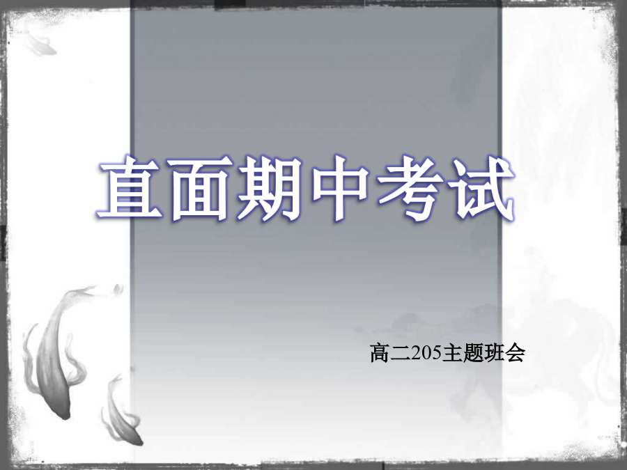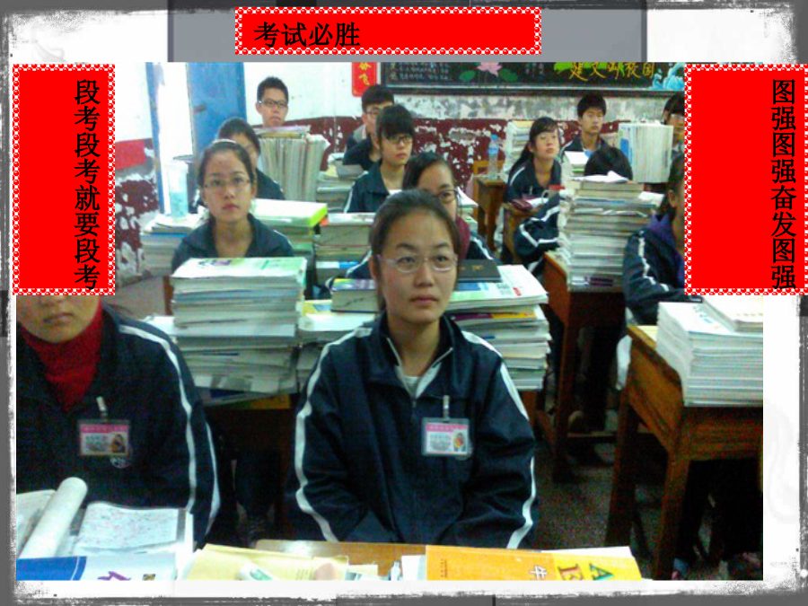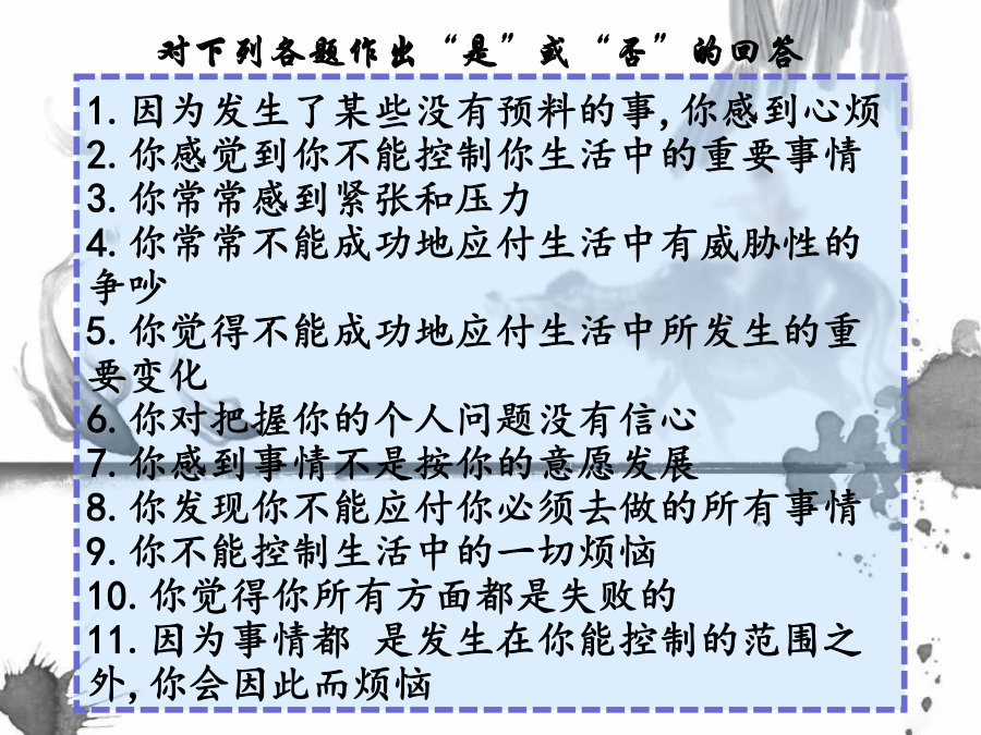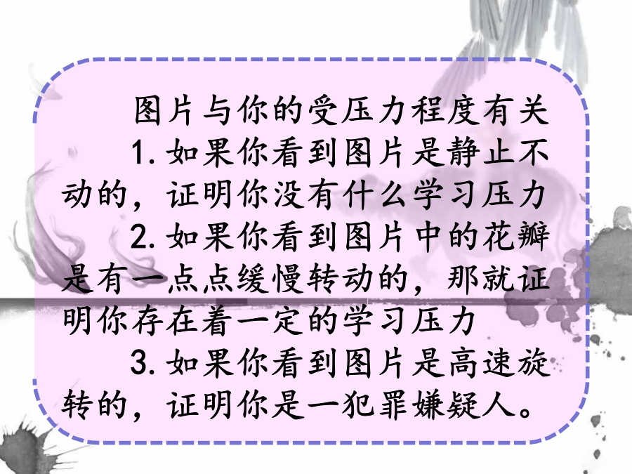 高二205主题班会图片与你的受压力程度有关 1.如果你看到图片是静止不动的,证明你没有什么学习压力 2.如果你看到图片中的花瓣是有一点点缓慢转动的,那就证明你存在着一定的学习压力 3.如果你看到图片是高速旋转的,证明你是一犯罪嫌疑人。13.你发现你自己常在考虑自己必须完成的那些事情 14.你不能控制消磨时间的方式 15.你感觉积累的大量困难不能克服 16.朋友同学的生日,免不了花钱,你往往不想在这类场合出现以免花钱 17.若你刚买了一天的鞋穿了一天就裂口了,你会气愤.痛苦的抱怨 18.你由于某种小事跟好朋友生气,大家互不相让,结果你会一个人生闷气,想忘掉这件事,可就是忘不掉 19.当父母因为学习责备你而是你感到压力很大时,你不会和他们争吵,一个人压抑情感 20.你的一个非常要好的朋友,因某些原因退学了,你很难过,不想面对现实从心理学的角度看,人在遇到比较重要的问题时,会不由自主的产生焦虑,这是人的一种本能反应。 心理学家研究表明:适度的焦虑会产生一种动力,促使自己更好的去完成任务,提高工作成绩。 某班有一位学生,该生平时的上课表现很不错,听讲认真,思考积极,且思维宽广活跃,对某些问题能提出自己独到的见解,经常受到教师的表扬;作业完成的质量很高,字迹端正,正确率高;同学遇到难题也喜欢向他请教,他总是竭尽所能的帮助那些有困难的同学,借此达到共同进步。奇怪的是一到期中、期末的重要考试,他平常那股沉着、敏捷劲儿便无影无踪了,平时很容易解决的问题,这时却怎么也解不出来,或者答的漏洞百出,甚至犯起平常极少出现的计算马虎、看错题等毛病。面对这种情况,他心急如焚,拼命的想在学习方法上找出原因、在身体状况上找出原因,但都无济于事。为此,他陷于了极度的苦恼之中,学习成绩更是每况愈下,原来那个活泼开朗、聪明可爱的学生不见了。正如该生自己述说:“我很苦恼。为了学习问题,我每天冥思苦想。我不知道自己是否得了‘考试焦虑症’?因为尽管在考前我再三告诫自己,不要慌,但一到考场却总是如临大敌,心神不定。” 考试焦虑是考生中常见的一种以担心、紧张或忧虑为特点的复杂而延续的情绪状态。当考生意识到考试对自己具有某种潜在威胁时,就会产生焦虑的心理体验。焦虑的种类担心考糟了,别人对自己会怎么评价?被他人看不起。有什么缓解考试 焦虑的有效方法?相信你们自己, 永远都是最棒的!语文:多读、多记、多看、多做,使用词典;梳理知识点;提高课外阅读量,增加写作素材 数学:多看、多练,尽量完成课本的每道习题,从理解到实践;总结归类,寻找共同点 英语:多听、多读,增强语感;多写,多练,阅读大量英语书报,加强写作;使用字典;敢说政治:多看,多做题,理清思路;联想知识点,连线记忆,组织语言回答 历史:多看,把课本当成故事看,提高兴趣;原因和事件联想记忆不易忘;多做题并总结 地理:多读多看,理解式记忆;多练,巩固知识点,举一反三;多总结,理清知识点联系诚信为先纪律与规范