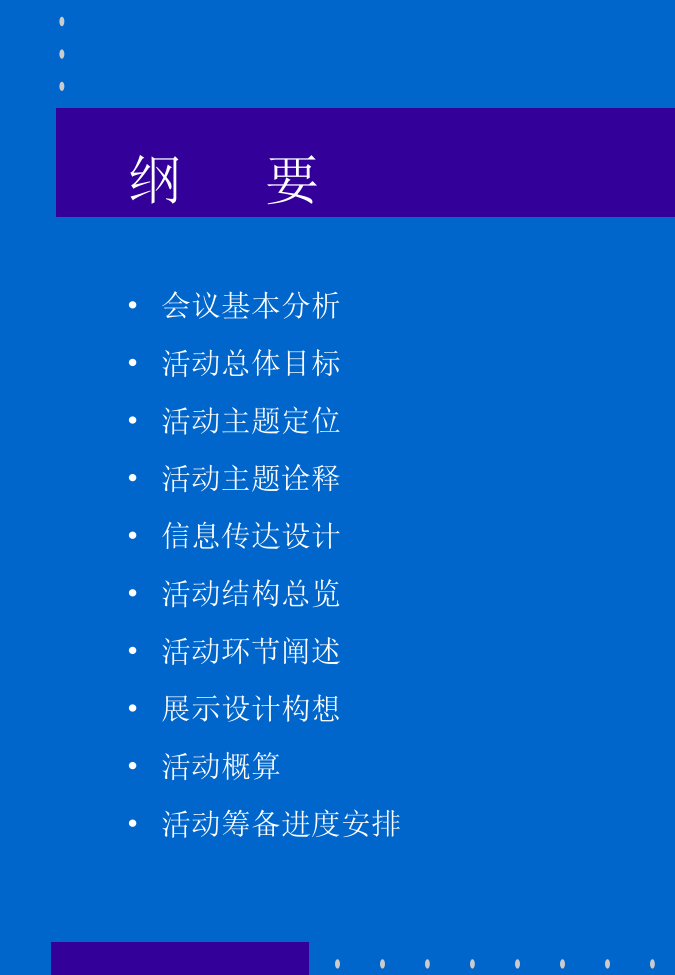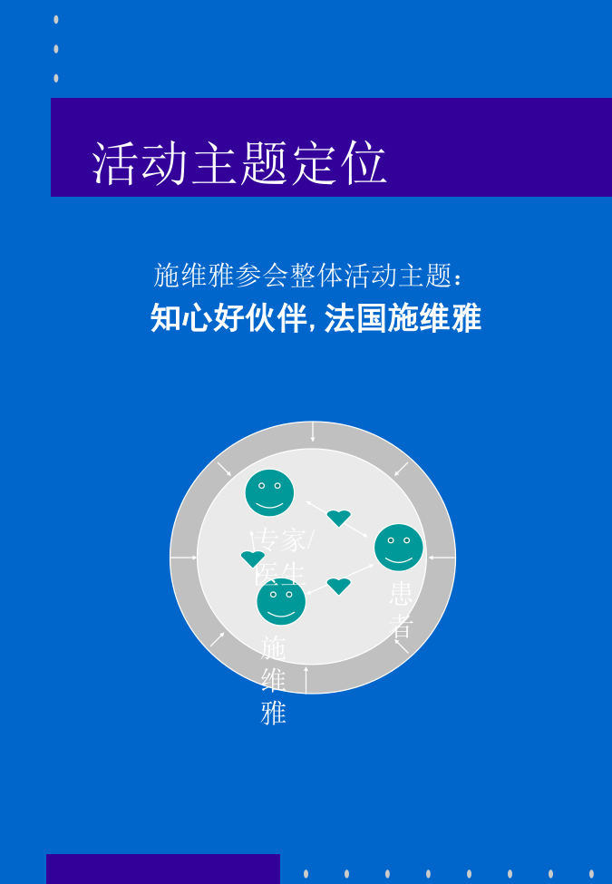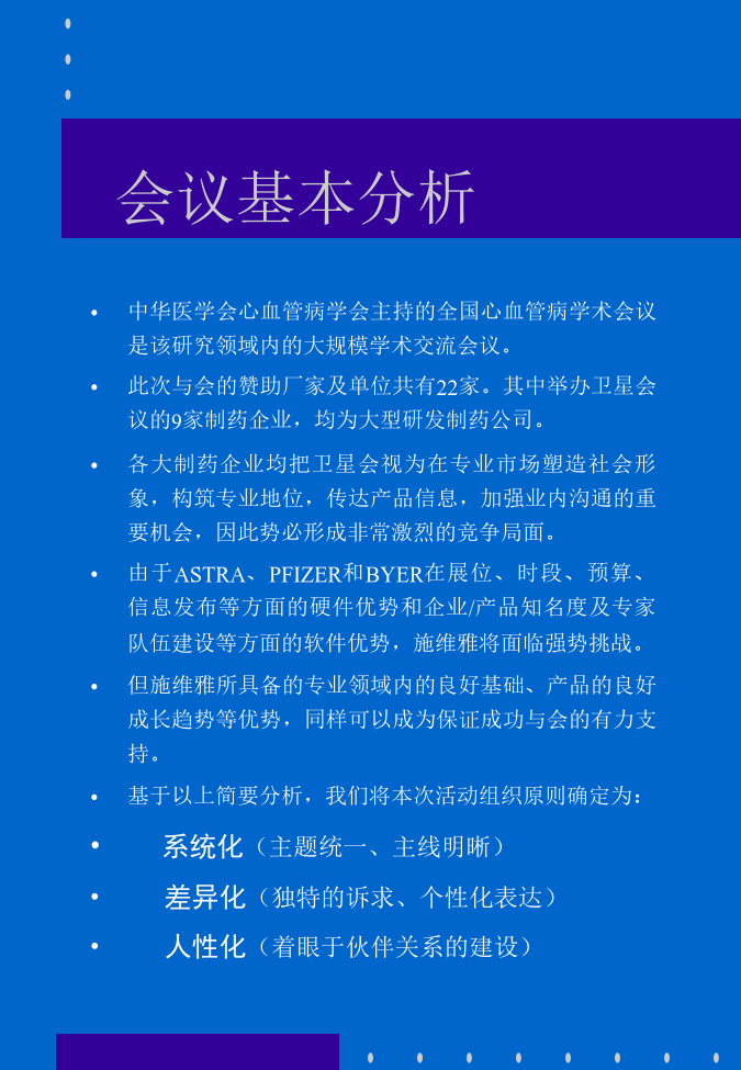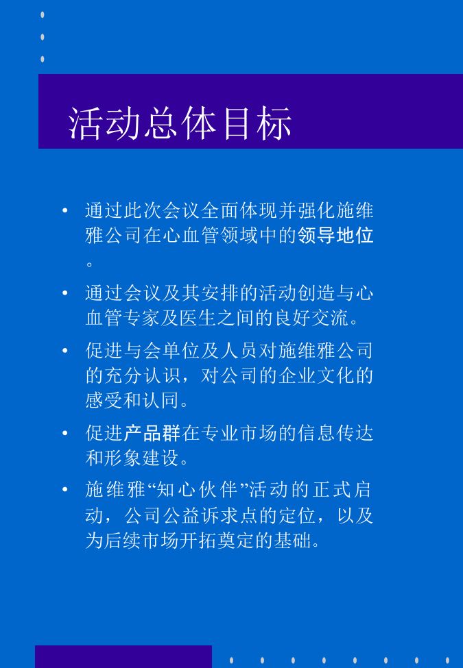 第六届全国心血管病学术会议施维雅公司参会活动计划书纲要会议基本分析活动总体目标活动主题定位活动主题诠释活动整体风格企业核心信息: 世界上最具创新力的医药公司 世界领先的药品研发中心 医药界同仁的知心伙伴, 共同致力于为患者提供优质专业服务 传达方式及渠道: 现场展示 印刷品 饰品 游戏活动 公关活动 核心信息传达设计•产品环节阐述•入住问候环节阐述•现场展示时间:11月26日11:15--12:15AM 知心行动三 万爽力卫星会 —施维雅公司声像资料播放(会前) —会场现场展示 —学术报告及大会交流 —产品知识有奖问答 时间:11月26日12:15--12:25AM 知心行动四 赴午宴途中 *施维雅知心小姐 环节阐述•午餐会环节阐述•告别问候展示设计构想活动概算活动筹备进度安排