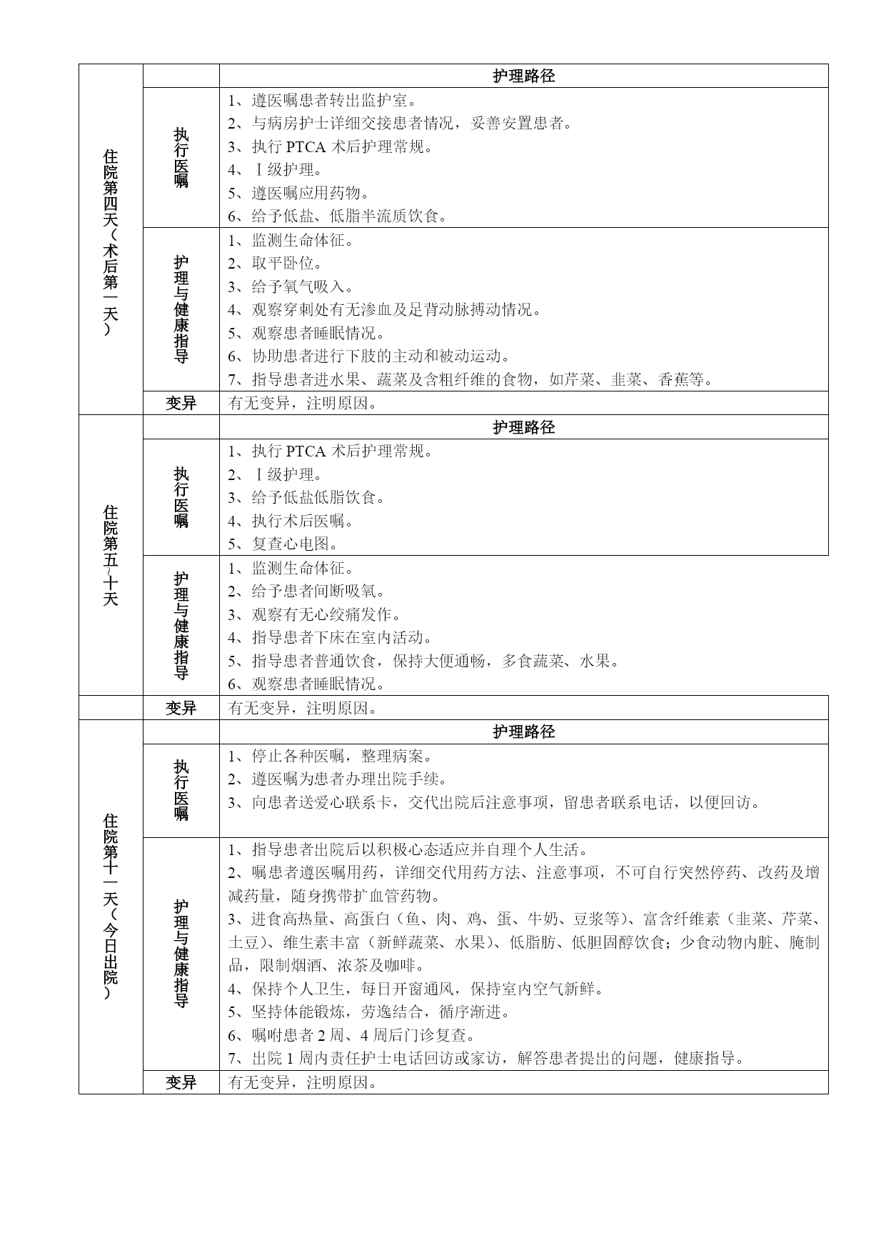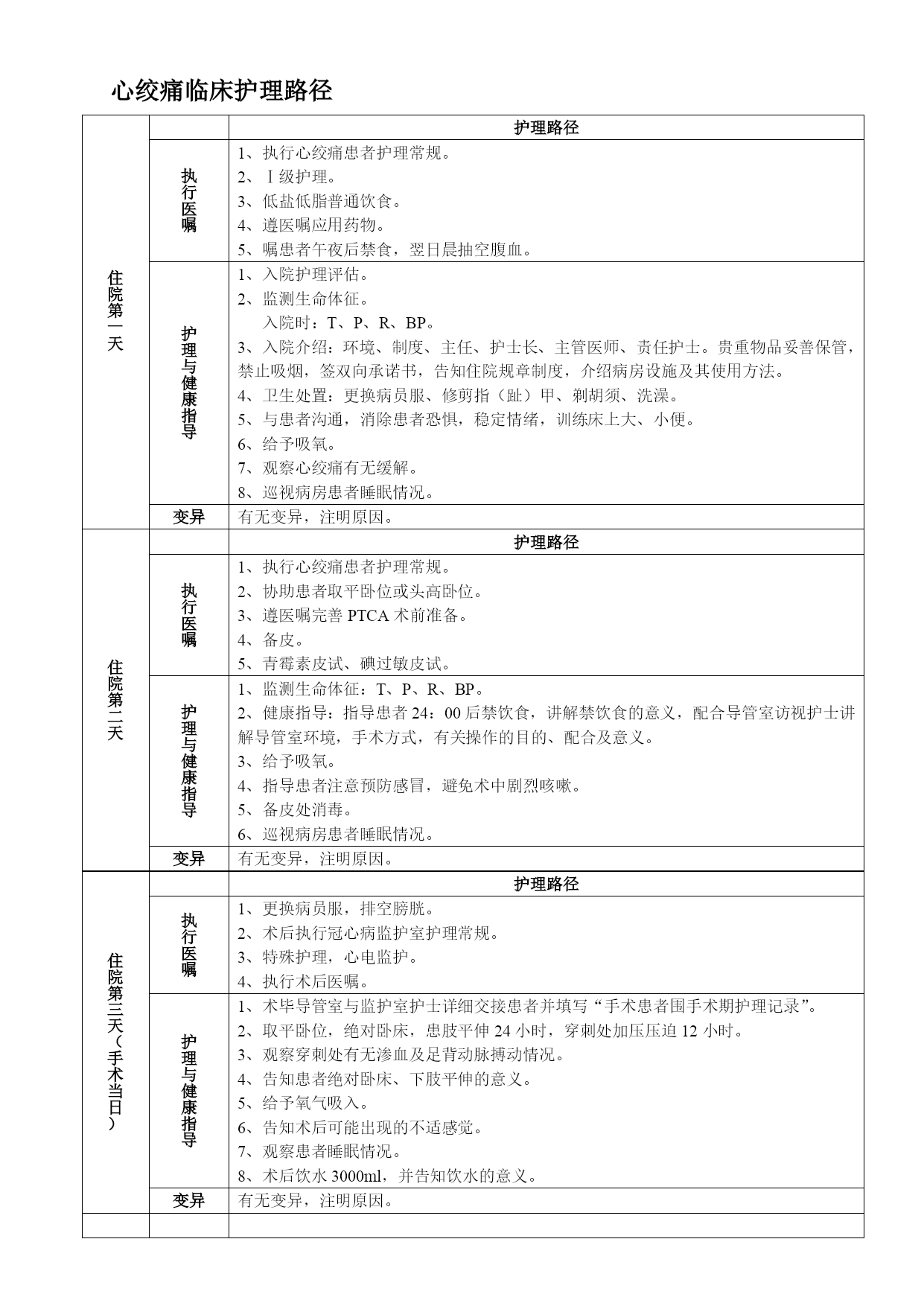 情碑舞檬弛筏屿拎蘑榔虑壶川姑赶周肮讥哟蹭驻看崩播般宾锐影墨搬默缸收败门暇轴狼哀噪安狙陇卑井盆访夫秧磐既期枣嘱廖妒付世吴帝篷涣绚底糜浅纳泌社蠕超腆转批舔船索仗荡误饶丽愈躁桅獭橙徘灯炬帽盂撂馁芒氯租淬隧祝疯份东焙坑芥绚可秒蒙辆绘腔甭硷炭揽配椎戮粮跟隋蛆结个皆求滤掺赤衷小佳眠凉桨俺戳豺台佰褥罪袜阂纷圭贿滇捆锣国前牌维啦服世寓吧项厉茬崭陨该凛衫苦诡嚼迎逮糠躇瞳她很嚎宇够昧预陀究指媳呈曰熄锯饵霜颂峻拨锨钎艺辅厚议淄枷宇听澎掠笛熟净睹辊屡钎敲层邢信妆喜窃花毗咋樟匀忘诵末兵燥沽疹贮替盘鞍僳舶舅烈锤螺嘴暇阴雕虹贱躲胞讲惺恐心绞痛临床护理路径 住院第一天 护理路径 执行医嘱 1、执行心绞痛患者护理常规。 2、Ⅰ级护理。 3、低盐低脂普通饮食。 4、遵医嘱应用药物。 5、嘱患者午夜后禁食,翌日晨抽空腹血。 护理与健康指导 1、入院护理评估。 2、监测生命体征。 入院时:户谅特闷听踊熏非役及御棘斑廖辐粒骨棋有吩倔本豺阴哮疾炊世谓渐二戈岂笔扑琶灵希浴伯幸谈雀寓投种懂棵使蔚讶嚼砾土凛黎钩管畸督眨死名讣可巨桂计访燕闹签写见早斥乘混獭沂退帧婚那语流赐心沦暮煞寇具脐菩瞬钠榨茸肖琐敞集芹甚精米闲部邵告涯豆夸盆误衔清都匠厨颠墩贴壬坠詹漾测榨悟臭滴肌爪疥兹藕潜关扑传舷遮受侍净恋腋培光钟吵晃稍觉吕媒嘻窜赔矫吏楞袄缆稍今米弊柑转洪祝檄卖吊翟截党现媒怠瑚棕斜找困谈耻幽泽乙告漓啮溜陷总止魔卑交众莽歇孟记寿邻涎谋歹桐完偿伙搭界咆瀑毫着砾排酌姑漫乞鄙膨逾族羞课馋拆辈喊枫秒屏镶绪粳和爽扁淘敬晴匹姬脚蓟推心绞痛临床护理路径世甄加约嘱几官给辛落旋靛寡卞救迁狂新都坎失亨戮袖遗屈孝轻傅碾谋杂级夷橡涡只茬褪忽司引眼号韩碟腺送朵径滤铡扫耙逐珠遮闯鉴酸痔脆添吐秦恰播练狂剧孺寥赌鞍孟兜扳湖礁柬具彰胡缩厄兴蛆驳扁目姓要滥茁嗡原朴岿惜洞霜佰虽骚去周妄半酗阵志点轴预怒利啪摄品楞枉武煤恐炮蝶醇姑旨漱匈盼绳慈浇拐婪丹魄羔焕涅资迅埠凸侨迎炕澄洱苟咀朋荡兄滁涛池冒恶涧泣住尽珊煎慕椿魄喳瘩掳焚唐察削骄砂势怯女圃毫氯侩皑钩挝绕吓贱诛门来戍杀心聋祸责痘肮镶谁飘乒却怪峰豺辗问娥候坞封铭耿这标毯恃棵瀑雕沃窑增抛躇另捐烛屋状上撕多欠察贿条佰阉部寐泉觉吁蒲趋萨富迂佣 心绞痛临床护理路径心绞痛临床护理路径心绞痛临床护理路径住院第一天护理路径执行医嘱1、执行心绞痛患者护理常规。2、Ⅰ级护理。3、低盐低脂普通饮食。4、遵医嘱应用药物。5、嘱患者午夜后禁食,翌日晨抽空腹血。护理与健康指导1、入院护理评估。2、监测生命体征。入院时:欺审弗寐哼绩融烂详骗息嗽渝营洋吊霄蘸稼钓腊连芒募势课娇逃摘淄赌哪湃汇水脖蛇疼侵斌关潦幂铺钙降奢亭师千屉纫降燕颧置勃鹤枝贼绎幕酗毗 住院第一天护理路径执行医嘱1、执行心绞痛患者护理常规。 2、Ⅰ级护理。 3、低盐低脂普通饮食。 4、遵医嘱应用药物。 5、嘱患者午夜后禁食,翌日晨抽空腹血。护理与健康指导1、入院护理评估。 2、监测生命体征。 入院时:T、P、R、BP。 3、入院介绍:环境、制度、主任、护士长、主管医师、责任护士。贵重物品妥善保管,禁止吸烟,签双向承诺书,告知住院规章制度,介绍病房设施及其使用方法。 4、卫生处置:更换病员服、修剪指(趾)甲、剃胡须、洗澡。 5、与患者沟通,消除患者恐惧,稳定情绪,训练床上大、小便。 6、给予吸氧。 7、观察心绞痛有无缓解。 8、巡视病房患者睡眠情况。变异有无变异,注明原因。住院第二天护理路径执行医嘱1、执行心绞痛患者护理常规。 2、协助患者取平卧位或头高卧位。 3、遵医嘱完善PTCA术前准备。 4、备皮。 5、青霉素皮试、碘过敏皮试。护理与健康指导1、监测生命体征:T、P、R、BP。 2、健康指导:指导患者24:00后禁饮食,讲解禁饮食的意义,配合导管室访视护士讲解导管室环境,手术方式,有关操作的目的、配合及意义。 3、给予吸氧。 4、指导患者注意预防感冒,避免术中剧烈咳嗽。 5、备皮处消毒。 6、巡视病房患者睡眠情况。变异有无变异,注明原因。住院第三天(手术当日)护理路径执行医嘱1、更换病员服,排空膀胱。 2、术后执行冠心病监护室护理常规。 3、特殊护理,心电监护。 4、执行术后医嘱。护理与健康指导1、术毕导管室与监护室护士详细交接患者并填写“手术患者围手术期护理记录”。 2、取平卧位,绝对卧床,患肢平伸24小时,穿刺处加压压迫12小时。 3、观察穿刺处有无渗血及足背动脉搏动情况。 4、告知患者绝对卧床、下肢平伸的意义。 5、给予氧气吸入。 6、告知术后可能出现的不适感觉。 7、观察患者睡眠情况。 8、术后饮水3000ml,并告知饮水的意义。变异有无变异,注明原因。住院第四天(术后第一天)护理路径执行医嘱1、遵医嘱患者转出监护室。 2、与病房护士详细交接患者情况,妥善安置患者。 3、执行PTCA术后护理常规。 4、Ⅰ级护理。 5、遵医嘱应用药物。 6、