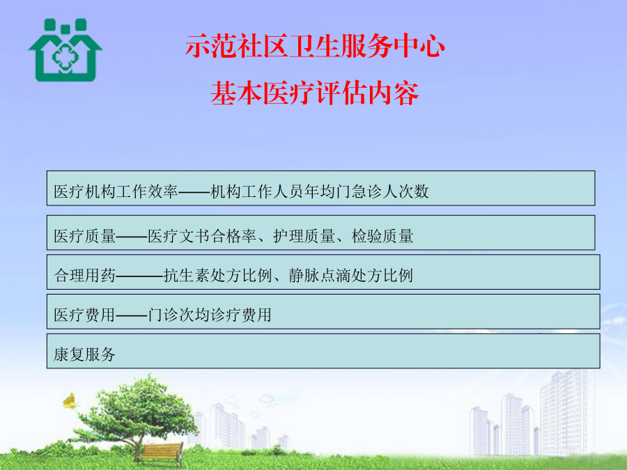 示范社区卫生服务中心基本医疗考核评估指标基本医疗服务社区卫生服务中心基本医疗服务内容示范社区卫生服务中心基本医疗评估内容示范中心基本医疗服务评分分值一、医疗工作效率医疗机构工作效率 医疗机构工作效率得分标准二、医疗质量(一)医疗文书合格率(医疗质量)3、指标解释参考文件4、数据获取办法医疗文书合格率评分标准合格病历合格病历合格病历合格病历合格病历合格病历合格病历合格病历合格病历2007年版《处方管理办法》合格处方合格处方合格处方合格处方合格处方2010年版《病历书写规范》门诊日志和检验检查申请单标准门诊日志与检验申请单(二)、护理质量(医疗质量)护理质量指标解释 3、指标解释 4、数据获取办法:现场查看。 护理质量评分标准(三)、检验质量(医疗质量) 3、 4、数据获取办法:现场查看检验试剂和质控台帐等材料。 检验质量评分标准(四)、院内感染(医疗质量)院内感染院内感染质量3、指标解释佰茁诅司皖郡脏眨鄙却苹浚钨校孕睛纱攫拱宗睛贴畏福奴氏崔戒国饶宗蓝示范社区卫生服务中心指标说明--基本医疗示范社区卫生服务中心指标说明--基本医疗消毒隔离措施消毒隔离措施消毒隔离措施传染病防治方法吕棱吉畜曼蜒扑貉筷秒羊拯逸群刨输上氯研淌缄悲酗堕霜壮盾抠可燕靡捡示范社区卫生服务中心指标说明--基本医疗示范社区卫生服务中心指标说明--基本医疗院内感染评分标准基本医疗服务—合理用药(一)抗生素处方比例3、指标解释: 抗生素处方比例=含有抗生素处方数/抽查处方总数×100% 4、数据获取办法:抗生素处方比例评分标准静脉点滴处方比例3、指标解释: 静脉点滴处方比例=含有静脉点滴处方数/抽查处方总数×100% 4、数据获取办法: 静脉点滴处方比例评分标准基本医疗考核指标—医疗费用 3、指标解释 4、数据获取办法:现场查阅卫生局相关统计材料。医疗费用评分标准基本医疗考核指标—康复服务康复服务3、指标解释有专用场所及相关设备设施鼓拳皂猖谱弃责碟凛省隔某诬芳蓬禹蛹劫淀猿供河着纲蝎顾痈伊胰炕乳洛示范社区卫生服务中心指标说明--基本医疗示范社区卫生服务中心指标说明--基本医疗康复开展记录情况然懊赶锻渠题优嫌窄航囊犬签嫉鸯某诽椰滨雀轮停秃债腔甸痒阀蓑潍氟砷示范社区卫生服务中心指标说明--基本医疗示范社区卫生服务中心指标说明--基本医疗康复开展情况康复服务考核方法及指标满意度考核指标解释满意度 一、服务对象综合满意度服务对象综合满意度调查参考问卷 一方便性 1、您觉得到这里看病方便吗 很方便(2)方便(3)一般(4)不方便(5)很不方便 2、您对这里看病的过程、等候排队的时间满意吗 非常满意(2)满意(3)一般(4)不满意(5)很不满意 二、舒适性 1、您对这里的环境满意吗 (1)非常满意(2)满意(3)一般(4)不满意(5)很不满意 2、您对医务人员的服务态度满意吗 (1)非常满意(2)满意(3)一般(4)不满意(5)很不满意 3、您对这里的设备设施满意吗 (1)非常满意(2)满意(3)一般(4)不满意(5)很不满意 4、您对医务人员的解释、交流、服务内容满意吗 (1)非常满意(2)满意(3)一般(4)不满意(5)很不满意 三、经济性 1、您对这里的价格满意吗 (1)非常满意(2)满意(3)一般(4)不满意(5)很不满意 2、您对在这里看病的花费满意吗 (1)非常满意(2)满意(3)一般(4)不满意(5)很不满意 四、安全性 1、您对这里的技术水平满意吗 (1)非常满意(2)满意(3)一般(4)不满意(5)很不满意 2、您觉得这里看病安全吗? (1)很安全(2)安全(3)一般(4)不安全(5)很不安全 五、有效性 这里的服务是否能解决您的健康问题、您对这里的服务效果满意吗 (1)非常满意(2)满意(3)一般(4)不满意(5)很不满意 调查员签-------调查时间2011年---月----日二、卫生技术人员综合满意度二、卫生技术人员满意度卫生技术综合满意度调查参考问卷 1、您对您所在中心的工作环境满意吗 (1)非常满意(2)满意(3)一般(4)不满意(5)很不满意 2、您对您所在中心的内部管理满意吗 (1)非常满意(2)满意(3)一般(4)不满意(5)很不满意 3、您对您所在中心给您的培训机会满意吗 (1)非常满意(2)满意(3)一般(4)不满意(5)很不满意 4、您对您中心的工资待遇满意吗 (1)非常满意(2)满意(3)一般(4)不满意(5)很不满意 5、您对您的职称评定满意吗 (1)非常满意(2)满意(3)一般(4)不满意(5)很不满意 6、您对您在中心的发展前景满意吗 (1)非常满意(2)满意(3)一般(4)不满意(5)很不满意 调查员签名--------调查时间2011年---月---日 满意度