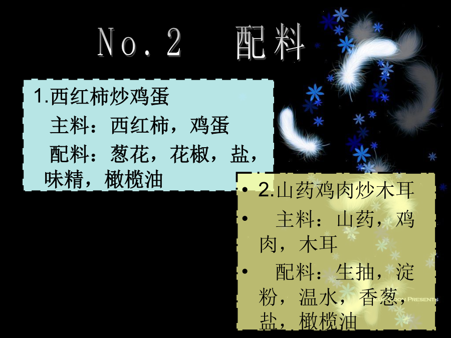 No.2配料2。三两山药削皮切片备用。(山药削完皮好滑,第一次拿刀切东西,好怕切到手!) 3。少许香葱切成丁状备用(为什么要切这么小) 4。三钱木耳用温水泡半个小时洗干净备用(山药鸡肉炒木耳)