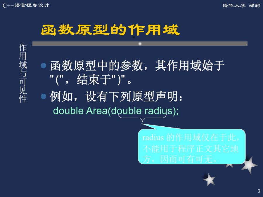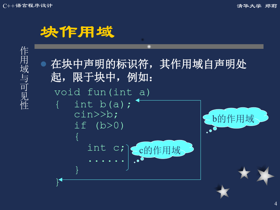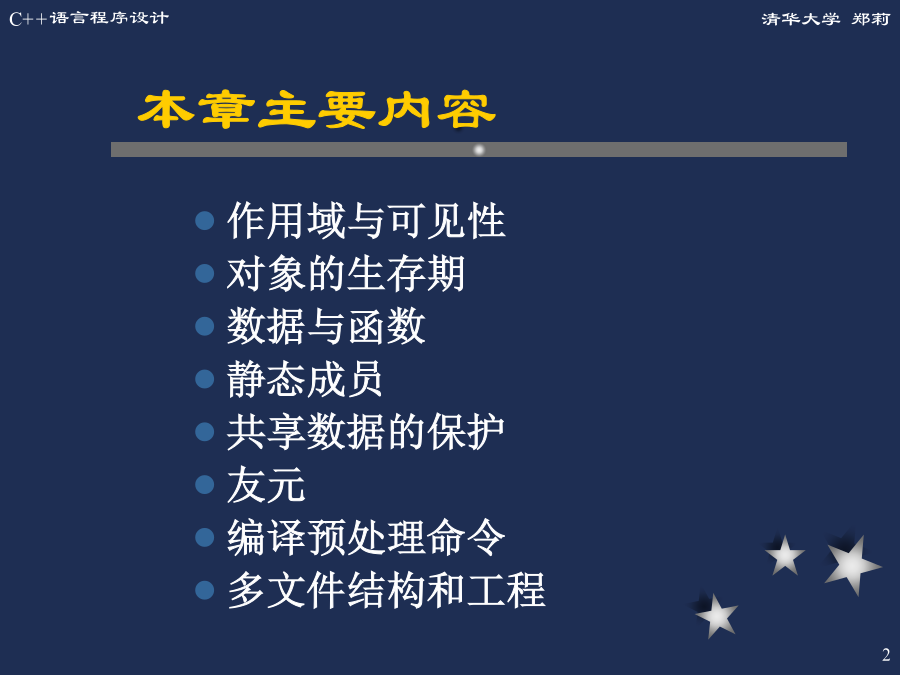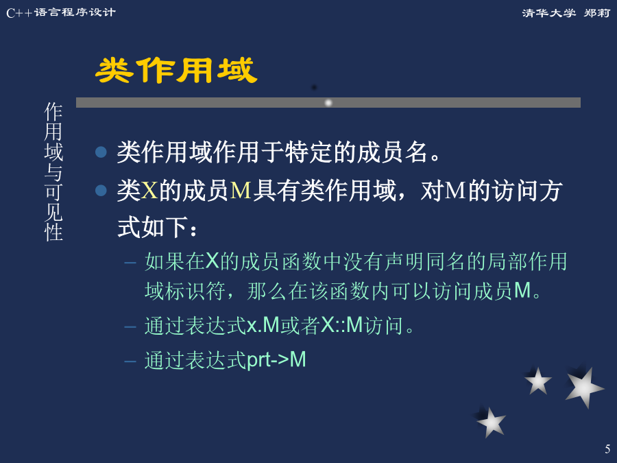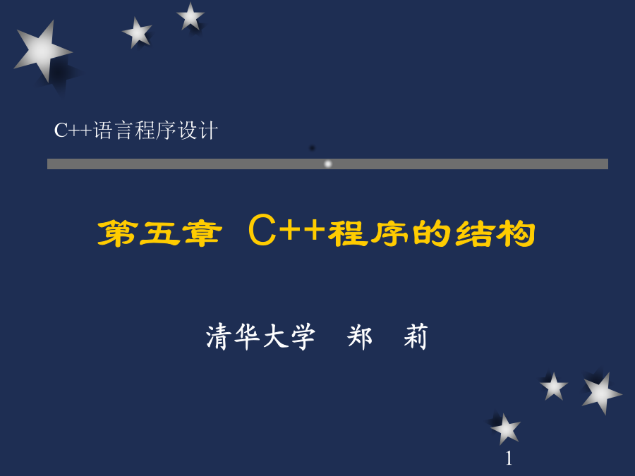 第五章C++程序的结构本章主要内容函数原型的作用域块作用域类作用域文件作用域可见性可见性同一作用域中的同名标识符#include<iostream> usingnamespacestd; inti;//文件作用域 intmain() {i=5; {inti;//块作用域 i=7; cout<<"i="<<i<<endl;//输出7 } cout<<"i="<<i;//输出5 return0; }对象的生存期静态生存期#include<iostream> usingnamespacestd; inti=5;//文件作用域 intmain() { cout<<"i="<<i<<endl; return0; } i具有静态生存期动态生存期#include<iostream> usingnamespacestd; voidfun(); intmain() {fun(); fun(); } voidfun() {staticinta=1; inti=5; a++; i++; cout<<"i="<<i<<",a="<<a<<endl; }例5-2变量的生存期与可见性voidother(void) { staticinta=2; staticintb; //a,b为静态局部变量,具有全局寿命,局部可见。 //只第一次进入函数时被初始化。 intc=10;//C为局部变量,具有动态生存期, //每次进入函数时都初始化。 a=a+2;i=i+32;c=c+5; cout<<"---OTHER---\n"; cout<<"i:"<<i<<"a:"<<a<<"b:"<<b<<"c:"<<c<<endl; b=a; }运行结果: ---MAIN--- i:1a:0b:-10c:0 ---OTHER--- i:33a:4b:0c:15 ---MAIN--- i:33a:0b:-10c:8 ---OTHER--- i:75a:6b:4c:15例5-3具有静态、动态生存期对象的时钟程序//时钟类成员函数实现 Clock::Clock() //构造函数 { Hour=0; Minute=0; Second=0; } voidClock::SetTime(intNewH,intNewM,intNewS) { Hour=NewH; Minute=NewM; Second=NewS; } voidClock::ShowTime() { cout<<Hour<<":"<<Minute<<":"<<Second<<endl; }ClockglobClock; //声明对象globClock, //具有静态生存期,文件作用域 intmain() //主函数 { cout<<"Firsttimeoutput:"<<endl; //引用具有文件作用域的对象: globClock.ShowTime();//对象的成员函数具有类作用域 globClock.SetTime(8,30,30); ClockmyClock(globClock); //声明具有块作用域的对象myClock cout<<"Secondtimeoutput:"<<endl; myClock.ShowTime(); //引用具有块作用域的对象 }程序的运行结果为: Firsttimeoutput: 0:0:0 Secondtimeoutput: 8:30:30 数据与函数使用全局对象将函数与数据封装静态成员例5-4具有静态数据成员的Point类Point::Point(Point&p) { X=p.X; Y=p.Y; countP++; } intPoint::countP=0; intmain() { PointA(4,5); cout<<"PointA,"<<A.GetX()<<","<<A.GetY(); A.GetC(); PointB(A); cout<<"PointB,"<<B.GetX()<<","<<B.GetY(); B.GetC(); }静态成员函数举例静态成员函数举例具有静态数据、函数成员的Point类Point::Point(Point&p) { X=p.X; Y=p.Y; countP++; } intPoint::countP=0; intmain() //主函数实现 { PointA(4,5); //声明对象A cout<<"PointA,"<<A.GetX()<<","<<A.GetY(); A.GetC(); //输出对象号,对象名引用 PointB(A); //声明对象B cout<<"PointB,"<<B.GetX()<<","<<B.GetY(); Point::GetC(); //输出对象号,