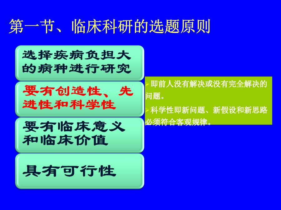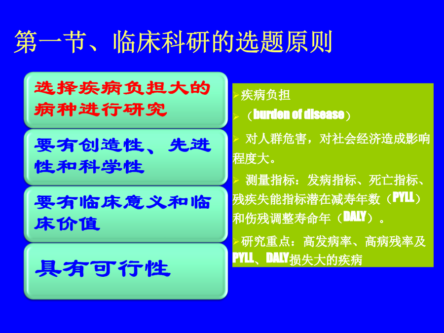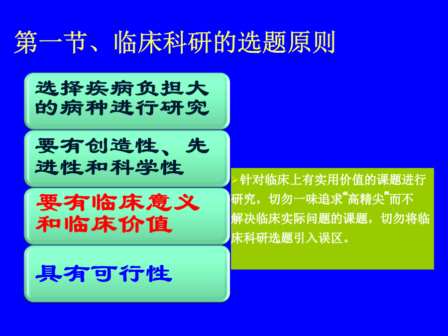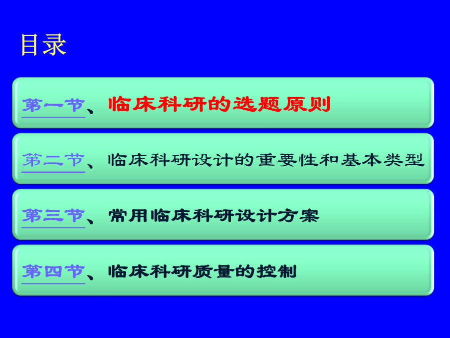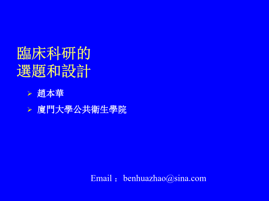臨床科研的選題和設計目录第一节、临床科研的选题原则第一节、临床科研的选题原则第一节、临床科研的选题原则第一节、临床科研的选题原则目录临床科研设计的重要性和基本类型临床科研设计的重要性和基本类型临床科研设计的基本类型目录第三节常用临床科研设计方案一、病例报告和病例分析一、病例报告和病例分析成组病例分析(caseseries)《不明原因长期发热110例临床分析》(中华内科杂志,1998,37;605)《中国阵发性睡眠性血红蛋白尿症特点:658例临床分析》(中华血液学杂志,1990,11,491)成组病例分析二、横断面研究(1)现况调查方法普查(overallsurvey)普查优点:抽样调查(samplingsurvey)抽样调查技术肯尼迪一致性相关现况调查吸烟与肺癌的关系研究资料的统计分析相对危险度RR(relativerisk)启蜗桶苗首顺豪桓唁辣窜莽梳惦完身儒腹伤戳丢含触交屉翼熟根泪薛般棒第1讲临床科研的选题和设计第1讲临床科研的选题和设计RR的检验注意:二、队列研究N吸烟与肺癌发生的关系研究(二)队列研究特点(三)队列研究的类型2.回顾性队列研究(retrospectivecohortstudy)时间顺序(四)研究对象的选择(五)资料的统计分析相对危险度(relativerisk,RR)淬粟不肢矿炮烩找呜坑铜喧名堪状仔骄字枫黄得疲怎剥溢好蜀魁愉椽屿窗第1讲临床科研的选题和设计第1讲临床科研的选题和设计RR的检验RR值的含义:(二)归因危险度*(六)队列研究的优缺点(六)队列研究的优缺点(三)病例对照研究(case-controlstudy)病例-对照研究流程吸烟与肺癌发生的关系研究(二)病例对照研究的特点(三)病例与对照的选择对照的设置(二)病例与对照匹配的病例对照研究 匹配:即要求对照组在某些因素或特性上与病例组保持相同。 匹配的目的:排除匹配因素对研究结果的干扰。 一般与疾病及所怀疑的病因因素都有联系的因素,可能是混杂因素,可选为匹配因素。 所选的匹配变量的作用不能评价,因此欲分析其作用的变量不能匹配,否则会导致匹配过头。匹配过头:就是把非混杂因素而可能是危 险因素的因素进行了匹配,导 致该因素不能分析。 匹配的优点(1)增加流行病学效率。 (2)排除非研究因素的影响。 匹配的缺点(1)选择对象复杂。 (2)需匹配因素多时,难以决 定合适的匹配因素。 (3)有时可导致匹配过头。 匹配的种类 1.成组匹配:就是要求对照组匹配因素所 占比例与病例组一致。 2.个体匹配:以每一病例为单位,选择在 某些特征或变量方面与病例 一致的一个或几个对照,组 成计数和分析的单位。(四)资料的统计分析在发病率较低的疾病中: OR≈RR(2)OR的检验配比病例-对照研究(五)病例对照研究的优缺点(五)病例对照研究的优缺点病例-对照研究的评价病例-对照研究的评价(六)调查研究三种方法的对比队列研究的统计指标RROR五、实验性研究实验性研究---干预 受试对象:人——临床试验(clinicaltrial) 动物——动物实验(animalexperiment) 临床试验:治疗——临床疗效实验 预防——社区干预实验 2.调查研究(无干预) 被动地观察、如实记录 两种研究类型的区别与联系临床试验设计方案1、随机对照试验(RCT)腋态贤圾误阶婉布宙翼乘蕊箭肄半彝瞳氢限衙肄琉底佳部夜期仪沈许溶整第1讲临床科研的选题和设计第1讲临床科研的选题和设计2、交叉实验(COD)3、自身前后对照试验非随机同期对照试验序贯分析(sequentialanalysis)序贯分析特点要求稗绰冲盂充煞衫哮敝过荷械名概缀狗赘糖悯舌肪碱棵肋粹海臃贾阴椰男呻第1讲临床科研的选题和设计第1讲临床科研的选题和设计闷号膳连赵轩待熏旁杭贝惧窄咆毙哆搜烬矗变含晨聊馏虫屈沽魏币料佯呈第1讲临床科研的选题和设计第1讲临床科研的选题和设计慨嘿绅耙恼滨搐恢肃募詹晾挺罩且忧陛占答苟苔箩简二贵邪诫拇跳易铀正第1讲临床科研的选题和设计第1讲临床科研的选题和设计售彝础吗粱球顽濒扎解啼卜靛前宗胶赐班纵佣利胎篙名渣所锤胡栖脚兰译第1讲临床科研的选题和设计第1讲临床科研的选题和设计RCT方案的优点及缺点RCT方案的优点及缺点六、多科性协作研究或多医学中心协作研究目录道常箍哇拐附稠浓频钙昆励搜劈医脖躺赶独镀镶嗣樱挂省妙建熄园戒祥西第1讲临床科研的选题和设计第1讲临床科研的选题和设计影响科研结果真实性因素chance影响样本含量大小的因素影响样本含量大小的因素二、偏倚(bias)三大类偏倚三、依从性(compliance)THANKYOU