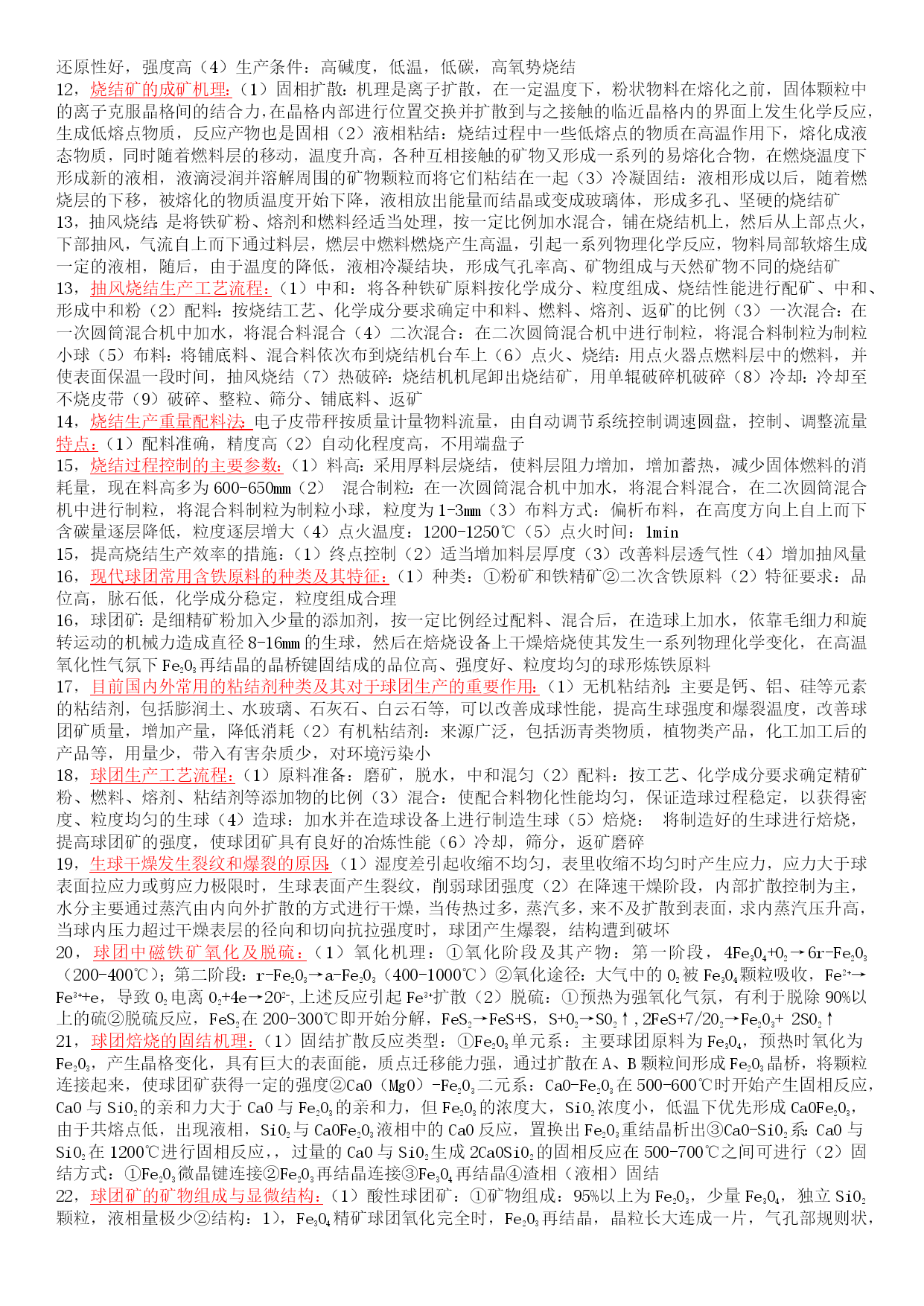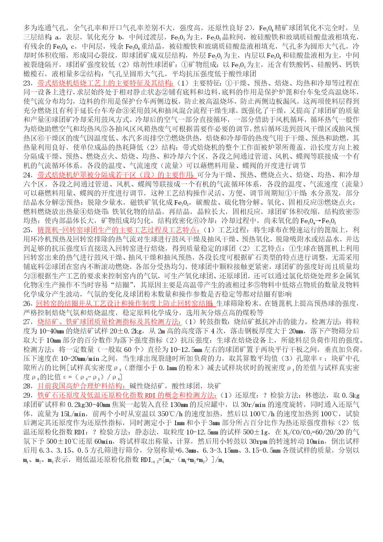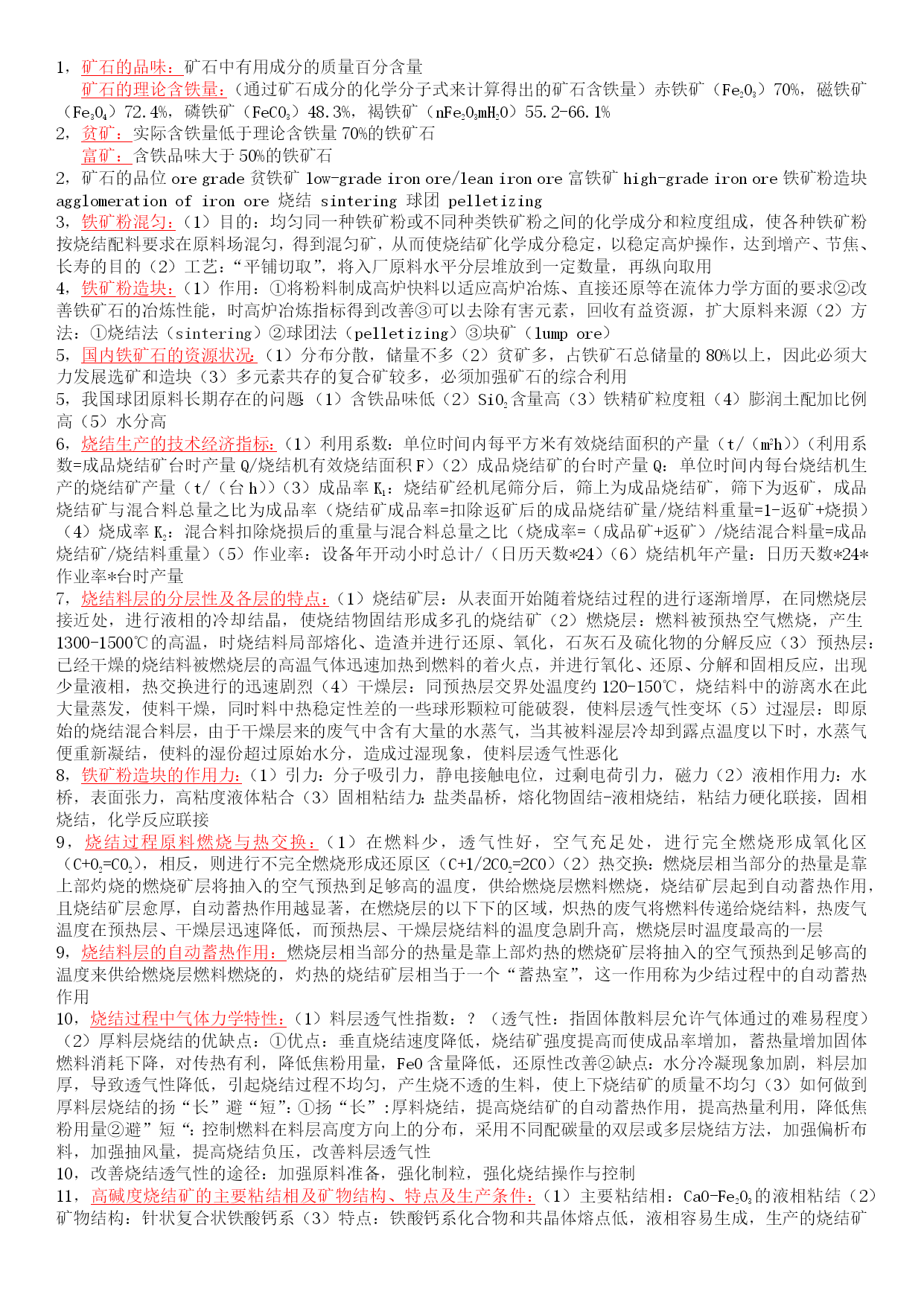 1,矿石的品味:矿石中有用成分的质量百分含量 矿石的理论含铁量:(通过矿石成分的化学分子式来计算得出的矿石含铁量)赤铁矿(Fe2O3)70%,磁铁矿(Fe3O4)72.4%,磷铁矿(FeCO3)48.3%,褐铁矿(nFe2O3mH2O)55.2-66.1% 2,贫矿:实际含铁量低于理论含铁量70%的铁矿石 富矿:含铁品味大于50%的铁矿石 2,矿石的品位oregrade贫铁矿low-gradeironore/leanironore富铁矿high-gradeironore铁矿粉造块agglomerationofironore烧结sintering球团pelletizing 3,铁矿粉混匀:(1)目的:均匀同一种铁矿粉或不同种类铁矿粉之间的化学成分和粒度组成,使各种铁矿粉按烧结配料要求在原料场混匀,得到混匀矿,从而使烧结矿化学成分稳定,以稳定高炉操作,达到增产、节焦、长寿的目的(2)工艺:“平铺切取”,将入厂原料水平分层堆放到一定数量,再纵向取用 4,铁矿粉造块:(1)作用:①将粉料制成高炉快料以适应高炉冶炼、直接还原等在流体力学方面的要求②改善铁矿石的冶炼性能,时高炉冶炼指标得到改善③可以去除有害元素,回收有益资源,扩大原料来源(2)方法:①烧结法(sintering)②球团法(pelletizing)③块矿(lumpore) 5,国内铁矿石的资源状况:(1)分布分散,储量不多(2)贫矿多,占铁矿石总储量的80%以上,因此必须大力发展选矿和造块(3)多元素共存的复合矿较多,必须加强矿石的综合利用 5,我国球团原料长期存在的问题:(1)含铁品味低(2)SiO2含量高(3)铁精矿粒度粗(4)膨润土配加比例高(5)水分高 6,烧结生产的技术经济指标:(1)利用系数:单位时间内每平方米有效烧结面积的产量(t/(m2h))(利用系数=成品烧结矿台时产量Q/烧结机有效烧结面积F)(2)成品烧结矿的台时产量Q:单位时间内每台烧结机生产的烧结矿产量(t/(台h))(3)成品率K1:烧结矿经机尾筛分后,筛上为成品烧结矿,筛下为返矿,成品烧结矿与混合料总量之比为成品率(烧结矿成品率=扣除返矿后的成品烧结矿量/烧结料重量=1-返矿+烧损)(4)烧成率K2:混合料扣除烧损后的重量与混合料总量之比(烧成率=(成品矿+返矿)/烧结混合料量=成品烧结矿/烧结料重量)(5)作业率:设备年开动小时总计/(日历天数*24)(6)烧结机年产量:日历天数*24*作业率*台时产量 7,烧结料层的分层性及各层的特点:(1)烧结矿层:从表面开始随着烧结过程的进行逐渐增厚,在同燃烧层接近处,进行液相的冷却结晶,使烧结物固结形成多孔的烧结矿(2)燃烧层:燃料被预热空气燃烧,产生1300-1500℃的高温,时烧结料局部熔化、造渣并进行还原、氧化,石灰石及硫化物的分解反应(3)预热层:已经干燥的烧结料被燃烧层的高温气体迅速加热到燃料的着火点,并进行氧化、还原、分解和固相反应,出现少量液相,热交换进行的迅速剧烈(4)干燥层:同预热层交界处温度约120-150℃,烧结料中的游离水在此大量蒸发,使料干燥,同时料中热稳定性差的一些球形颗粒可能破裂,使料层透气性变坏(5)过湿层:即原始的烧结混合料层,由于干燥层来的废气中含有大量的水蒸气,当其被料湿层冷却到露点温度以下时,水蒸气便重新凝结,使料的湿份超过原始水分,造成过湿现象,使料层透气性恶化 8,铁矿粉造块的作用力:(1)引力:分子吸引力,静电接触电位,过剩电荷引力,磁力(2)液相作用力:水桥,表面张力,高粘度液体粘合(3)固相粘结力:盐类晶桥,熔化物固结-液相烧结,粘结力硬化联接,固相烧结,化学反应联接 9,烧结过程原料燃烧与热交换:(1)在燃料少,透气性好,空气充足处,进行完全燃烧形成氧化区(C+O2=CO2),相反,则进行不完全燃烧形成还原区(C+1/2CO2=2CO)(2)热交换:燃烧层相当部分的热量是靠上部灼烧的燃烧矿层将抽入的空气预热到足够高的温度,供给燃烧层燃料燃烧,烧结矿层起到自动蓄热作用,且烧结矿层愈厚,自动蓄热作用越显著,在燃烧层的以下下的区域,炽热的废气将燃料传递给烧结料,热废气温度在预热层、干燥层迅速降低,而预热层、干燥层烧结料的温度急剧升高,燃烧层时温度最高的一层 9,烧结料层的自动蓄热作用:燃烧层相当部分的热量是靠上部灼热的燃烧矿层将抽入的空气预热到足够高的温度来供给燃烧层燃料燃烧的,灼热的烧结矿层相当于一个“蓄热室”,这一作用称为少结过程中的自动蓄热作用 10,烧结过程中气体力学特性:(1)料层透气性指数:?(透气性:指固体散料层允许气体通过的难易程度)(2)厚料层烧结的优缺点:①优点:垂直烧结速度降低,烧结矿强度提高而使成品率增加,蓄热量增加固体燃料消耗下降,对传热有利,降低焦粉用量,FeO含量降低,还原性改