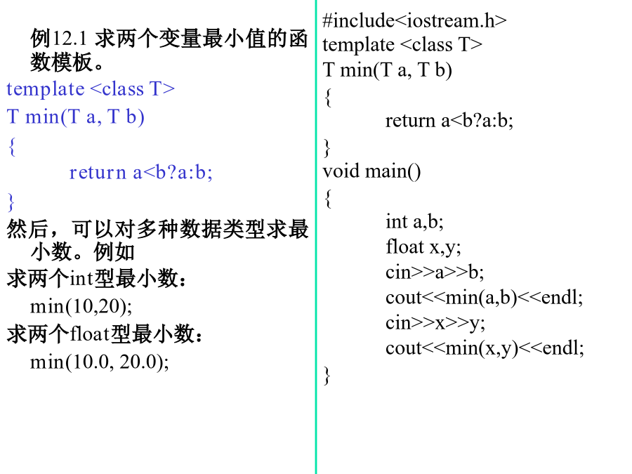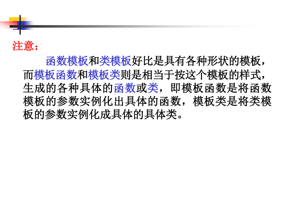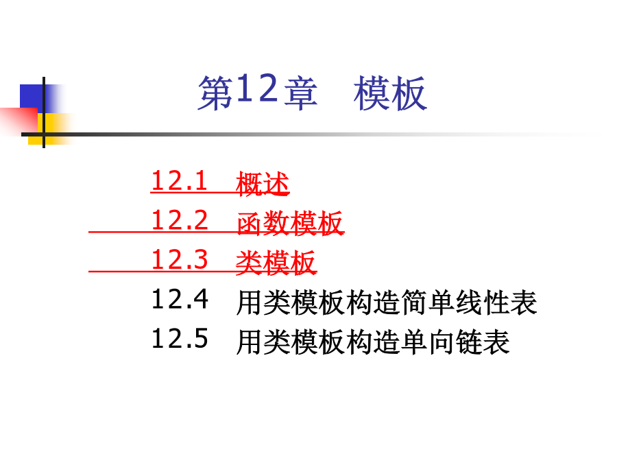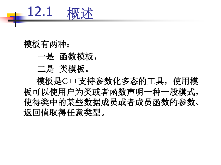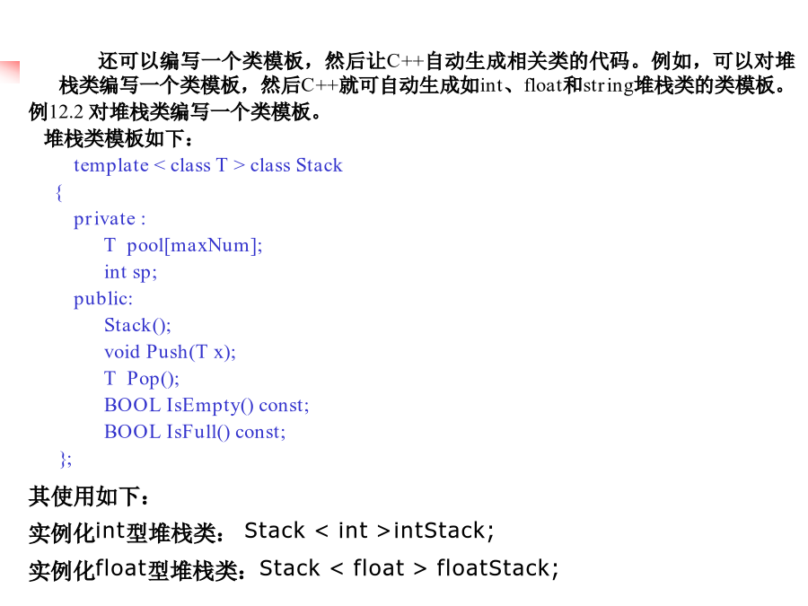 第12章模板12.1概述12.2函数模板#include<iostream.h> template<classT> Tmin(Ta[],intn) { inti; Tminv=a[0]; for(i=1;i<n;i++) if(minv>a[i]) minv=a[i]; returnminv; }重载函数模板12.3类模板例12.4堆栈类模板的编写与使用template<classT> Stack<T>::Stack(intMaxStackSize) { //Stack类构造函数 MaxTop=MaxStackSize-1; stack=newT[MaxStackSize]; top=-1; } template<classT> TStack<T>::Top()const { //返回栈顶元素 if(IsEmpty())cout<<"Outofbounds!"<<endl; elsereturnstack[top]; } template<classT> Stack<T>&Stack<T>::Push(constT&x) { //添加元素x if(IsFull())cout<<"Stackisfull!"<<endl; else stack[++top]=x; return*this; }template<classT> Stack<T>&Stack<T>::Pop(T&x) { //删除栈顶元素,并将其送入x if(IsEmpty())cout<<"Outofbounds!"<<endl; else x=stack[top--]; return*this; } #endif //stack.cpp //测试使用Stack堆栈模板类 #include<iostream.h> #include"stack.h" voidmain() {inti; Stack<int>intStack; cout<<"处理整型堆栈"<<endl; for(i=0;i<4;i++) { intStack.Push(i); cout<<"压入整型堆栈:"<<i<<endl; } for(i=0;i<4;i++) { intj; intStack.Pop(j); cout<<"从整型堆栈中弹出:"<<j<<endl; } Stack<float>floatStack; cout<<"处理浮点型堆栈"<<endl; for(i=0;i<4;i++) {floatf=i*1.1f; floatStack.Push(f); cout<<"压入浮点型堆栈:"<<f<<endl; } for(i=0;i<4;i++) { floatj; floatStack.Pop(j); cout<<"从浮点型堆栈中弹出:"<<j<<endl; } }珍烙惜酶野呈驳杨稀吕惦霍码娩扣绅囚弱油艇疥付完舒迅饲协苇烈除氰腋第12章模板第12章模板12.4用类模板构造简单线性表//llist.h //简单线性表类模板定义 #ifndefLLIST_H #defineLLIST_H #include<stdlib.h> template<classT> classLinearList{ public: LinearList(intMaxListSize=10); //构造函数 ~LinearList(){delete[]element;} //析构函数 boolIsEmpty()const{returnlength==0;}//测线性表是否为空 intLength()const{returnlength;} //返回线性表的长 boolFind(intk,T&x)const; //返回第K个元素的值至x中 intSearch(constT&x)const; //返回x所在位置 LinearList<T>&Delete(intk,T&x);//删除第k个元素并将它值返回至x中 LinearList<T>&Insert(intk,constT&x);//在第k个元素之后插入x voidOutput(ostream&out)const; private: intlength; intMaxSize; T*element;//一维动态数组 }; template<classT> LinearList<T>::LinearList(intMaxListSize) {//线性表构造函数 MaxSize=MaxListSize; element=newT[MaxSize]; length=0; }template<classT> boolLinearList<T>::Find(intk,T&x)const {//把第k个元素取