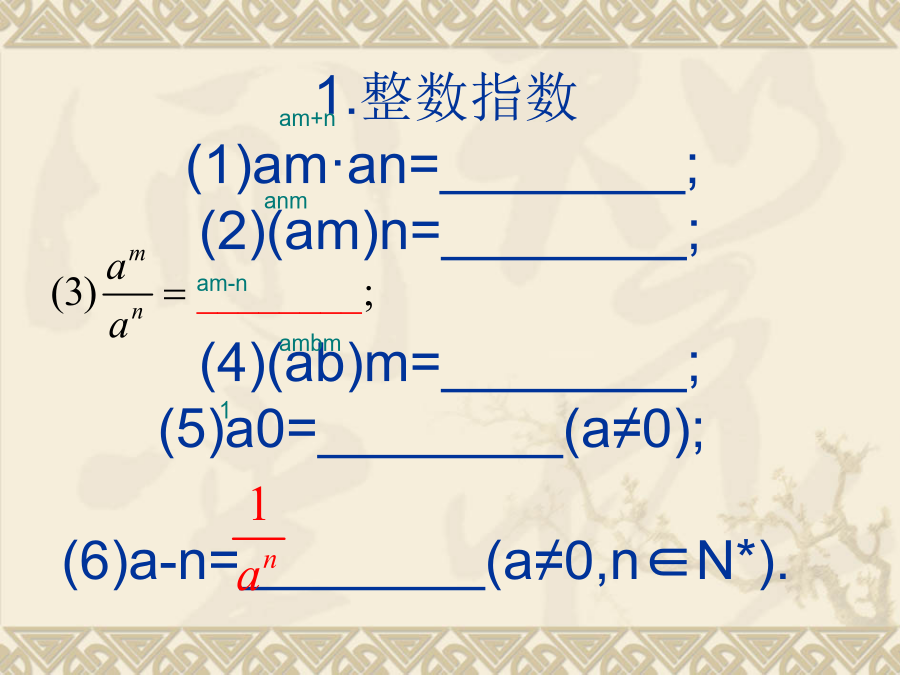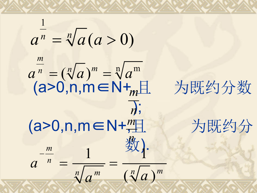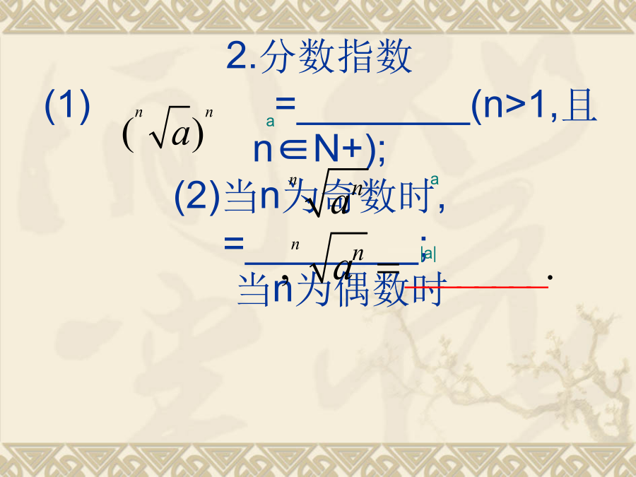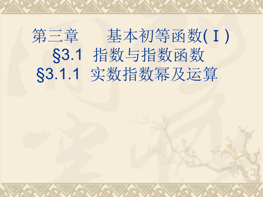 第三章基本初等函数(Ⅰ)第三章基本初等函数(Ⅰ)§3.1指数与指数函数§3.1.1实数指数幂及运算1.整数指数(1)am·an=________;(2)(am)n=________;(4)(ab)m=________;(5)a0=________(a≠0);(6)a-n=________(a≠0,n∈N*).2.分数指数(1)=________(n>1,且n∈N+);(2)当n为奇数时,=________;当n为偶数时(a>0,n,m∈N+,且为既约分数);(a>0,n,m∈N+,且为既约分数).1.下列说法正确的是()A.-3是81的四次方根B.正数的n次方根有两个C.a的n次方根为D解:(-3)4=81,故A正确;8的三次方根只有2,故B错;负数没有偶次方根,故C错;D中当n为奇数时若n为偶数时故D错.2.计算的结果是()3.下列各式中正确的是()解:A中当x=1时无意义;(-1)-1=-1,故B错故C错;D正确.A.6a B.-aC.-9a D.9a答案:C1.根式叫根式,其中n叫根指数,叫被开方数.若xn=a,则x叫a的n次方根,(n>1,n∈N*).当n为正奇数时,正数的n次方根是一个正数,负数的n次方根为一个负数;当n为正偶数时,正数的n次方根(偶次方根)有两个,它们互为相反数,其中正的n次方根为负的n次方根为缩写成n次方根:若xn=a,则x叫a的n次方根,其中n>1,n∈N*. 当n为正奇数时,正数的n次方根是一个正数,负数的n次方根为一个负数; 当n为正偶数时,正数的n次方根(偶次方根)有两个,它们互为相反数,其中正的n次方根为负的n次方根为缩写成 负数的偶次方根在实数范围内无意义. 0的正n次方根为0.2.根式的基本性质如果一个根式的被开方数是正数或者为0,那么这个根式的根指数和被开方数的指数都乘以或都除以同一个正整数,根式的值不变,即(a≥0,n、p为大于1的正整数,m∈N+),用分数指数幂表示为3.有理指数幂的运算性质aαaβ=aα+β(a>0,α、β∈Q);(aα)β=aαβ(a>0,α、β∈Q);(ab)α=aαbα(a>0,b>0,α∈Q).0指数幂的底数不为0.例1:求下列各式的值.李胞蓟鹊锰望王绷玲巨邪揖弃串涪造鞠寓梅戳惠壬住组宇芥惧挤帚懒诽巴指数67288指数67288规律技巧:熟记根式的运算性质,练1:求下列各式的值.恼厌潘巨媒欢异循番宪蹬妨轧援弧劲人卉哭缘虽酌闯霜述匈吁循疚斡哦疚指数67288指数67288例2:化简:剖析:把根式化成分数指数幂的形式,然后利用分数指数幂的运算法则.岂金靠汹灭争拢膨爬邱级逢盐奢当澄尚殆镑针芯尉予麻缝那裔死试蚌吮陆指数67288指数67288嗡机载役筷猖麦莹绑铝枢甥嘘煌预窜彝剖卵邑煮哀舍雨渗与态嫂欣惮寂搪指数67288指数67288规律技巧:当所求根式含有多重根号时,要搞清被开方数,然后由内向外用分数指数幂写出,再利用性质进行运算.练2:计算下列各式的值.伙抹溪馅罕旨苔剑构特橡佬睡并育批站筛藻示看沟蜗篱已椰歪适愧寇拌毯指数67288指数67288剖析:开偶次方根后,先用绝对值符号表示,再由条件去掉绝对值化简而得.解:原式∵|x|<3,∴-3<x<3.当1≤x<3时,原式=(x-1)-(x+3)=-4;当-3<x<1时,原式=-(x-1)-(x+3)=-2x-2.规律技巧:为使开偶次方不出现符号错误,第一步先用绝对值保留开方的结果,再去掉绝对值化简,化简要结合条件,或分类讨论去掉绝对值号.当被化简的式子有几个绝对值号时,要分别找出各式子的零点,然后确定字母在各取值范围的符号,从而进行正确的分类.本题中,令|x-1|=0,|x+3|=0,得两个零点x=1,x=-3,于是对x的讨论分为两个范围1≤x<3与-3<x<1.练3:求使等式 成立的实数a的取值范围.解:可以从对比等式左右两端的形式入手,利用开偶次方根的性质.例4:化简(结果只保留正整数指数)解析:运用整数幂的运算法则求解.埔产琉汪赃嘴伶速拄森郑以队非惶悄架柿今谬渺拖荤悦露赏扣恳恃硝示忍指数67288指数67288规律技巧:运用整数指数幂运算时,注意除法算式是对应指数的减法.剿政重赣念辰焙她匀卿轿修仕裁排迷幕坑几嫁靛接驴粤蹲暗丫吗苫揭硼艾指数67288指数67288皆翔影诉殆瀑逗咐陪跟抗滩杏樱躁醇痛扶虐慢岳丑婉嗣场钻丧桐汹绽恨瘟指数67288指数67288答案:B答案:A答案:A4.将根号外的a移入根号内的结果是()唐森衰禾汲烩郸迁耳印蓉帘络汲澈衙最泵寇域钉巧虎赤雾忧嘿维滞束庭茎指数67288指数67288答案:C答案:D答:19疯执敌躺副轧融匝栏奋艳白历纯喂割驰甭红痉她蜂匣材管僳磐坑团胁颗竖指数67288指数67288能力提升9.化简下列各式.耻哦纽皖丈臀裔冲帘嚎哟祖仪摘戒獭隆孽纂釉仗腆硝锚贰书醇洋设楷递枚