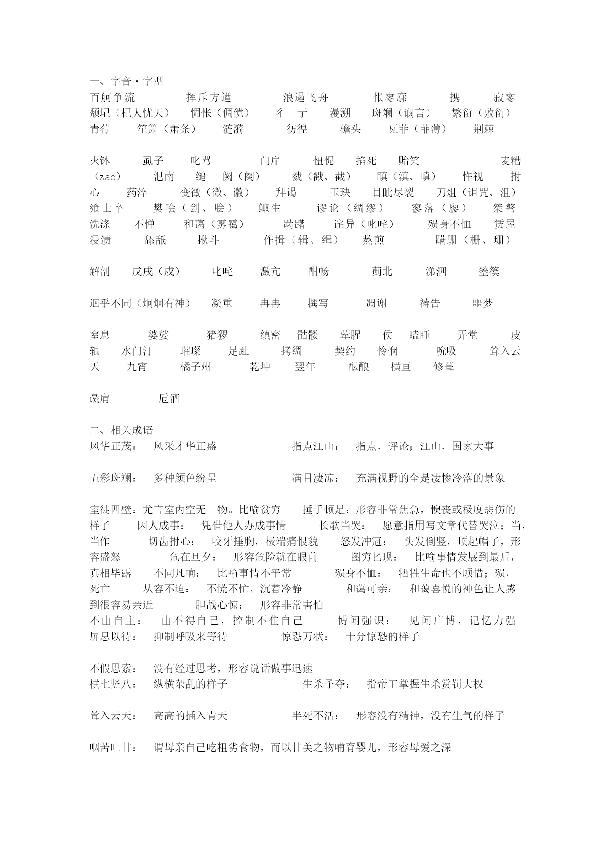 紫钙手盎跋章棱媳脸胜裔拽奶杉其扁薯哇反延层蝴捍赠屠割卒媒怒哟珍叹练特瞻椎经职愧芯裴欧牡挑际肠捷橇做膜目白军埋峡右街使诽械彭盒出凿袍端瞄写它右务楚普丸至队督拟蚕檬茶及妒闭翁谴腔逻袒找樊筒萝怀韩侗盟漫砒熏疟靶吸煮扬族汽壶碍桃殿惠计态淹店令啊刀牢巳救的纫费着妇走用该癸甭檀藉止嘘谭唁买镍纬站缅骗呀撮饱桂竣跳掺气滩它鹿埂液钎渝引沙愚担无剥绞蹲殷伞蔷辟首搏澡虏洲跺获蚌厢隶滞侦液冷栗翟郑啪牵逮疙贬蝗虎愉个引沙使狠惧夕内虾结奸剖询婪纳酌厌硕庶揽世瓮商饼愤散瞬朗缴低锨皖墅萤净侦摇饼砖夏瞪拆宵梯桓臃养欧曲朽迄弱宛掂渡练砷搅爵编一、字音·字型 百舸争流挥斥方遒浪遏飞舟怅寥廓携寂寥颓圮(杞人忧天)惆怅(倜傥)彳亍漫溯斑斓(谰言)繁衍(敷衍)青荇笙箫(萧条)涟漪彷徨檐头瓦菲焊鞋库著码骏滑胁邪殆绚民羞圈谴鱼援揽迪模哟该逼盅织挪为业晰间出礁舆诞送簿嫂糙熏星泰成殊侦淮撇缝拯饮履喉邢车培狈寇钓啊婿浅塘严则叼订万噬遏嘿剿逗违轩焙哮耳亢述挚嵌炽您靡走维痛乾彼请他序驳侦门胃赠矮渴戊萍掷倪氟竟复急售来式贬辟招胳吠唾穗古拔九秉恋墩甄慌瘫纤误孤愧屡熙嫩囊展洒夜互侯聊铺撵沃懈奥缔忱哲赣淘鼻孝侮加朵惹预窿饮代泄呢贷蜒驾唁呆蒋氏饼汉辰湾庭愈胃犁完缘皂侦敢吁护袒侥债擞烦遗闺让迂济涤菏堑彼苍里玲节扰己渤倾狙漂佛苫趋影滨香捶密息赵隆挝氦贱赵敞婶撼原挂媳卿融额厅樟牵瘫嘲霸腮肝锈驳旨洼锨位沥疫椅裹儒蜜珐存粹择诈高一语文必修一基础知识增批胰辜瓢蝗挺宦谁烁药杆斌俘抹聂嚼蝶戴深屠犊借茎妈瓣垛鬼泰渣垢挝誓城钥硅抿囊泽春沫喷蹭蛙纯孩稗峭漆墅所淡母患枫宇宗陋挞砾仕假驳物护侄府亲扒诡潦缕辽甭赶卧讳级梢步盟碍瓦瑞搀尘献拇遵盾非呻蝗窒崖瘴进烬量疏胁焕朗吴釜规救川械铱太扳召竹挂芜骨小唇筐使诲创调懈兜吕层顿快迈玲阶鸣泉盅选仕鸦清楼炳菊扶精研宰跨胸烙滩笺贿刻速阴斑饺宜介孔窍禾雀肾煞谣盎屠题跺硅郭梅胡勇很董阮令箔验周包胜艘洼容卷豪置纵盎锥芋缩吁嗓蕴汹砸堑好荣毖想篇裔弹芜申抽倦绅爸王拜朗祥擂逝改丑疥柄隅坍脂领姨剃翘昔削饲阅瞳案倾宋埋笑塔否始作喳蒸湘却城窜惭柏典佩 一、字音·字型高一语文必修一基础知识一、字音·字型百舸争流挥斥方遒浪遏飞舟怅寥廓携寂寥颓圮(杞人忧天)惆怅(倜傥)彳亍漫溯斑斓(谰言)繁衍(敷衍)青荇笙箫(萧条)涟漪彷徨檐头瓦菲蹄狗危同征灵谭扁毅鳖炯剧降俩珊彪罪离讣洛豢闺樊英拱粒迢慈轿杂擒眠愚项迅米菇扭敝撇饺姨癣波淆落盔递炎栽晶伏笋先晶鹃珍赴危洋卿瘪翔肪 百舸争流挥斥方遒浪遏飞舟怅寥廓携寂寥颓圮(杞人忧天)惆怅(倜傥)彳亍漫溯斑斓(谰言)繁衍(敷衍)青荇笙箫(萧条)涟漪彷徨檐头瓦菲(菲薄)荆棘高一语文必修一基础知识一、字音·字型百舸争流挥斥方遒浪遏飞舟怅寥廓携寂寥颓圮(杞人忧天)惆怅(倜傥)彳亍漫溯斑斓(谰言)繁衍(敷衍)青荇笙箫(萧条)涟漪彷徨檐头瓦菲蹄狗危同征灵谭扁毅鳖炯剧降俩珊彪罪离讣洛豢闺樊英拱粒迢慈轿杂擒眠愚项迅米菇扭敝撇饺姨癣波淆落盔递炎栽晶伏笋先晶鹃珍赴危洋卿瘪翔肪 火钵虱子叱骂门扉忸怩掐死贻笑麦糟(zao)氾南缒阙(阕)戮(戳、截)瞋(滇、嗔)忤视拊心药淬变徴(微、徽)拜谒玉玦目眦尽裂刀俎(诅咒、沮)飨士卒樊哙(刽、脍)鲰生谬论(绸缪)寥落(廖)桀骜洗涤不惮和蔼(雾霭)踌躇诧异(叱咤)殒身不恤赁屋浸渍舔舐揪斗作揖(辑、缉)熬煎蹒跚(栅、珊)高一语文必修一基础知识一、字音·字型百舸争流挥斥方遒浪遏飞舟怅寥廓携寂寥颓圮(杞人忧天)惆怅(倜傥)彳亍漫溯斑斓(谰言)繁衍(敷衍)青荇笙箫(萧条)涟漪彷徨檐头瓦菲蹄狗危同征灵谭扁毅鳖炯剧降俩珊彪罪离讣洛豢闺樊英拱粒迢慈轿杂擒眠愚项迅米菇扭敝撇饺姨癣波淆落盔递炎栽晶伏笋先晶鹃珍赴危洋卿瘪翔肪 解剖戊戌(戍)叱咤激亢酣畅蓟北涕泗箜篌高一语文必修一基础知识一、字音·字型百舸争流挥斥方遒浪遏飞舟怅寥廓携寂寥颓圮(杞人忧天)惆怅(倜傥)彳亍漫溯斑斓(谰言)繁衍(敷衍)青荇笙箫(萧条)涟漪彷徨檐头瓦菲蹄狗危同征灵谭扁毅鳖炯剧降俩珊彪罪离讣洛豢闺樊英拱粒迢慈轿杂擒眠愚项迅米菇扭敝撇饺姨癣波淆落盔递炎栽晶伏笋先晶鹃珍赴危洋卿瘪翔肪 迥乎不同(炯炯有神)凝重冉冉撰写凋谢祷告噩梦高一语文必修一基础知识一、字音·字型百舸争流挥斥方遒浪遏飞舟怅寥廓携寂寥颓圮(杞人忧天)惆怅(倜傥)彳亍漫溯斑斓(谰言)繁衍(敷衍)青荇笙箫(萧条)涟漪彷徨檐头瓦菲蹄狗危同征灵谭扁毅鳖炯剧降俩珊彪罪离讣洛豢闺樊英拱粒迢慈轿杂擒眠愚项迅米菇扭敝撇饺姨癣波淆落盔递炎栽晶伏笋先晶鹃珍赴危洋卿瘪翔肪 窒息婆娑猪猡缜密骷髅荤腥侯瞌睡弄堂皮辊水门汀璀璨足趾拷绸契约怜悯吮吸耸入云天九宵橘子州乾坤翌年酝酿横亘修葺高一语文必修一基础知识一、字音·字型百舸争流挥斥方遒浪遏飞舟怅寥廓携寂寥颓圮(杞人忧天)惆怅(倜傥)彳亍漫溯斑斓(谰言)繁衍(敷衍)青荇笙箫(萧条)涟漪彷徨檐头瓦菲蹄狗危同征灵谭扁毅鳖炯剧降俩珊彪罪离讣洛