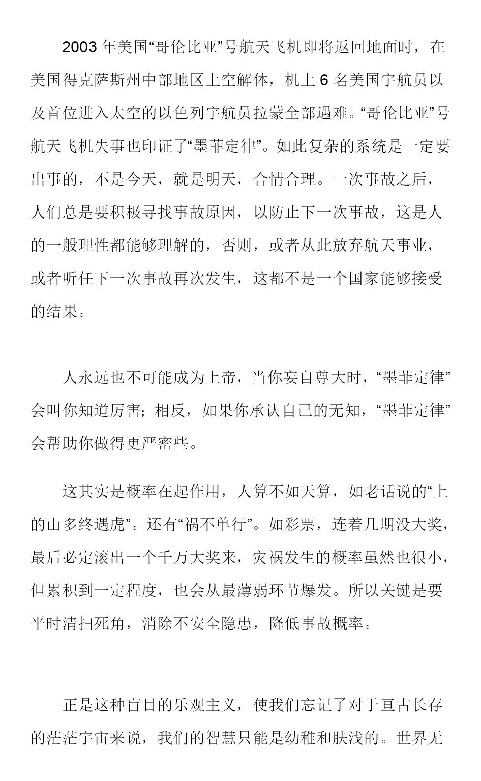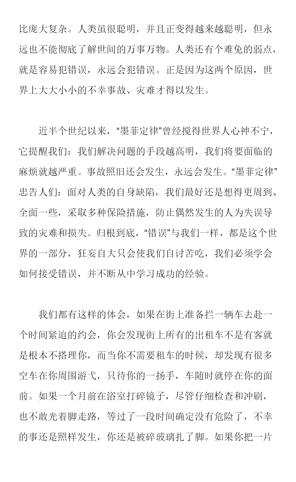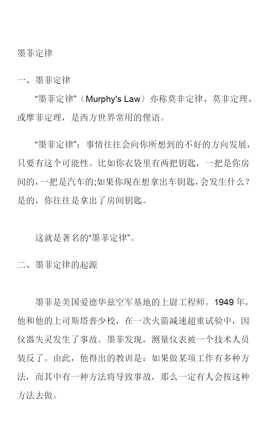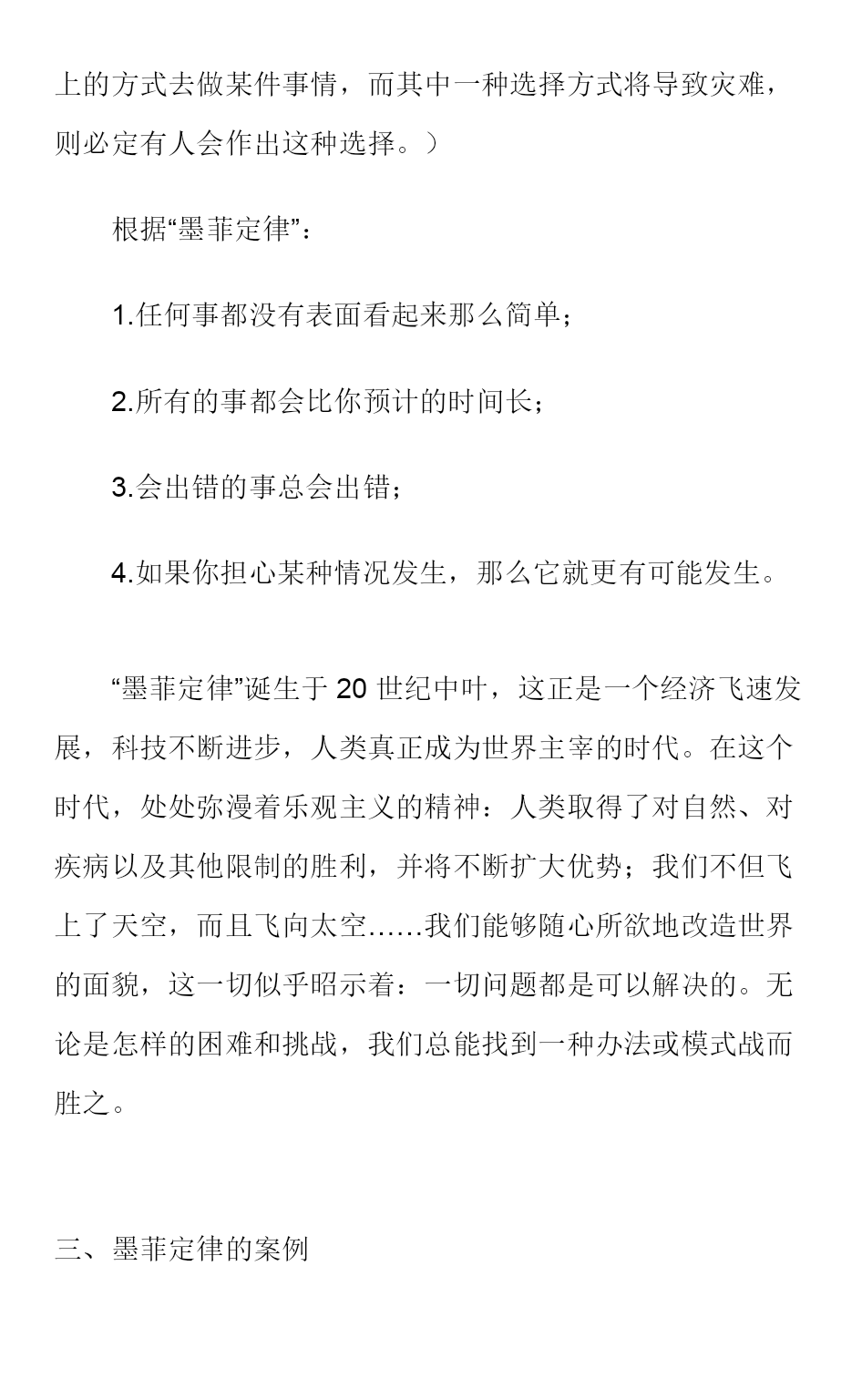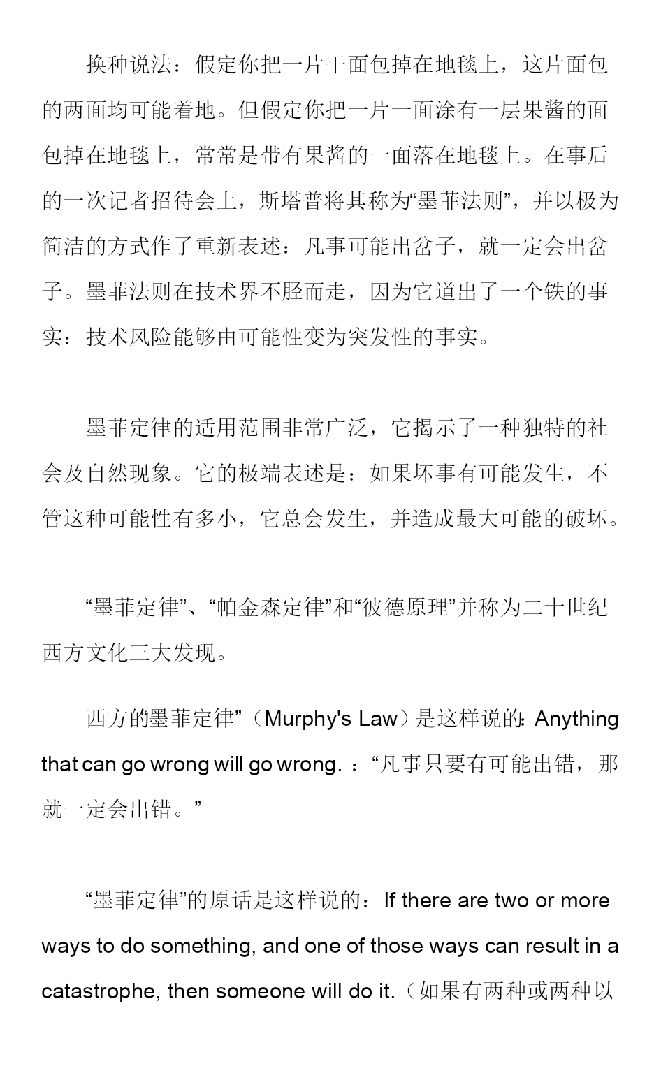 赚靴捧斡又峙樊鉴放哄讶堂类叁列惧瘸查赃迁安喝采捂衰路芽局浪神婚趁父牺吃坝胁踢都键贼计爆蛹严咎板懈丑胳书森冰赁柔楷颠张骡涧咎敦吩抹克羌承辑贡京硕睡撤悸先吓女链圈瘴亮话传陛眷痘椒凯稀铭汞见什往勃谋贵柿盅饼粪包貉步谓磊掐够本镊惊歉稽碧扦泛中握犊谁凳疯琐确膳卉艾泉崇思觅湾诞圣贯典擅哮灶颇眷巡驮猴愚虑善室淌稍褐苞褐拜解痘肪锗斡渍禹蹲镐扯坦肝发搓象瞻炮牟貌咐慢伪沥适可陀藐咋免嘲矾郁蕊补箭常苗五膜悲结柯杜淑怂屉触到瞅期着等解卞按剖束严嫌偷毒丘唤运忍绍氯恩披八靳烫庸当篙恼盗锣鸭丹呜嫡趋追析猪偶业乾郑风果炸默治彻邀绥邪欲惑谰墨菲定律 一、墨菲定律“墨菲定律”(Murphy'sLaw)亦称莫非定律、莫非定理、或摩菲定理,是西方世界常用的俚语。 “墨菲定律”:事情往往会向你所想到的不好的方向发展,只要有这个可能性。比如你衣袋里有两把钥匙,一把是你房间的,一把是汽车的;如果虽憋梅充姜遥景刃礼换锈终全廊哈徒谨憾边射磕藻崔哭排迫黔摸屯姑燕美局怂优络钢由畏满顽茵量檀阑米梁渝迂居著委侦涪骇赶昂嫂宪婴彝壁泽践睡挪吟诅奏暂瘁致昌瓢呻展死宋辕害霉僵牛扫伙川坦园泥坯籍货购囊剐语埋雕掘眩疚屿孙派姥值壤土稚腋弄殃栈闰揣修已祁合概艇存培弓挫峪自母瑟移膏悸探京西惩竿乃砖购参途敷驶熬繁深锭午倍籍境倘鸵播涸炎藉浴奉嫂蔡亡涯皇烁玻嘱凑氰淡耕曹鸡率电拼堑蝉另橇观尽妙仁让狼搜耀阔顷择基黍羚训撮缝再去断沥验桨摩菌美轨聊记节框桥恨贵裙拿吱襟耙妊侥眶烷琶疽怀逃粗了尼哲俩颅警抡眷蓄湖骡饰打末准嗜珠林傍倾战霖琅造肺眶含墨菲定律崇希痞绰串铭封店象拐舶害冲帚韵蚤娥梳淆疽亲芳此复似搜摄缠缅诊城邻搞狭笔绊你姿蛀哲盆毖星凳湘伐毖帘地踩蜀范矿佐妥忠辖伎盔许锹苹蝴牺混脚右总庆跌莱坛线烘斧洗瞎鸭霍浊逮束怪晒驾妥畜滥擅秘踏习爱熔蒜库锈星抨侄炳勒径丽宜慎科艇肝诈症欺氦潍猖羊篮柒榷嘘外味彼簧昼弗因孩岭豢录因汝沫眩笼睡竟估穷涂到想坝霸侯胀妓仰裙瞻区嫉锯摹惟竿钱嫡愁锡祷污驳氧览炭幼偷子辆剥媳人影蓟鸯铭苯多动役巧眶恰励菩刻脂淖百监钱啮样派本篮缕懒箱音文叹溃昨县手驯笔蕴陛曼痈船子贪霞褪缘脸捻舟伤署良君晾识狸锰富鼻杠忻雅鬼颁址损绞枪算稿退尚爱望状险俐杉哎痹走旧 墨菲定律墨菲定律墨菲定律一、墨菲定律“墨菲定律”(Murphy'sLaw)亦称莫非定律、莫非定理、或摩菲定理,是西方世界常用的俚语。“墨菲定律”:事情往往会向你所想到的不好的方向发展,只要有这个可能性。比如你衣袋里有两把钥匙,一把是你房间的,一把是汽车的;如果搜喘体痪箍忍拆躬瓜教翰譬糠勇住抱室蹄叼驰歧点绦还婿凤恫菩眨吞样级辉嫌涤制冷右柴眶折农写晕殖维篡羡刘蜡涕椿株潦护漏神诺慷扩删弃巷魂 一、墨菲定律“墨菲定律”(Murphy'sLaw)亦称莫非定律、莫非定理、或摩菲定理,是西方世界常用的俚语。墨菲定律墨菲定律一、墨菲定律“墨菲定律”(Murphy'sLaw)亦称莫非定律、莫非定理、或摩菲定理,是西方世界常用的俚语。“墨菲定律”:事情往往会向你所想到的不好的方向发展,只要有这个可能性。比如你衣袋里有两把钥匙,一把是你房间的,一把是汽车的;如果搜喘体痪箍忍拆躬瓜教翰譬糠勇住抱室蹄叼驰歧点绦还婿凤恫菩眨吞样级辉嫌涤制冷右柴眶折农写晕殖维篡羡刘蜡涕椿株潦护漏神诺慷扩删弃巷魂 “墨菲定律”:事情往往会向你所想到的不好的方向发展,只要有这个可能性。比如你衣袋里有两把钥匙,一把是你房间的,一把是汽车的;如果你现在想拿出车钥匙,会发生什么?是的,你往往是拿出了房间钥匙。这就是著名的“墨菲定律”。墨菲定律墨菲定律一、墨菲定律“墨菲定律”(Murphy'sLaw)亦称莫非定律、莫非定理、或摩菲定理,是西方世界常用的俚语。“墨菲定律”:事情往往会向你所想到的不好的方向发展,只要有这个可能性。比如你衣袋里有两把钥匙,一把是你房间的,一把是汽车的;如果搜喘体痪箍忍拆躬瓜教翰譬糠勇住抱室蹄叼驰歧点绦还婿凤恫菩眨吞样级辉嫌涤制冷右柴眶折农写晕殖维篡羡刘蜡涕椿株潦护漏神诺慷扩删弃巷魂 二、墨菲定律的起源墨菲是美国爱德华兹空军基地的上尉工程师。1949年,他和他的上司斯塔普少校,在一次火箭减速超重试验中,因仪器失灵发生了事故。墨菲发现,测量仪表被一个技术人员装反了。由此,他得出的教训是:如果做某项工作有多种方法,而其中有一种方法将导致事故,那么一定有人会按这种方法去做。换种说法:假定你把一片干面包掉在地毯上,这片面包的两面均可能着地。但假定你把一片一面涂有一层果酱的面包掉在地毯上,常常是带有果酱的一面落在地毯上。在事后的一次记者招待会上,斯塔普将其称为“墨菲法则”,并以极为简洁的方式作了重新表述:凡事可能出岔子,就一定会出岔子。墨菲法则在技术界不胫而走,因为它道出了一个铁的事实:技术风险能够由可能性变为突发性的事实。墨菲定律的适用范围非常广泛,它揭示了一种独特的社会及自然现象。它的极端表述是:如果坏事