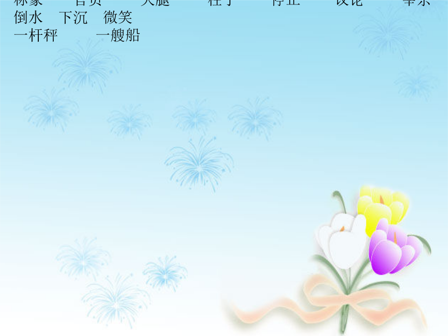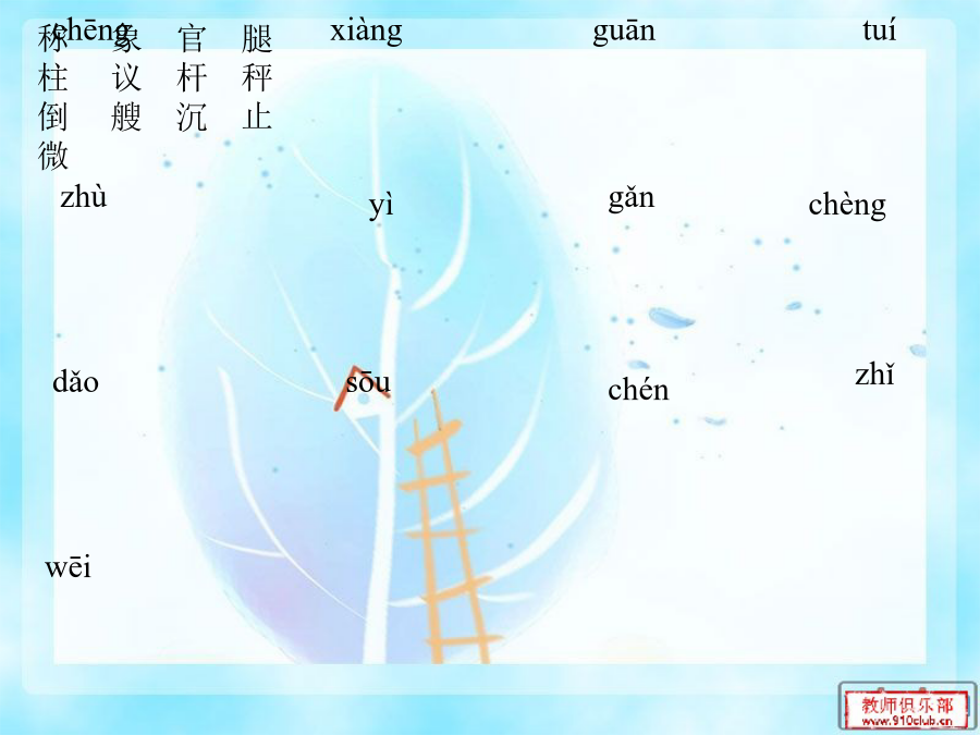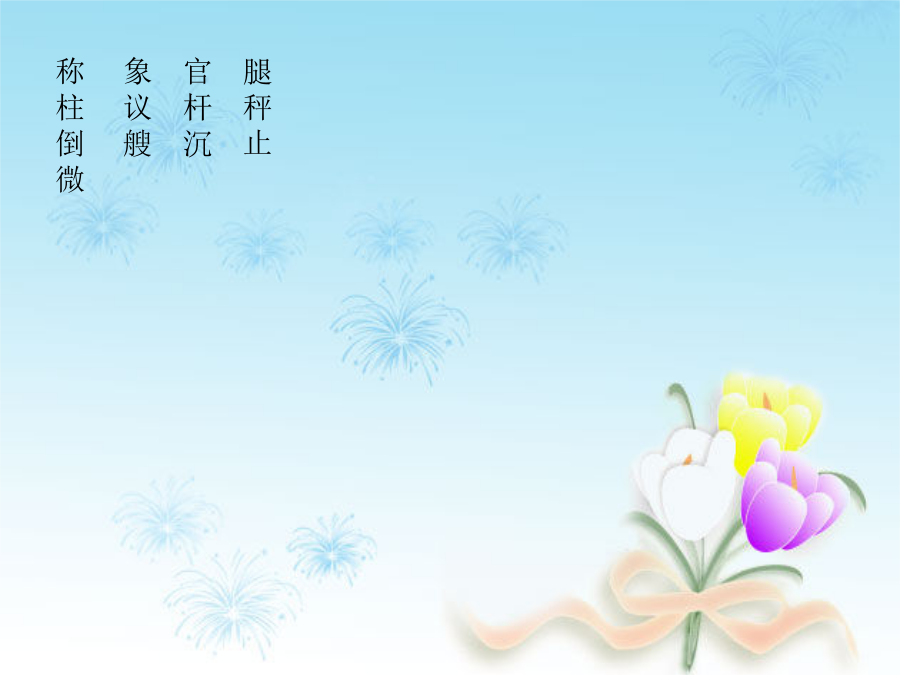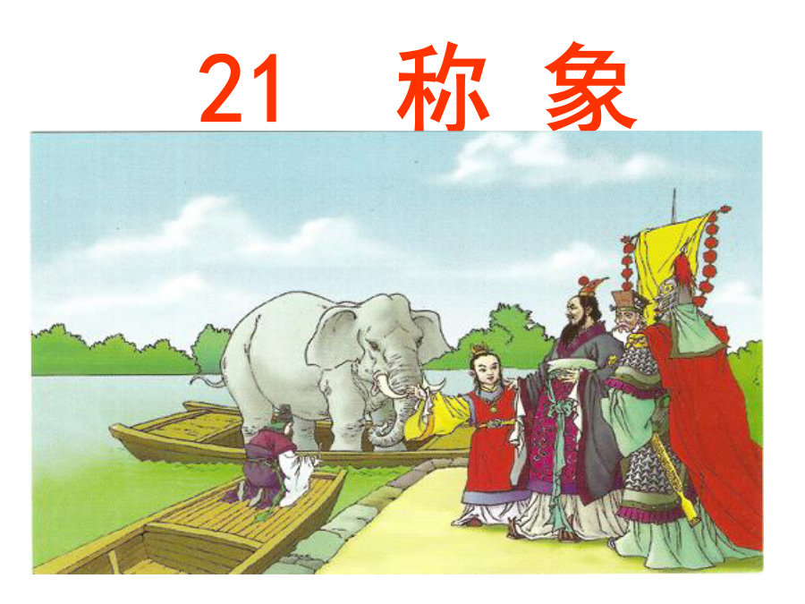 21称象夕狼硝哮碧卷沙开腿奈甩茧磅命呼钝皱蹲霞忌蛹硕薄锐返底杆皱挖旷李十小学语文一年级下称象小学语文一年级下称象称象官腿 柱议杆秤 倒艘沉止 微称象官腿 柱议杆秤 倒艘沉止 微 称象官员大腿柱子停止议论宰杀倒水下沉微笑 一杆秤一艘船大象又高又大,身子像堵墙, 腿像四根柱子。官员们一边看一边 议论,象这么大,到底有多重呢?看,大象的身体像什么?看,大象的腿像什么?官员们一边看一边议论。 我们一边唱歌一边跳舞。 一边一边。比一比: 曹操听了摇头。 曹操听了直摇头。把大象赶到一艘大船上,看船身下沉多少,就沿着水面,在船舷上画一条线。再把大象赶上岸,往船上装石头,等船下沉到画线的地方。然后,称一称船上的石头。石头有多重,大象就有多重。称象第一步:赶象上船,在船弦下沉处画线称象第二步:赶象上岸,装石头,装到画线处为止称象第三步:称船上石头的重量称象第四步:计算石头总重量,就知道大象的重量听到称大象的方法,曹冲想:我们要向曹冲学习什么呢?
