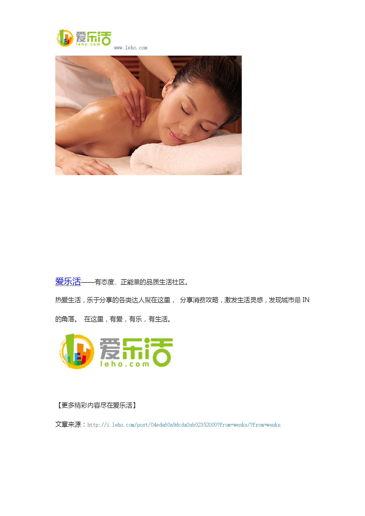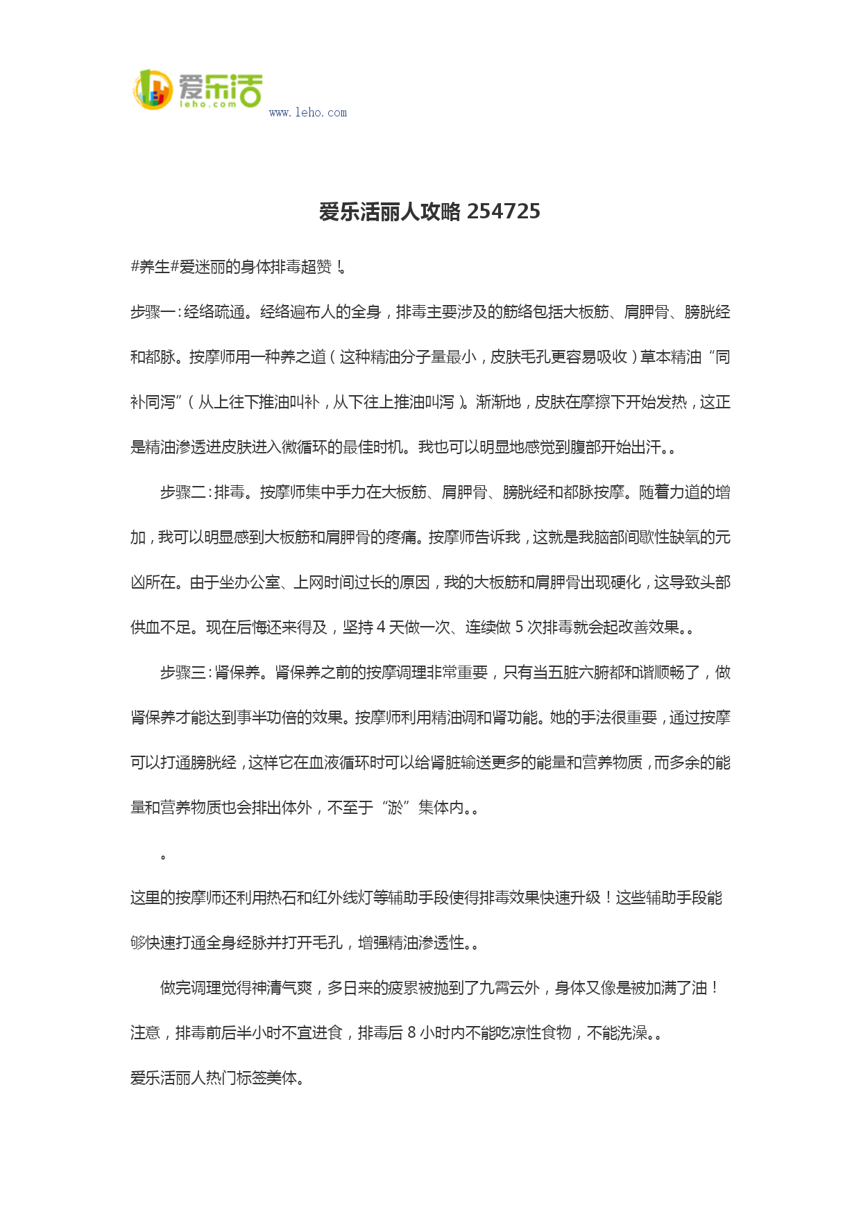 www.leho.com 爱乐活丽人攻略254725 #养生#爱迷丽的身体排毒超赞!。 步骤一:经络疏通。经络遍布人的全身,排毒主要涉及的筋络包括大板筋、肩胛骨、膀胱经和都脉。按摩师用一种养之道(这种精油分子量最小,皮肤毛孔更容易吸收)草本精油“同补同泻”(从上往下推油叫补,从下往上推油叫泻)。渐渐地,皮肤在摩擦下开始发热,这正是精油渗透进皮肤进入微循环的最佳时机。我也可以明显地感觉到腹部开始出汗。。 步骤二:排毒。按摩师集中手力在大板筋、肩胛骨、膀胱经和都脉按摩。随着力道的增加,我可以明显感到大板筋和肩胛骨的疼痛。按摩师告诉我,这就是我脑部间歇性缺氧的元凶所在。由于坐办公室、上网时间过长的原因,我的大板筋和肩胛骨出现硬化,这导致头部供血不足。现在后悔还来得及,坚持4天做一次、连续做5次排毒就会起改善效果。。 步骤三:肾保养。肾保养之前的按摩调理非常重要,只有当五脏六腑都和谐顺畅了,做肾保养才能达到事半功倍的效果。按摩师利用精油调和肾功能。她的手法很重要,通过按摩可以打通膀胱经,这样它在血液循环时可以给肾脏输送更多的能量和营养物质,而多余的能量和营养物质也会排出体外,不至于“淤”集体内。。 。 这里的按摩师还利用热石和红外线灯等辅助手段使得排毒效果快速升级!这些辅助手段能够快速打通全身经脉并打开毛孔,增强精油渗透性。。 做完调理觉得神清气爽,多日来的疲累被抛到了九霄云外,身体又像是被加满了油!注意,排毒前后半小时不宜进食,排毒后8小时内不能吃凉性食物,不能洗澡。。 爱乐活丽人热门标签美体。 HYPERLINK"http://img.leho.com/img_src/7d26653c107a997b003520e4"\t"_blank" HYPERLINK"http://img.leho.com/img_src/5694ddd197476f07058c5322"\t"_blank" HYPERLINK"http://www.leho.com/?from=wenku"爱乐活——有态度、正能量的品质生活社区。 热爱生活,乐于分享的各类达人聚在这里,分享消费攻略,激发生活灵感,发现城市最IN的角落。在这里,有爱,有乐,有生活。 HYPERLINK"http://discover.leho.com/?cid=1b3888ebc0eac5dbbde000fa/?wenku"【更多精彩内容尽在爱乐活】 文章来源:http://i.leho.com/post/04eda60a9dcda0ab02352000?from=wenku/?from=wenku
