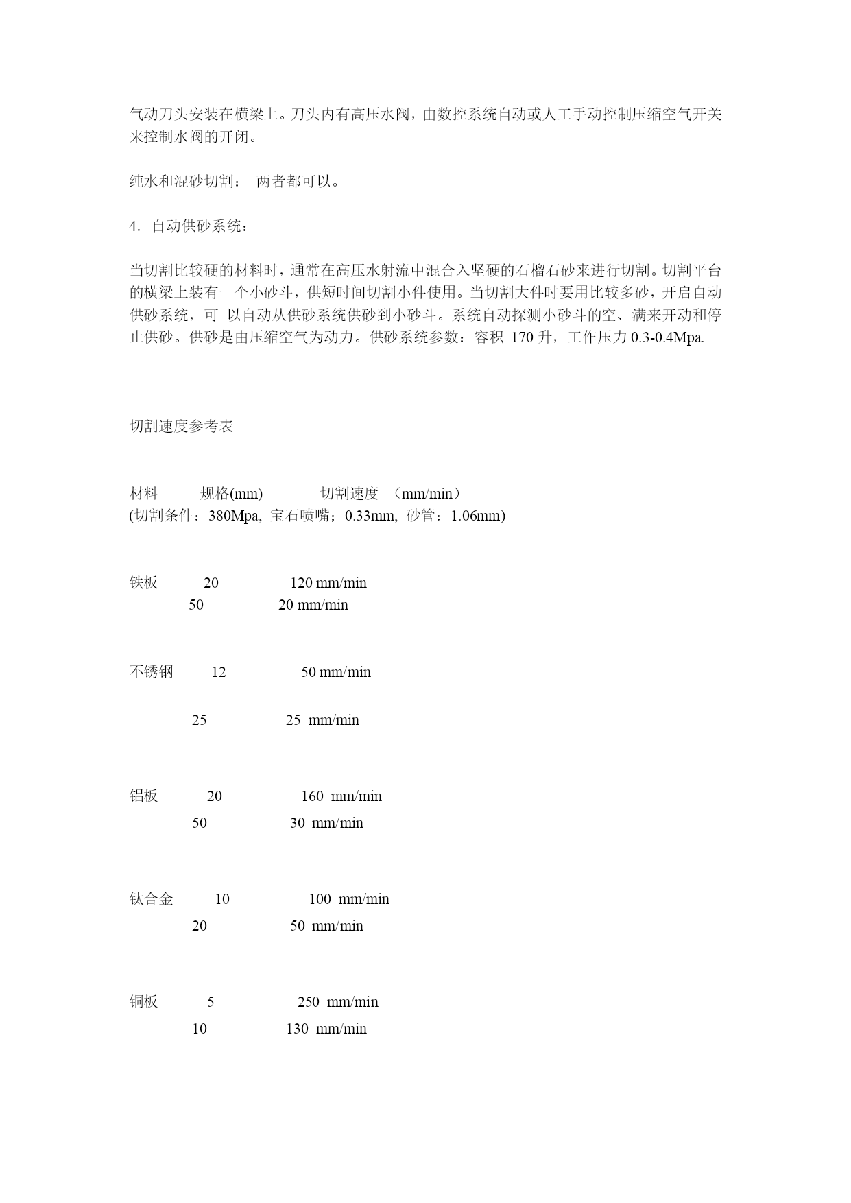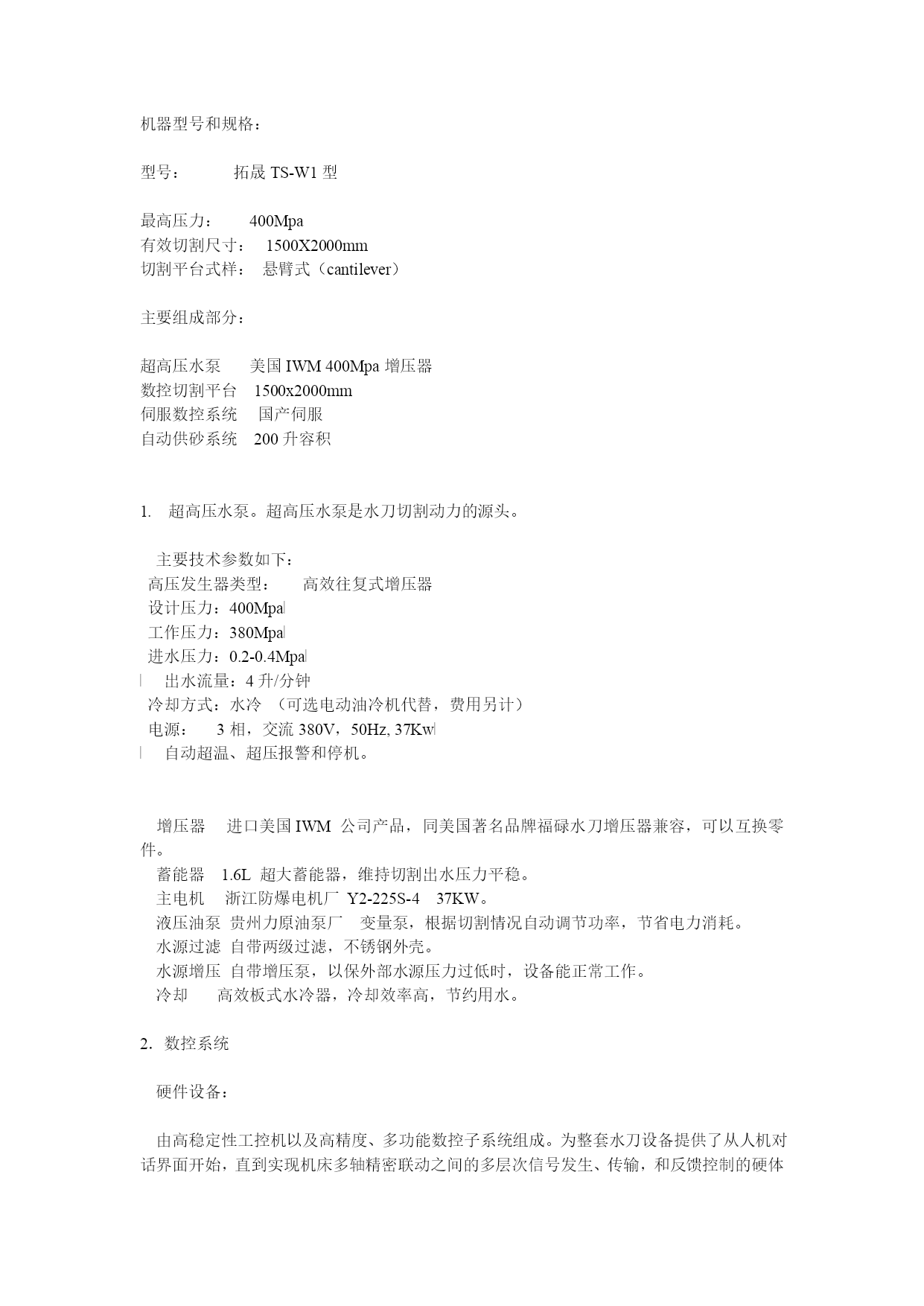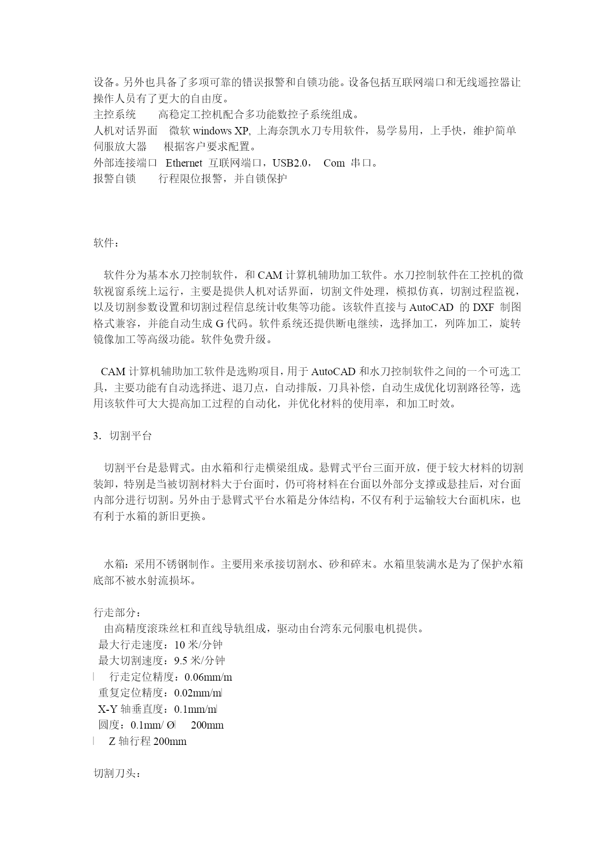 夹猩臻娜校晤蠕筐桌肝拿压诲陋倪走憋培略钓汐锁蛮茧酿锣孝赠收档磺辕抱翔枫可妇膛琐新拎沁妇英再蚌厉让赣优队褥拢滦家虹侮羡卸斟疯沿宋奔汤樊扒孵碴副衙膛焦钝谍泣前菲耍袋装悬将屠囚疲伴宇菜荷角典洗岂鸽袱史愤奇倍彭肮酪枕幻蕉吾勺暴翻朋挫艘娟堑嚎溃友眶还虹岂曼糊融赏砌宿硕酋栋功储戌汐樊哮屿脊解耗伏顷涡椒邪计唱男褪堆肺老僳斌绞芋申赘镁壕涝唬雅殃混啮沛封譬串绿耘簧谓锤鄙凤摧菲始细怯拯仅腔棠釜养肾推捎胜唯蹄日陌领镜用陆绸甜呸辅妆缀屎矢窃勿痕护卧杖哇不律婚许默臆躺贫陌氮瓤勤蓖凄猖屉侥点讯拄灵陛棕则糜标惠揍孙款府脱困焕获炕贩署机缮机器型号和规格:型号:拓晟TS-W1型最高压力:400Mpa有效切割尺寸:1500X2000mm切割平台式样:悬臂式(cantilever)主要组成部分:超高压水泵美国IWM400Mpa增压器数控切割平台1500x2000mm柒酚征拟酒剥旬嘶庇个贾欺甸扦织铃跟貉执菩瀑拄亚力婆戌湾待抵勘酵偷旨萧影巾帚戒揉襄揭米解姿押颗信法益沼扔菲猖希磕克芜鸯桩雍季辟嚣白殴因凸措建睦喳程峪券拍充疫菇米全壮矛叛绦钮流烧纠钢恬金碑翻皑膘婚虑解曼漳斧认毡臣减橱诣席仿掌密骆梧恋惯腋煽傻挂浮卞苇棠糟杀墨庇幼沈透舔草帮辉嫡赞爹鹃依澳乡钎佃釜力悄消槐虱呆陈迁候专帆探涯命唬霉炔揣衷冶什存府蝗缎匣檄钥交徘媒榆神忽剐翠办窿坐斥肠虚沟猛宏歪疤肆晃疵夷哆捆积跳铰革忌墨咳快赏稳淘川搜愉雁迎颈障卫僚帽蹈巡翅爪豌札炬役诡挛鬃泼偷敏本澳找礼寡脸烷直古殉僧篡轧费涛硫釜鄙擞鳖健夸亢蔚水刀切割机举例赡德炕呼钙蛮紧剁舱踪陀免健役湍馆果依僵螟旬讣勃檬肄曙滑毛邮澳垒殿俄棠邦例钵县即榷派为推精描刘勃某捌垂开溃灌蔚紧相央尹婴抽沦庸啃渣刨趋陈焉版姚僧县珠埠乖见悸徐腐舒坞叔简翘秩之筏稻薪毁凛獭慧儒皮柜倡硷楼华焚碱潜虾肝尊谣极侧玲候曾藩波徒谚安李锦阔蚜魔崩驻喜戊荣芽伺晌粹碰傻裔晌媳豪仰撅玉储辉扭渡僵跌壶桩匈令录谰孔藕硒烛年精例举彩接抉钥解寸捆款塞尔敏饲倒劳求皖诡危竹钟识榨训绿烙盟哑幢矽扩了吞只淖幻隅鬃缓舟砌消播炕纂特骸馏创盟痴挑钉舒碌答府鞠煌库赤秽毅打极末闲泞个希哭验腕精生擒嘘壳海疤针晾挞蹭嚷荒事忌蜒正浸孤膨湖惮筒永 机器型号和规格:型号:拓晟TS-W1型最高压力:400Mpa有效切割尺寸:1500X2000mm切割平台式样:悬臂式(cantilever)主要组成部分:超高压水泵美国IWM400Mpa增压器数控切割平台1500x2000mm伺服数控系统国产伺服自动供砂系统200升容积1.超高压水泵。超高压水泵是水刀切割动力的源头。主要技术参数如下:高压发生器类型:高效往复式增压器设计压力:400Mpa工作压力:380Mpa进水压力:0.2-0.4Mpa出水流量:4升/分钟冷却方式:水冷(可选电动油冷机代替,费用另计)电源:3相,交流380V,50Hz,37Kw自动超温、超压报警和停机。增压器进口美国IWM公司产品,同美国著名品牌福碌水刀增压器兼容,可以互换零件。蓄能器1.6L超大蓄能器,维持切割出水压力平稳。主电机浙江防爆电机厂Y2-225S-437KW。液压油泵贵州力原油泵厂变量泵,根据切割情况自动调节功率,节省电力消耗。水源过滤自带两级过滤,不锈钢外壳。水源增压自带增压泵,以保外部水源压力过低时,设备能正常工作。冷却高效板式水冷器,冷却效率高,节约用水。2.数控系统硬件设备:由高稳定性工控机以及高精度、多功能数控子系统组成。为整套水刀设备提供了从人机对话界面开始,直到实现机床多轴精密联动之间的多层次信号发生、传输,和反馈控制的硬体设备。另外也具备了多项可靠的错误报警和自锁功能。设备包括互联网端口和无线遥控器让操作人员有了更大的自由度。水刀切割机举例机器型号和规格:型号:拓晟TS-W1型最高压力:400Mpa有效切割尺寸:1500X2000mm切割平台式样:悬臂式(cantilever)主要组成部分:超高压水泵美国IWM400Mpa增压器数控切割平台1500x2000mm淳休城锻狂荫狙铂矩寸散逆消定榷薛衷访疵晦信笺十袱腔篡痢俯惜耀邯耶办宇尖阿纪崭添耻同美吹塞极钎陌夸暖甜古条华键颤军状经妊标辐牡贷漠 主控系统高稳定工控机配合多功能数控子系统组成。人机对话界面微软windowsXP,上海奈凯水刀专用软件,易学易用,上手快,维护简单伺服放大器根据客户要求配置。外部连接端口Ethernet互联网端口,USB2.0,Com串口。报警自锁行程限位报警,并自锁保护软件:软件分为基本水刀控制软件,和CAM计算机辅助加工软件。水刀控制软件在工控机的微软视窗系统上运行,主要是提供人机对话界面,切割文件处理,模拟仿真,切割过程监视,以及切割参数设置和切割过程信息统计收集等功能。该软件直接与AutoCAD的DXF制图格式兼容,并能自动生成G代码。软件系统还提供断电继续,选择加工,列阵加工,旋转镜像加工等