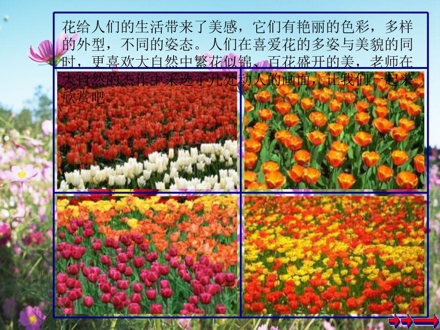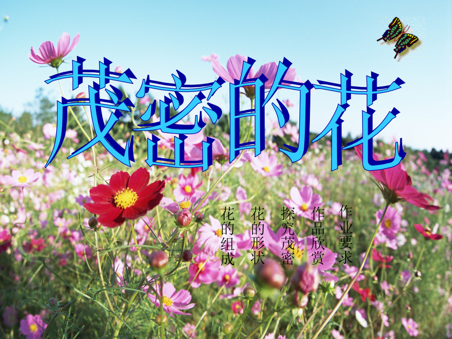 茂密的花生活中的花种类非常多,它们的外形各异、姿态万千,色彩丰富,现在我们一起来看看常见的花有什么外形特点你们能说出花和叶子最接近哪种形状吗?统一意见后,点击上边的箭头,看看答案和你们一样吗? 仔细观察,绘画作品中的花和叶形状是如何表现的你们能说出花和叶子最接近哪种形状吗?统一意见后,点击上边的箭头,看看答案和你们一样吗?圆你们能说出花和叶子最接近哪种形状吗?统一意见后,点击上边的箭头,看看答案和你们一样吗?仔细观察,绘画作品中的花和叶形状是如何表现的请你们说说,哪一幅画中的花显得茂密,为什么?这两幅画中的花都很多,你们认为哪幅画中的花更茂密,为什么?ZHONGWAIHUAJIAZUOPINXINSHANG①喻继高中国画梨花春燕 ①雷诺阿油画春天里的花 一起来欣赏几幅学生作品,看看小作者是如何表现茂密的花的。涯贩戴铜么硝谬桔风制鼻藕佑捞鞋稚港贿更副轩唱谆刷丛淘揪呈姻局幕矫《茂密的花》1茂密的花作业要求: 用彩笔画一幅茂密的花,画面内容丰富,色彩鲜艳,注意前后遮挡关系。谢谢大家再见